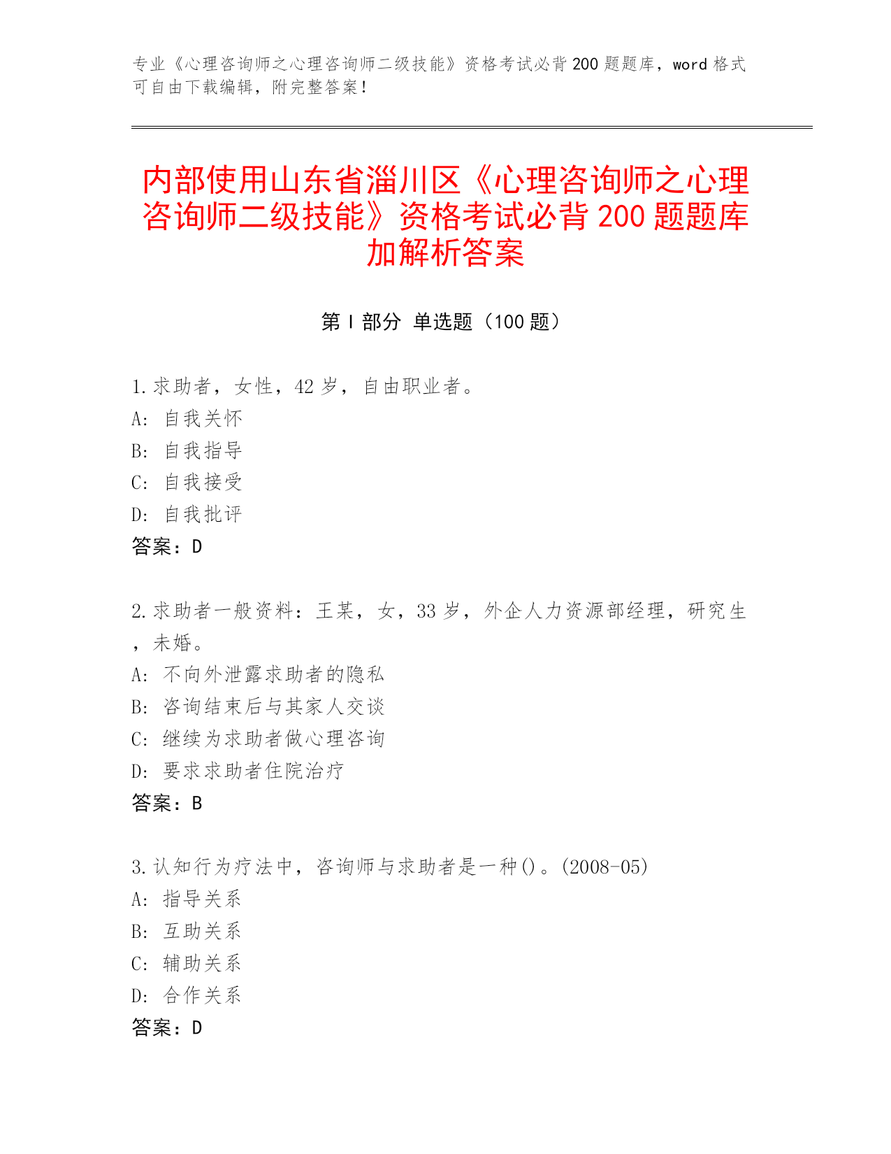 内部使用山东省淄川区《心理咨询师之心理咨询师二级技能》资格考试必背200题题库加解析答案
