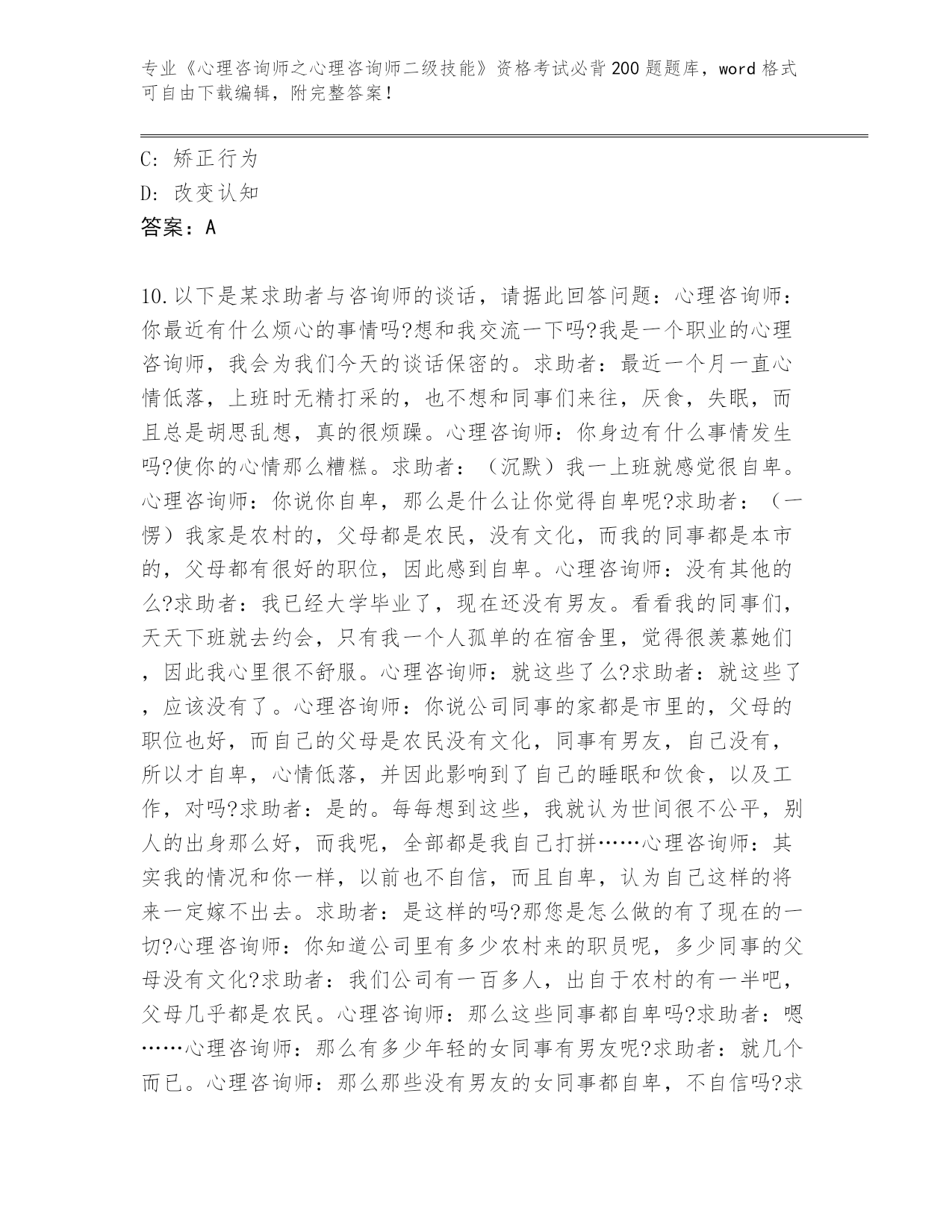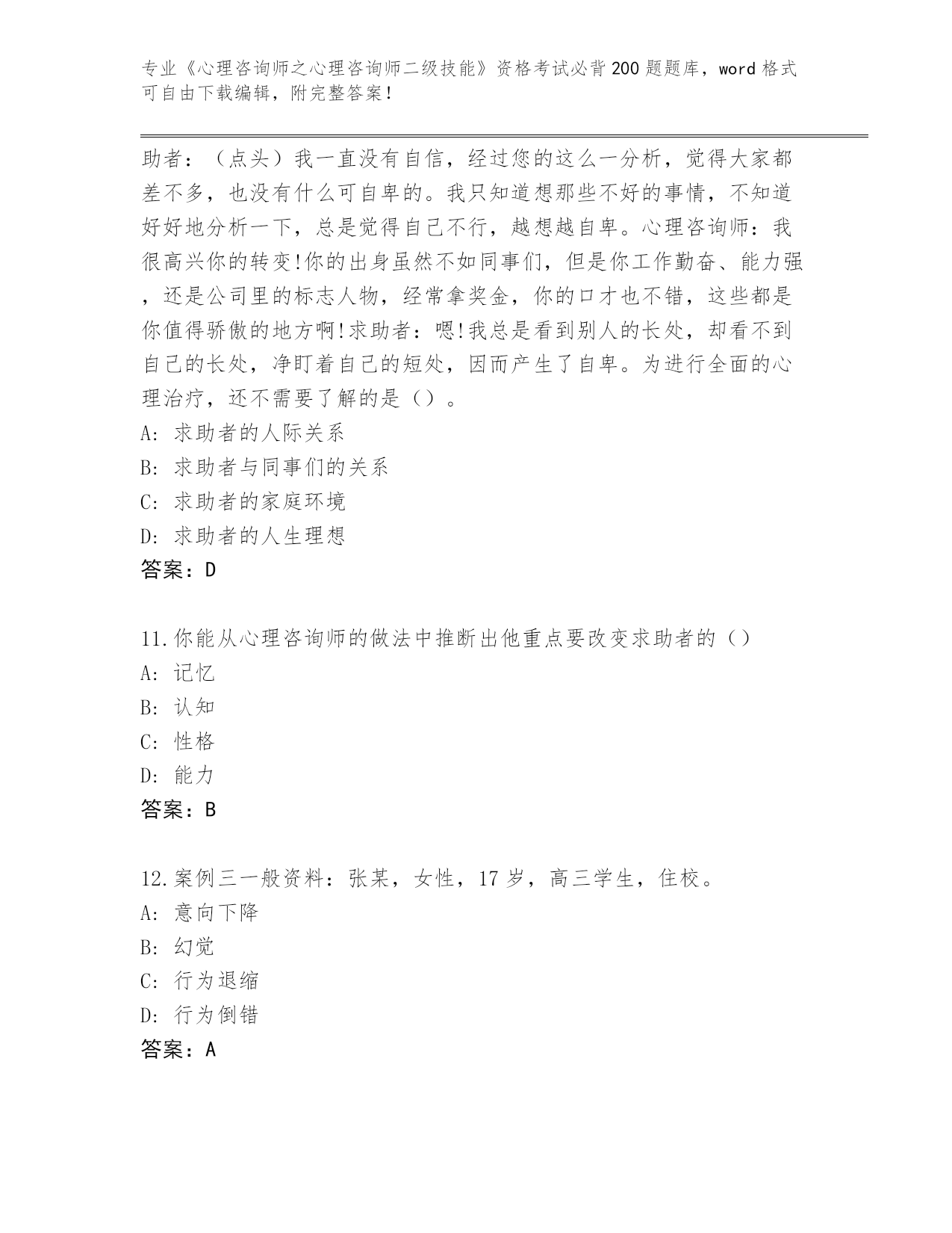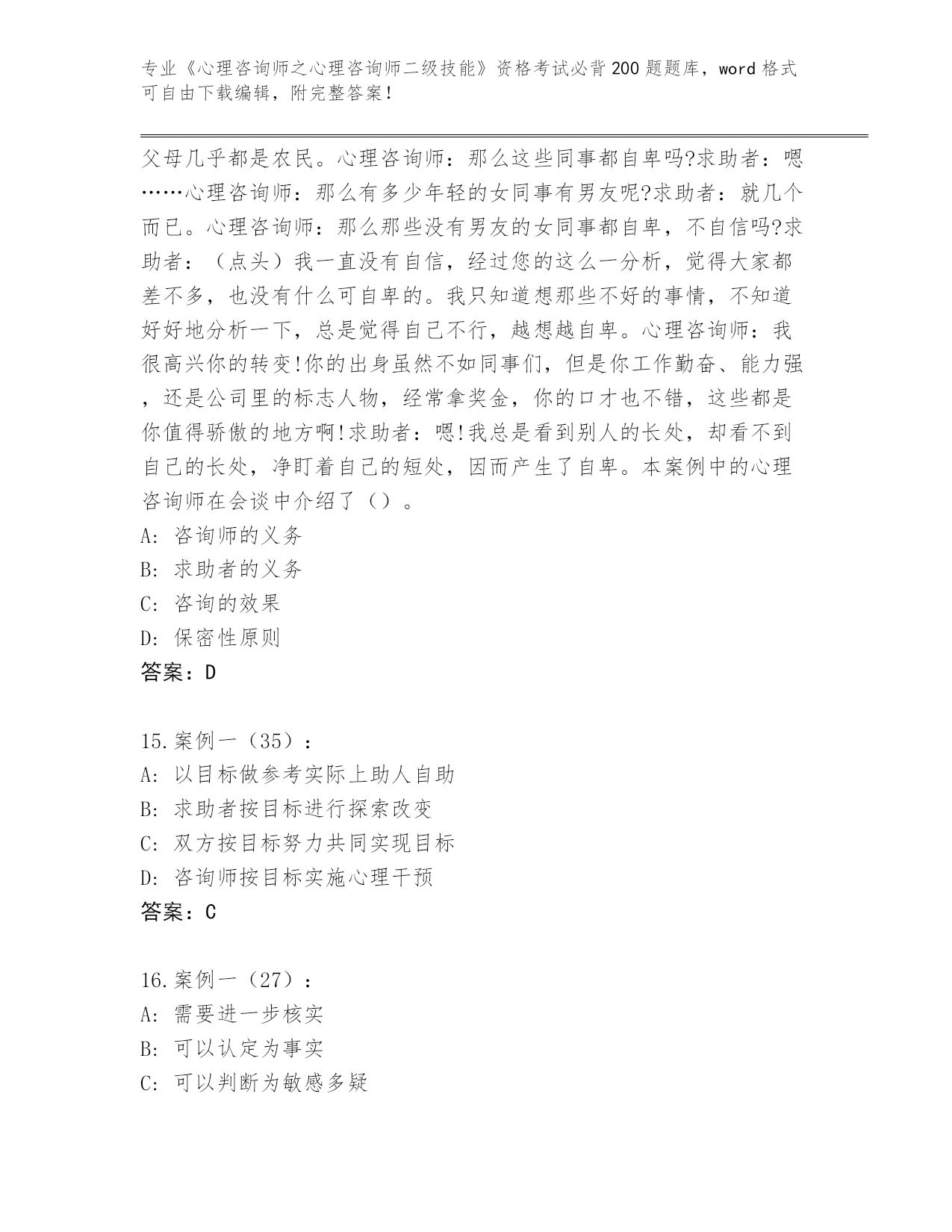 内部使用安徽省黟县《心理咨询师之心理咨询师二级技能》考试必刷200题内部题库加解析答案