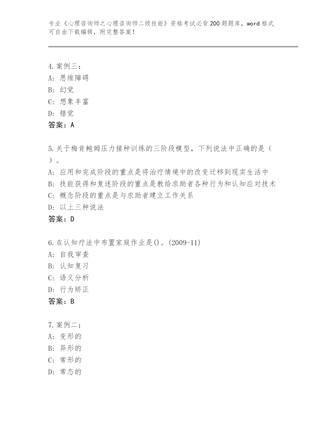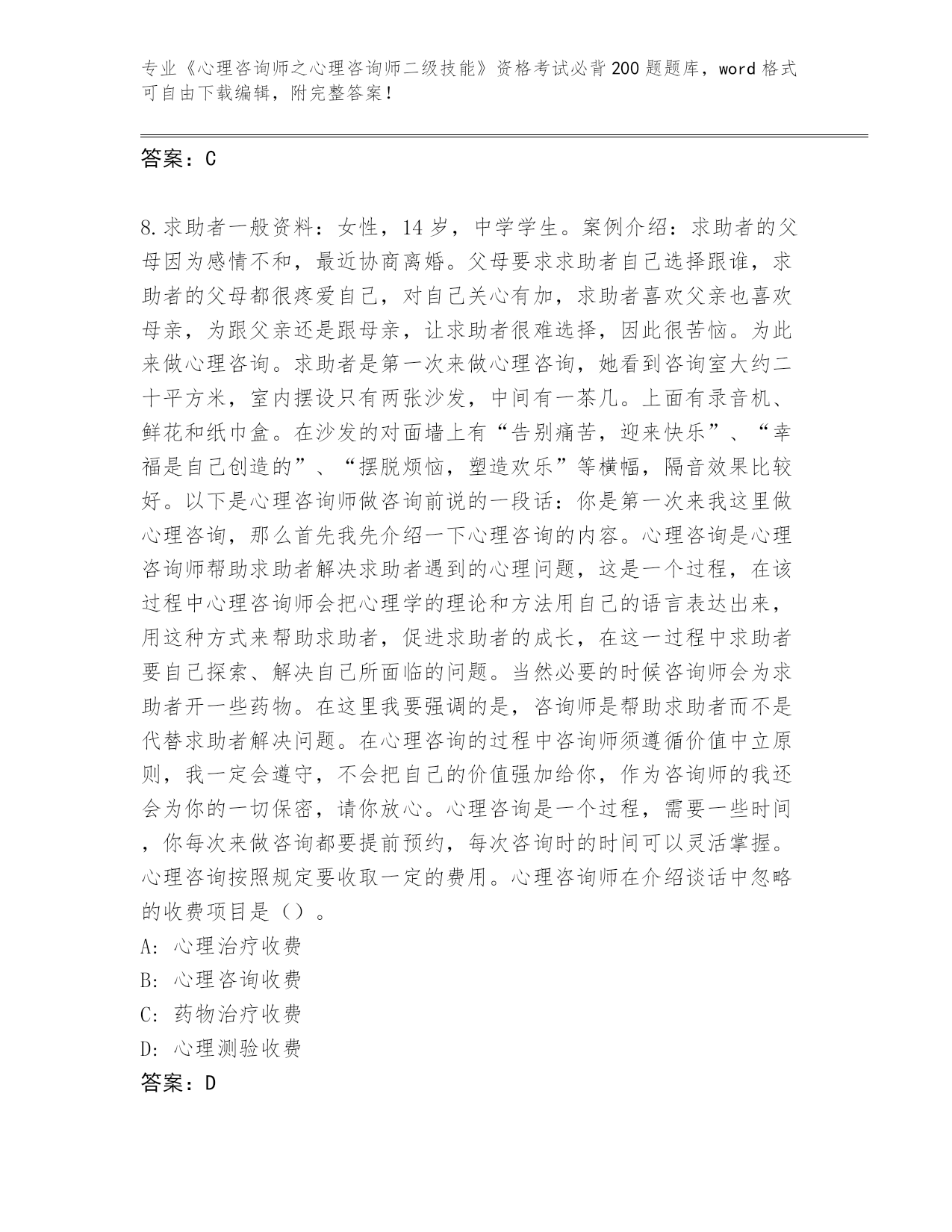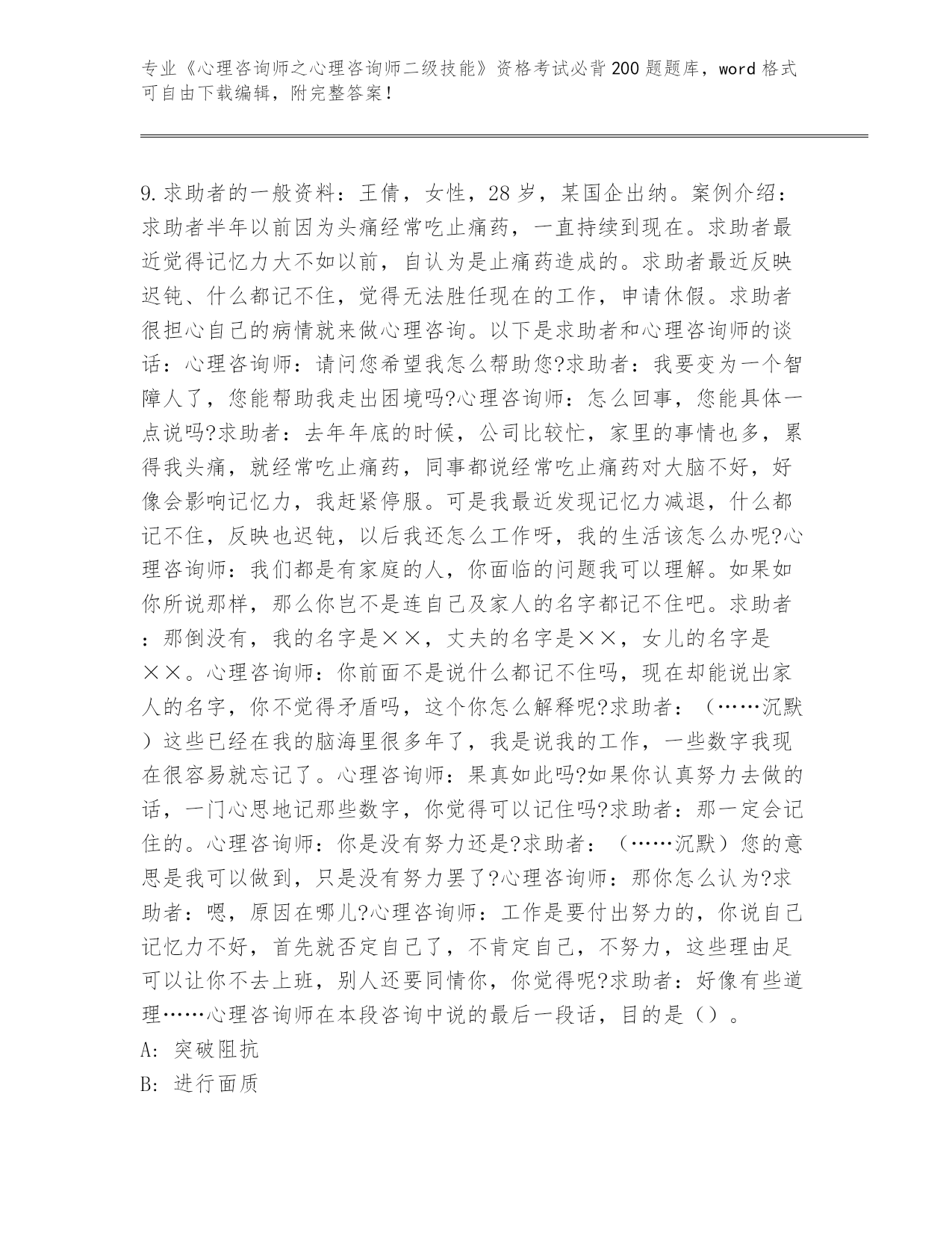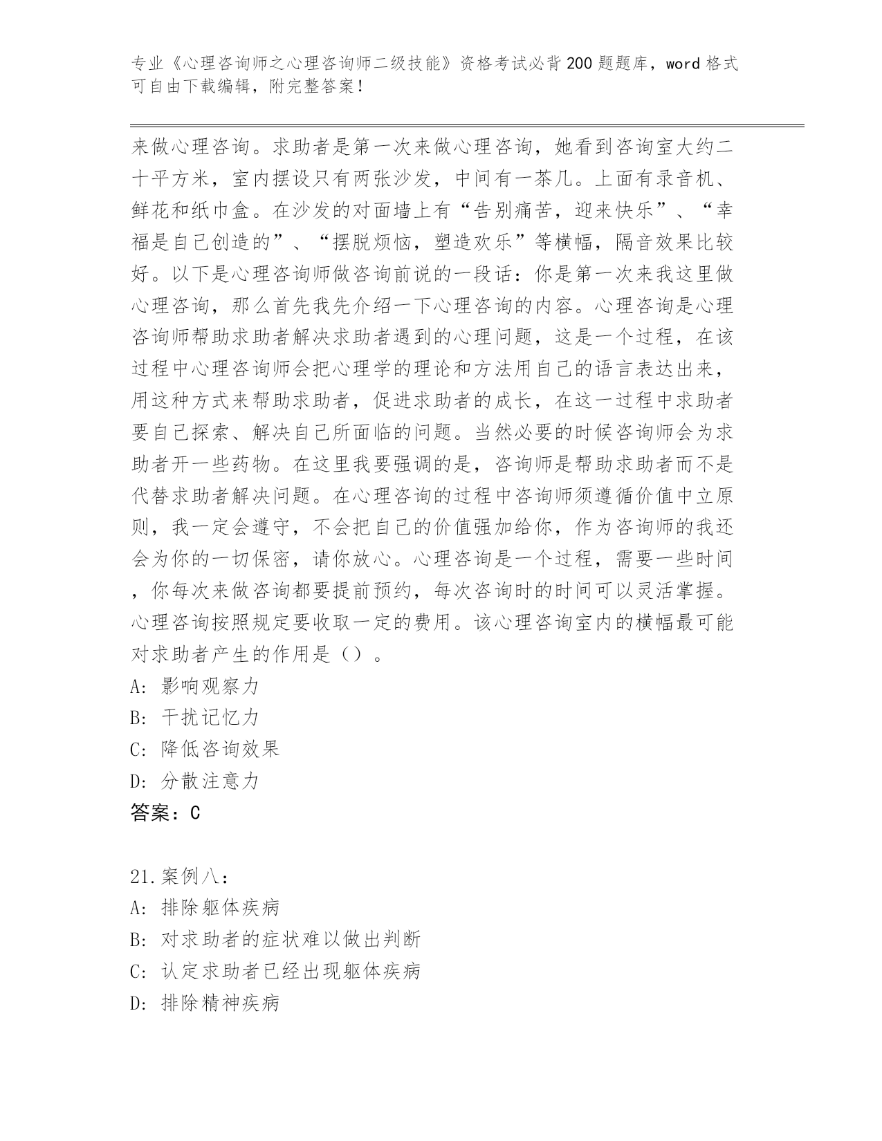 内部使用安徽省黟县《心理咨询师之心理咨询师二级技能》考试必刷200题内部题库加解析答案