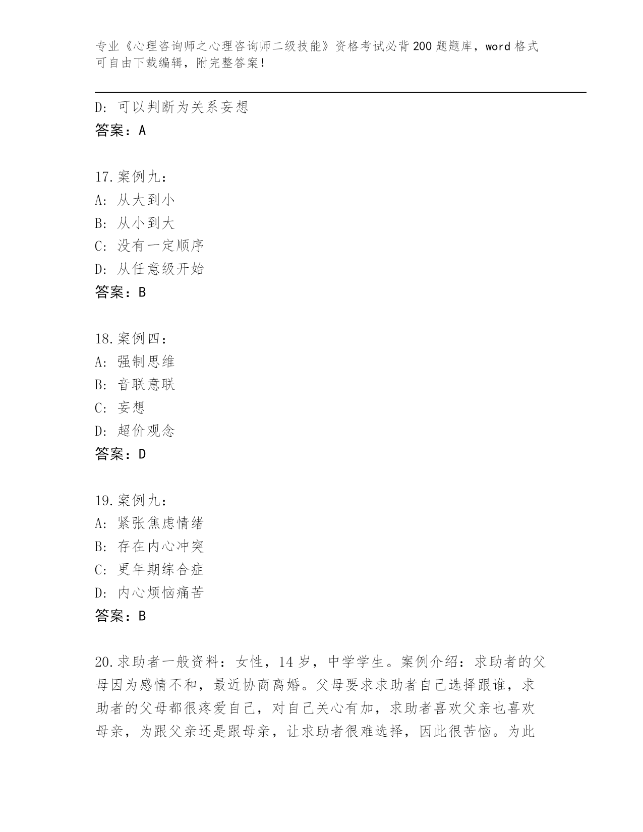 内部使用山东省《心理咨询师之心理咨询师二级技能》资格考试必背200题真题【黄金题型】