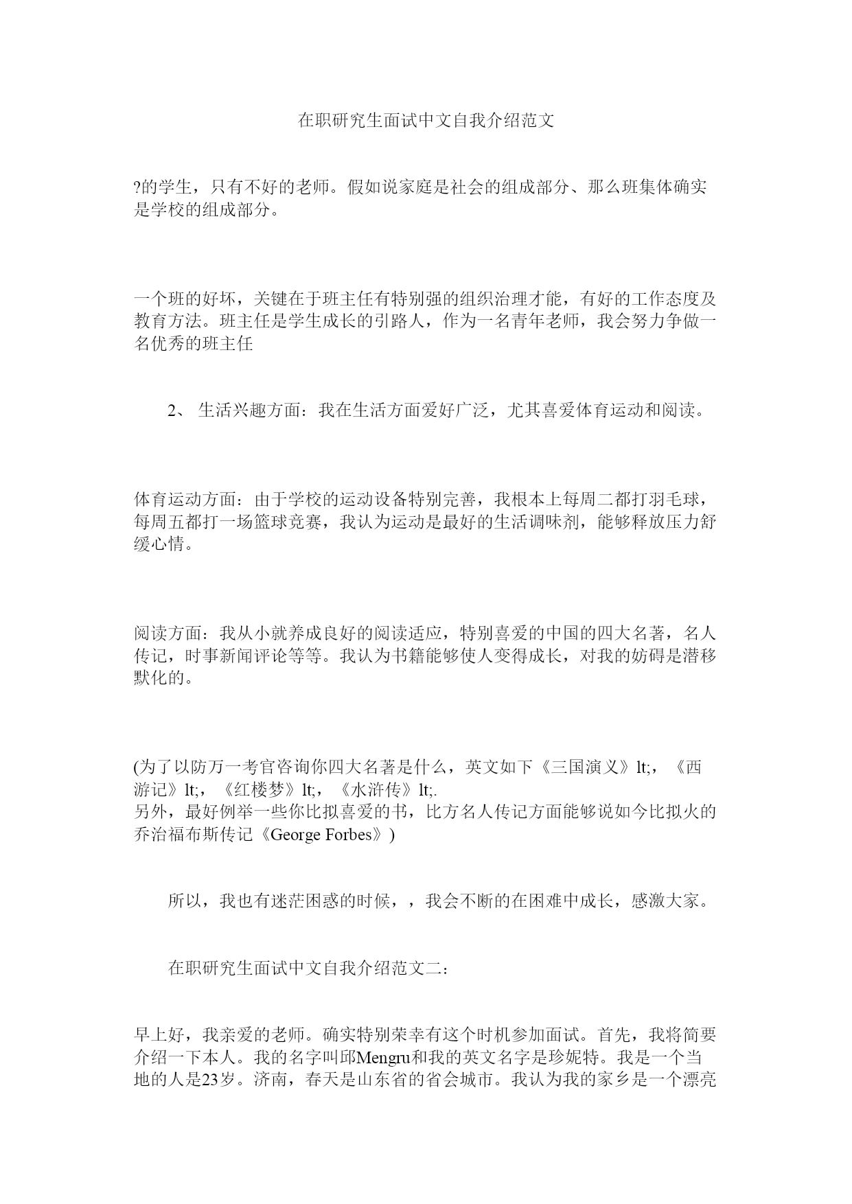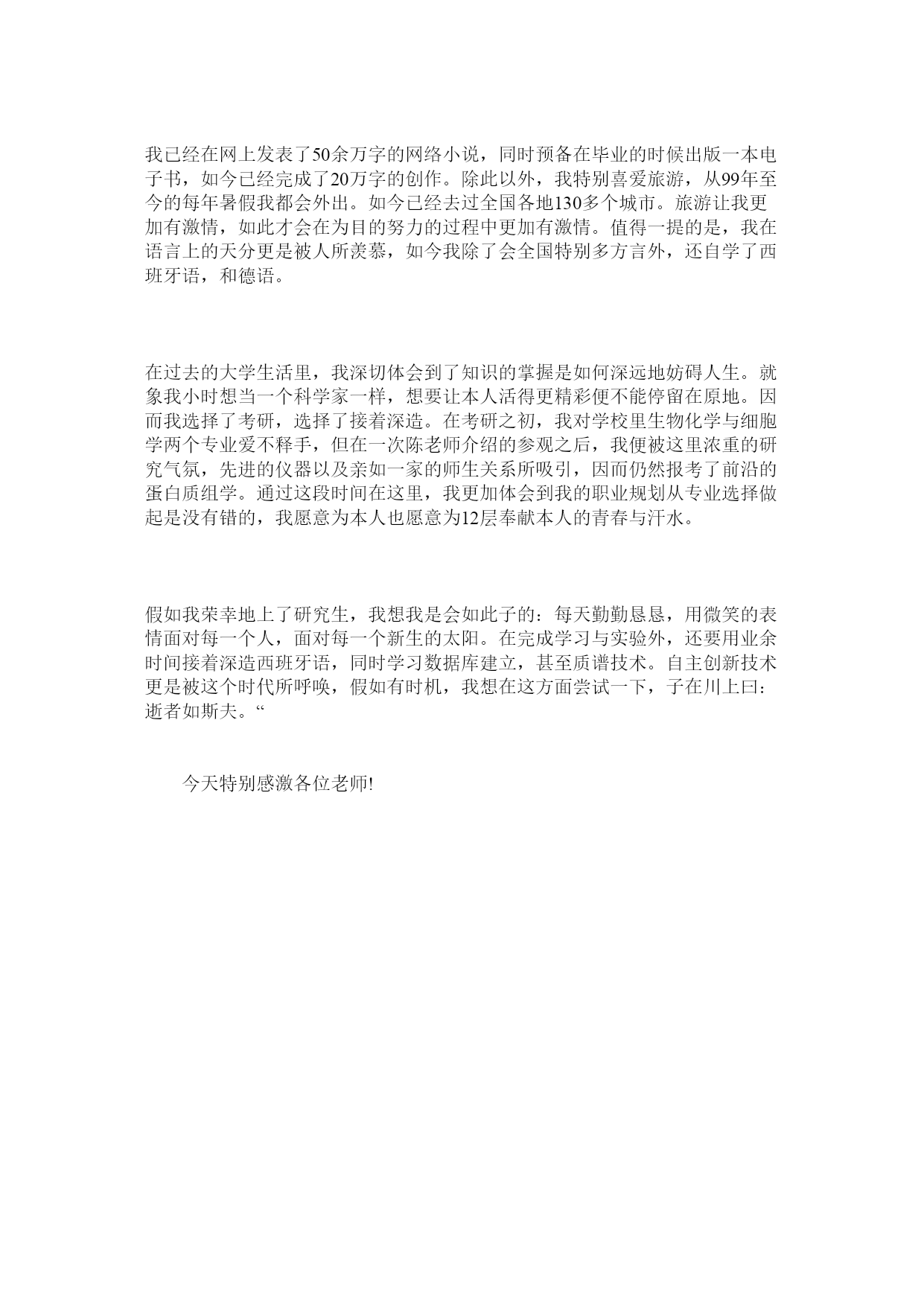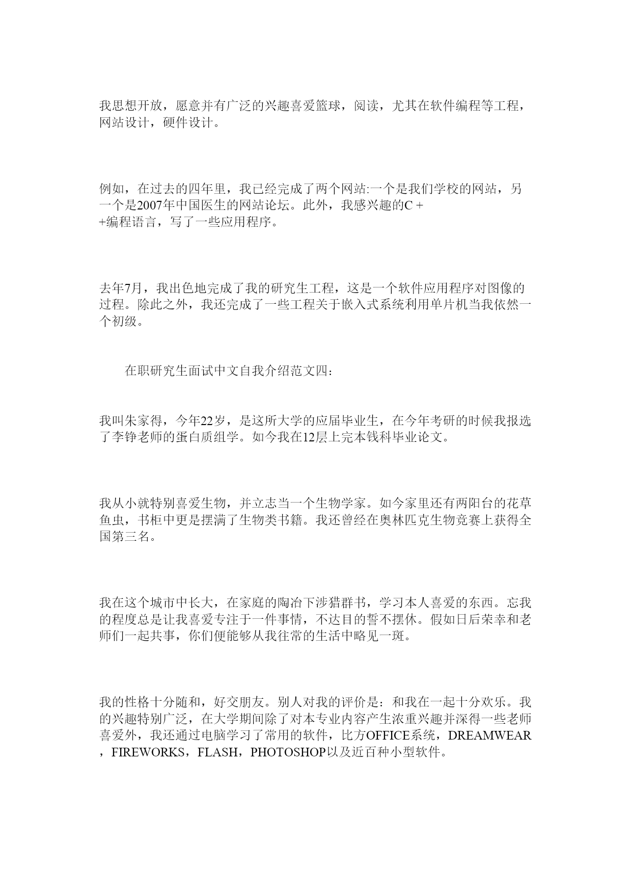 在职研究生面试中文自我介绍范文?的学生,只有不好的老师。假如说家庭是社会的组成部分、那么班集体确实是学校的组成部分。一个班的好坏,关键在于班主任有特别强的组织治理才能,有好的工作态度及教育方法。班主任是学生成长的引路人,作为一名青年老师,我会努力争做一名优秀的班主任2、生活兴趣方面:我在生活方面爱好广泛,尤其喜爱体育运动和阅读。体育运动方面:由于学校的运动设备特别完善,我根本上每周二都打羽毛球,每周五都打一场篮球竞赛,我认为运动是最好的生活调味剂,能够释放压力舒缓心情。阅读方面:我从小就养成良好的阅读适应,特别喜爱的中国的四大名著,名人传记,时事新闻评论等等。我认为书籍能够使人变得成长,对我的妨碍是潜移默化的。(为了以防万一考官咨询你四大名著是什么,英文如下《三国演义》lt;,《西游记》lt;,《红楼梦》lt;,《水浒传》lt;.另外,最好例举一些你比拟喜爱的书,比方名人传记方面能够说如今比拟火的乔治福布斯传记《GeorgeForbes》)所以,我也有迷茫困惑的时候,,我会不断的在困难中成长,感激大家。在职研究生面试中文自我介绍范文二:早上好,我亲爱的老师。确实特别荣幸有这个时机参加面试。首先,我将简要介绍一下本人。我的名字叫邱Mengru和我的英文名字是珍妮特。我是一个当地的人是23岁。济南,春天是山东省的省会城市。我认为我的家乡是一个漂亮的城市。其次,我想谈谈我的学习经历。我的专业是你往常的专业,毕业于你学校的名字。我特别感激我的大学教育给了我。如今我有一个新打算,我将竭尽全力获得山东中医药大学的关键。我选择诊所作为我的专业。学校简介+你为什么选择这个专业此外,我想说一些关于我的家庭。你能够谈谈你家庭的情况。我有决心,由于我有如此的才能!我是仁慈,耐心、外向和制造性。我期待着我的研究生学习和生活。我总是相信,你将特别容易落后,除非他接着学习。假如我能有时机在这里学习,我将专注于该领域的学习和研究。为了构建一个坚实的根底为我将来的工作中,我将关注理论知识。接下来,我想做一些实际工作与我的导师和同学的协助。通过这个,我确信会不能从教科书上获得的东西。此外,我将参加研究生考试的几个缘故。首先,我热爱我的专业。我是一个努力工作的学生尤其是做我感兴趣的东西。我将尽我最大努力处理任何咨询题,不管多么困难。我着迷于大师的清新和深入的风格。其次,我喜爱在大学的感受。它充满了朝气。我的学术气氛深深吸引。最重要的是,它是我的荣幸开放给你的教学我的耳朵。此外,更多的学习经历不等于成功,而这是完全成功的一种方式。这是我的简单而明晰的缘故我把研究生考试。在业余时间,我喜爱阅读书籍,在网上冲浪,听音乐喜爱流行,经典,或轻音乐,由于他们能够让我感到放松。没有人能保持工作效率,因而适当的娱乐是必须的。此外,我坚持做一些体育锻炼,比方跑步,游泳和羽毛球。通过如此做,我们能够一直保持健康。这是所有。感激你给我如此一个珍贵的时机!在职研究生面试中文自我介绍范文三:我思想开放,愿意并有广泛的兴趣喜爱篮球,阅读,尤其在软件编程等工程,网站设计,硬件设计。例如,在过去的四年里,我已经完成了两个网站:一个是我们学校的网站,另一个是2007年中国医生的网站论坛。此外,我感兴趣的C++编程语言,写了一些应用程序。去年7月,我出色地完成了我的研究生工程,这是一个软件应用程序对图像的过程。除此之外,我还完成了一些工程关于嵌入式系统利用单片机当我依然一个初级。在职研究生面试中文自我介绍范文四:我叫朱家得,今年22岁,是这所大学的应届毕业生,在今年考研的时候我报选了李铮老师的蛋白质组学。如今我在12层上完本钱科毕业论文。我从小就特别喜爱生物,并立志当一个生物学家。如今家里还有两阳台的花草鱼虫,书柜中更是摆满了生物类书籍。我还曾经在奥林匹克生物竞赛上获得全国第三名。我在这个城市中长大,在家庭的陶冶下涉猎群书,学习本人喜爱的东西。忘我的程度总是让我喜爱专注于一件事情,不达目的誓不摆休。假如日后荣幸和老师们一起共事,你们便能够从我往常的生活中略见一斑。我的性格十分随和,好交朋友。别人对我的评价是:和我在一起十分欢乐。我的兴趣特别广泛,在大学期间除了对本专业内容产生浓重兴趣并深得一些老师喜爱外,我还通过电脑学习了常用的软件,比方OFFICE系统,DREAMWEAR,FIREWORKS,FLASH,PHOTOSHOP以及近百种小型软件。我已经在网上发表了50余万字的网络小说,同时预备在毕业的时候出版一本电子书,如今已经完成了20万字的创作。除此以外,我特别喜爱旅游,从99年至今的每年暑假我都会外出。如今已经去过全国各地130多个城市。旅游让我更加有