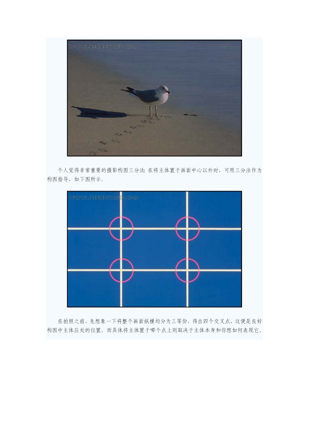 摄影常识一、首先了解单反相机单反数码相机的一个很大的特点就是可以交换不同规格的镜头,这是单反相机天生的优点,是普通数码相机不能比拟的。另外,现在单反数码相机都定位于数码相机的高端产品,因此在关系数码相机摄影质量的感光元件(CCD或者CMOS)的面积上,单反数码的面积远远大于普通数码相机,这使得单反数码相机的每个像素点的感光面积也远远大于普通数码相机,因此每个像素点也就能表现出更加细致的亮度和色彩范围,使单反数码相机的摄影质量明显高于普通数码相机。基本单位:“像素”是用来计算HYPERLINK"http://baike.baidu.com/view/342238.htm"\t"_blank"数码影像的一种单位,如同摄影的相片一样,数码影像也具有连续性的浓淡阶调,我们若把影像放大数倍,会发现这些连续色调其实是由许多色彩相近的小方点所组成,这些小方点就是构成影像的最小单位“像素”(Pixel)。这种最小的图形的单元能在屏幕上显示通常是单个的染色点。越高位的像素,其拥有的色板也就越丰富,越能表达颜色的真实感。二、了解你的器材A、镜头的分类,定焦变焦长焦广角鱼眼定焦镜头:特指只有一个固定焦距的镜头,只有一个焦段,或者说只有一个视野。定焦镜头没有变焦功能。特点拍摄图像清晰而稳定,对焦非常准确,画面细腻,颗粒感非常轻微,测光也比较准确。变焦镜头:指焦距在一定范围可内自由调节的镜头。变焦范围。一般来说,20-40mm的称为广角变焦镜头,35-70mm的称为标准变焦镜头,70-200mm的称为中远变焦镜头,200-500的称为远摄变焦镜头。当然,也有不少镜头囊括了广角至中焦、甚至远摄的范围,如28-200mm,28-300mm等鱼眼镜头:一种极端的超广角镜头a.视角大,被摄范围极广。b.透视感获得极大的夸张。c.鱼眼镜头存在严重的畸变,但可以获得戏剧性的效果长焦:焦距在200mm“远摄镜头”,远摄镜头的特点:a.景深小,容易获得主体清晰,背景虚化的画面效果。b.视角小,能够获得远处主体较大的画面且不干扰被摄对象。广泛地用于户外野生动物的拍摄。c.压缩了画面透视的纵身感,拉近了前后景的距离。d.影像畸变较小,广泛地用于人像摄影。广角镜头:指焦距短于、视角大于“标头”的镜头。以全幅135单反相机来说,焦距在30mm左右、视角在70度左右的镜头称为“广角镜头特点:a.景深大,有利于获得被摄画面全部清晰的效果。广泛地用于风光片的拍摄。b.视角大,在有限的范围内可以获得较大的取景范围,在室内建筑的拍摄中尤为见长,广泛地用于房地产行业的拍摄。c.透视感强烈,可以营造具有强烈视觉冲击感的画面。d.畸变较大,尤其是在画面的边缘部分。B、关于档位的使用M:手动曝光,快门光圈都由摄影者自己设置自己对快门,光圈以及外部光线有非常好的掌握的时候,想拍出与众不同的照片的时候,就可以用M档,新手不推荐使用。P:程序曝光,类似自动档,快门、光圈由相机设置,可以自己调节,对光圈快门的组合不太了解的可以使用这个档位。A:光圈优先,光圈由摄影者设定后,快门由相机设置常用于拍摄静物和控制HYPERLINK"http://baike.baidu.com/view/7278.htm"\t"_blank"景深使得人物的背景失焦,用以强调人物主题而淡化背景。S:快门优先,快门由摄影者设定后,光圈由相机设置快门优先多用于拍摄运动的物体上,例如体育运动、行使中的车辆、HYPERLINK"http://baike.baidu.com/view/29736.htm"\t"_blank"瀑布、飞行中的物体、HYPERLINK"http://baike.baidu.com/view/48350.htm"\t"_blank"烟花、水滴等等。A-DEP为景深优先A-DEP。A-DEP档指的是:自动景深自动曝光,主要用语拍摄合影和风光.相机使用七个对焦点自动检测最近和最远的主体。CA全自动。三、容易忽视的问题色温是表示光源光色的尺度,单位为K(开尔文)比如在白炽灯下,我们将白平衡设为白炽灯,就是把白炽灯的色温纠正到接近日光。光源色温不同,光色也不同,带来的感觉也不相同:<3300K温暖(带红的白色)稳重、温暖3000-5000K中间(白色)爽快>5000K清凉型(带蓝的白色)冷感光度(iso)是相机的ccd对光线的敏感程度,就是相机的感光度。其值越高,对光越敏感。当拍照时的光线太弱时,可以提高ISO以增加曝光量。另外,在拍摄快速运动的物体时,为了使拍摄的照片清楚,不花,只得用高速快门(1/1000秒甚至1/2000秒)这时有可能使得曝光不足,就用加大ISO来进行补偿。要说明的是,ISO越大,照片的噪点也就越多。照片