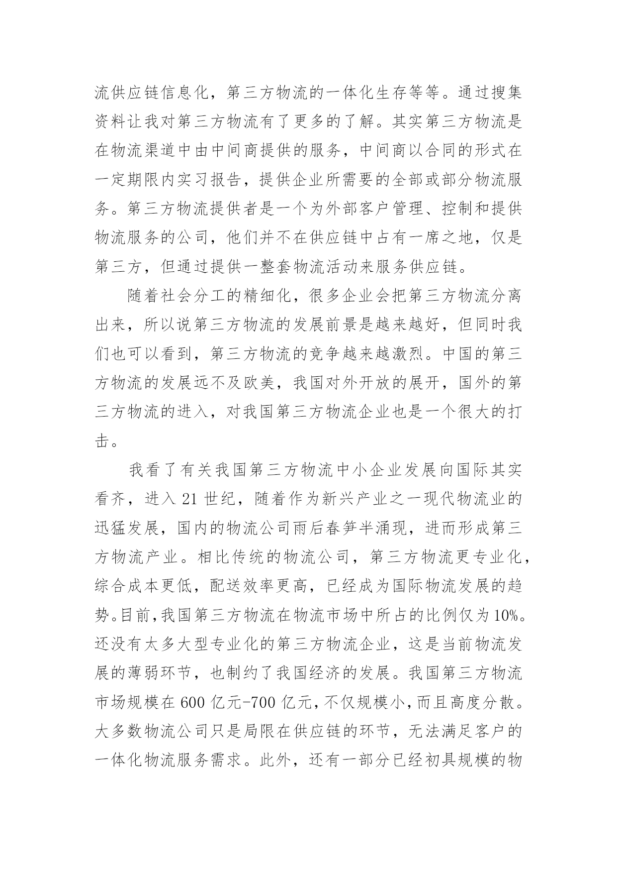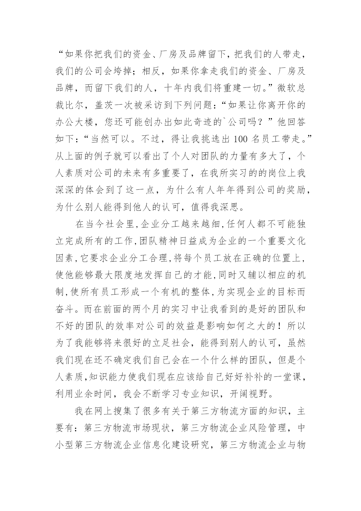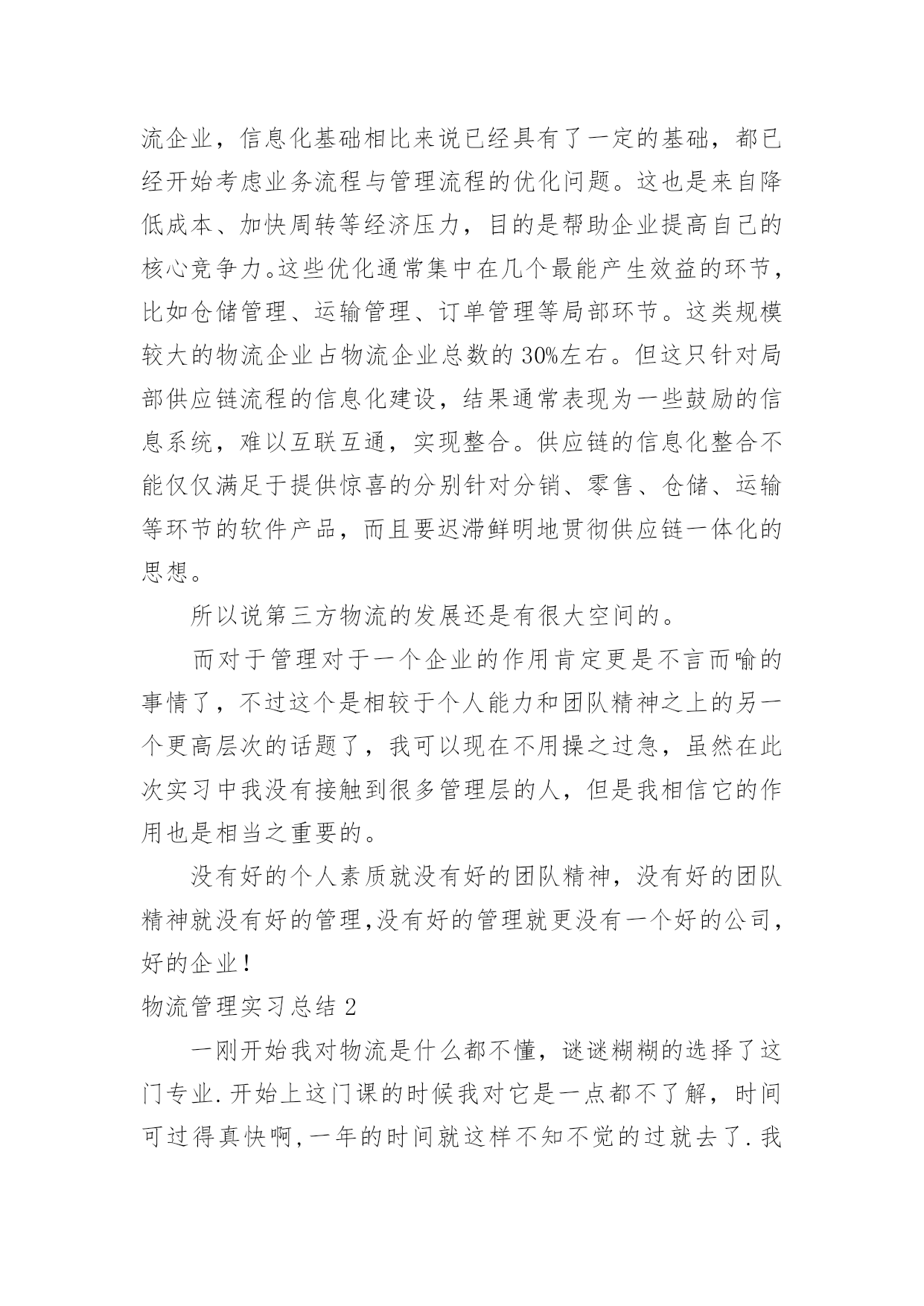 物流管理实习总结物流管理实习总结总结是指社会团体、企业单位和个人在自身的某一时期、某一项目或某些工作告一段落或者全部完成后进行回顾检查、分析评价,从而肯定成绩,得到经验,找出差距,得出教训和一些规律性认识的一种书面材料,他能够提升我们的书面表达能力,不妨让我们认真地完成总结吧。你想知道总结怎么写吗?以下是小编为大家整理的物流管理实习总结,仅供参考,希望能够帮助到大家。物流管理实习总结1经过前面两个月的实习,我已经对公司的运营有了大致的了解,也对我自己所做的哪一个小小的部分有了一定的认识,但是令我感触更甚的是,认识到了“个人能力”,“团队精神”,以及“管理”对一个一个公司的重要性!这个月除了做了自己份内的事在闲余时间我又补充了自己在学校没有认真学习的知识来提高我的专业素质。在网上搜集资料,主要是搜集第三方物流方面的知识,来补充我那不开阔的眼界和不广泛的知识面,同时个人素质,团队精神与管理对公司的未来发展是多么重要。让我认识到了团队的协作,个人的素质对一个公司企业的效益是多么的重要。宝洁公司的一位前任董事长曾说过一句很经典的话:“如果你把我们的资金、厂房及品牌留下,把我们的人带走,我们的公司会垮掉;相反,如果你拿走我们的资金、厂房及品牌,而留下我们的人,十年内我们将重建一切。”微软总裁比尔,盖茨一次被采访到下列问题:“如果让你离开你的办公大楼,您还可能创办出如此奇迹的`公司吗?”他回答如下:“当然可以。不过,得让我挑选出100名员工带走。”从上面的例子就可以看出了个人对团队的力量有多大了,个人素质对公司的未来有多重要了,在我所实习的的岗位上我深深的体会到了这一点,为什么有人年年得到公司的奖励,为什么别人能得到他人的认可,值得我深思。在当今社会里,企业分工越来越细,任何人都不可能独立完成所有的工作,团队精神日益成为企业的一个重要文化因素,它要求企业分工合理,将每个员工放在正确的位置上,使他能够最大限度地发挥自己的才能,同时又辅以相应的机制,使所有员工形成一个有机的整体,为实现企业的目标而奋斗。而在前面的两个月的实习中让我看到的是好的团队和不好的团队的效率对公司的效益是影响如何之大的!所以为了我能够将来很好的立足社会,能得到别人的认可,虽然我们现在还不确定我们自己会在一个什么样的团队,但是个人素质,知识能力使我们现在应该给自己好好补补的一堂课,利用业余时间,我会不断学习专业知识,开阔视野。我在网上搜集了很多有关于第三方物流方面的知识,主要有:第三方物流市场现状,第三方物流企业风险管理,中小型第三方物流企业信息化建设研究,第三方物流企业与物流供应链信息化,第三方物流的一体化生存等等。通过搜集资料让我对第三方物流有了更多的了解。其实第三方物流是在物流渠道中由中间商提供的服务,中间商以合同的形式在一定期限内实习报告,提供企业所需要的全部或部分物流服务。第三方物流提供者是一个为外部客户管理、控制和提供物流服务的公司,他们并不在供应链中占有一席之地,仅是第三方,但通过提供一整套物流活动来服务供应链。随着社会分工的精细化,很多企业会把第三方物流分离出来,所以说第三方物流的发展前景是越来越好,但同时我们也可以看到,第三方物流的竞争越来越激烈。中国的第三方物流的发展远不及欧美,我国对外开放的展开,国外的第三方物流的进入,对我国第三方物流企业也是一个很大的打击。我看了有关我国第三方物流中小企业发展向国际其实看齐,进入21世纪,随着作为新兴产业之一现代物流业的迅猛发展,国内的物流公司雨后春笋半涌现,进而形成第三方物流产业。相比传统的物流公司,第三方物流更专业化,综合成本更低,配送效率更高,已经成为国际物流发展的趋势。目前,我国第三方物流在物流市场中所占的比例仅为10%。还没有太多大型专业化的第三方物流企业,这是当前物流发展的薄弱环节,也制约了我国经济的发展。我国第三方物流市场规模在600亿元-700亿元,不仅规模小,而且高度分散。大多数物流公司只是局限在供应链的环节,无法满足客户的一体化物流服务需求。此外,还有一部分已经初具规模的物流企业,信息化基础相比来说已经具有了一定的基础,都已经开始考虑业务流程与管理流程的优化问题。这也是来自降低成本、加快周转等经济压力,目的是帮助企业提高自己的核心竞争力。这些优化通常集中在几个最能产生效益的环节,比如仓储管理、运输管理、订单管理等局部环节。这类规模较大的物流企业占物流企业总数的30%左右。但这只针对局部供应链流程的信息化建设,结果通常表现为一些鼓励的信息系统,难以互联互通,实现整合。供应链的信息化整合不能仅仅满足于提供惊喜的分别针对分销、零售、仓储、运输等环节的软件产品,而且要迟滞鲜明地贯彻供应链一体化的思想。所以说第三方物流的发展还是有很大空间的。而对于管理对于一个企业的作用肯定更是不言而喻的事情了,不过这