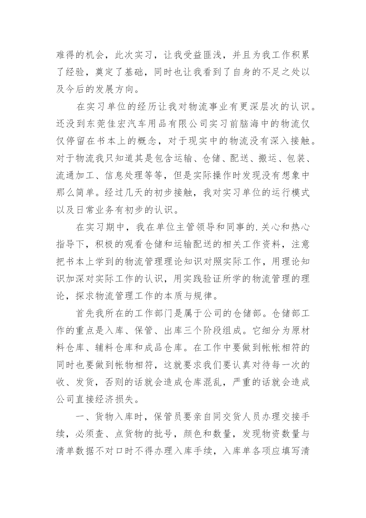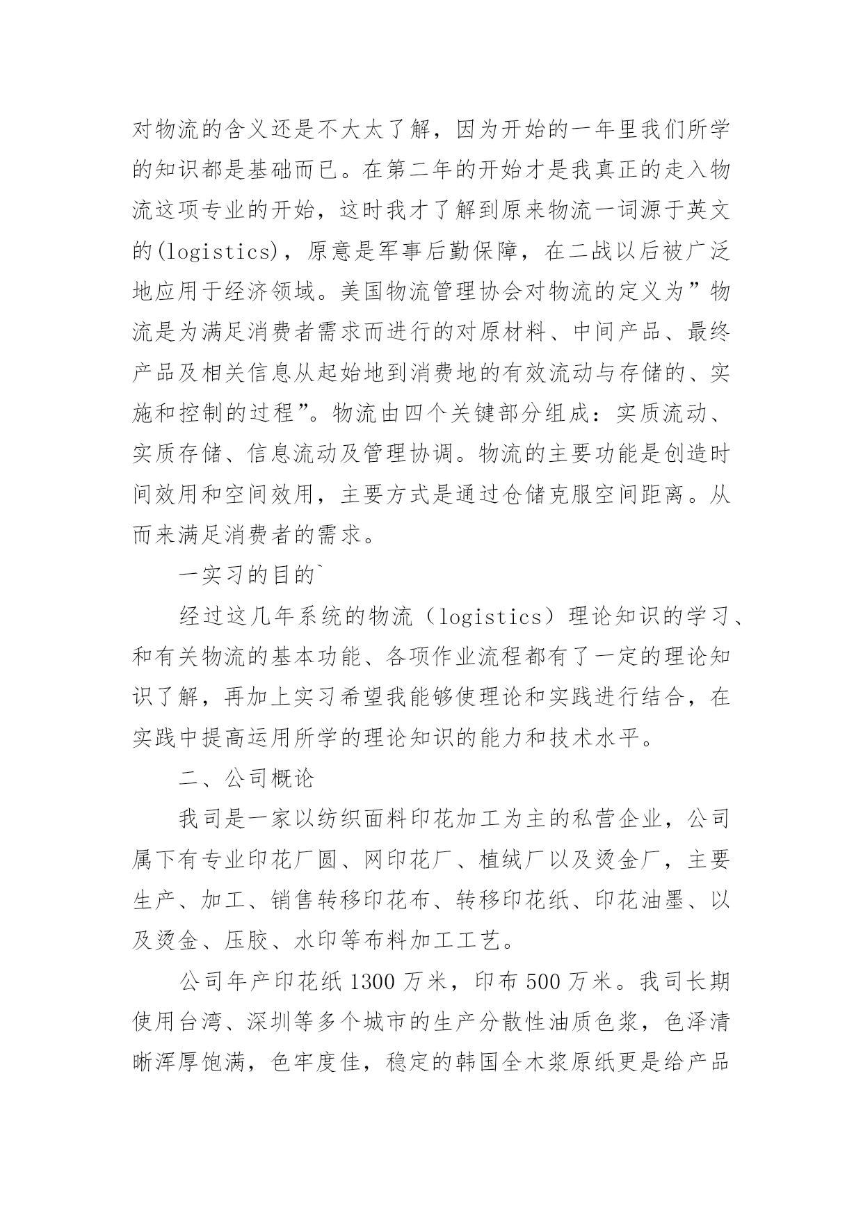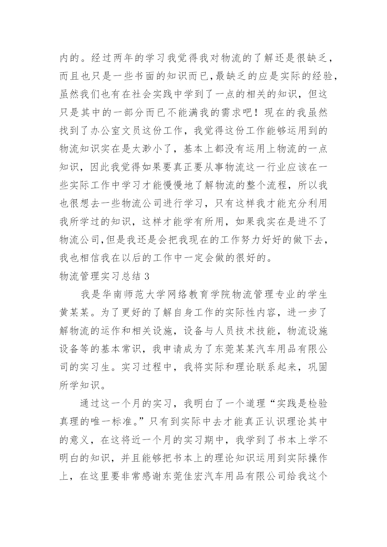 物流管理实习总结物流管理实习总结总结是指社会团体、企业单位和个人在自身的某一时期、某一项目或某些工作告一段落或者全部完成后进行回顾检查、分析评价,从而肯定成绩,得到经验,找出差距,得出教训和一些规律性认识的一种书面材料,他能够提升我们的书面表达能力,不妨让我们认真地完成总结吧。你想知道总结怎么写吗?以下是小编为大家整理的物流管理实习总结,仅供参考,希望能够帮助到大家。物流管理实习总结1经过前面两个月的实习,我已经对公司的运营有了大致的了解,也对我自己所做的哪一个小小的部分有了一定的认识,但是令我感触更甚的是,认识到了“个人能力”,“团队精神”,以及“管理”对一个一个公司的重要性!这个月除了做了自己份内的事在闲余时间我又补充了自己在学校没有认真学习的知识来提高我的专业素质。在网上搜集资料,主要是搜集第三方物流方面的知识,来补充我那不开阔的眼界和不广泛的知识面,同时个人素质,团队精神与管理对公司的未来发展是多么重要。让我认识到了团队的协作,个人的素质对一个公司企业的效益是多么的重要。宝洁公司的一位前任董事长曾说过一句很经典的话:“如果你把我们的资金、厂房及品牌留下,把我们的人带走,我们的公司会垮掉;相反,如果你拿走我们的资金、厂房及品牌,而留下我们的人,十年内我们将重建一切。”微软总裁比尔,盖茨一次被采访到下列问题:“如果让你离开你的办公大楼,您还可能创办出如此奇迹的`公司吗?”他回答如下:“当然可以。不过,得让我挑选出100名员工带走。”从上面的例子就可以看出了个人对团队的力量有多大了,个人素质对公司的未来有多重要了,在我所实习的的岗位上我深深的体会到了这一点,为什么有人年年得到公司的奖励,为什么别人能得到他人的认可,值得我深思。在当今社会里,企业分工越来越细,任何人都不可能独立完成所有的工作,团队精神日益成为企业的一个重要文化因素,它要求企业分工合理,将每个员工放在正确的位置上,使他能够最大限度地发挥自己的才能,同时又辅以相应的机制,使所有员工形成一个有机的整体,为实现企业的目标而奋斗。而在前面的两个月的实习中让我看到的是好的团队和不好的团队的效率对公司的效益是影响如何之大的!所以为了我能够将来很好的立足社会,能得到别人的认可,虽然我们现在还不确定我们自己会在一个什么样的团队,但是个人素质,知识能力使我们现在应该给自己好好补补的一堂课,利用业余时间,我会不断学习专业知识,开阔视野。我在网上搜集了很多有关于第三方物流方面的知识,主要有:第三方物流市场现状,第三方物流企业风险管理,中小型第三方物流企业信息化建设研究,第三方物流企业与物流供应链信息化,第三方物流的一体化生存等等。通过搜集资料让我对第三方物流有了更多的了解。其实第三方物流是在物流渠道中由中间商提供的服务,中间商以合同的形式在一定期限内实习报告,提供企业所需要的全部或部分物流服务。第三方物流提供者是一个为外部客户管理、控制和提供物流服务的公司,他们并不在供应链中占有一席之地,仅是第三方,但通过提供一整套物流活动来服务供应链。随着社会分工的精细化,很多企业会把第三方物流分离出来,所以说第三方物流的发展前景是越来越好,但同时我们也可以看到,第三方物流的竞争越来越激烈。中国的第三方物流的发展远不及欧美,我国对外开放的展开,国外的第三方物流的进入,对我国第三方物流企业也是一个很大的打击。我看了有关我国第三方物流中小企业发展向国际其实看齐,进入21世纪,随着作为新兴产业之一现代物流业的迅猛发展,国内的物流公司雨后春笋半涌现,进而形成第三方物流产业。相比传统的物流公司,第三方物流更专业化,综合成本更低,配送效率更高,已经成为国际物流发展的趋势。目前,我国第三方物流在物流市场中所占的比例仅为10%。还没有太多大型专业化的第三方物流企业,这是当前物流发展的薄弱环节,也制约了我国经济的发展。我国第三方物流市场规模在600亿元-700亿元,不仅规模小,而且高度分散。大多数物流公司只是局限在供应链的环节,无法满足客户的一体化物流服务需求。此外,还有一部分已经初具规模的物流企业,信息化基础相比来说已经具有了一定的基础,都已经开始考虑业务流程与管理流程的优化问题。这也是来自降低成本、加快周转等经济压力,目的是帮助企业提高自己的核心竞争力。这些优化通常集中在几个最能产生效益的环节,比如仓储管理、运输管理、订单管理等局部环节。这类规模较大的物流企业占物流企业总数的30%左右。但这只针对局部供应链流程的信息化建设,结果通常表现为一些鼓励的信息系统,难以互联互通,实现整合。供应链的信息化整合不能仅仅满足于提供惊喜的分别针对分销、零售、仓储、运输等环节的软件产品,而且要迟滞鲜明地贯彻供应链一体化的思想。所以说第三方物流的发展还是有很大空间的。而对于管理对于一个企业的作用肯定更是不言而喻的事情了,不过这