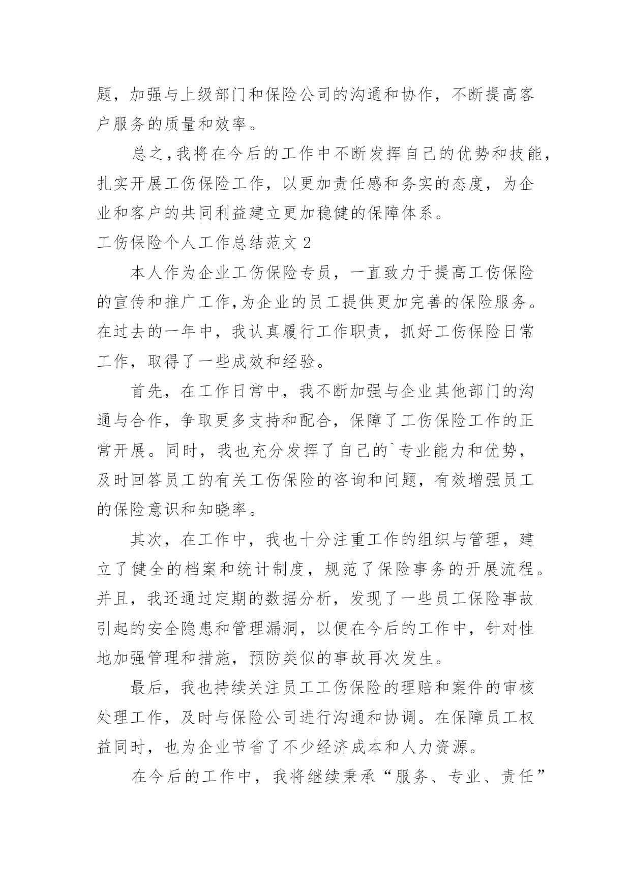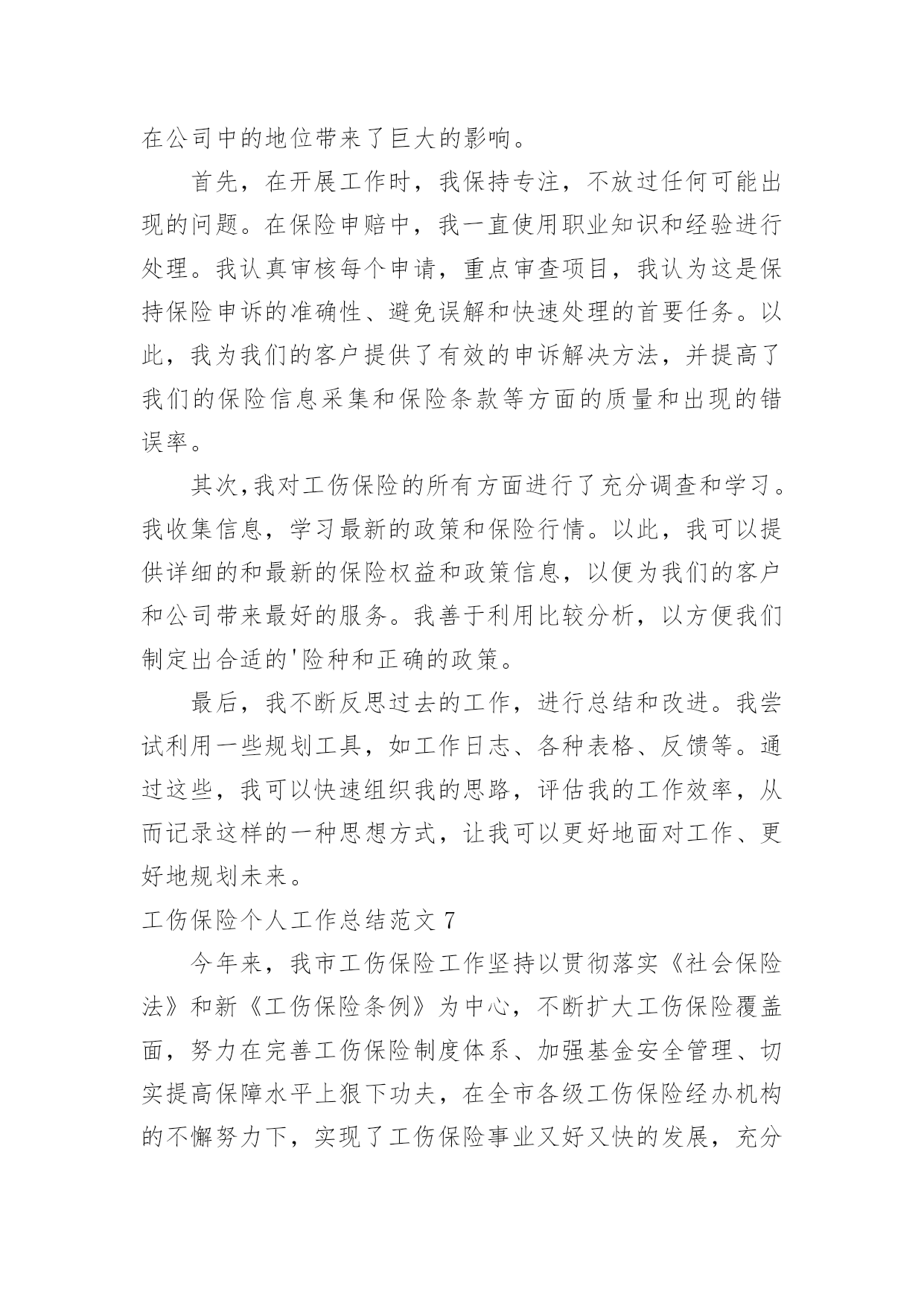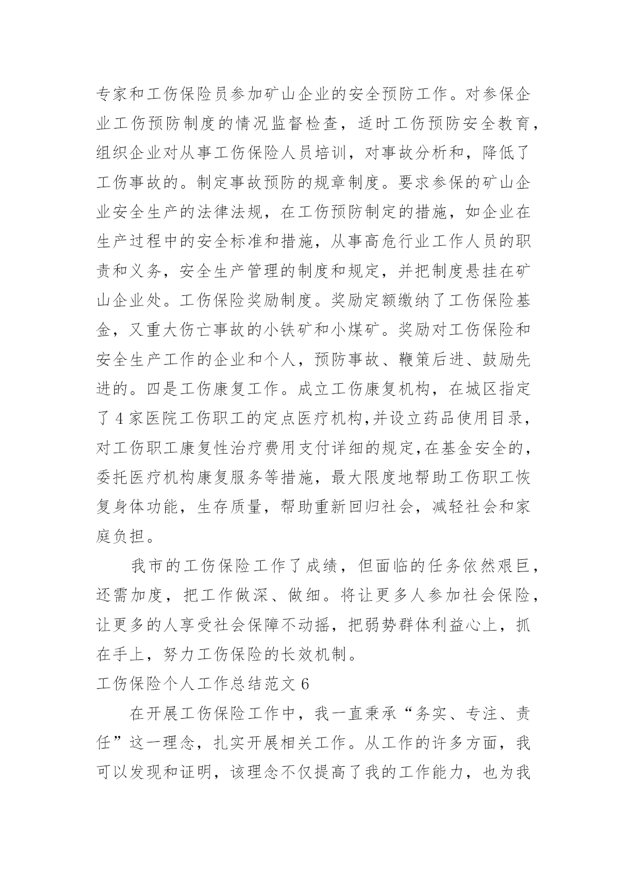 工伤保险个人工作总结工伤保险个人工作总结范文总结是对某一特定时间段内的学习和工作生活等表现情况加以回顾和分析的一种书面材料,它可以帮助我们有寻找学习和工作中的规律,为此要我们写一份总结。我们该怎么写总结呢?以下是小编帮大家整理的工伤保险个人工作总结范文,仅供参考,希望能够帮助到大家。工伤保险个人工作总结范文1作为一个工伤保险专员,我在日常工作中坚持思想上的进步,开展极为严谨的业务,以确保每个保险客户得到最高标准和最准确的服务。首先,充分发挥我的公司经验和专业能力,主动参与品牌推广和维护工作,上门宣传保险服务,向客户传达优秀的工伤保险知识及其重要性。其次,坚持细致而高质量的审查工作,大件事故的审核能帮助员工获得及时理赔,增强了客户对我们的,自身工伤费用得到及时解决的信心。此外,还用最好的`推销策略帮助目标客户并推广公司的工伤保险。最后,在保险客户申诉中,我以每个客户的利益为中心,维护客户利益与公司利益平衡,双方获得最佳回报。我善于用客观的态度和专业的知识去处理问题,用我的热情去众筹客户和公司的最佳利益。同时,还及时反馈工作中发现的问题,加强与上级部门和保险公司的沟通和协作,不断提高客户服务的质量和效率。总之,我将在今后的工作中不断发挥自己的优势和技能,扎实开展工伤保险工作,以更加责任感和务实的态度,为企业和客户的共同利益建立更加稳健的保障体系。工伤保险个人工作总结范文2本人作为企业工伤保险专员,一直致力于提高工伤保险的宣传和推广工作,为企业的员工提供更加完善的保险服务。在过去的一年中,我认真履行工作职责,抓好工伤保险日常工作,取得了一些成效和经验。首先,在工作日常中,我不断加强与企业其他部门的沟通与合作,争取更多支持和配合,保障了工伤保险工作的正常开展。同时,我也充分发挥了自己的`专业能力和优势,及时回答员工的有关工伤保险的咨询和问题,有效增强员工的保险意识和知晓率。其次,在工作中,我也十分注重工作的组织与管理,建立了健全的档案和统计制度,规范了保险事务的开展流程。并且,我还通过定期的数据分析,发现了一些员工保险事故引起的安全隐患和管理漏洞,以便在今后的工作中,针对性地加强管理和措施,预防类似的事故再次发生。最后,我也持续关注员工工伤保险的理赔和案件的审核处理工作,及时与保险公司进行沟通和协调。在保障员工权益同时,也为企业节省了不少经济成本和人力资源。在今后的工作中,我将继续秉承“服务、专业、责任”理念,切实更好地发挥自身的职能作用,不断提高工作质量和效益,为员工和企业的发展做出更加突出的贡献。工伤保险个人工作总结范文3在过去的一年里,我一直积极参与和推动了单位工伤保险的发展和完善工作。在这一过程中,我主要从以下几个方面入手,有效完成了部门在市场竞争中的角色定位。第一,在工作方面,我认真负责地开展了每年的工伤保险登记和缴纳工作,及时更新员工保险资料和情况,并在权益受到侵害时,积极与保险公司进行沟通和协商,确保员工的权益得到保障和维护。第二,在宣传方面,我也充分发挥了自己的职能作用,通过多种方式(包括QQ群、微信公众平台等)及时推送最新的工伤保险政策和知识,帮助员工正确理解和遵守保险制度,自觉维护自身的权益。第三,在管理方面,我重视了保险事故的调查和分析工作,并通过对历年理赔案件进行数据分析和对比,发现了一些存在的管理漏洞和风险点,并及时采取针对性的整改措施,有效避免了一些事故的发生和经济损失。最后,在工作总结方面,我也不断总结和反思过去的.工作经验和教训,并结合同行业的比较和企业需求,不断提升自己的专业水平和能力,为企业的发展作出更好的贡献。在今后的工作中,我将继续以“服务、专业、责任”为核心理念,积极搭建平台,整合资源,以更加开阔的视野和精湛的技能,为员工和企业创造出更为广阔的发展空间和更多的社会效益。工伤保险个人工作总结范文4在过去一个月的时间里,我一直在积极地开展工伤保险业务的推广工作。通过与员工的沟通和宣传,成功地提高了大家的意识和认识,促进了企业的工伤保险制度的完善和落实。首先,我与企业的劳保部门进行了密切的合作,力求提高工伤保险知识的普及程度,并且负责每个员工的保险登记和缴纳工作。为了确保全体员工的权益能够得到保障,我们对每个员工的工作环境进行了仔细的分析和评估,查缺补漏,确保其安全和健康。其次,我们积极开展了一些公开的.宣传活动,例如发放宣传单、张贴宣传海报、举行讲座等。通过这些活动,我们不仅让员工们了解到了工伤保险制度的运作机制,更重要的是让他们意识到了自己的保险责任,认识到了工作场所的安全问题。最后,在工作的过程中,我们积极跟踪保险案件的进展,解决员工们遇到的工伤保险纠纷。同时,我们也在不断地总结和评估自己的工作,为今后的推广工作积累经验,并发挥出更好的作用。在今后的工作中,我将继续发挥自己的优势和专业知识