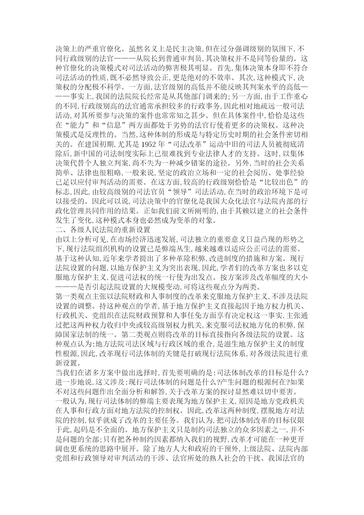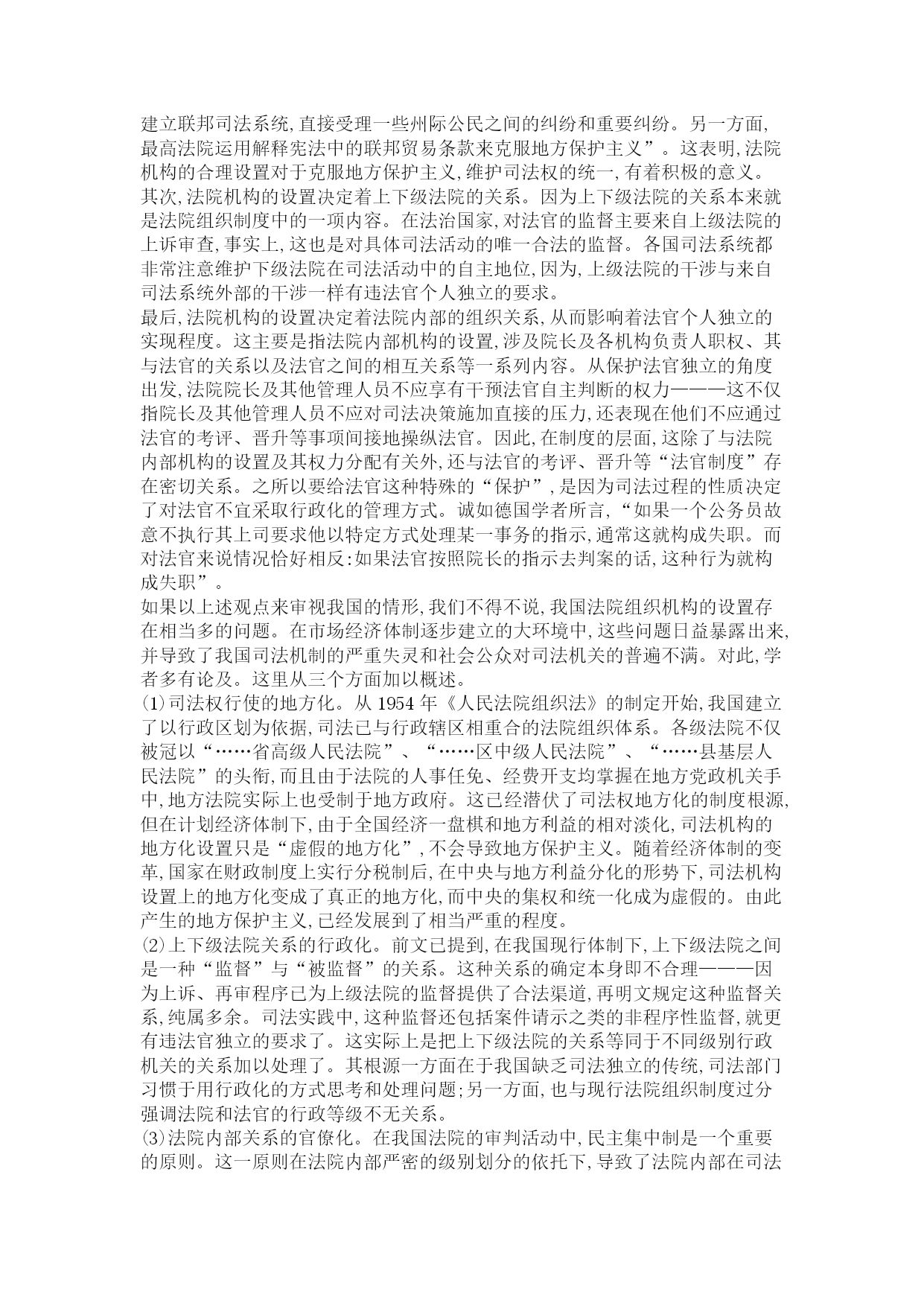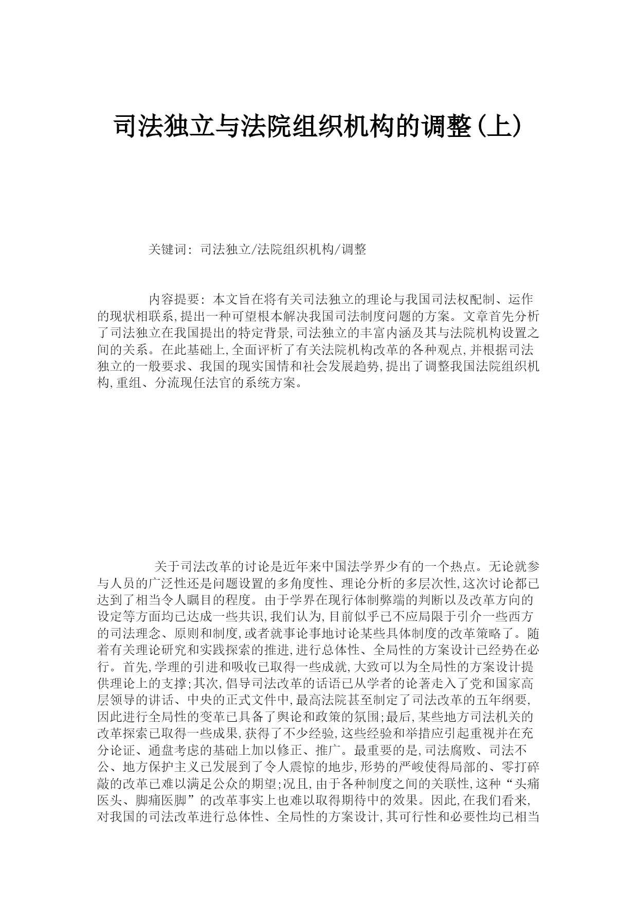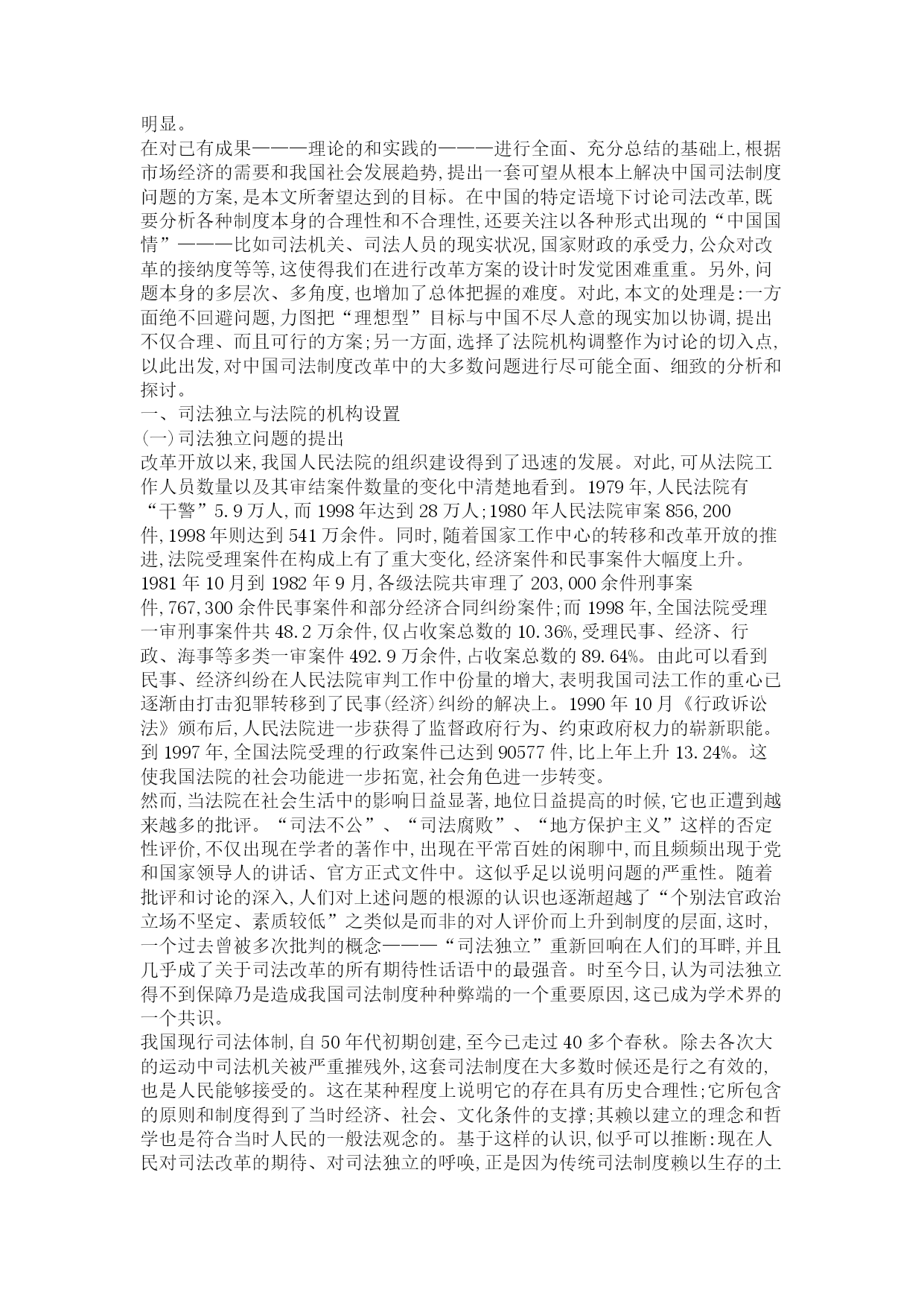 司法独立与法院组织机构的调整(上)(完整版)实用资料(可以直接使用,可编辑完整版实用资料,欢迎下载)司法独立与法院组织机构的调整(上)关键词:司法独立/法院组织机构/调整内容提要:本文旨在将有关司法独立的理论与我国司法权配制、运作的现状相联系,提出一种可望根本解决我国司法制度问题的方案。文章首先分析了司法独立在我国提出的特定背景,司法独立的丰富内涵及其与法院机构设置之间的关系。在此基础上,全面评析了有关法院机构改革的各种观点,并根据司法独立的一般要求、我国的现实国情和社会发展趋势,提出了调整我国法院组织机构,重组、分流现任法官的系统方案。关于司法改革的讨论是近年来中国法学界少有的一个热点。无论就参与人员的广泛性还是问题设置的多角度性、理论分析的多层次性,这次讨论都已达到了相当令人瞩目的程度。由于学界在现行体制弊端的判断以及改革方向的设定等方面均已达成一些共识,我们认为,目前似乎已不应局限于引介一些西方的司法理念、原则和制度,或者就事论事地讨论某些具体制度的改革策略了。随着有关理论研究和实践探索的推进,进行总体性、全局性的方案设计已经势在必行。首先,学理的引进和吸收已取得一些成就,大致可以为全局性的方案设计提供理论上的支撑;其次,倡导司法改革的话语已从学者的论著走入了党和国家高层领导的讲话、中央的正式文件中,最高法院甚至制定了司法改革的五年纲要,因此进行全局性的变革已具备了舆论和政策的氛围;最后,某些地方司法机关的改革探索已取得一些成果,获得了不少经验,这些经验和举措应引起重视并在充分论证、通盘考虑的基础上加以修正、推广。最重要的是,司法腐败、司法不公、地方保护主义已发展到了令人震惊的地步,形势的严峻使得局部的、零打碎敲的改革已难以满足公众的期望;况且,由于各种制度之间的关联性,这种“头痛医头、脚痛医脚”的改革事实上也难以取得期待中的效果。因此,在我们看来,对我国的司法改革进行总体性、全局性的方案设计,其可行性和必要性均已相当明显。在对已有成果———理论的和实践的———进行全面、充分总结的基础上,根据市场经济的需要和我国社会发展趋势,提出一套可望从根本上解决中国司法制度问题的方案,是本文所奢望达到的目标。在中国的特定语境下讨论司法改革,既要分析各种制度本身的合理性和不合理性,还要关注以各种形式出现的“中国国情”———比如司法机关、司法人员的现实状况,国家财政的承受力,公众对改革的接纳度等等,这使得我们在进行改革方案的设计时发觉困难重重。另外,问题本身的多层次、多角度,也增加了总体把握的难度。对此,本文的处理是:一方面绝不回避问题,力图把“理想型”目标与中国不尽人意的现实加以协调,提出不仅合理、而且可行的方案;另一方面,选择了法院机构调整作为讨论的切入点,以此出发,对中国司法制度改革中的大多数问题进行尽可能全面、细致的分析和探讨。一、司法独立与法院的机构设置(一)司法独立问题的提出改革开放以来,我国人民法院的组织建设得到了迅速的发展。对此,可从法院工作人员数量以及其审结案件数量的变化中清楚地看到。1979年,人民法院有“干警”5.9万人,而1998年达到28万人;1980年人民法院审案856,200件,1998年则达到541万余件。同时,随着国家工作中心的转移和改革开放的推进,法院受理案件在构成上有了重大变化,经济案件和民事案件大幅度上升。1981年10月到1982年9月,各级法院共审理了203,000余件刑事案件,767,300余件民事案件和部分经济合同纠纷案件;而1998年,全国法院受理一审刑事案件共48.2万余件,仅占收案总数的10.36%,受理民事、经济、行政、海事等多类一审案件492.9万余件,占收案总数的89.64%。由此可以看到民事、经济纠纷在人民法院审判工作中份量的增大,表明我国司法工作的重心已逐渐由打击犯罪转移到了民事(经济)纠纷的解决上。1990年10月《行政诉讼法》颁布后,人民法院进一步获得了监督政府行为、约束政府权力的崭新职能。到1997年,全国法院受理的行政案件已达到90577件,比上年上升13.24%。这使我国法院的社会功能进一步拓宽,社会角色进一步转变。然而,当法院在社会生活中的影响日益显著,地位日益提高的时候,它也正遭到越来越多的批评。“司法不公”、“司法腐败”、“地方保护主义”这样的否定性评价,不仅出现在学者的著作中,出现在平常百姓的闲聊中,而且频频出现于党和国家领导人的讲话、官方正式文件中。这似乎足以说明问题的严重性。随着批评和讨论的深入,人们对上述问题的根源的认识也逐渐超越了“个别法官政治立场不坚定、素质较低”之类似是而非的对人评价而上升到制度的层面,这时,一个过去曾被多次批判的概念———“司法独立”重新回响在人们的耳畔,并且几乎成了关于司法改革的所有期待性话语中的最强音。时至今日,认
