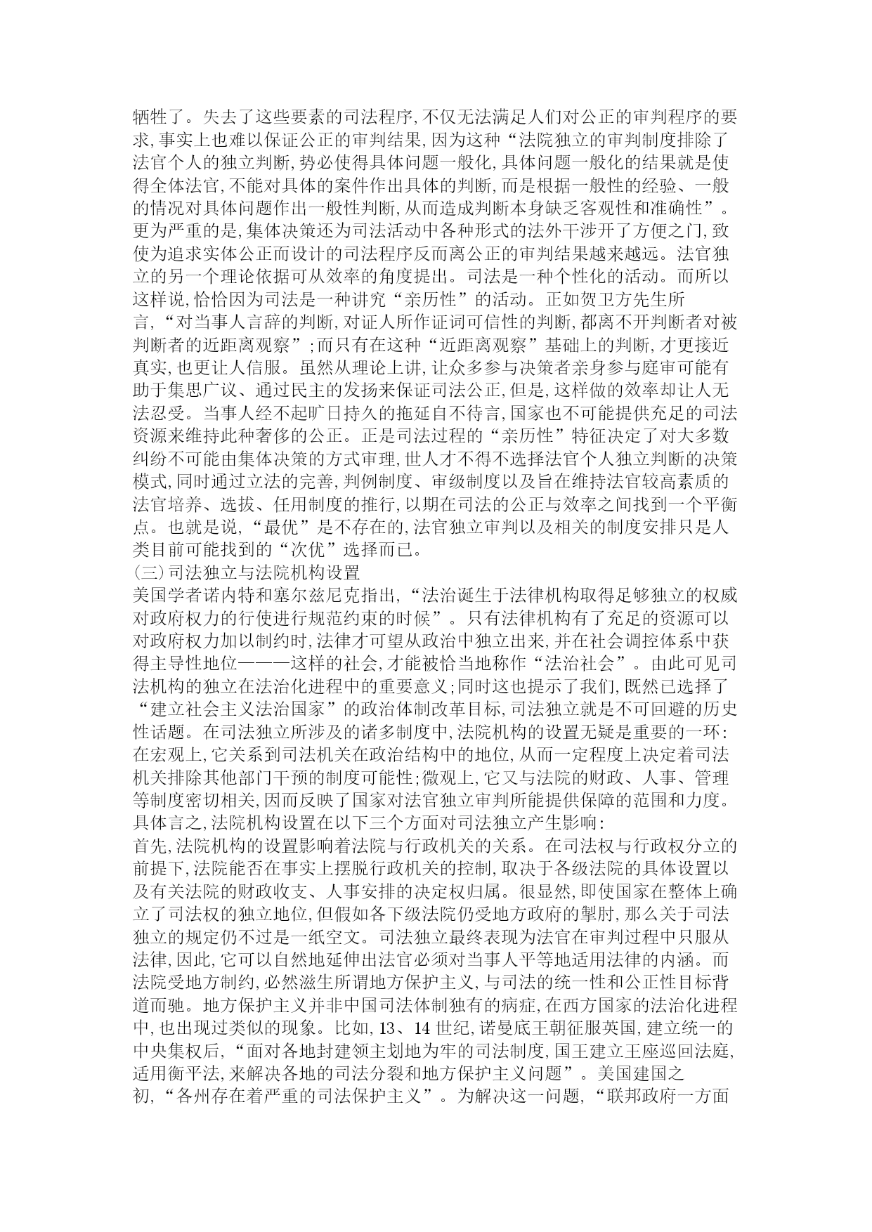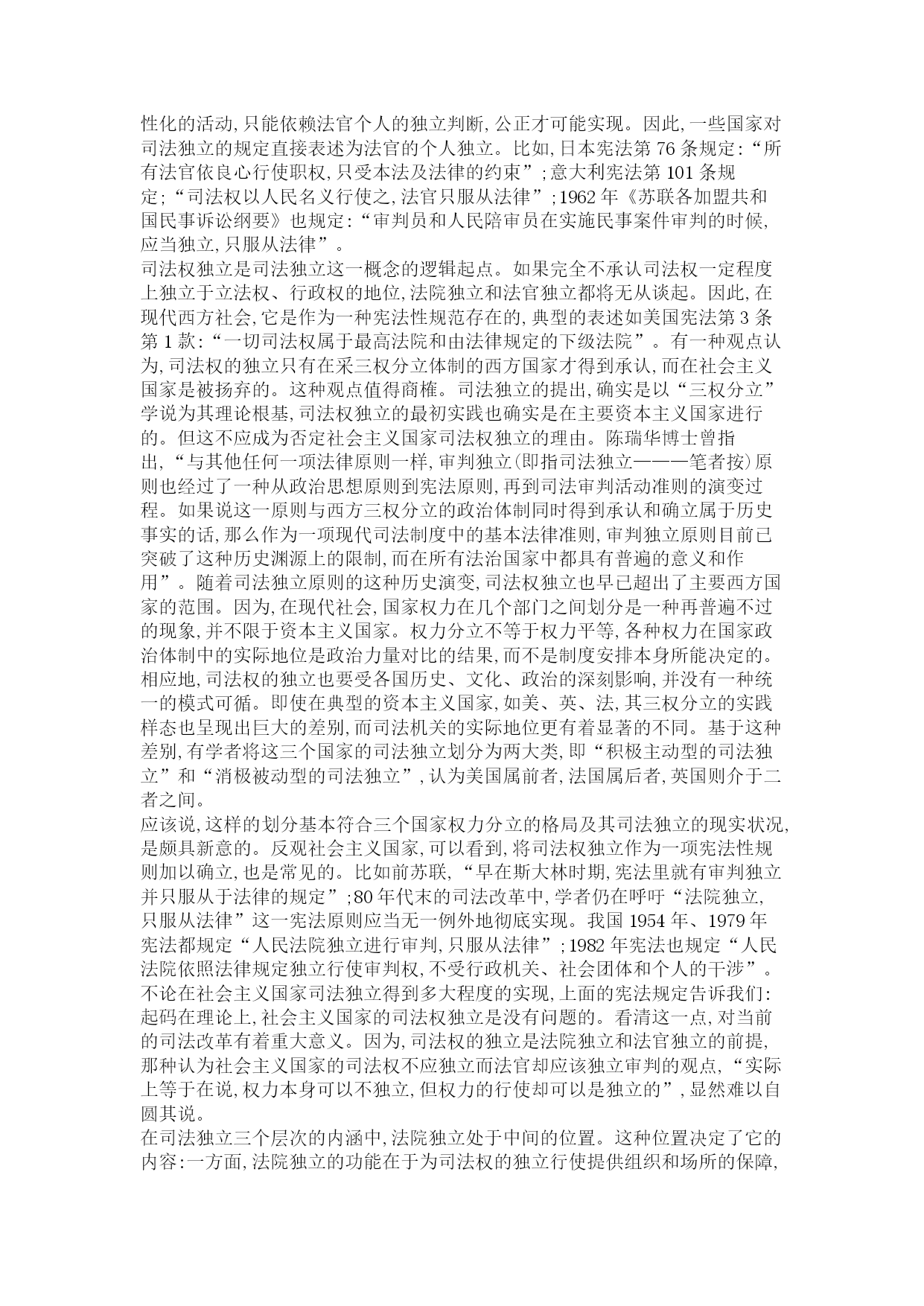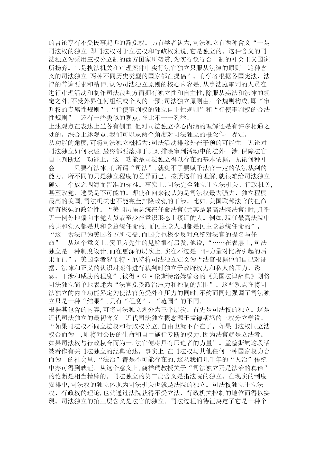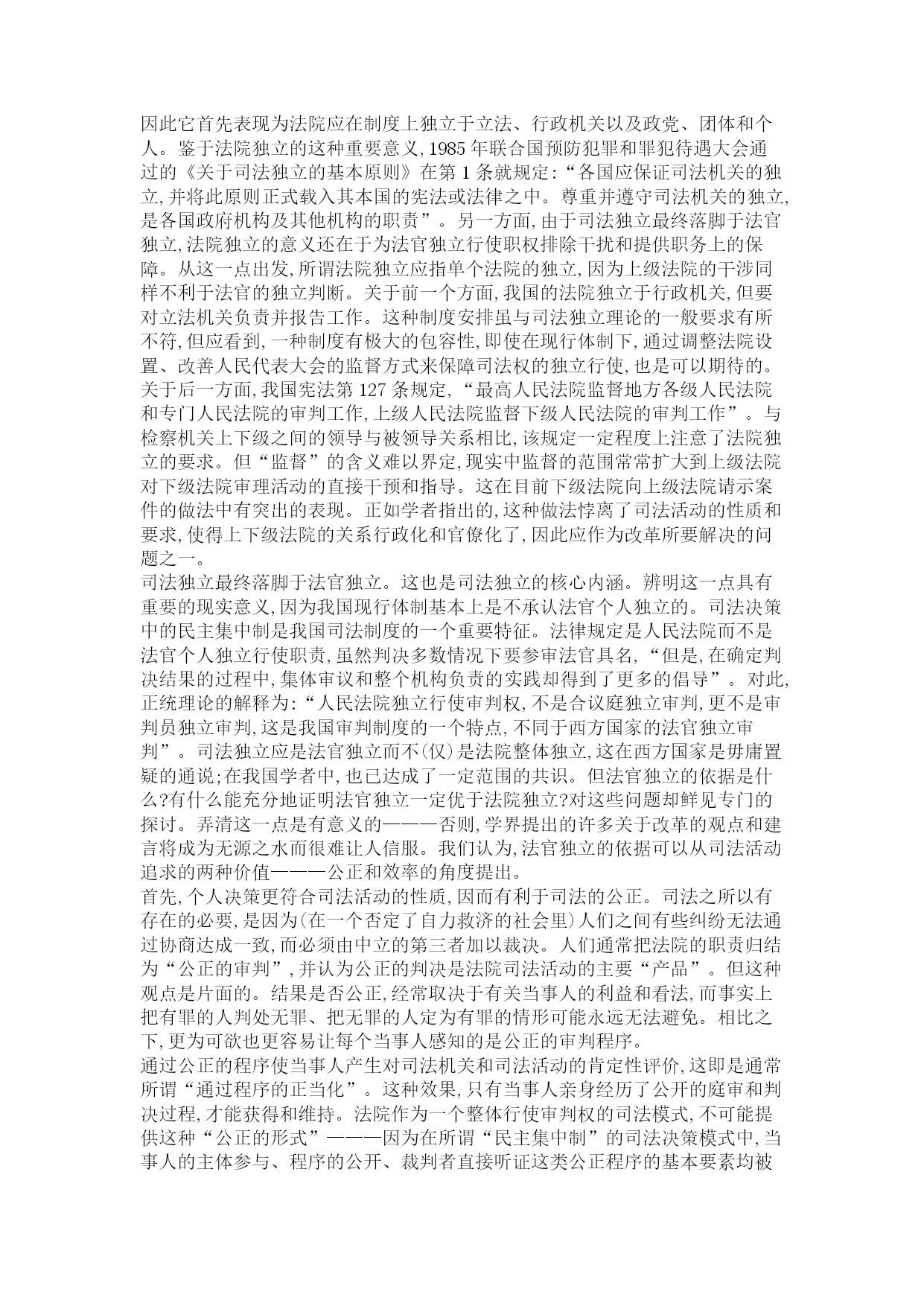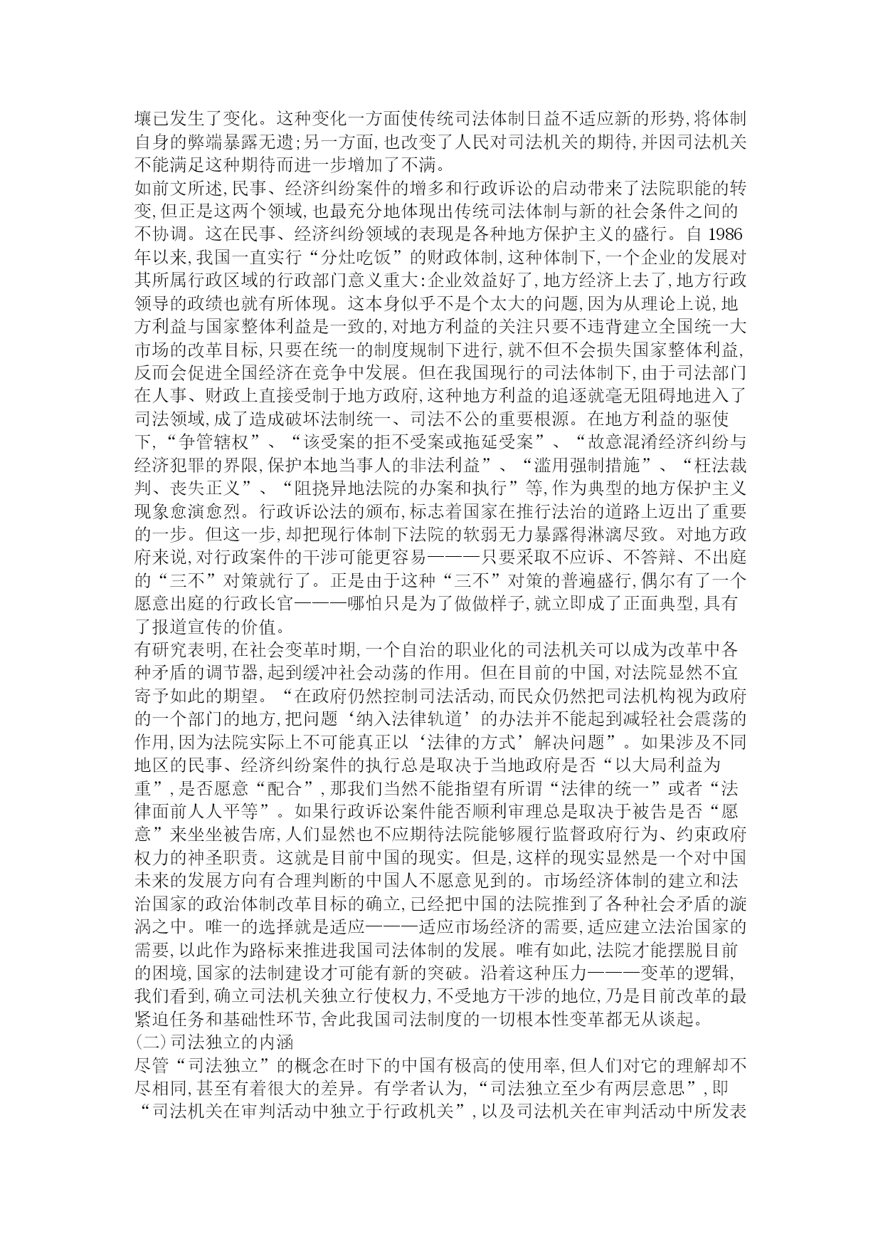 司法独立与法院组织机构的调整(上)(完整版)实用资料(可以直接使用,可编辑完整版实用资料,欢迎下载)司法独立与法院组织机构的调整(上)关键词:司法独立/法院组织机构/调整内容提要:本文旨在将有关司法独立的理论与我国司法权配制、运作的现状相联系,提出一种可望根本解决我国司法制度问题的方案。文章首先分析了司法独立在我国提出的特定背景,司法独立的丰富内涵及其与法院机构设置之间的关系。在此基础上,全面评析了有关法院机构改革的各种观点,并根据司法独立的一般要求、我国的现实国情和社会发展趋势,提出了调整我国法院组织机构,重组、分流现任法官的系统方案。关于司法改革的讨论是近年来中国法学界少有的一个热点。无论就参与人员的广泛性还是问题设置的多角度性、理论分析的多层次性,这次讨论都已达到了相当令人瞩目的程度。由于学界在现行体制弊端的判断以及改革方向的设定等方面均已达成一些共识,我们认为,目前似乎已不应局限于引介一些西方的司法理念、原则和制度,或者就事论事地讨论某些具体制度的改革策略了。随着有关理论研究和实践探索的推进,进行总体性、全局性的方案设计已经势在必行。首先,学理的引进和吸收已取得一些成就,大致可以为全局性的方案设计提供理论上的支撑;其次,倡导司法改革的话语已从学者的论著走入了党和国家高层领导的讲话、中央的正式文件中,最高法院甚至制定了司法改革的五年纲要,因此进行全局性的变革已具备了舆论和政策的氛围;最后,某些地方司法机关的改革探索已取得一些成果,获得了不少经验,这些经验和举措应引起重视并在充分论证、通盘考虑的基础上加以修正、推广。最重要的是,司法腐败、司法不公、地方保护主义已发展到了令人震惊的地步,形势的严峻使得局部的、零打碎敲的改革已难以满足公众的期望;况且,由于各种制度之间的关联性,这种“头痛医头、脚痛医脚”的改革事实上也难以取得期待中的效果。因此,在我们看来,对我国的司法改革进行总体性、全局性的方案设计,其可行性和必要性均已相当明显。在对已有成果———理论的和实践的———进行全面、充分总结的基础上,根据市场经济的需要和我国社会发展趋势,提出一套可望从根本上解决中国司法制度问题的方案,是本文所奢望达到的目标。在中国的特定语境下讨论司法改革,既要分析各种制度本身的合理性和不合理性,还要关注以各种形式出现的“中国国情”———比如司法机关、司法人员的现实状况,国家财政的承受力,公众对改革的接纳度等等,这使得我们在进行改革方案的设计时发觉困难重重。另外,问题本身的多层次、多角度,也增加了总体把握的难度。对此,本文的处理是:一方面绝不回避问题,力图把“理想型”目标与中国不尽人意的现实加以协调,提出不仅合理、而且可行的方案;另一方面,选择了法院机构调整作为讨论的切入点,以此出发,对中国司法制度改革中的大多数问题进行尽可能全面、细致的分析和探讨。一、司法独立与法院的机构设置(一)司法独立问题的提出改革开放以来,我国人民法院的组织建设得到了迅速的发展。对此,可从法院工作人员数量以及其审结案件数量的变化中清楚地看到。1979年,人民法院有“干警”5.9万人,而1998年达到28万人;1980年人民法院审案856,200件,1998年则达到541万余件。同时,随着国家工作中心的转移和改革开放的推进,法院受理案件在构成上有了重大变化,经济案件和民事案件大幅度上升。1981年10月到1982年9月,各级法院共审理了203,000余件刑事案件,767,300余件民事案件和部分经济合同纠纷案件;而1998年,全国法院受理一审刑事案件共48.2万余件,仅占收案总数的10.36%,受理民事、经济、行政、海事等多类一审案件492.9万余件,占收案总数的89.64%。由此可以看到民事、经济纠纷在人民法院审判工作中份量的增大,表明我国司法工作的重心已逐渐由打击犯罪转移到了民事(经济)纠纷的解决上。1990年10月《行政诉讼法》颁布后,人民法院进一步获得了监督政府行为、约束政府权力的崭新职能。到1997年,全国法院受理的行政案件已达到90577件,比上年上升13.24%。这使我国法院的社会功能进一步拓宽,社会角色进一步转变。然而,当法院在社会生活中的影响日益显著,地位日益提高的时候,它也正遭到越来越多的批评。“司法不公”、“司法腐败”、“地方保护主义”这样的否定性评价,不仅出现在学者的著作中,出现在平常百姓的闲聊中,而且频频出现于党和国家领导人的讲话、官方正式文件中。这似乎足以说明问题的严重性。随着批评和讨论的深入,人们对上述问题的根源的认识也逐渐超越了“个别法官政治立场不坚定、素质较低”之类似是而非的对人评价而上升到制度的层面,这时,一个过去曾被多次批判的概念———“司法独立”重新回响在人们的耳畔,并且几乎成了关于司法改革的所有期待性话语中的最强音。时至今日,认