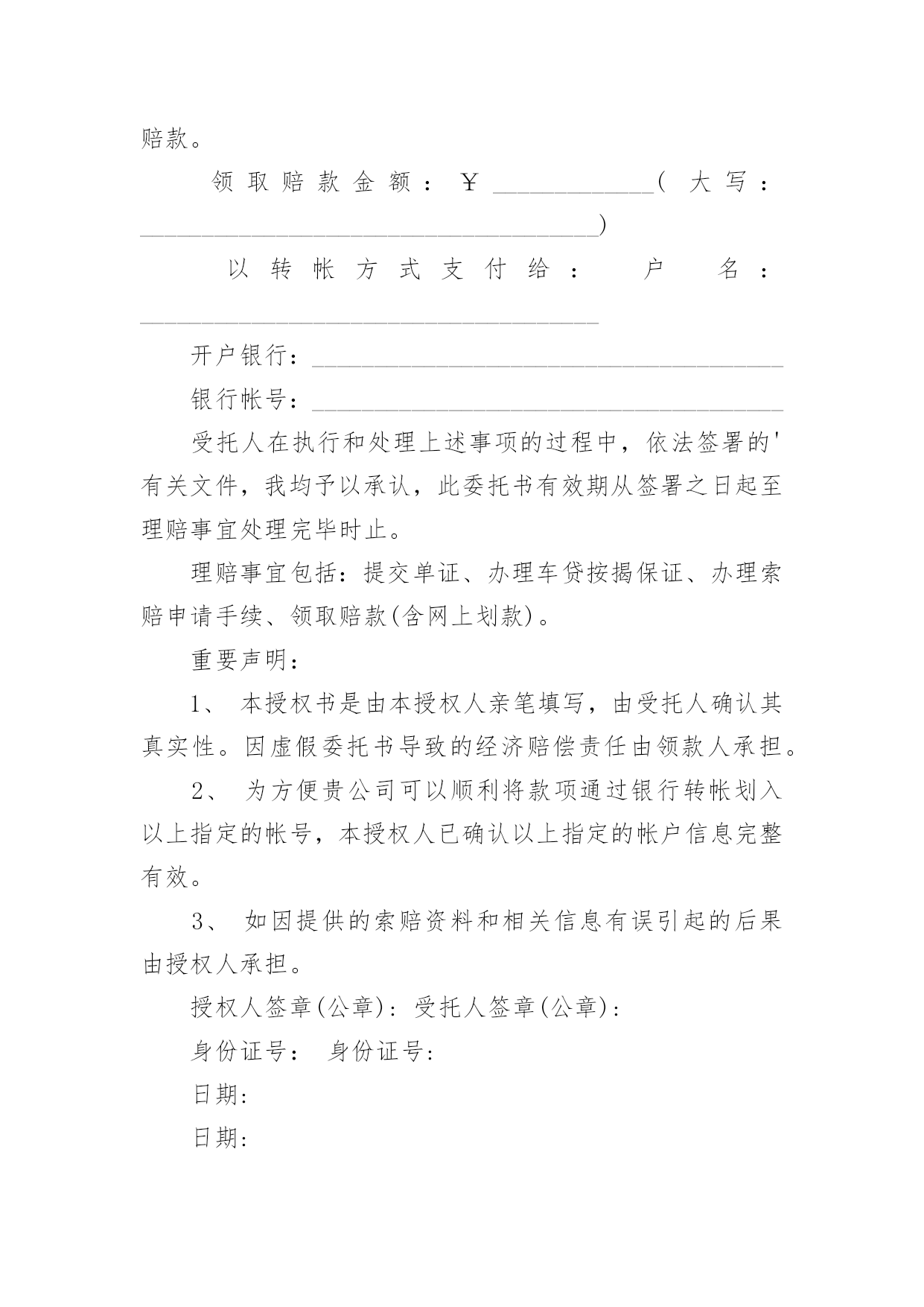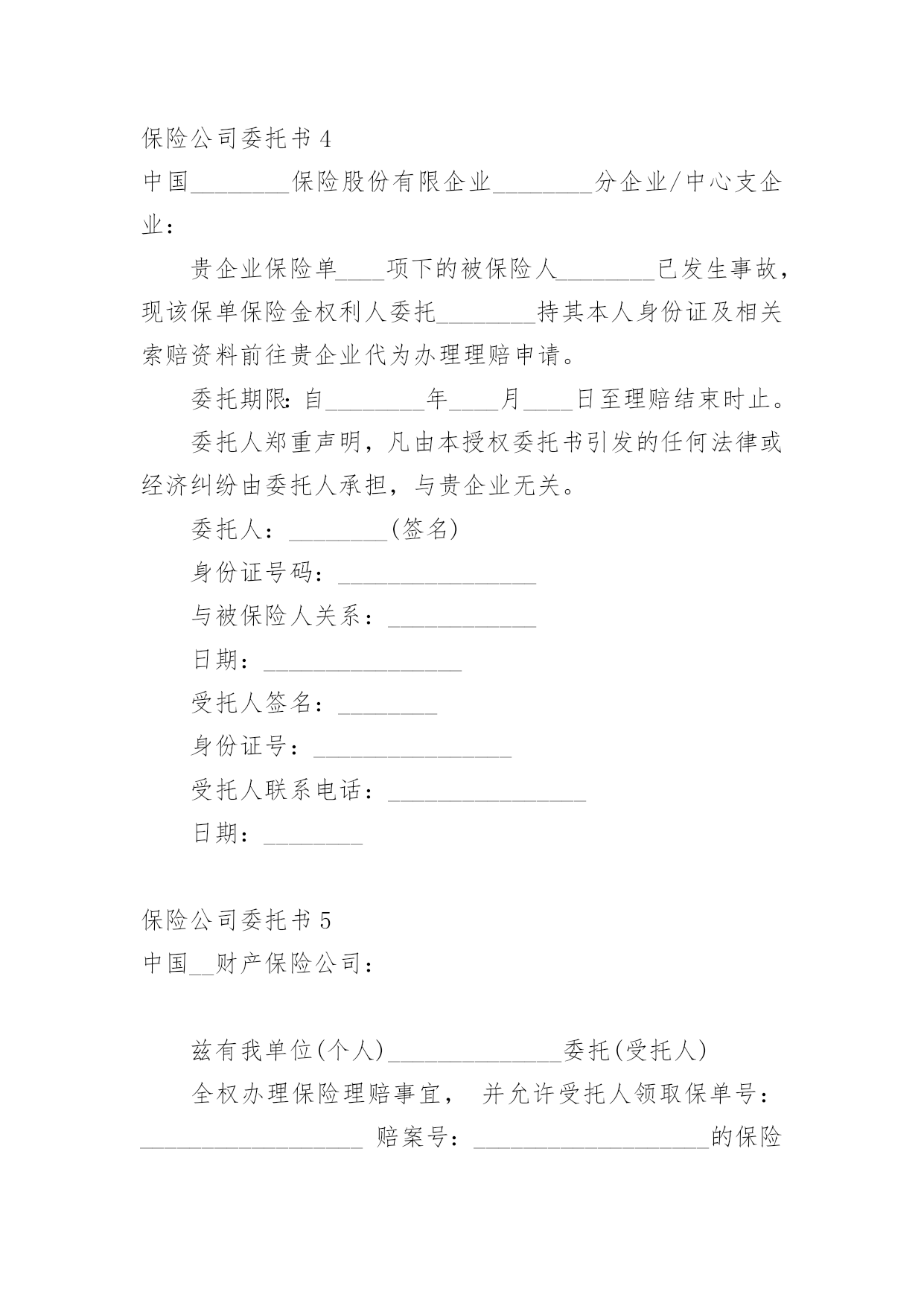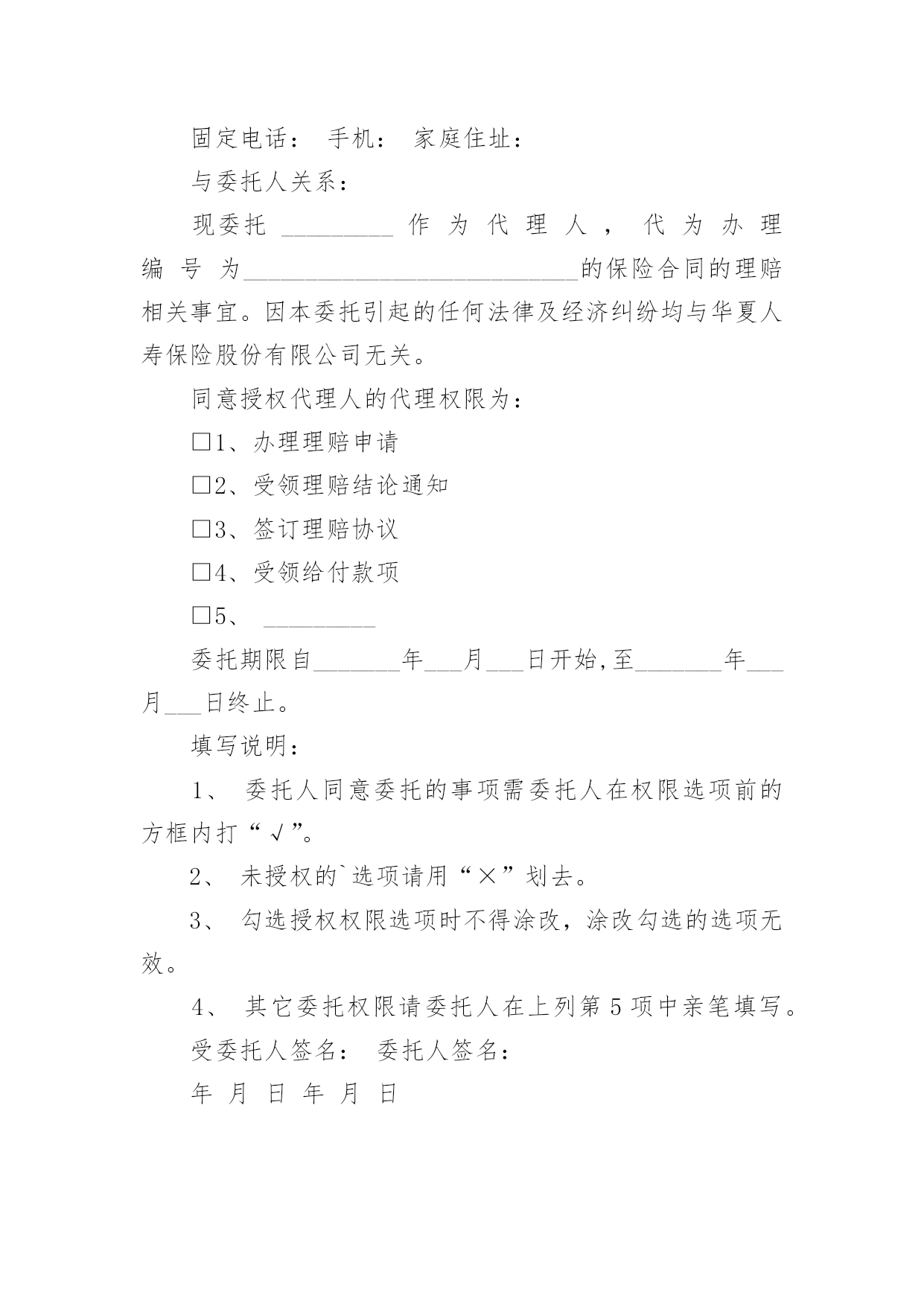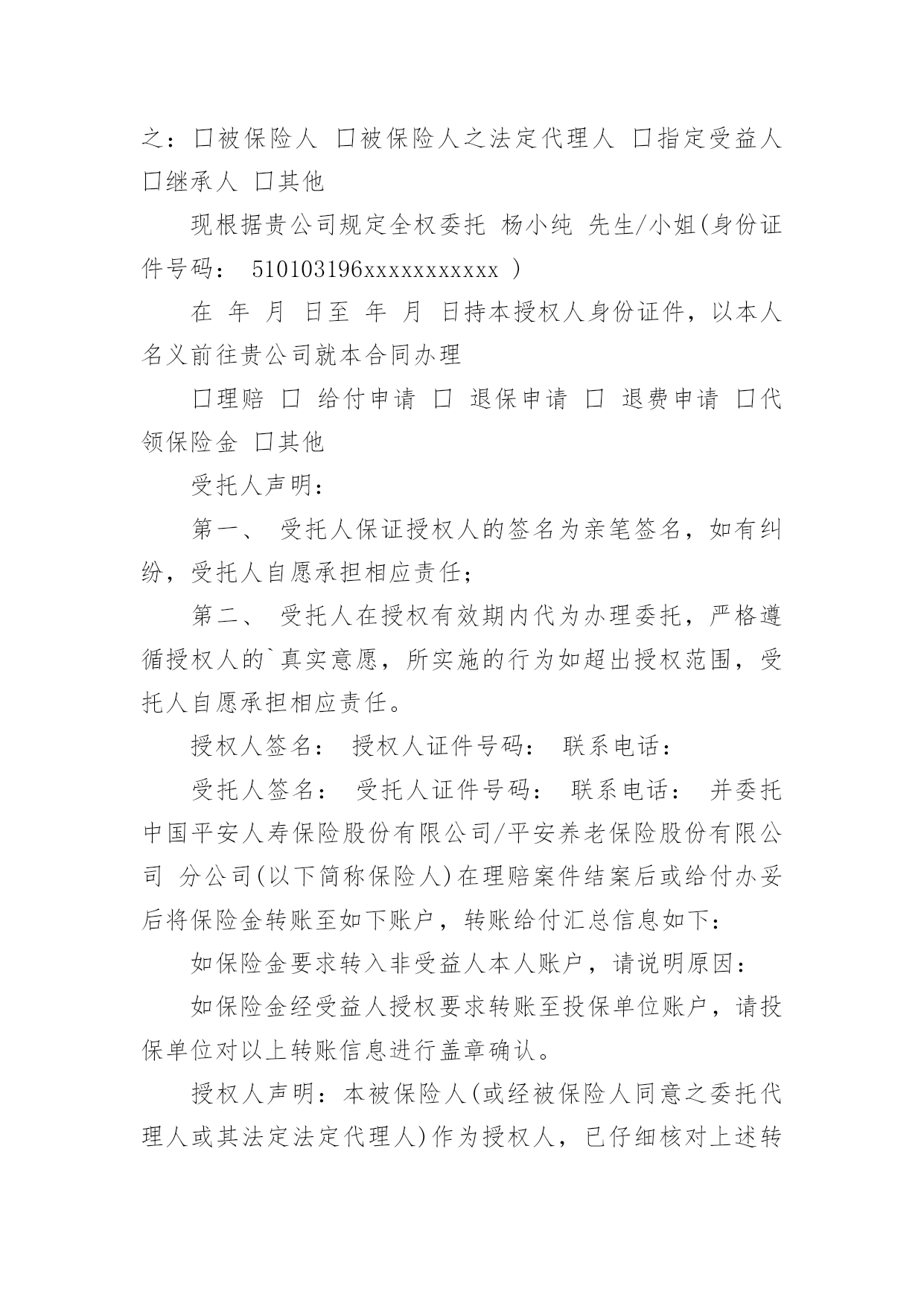 保险公司委托书被委托人如果没有做出违背国家法律的任何权益,委托人无有权终止委托协议。在当今社会生活中,处理事务上我们需要用到委托书,大家知道委托书的格式吗?以下是小编为大家整理的保险公司委托书,仅供参考,希望能够帮助到大家。保险公司委托书1xxx人民保险公司:我名叫韦明抓,持有摩托车驾驶证号:XXXXXXXXXXXXXXXX,本人的摩托车贵JMSXXX在贵公司投保险。本人于20xx年01月03日驾驶贵JMSXXX在XX镇县道942线29KM+100米处不幸意外发生交通事故,造成XXX右腿粉碎性骨折,县交警认定我负事故全责。对于给伤者造成的身体、精神和经济上的损失,因本人经济困难,无钱赔偿给受伤者。事故发生后,我一直在广东打工至今,不能回老家亲自前来办理保险理赔赔偿事故伤者,现特全权委托受伤者XXX前来贵公司办理事故理赔,并请把理赔款直接打到事故受伤者XXX的'银行账户为荷。委托期限自本人签名之日起至理赔结束止。特此委托委托人(签名、按手印):身份证号:保险公司委托书2中国平安人寿保险股份有限公司/平安养老保险股份有限公司:本人(姓名)身份证件号码:系单位(保单号)下所载之:囗被保险人囗被保险人之法定代理人囗指定受益人囗继承人囗其他现根据贵公司规定全权委托先生/小姐身份证件号码:在年月日至年月日持本授权人身份证件,以本人名义前往贵公司就本合同办理囗理赔囗给付申请囗退保申请囗退费申请囗代领保险金囗其他受托人声明:第一、受托人保证授权人的签名为亲笔签名,如有纠纷,受托人自愿承担相应责任;第二、受托人在授权有效期内代为办理委托,严格遵循授权人的.真实意愿,所实施的行为如超出授权范围,受托人自愿承担相应责任。授权人签名:授权人证件号码:联系电话:受托人签名:受托人证件号码:联系电话:保险公司委托书3委托人姓名:身份证号码:固定电话:手机:家庭住址:受委托人姓名:身份证号码:固定电话:手机:家庭住址:与委托人关系:现委托_________作为代理人,代为办理编号为___________________________的保险合同的理赔相关事宜。因本委托引起的任何法律及经济纠纷均与华夏人寿保险股份有限公司无关。同意授权代理人的代理权限为:□1、办理理赔申请□2、受领理赔结论通知□3、签订理赔协议□4、受领给付款项□5、_________委托期限自_______年___月___日开始,至_______年___月___日终止。填写说明:1、委托人同意委托的事项需委托人在权限选项前的方框内打“√”。2、未授权的`选项请用“×”划去。3、勾选授权权限选项时不得涂改,涂改勾选的选项无效。4、其它委托权限请委托人在上列第5项中亲笔填写。受委托人签名:委托人签名:年月日年月日保险公司委托书4中国________保险股份有限企业________分企业/中心支企业:贵企业保险单____项下的被保险人________已发生事故,现该保单保险金权利人委托________持其本人身份证及相关索赔资料前往贵企业代为办理理赔申请。委托期限:自________年____月____日至理赔结束时止。委托人郑重声明,凡由本授权委托书引发的任何法律或经济纠纷由委托人承担,与贵企业无关。委托人:________(签名)身份证号码:________________与被保险人关系:____________日期:________________受托人签名:________身份证号:________________受托人联系电话:________________日期:________保险公司委托书5中国__财产保险公司:兹有我单位(个人)______________委托(受托人)全权办理保险理赔事宜,并允许受托人领取保单号:__________________赔案号:___________________的保险赔款。领取赔款金额:¥_____________(大写:_____________________________________)以转帐方式支付给:户名:_____________________________________开户银行:______________________________________银行帐号:______________________________________受托人在执行和处理上述事项的过程中,依法签署的'有关文件,我均予以承认,此委托书有效期从签署之日起至理赔事宜处理完毕时止。理赔事宜包括:提交单证、办理车贷按揭保证、办理索赔申请手续、领取赔款(含网上划款)。重要声明:1、本授权书是由本授权人亲笔填写,由受托人确认其真实性。因虚假委托书导致的经济赔偿责任由领款人承担。2、为方便贵公司可以顺利将款项通过银行转帐划入以上指定的帐号,本授权人