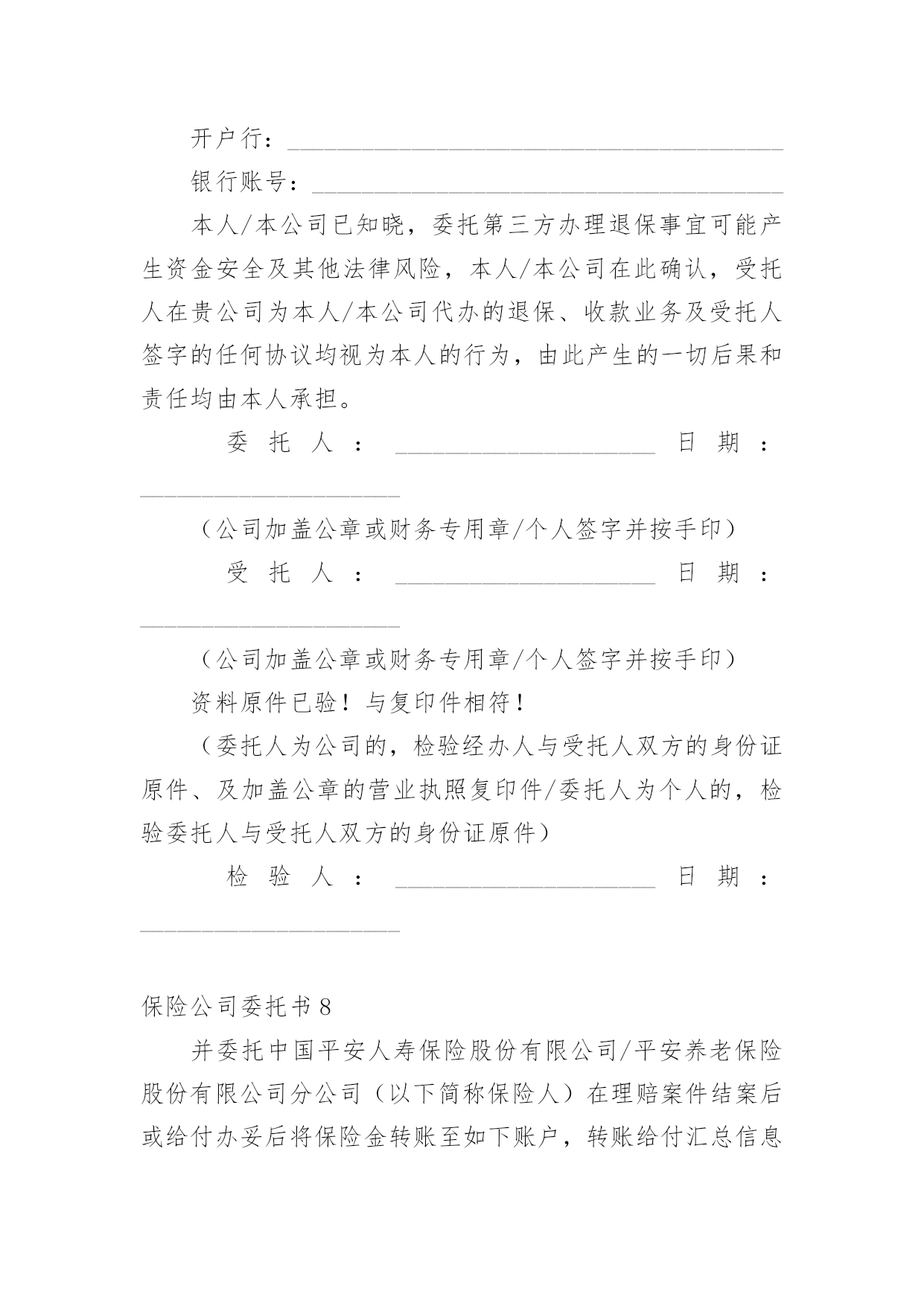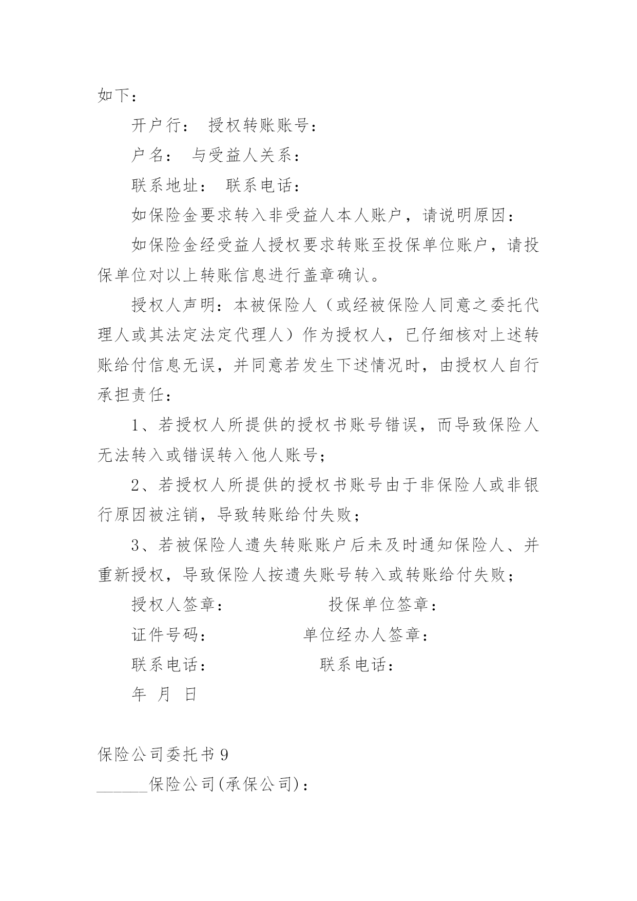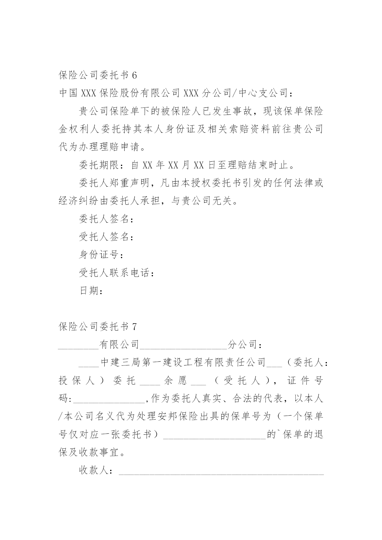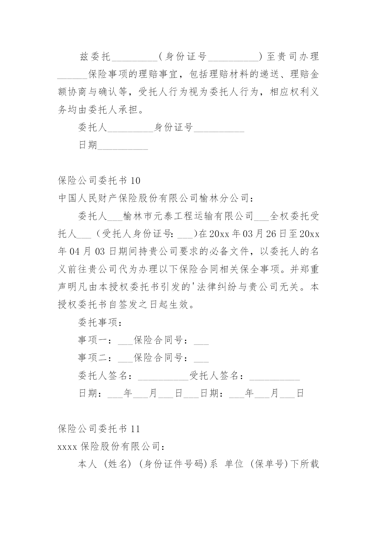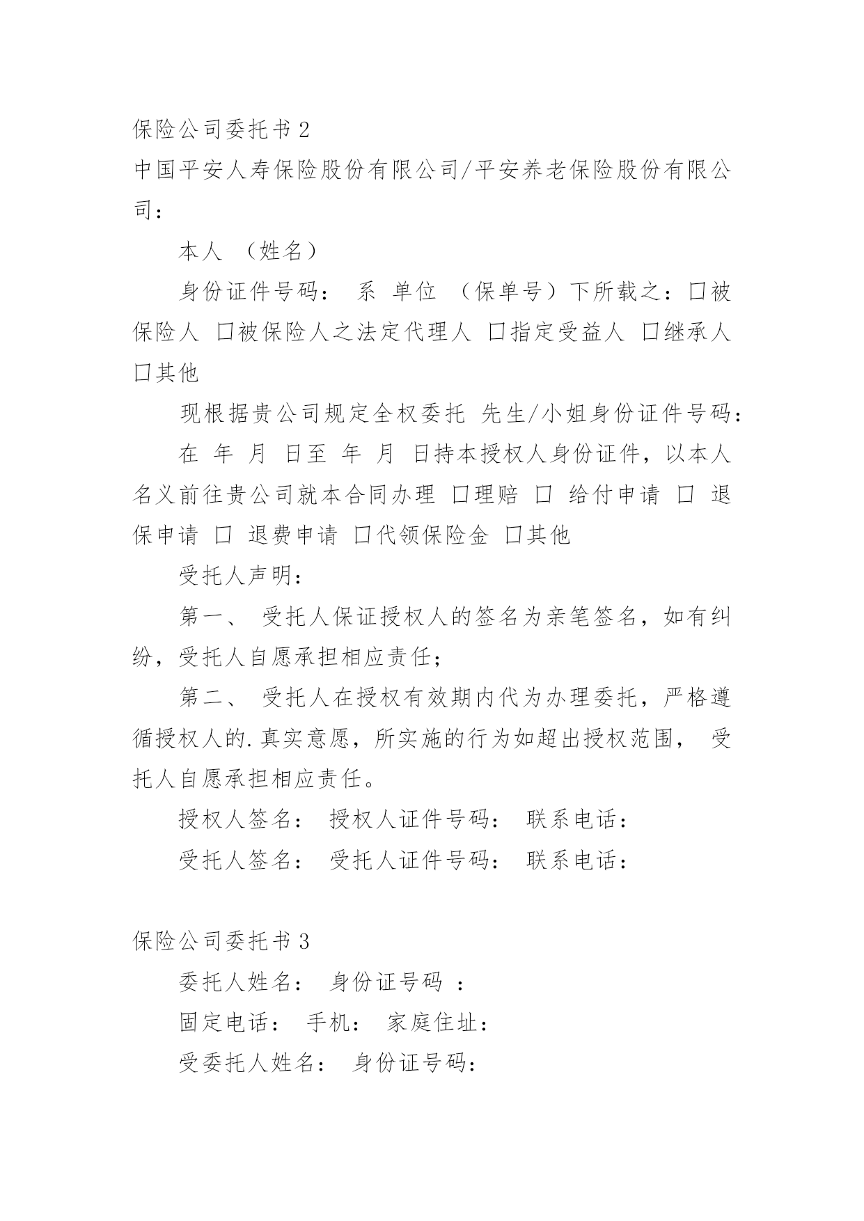 保险公司委托书被委托人如果没有做出违背国家法律的任何权益,委托人无有权终止委托协议。在当今社会生活中,处理事务上我们需要用到委托书,大家知道委托书的格式吗?以下是小编为大家整理的保险公司委托书,仅供参考,希望能够帮助到大家。保险公司委托书1xxx人民保险公司:我名叫韦明抓,持有摩托车驾驶证号:XXXXXXXXXXXXXXXX,本人的摩托车贵JMSXXX在贵公司投保险。本人于20xx年01月03日驾驶贵JMSXXX在XX镇县道942线29KM+100米处不幸意外发生交通事故,造成XXX右腿粉碎性骨折,县交警认定我负事故全责。对于给伤者造成的身体、精神和经济上的损失,因本人经济困难,无钱赔偿给受伤者。事故发生后,我一直在广东打工至今,不能回老家亲自前来办理保险理赔赔偿事故伤者,现特全权委托受伤者XXX前来贵公司办理事故理赔,并请把理赔款直接打到事故受伤者XXX的'银行账户为荷。委托期限自本人签名之日起至理赔结束止。特此委托委托人(签名、按手印):身份证号:保险公司委托书2中国平安人寿保险股份有限公司/平安养老保险股份有限公司:本人(姓名)身份证件号码:系单位(保单号)下所载之:囗被保险人囗被保险人之法定代理人囗指定受益人囗继承人囗其他现根据贵公司规定全权委托先生/小姐身份证件号码:在年月日至年月日持本授权人身份证件,以本人名义前往贵公司就本合同办理囗理赔囗给付申请囗退保申请囗退费申请囗代领保险金囗其他受托人声明:第一、受托人保证授权人的签名为亲笔签名,如有纠纷,受托人自愿承担相应责任;第二、受托人在授权有效期内代为办理委托,严格遵循授权人的.真实意愿,所实施的行为如超出授权范围,受托人自愿承担相应责任。授权人签名:授权人证件号码:联系电话:受托人签名:受托人证件号码:联系电话:保险公司委托书3委托人姓名:身份证号码:固定电话:手机:家庭住址:受委托人姓名:身份证号码:固定电话:手机:家庭住址:与委托人关系:现委托_________作为代理人,代为办理编号为___________________________的保险合同的理赔相关事宜。因本委托引起的任何法律及经济纠纷均与华夏人寿保险股份有限公司无关。同意授权代理人的代理权限为:□1、办理理赔申请□2、受领理赔结论通知□3、签订理赔协议□4、受领给付款项□5、_________委托期限自_______年___月___日开始,至_______年___月___日终止。填写说明:1、委托人同意委托的事项需委托人在权限选项前的方框内打“√”。2、未授权的`选项请用“×”划去。3、勾选授权权限选项时不得涂改,涂改勾选的选项无效。4、其它委托权限请委托人在上列第5项中亲笔填写。受委托人签名:委托人签名:年月日年月日保险公司委托书4中国________保险股份有限企业________分企业/中心支企业:贵企业保险单____项下的被保险人________已发生事故,现该保单保险金权利人委托________持其本人身份证及相关索赔资料前往贵企业代为办理理赔申请。委托期限:自________年____月____日至理赔结束时止。委托人郑重声明,凡由本授权委托书引发的任何法律或经济纠纷由委托人承担,与贵企业无关。委托人:________(签名)身份证号码:________________与被保险人关系:____________日期:________________受托人签名:________身份证号:________________受托人联系电话:________________日期:________保险公司委托书5中国__财产保险公司:兹有我单位(个人)______________委托(受托人)全权办理保险理赔事宜,并允许受托人领取保单号:__________________赔案号:___________________的保险赔款。领取赔款金额:¥_____________(大写:_____________________________________)以转帐方式支付给:户名:_____________________________________开户银行:______________________________________银行帐号:______________________________________受托人在执行和处理上述事项的过程中,依法签署的'有关文件,我均予以承认,此委托书有效期从签署之日起至理赔事宜处理完毕时止。理赔事宜包括:提交单证、办理车贷按揭保证、办理索赔申请手续、领取赔款(含网上划款)。重要声明:1、本授权书是由本授权人亲笔填写,由受托人确认其真实性。因虚假委托书导致的经济赔偿责任由领款人承担。2、为方便贵公司可以顺利将款项通过银行转帐划入以上指定的帐号,本授权人