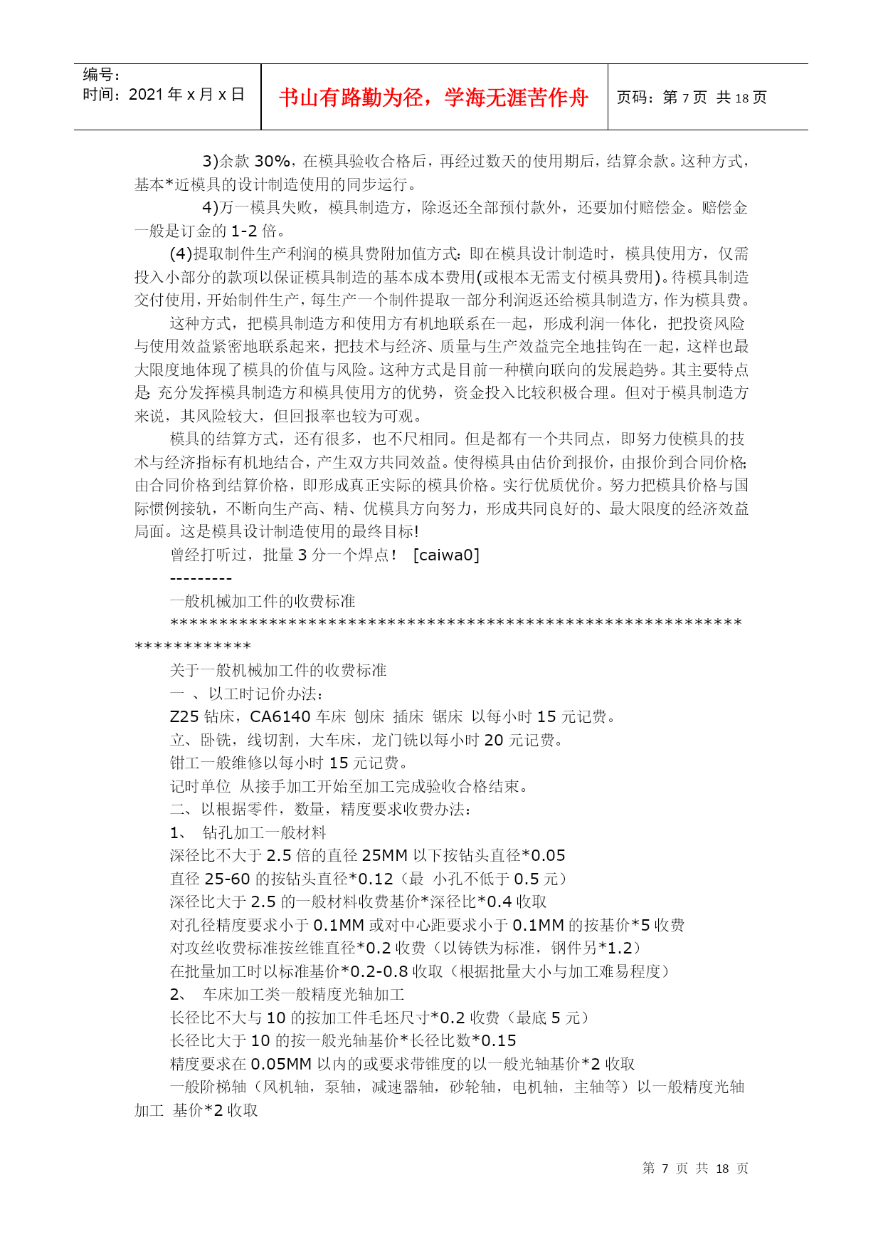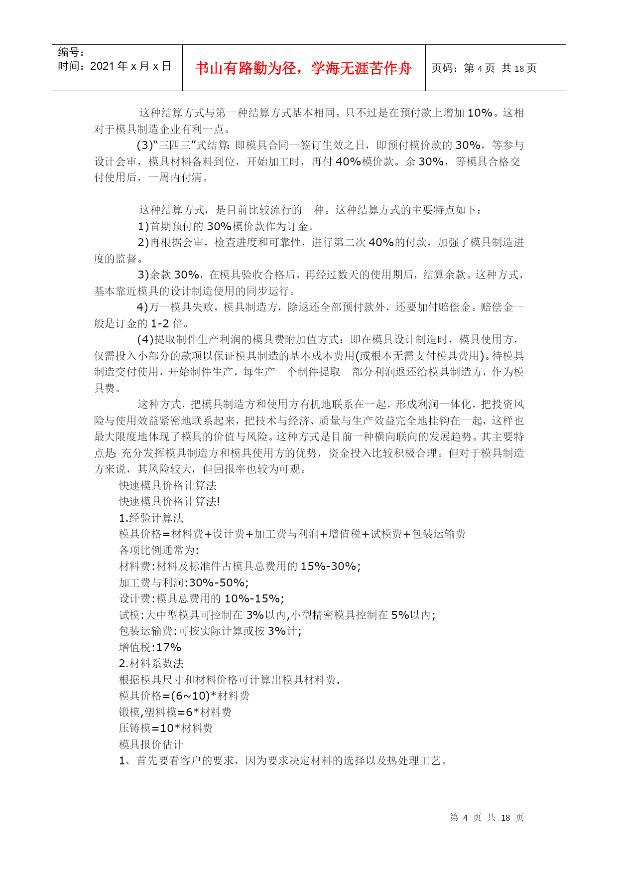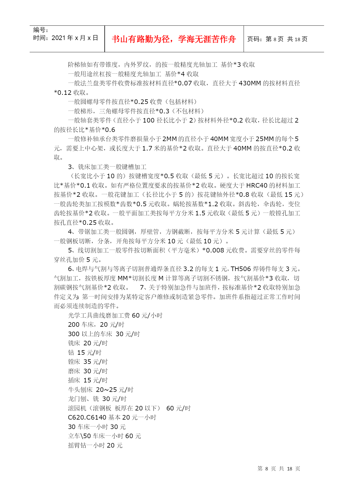 编号:时间:2021年x月x日书山有路勤为径,学海无涯苦作舟页码:第PAGE18页共NUMPAGES18页第PAGE\*MERGEFORMAT18页共NUMPAGES\*MERGEFORMAT18页机械加工估价机械加工估价需要懂得加工工艺,能够估出加工工件的时间,乘以各种设备单位时间的单价.-----线切割加工费一般按切割总面积计算的,0.XX元/平方毫米我们这里是按加工面积/1200*8元可怜啊,我们这里是按加工面积/1200*3元,高150mm以下通常是两种计算方法:1、0.01元/mm2,2、过小的零件一般按件计算大部分地方都是5厘/平方毫米!普通线切割一般按线割面积算,工件高度也高相应价也会高慢走丝的价格大概是普通线切割的10倍左右慢走丝加工在江浙地区一般按每小时60元(切割平均效率40-60mm/min),但精度高一点的模具切割要到80元,因为一旦报废需要陪付材料费加工时间计算:加工截面积/(1200-1800)=所需要时间,1200-1800是个可调节的参数,一般都取1500,然后在乘以每小时加工费就可以了快丝的话有的可以0.015元MM也有0.005元MM也有10元小时慢走丝加工割一刀0.03MM慢走丝加工割两刀0.038MM慢走丝加工割三刀0.045MM慢走丝加工割四刀0.055MM快丝是5元工时,一般每台一小时可割2.5工时我们这里线切割加工费用基本上也是10元/小时线切割分快丝与慢丝两种,他们的加工的精度不一样,慢丝可以达到0.001mm,但快丝就不能了。我做过沙迪克的慢丝。那里加工费是按面积计算的,同时还要看割的刀数,割一修一与割一修几的价格明显不一样,如果加工的零件高度超过一的范围就要番倍了,加工的材料不一样,他们的价格也不一样。例如:割钨钢就要番倍了,一般是2~~3倍。他们加工最低是50元一件(批量除外)标准计费方法:0.08元/平方毫米.普通线切割;截面积/1200*工时单价.慢走丝线切割约为普通的十倍.标准计费方法:批量加工0.08元/平方毫米.模具为0.12元/平方毫米快丝的是8元/小时一般做sodickaq550ls第一刀每小时走丝合成平方毫米为2400,第二刀约为第一刀的5倍。第三刀更快!!快丝大概是1200-1800然后乘一下自己订的费用就好了!!线切割分为快走丝与慢走丝普通线切割一般按线割面积算,工件高度也高相应价也会高慢走丝的价格大概是普通线切割的10倍左右慢走丝加工在江浙地区一般按每小时60元(切割平均效率40-60mm/min),但精度高一点的模具切割要到80元,因为一旦报废需要陪付材料费加工时间计算:加工截面积/(1200-1800)=所需要时间,1200-1800是个可调节的参数,一般都取1500,然后在乘以每小时加工费就可以了。快丝的话有的可以0.015元mm也有0.005元mm也有10元小时慢走丝加工割一刀0.03mm慢走丝加工割两刀0.038mm慢走丝加工割三刀0.045mm慢走丝加工割四刀0.055mm大家来讨论模具报价,可以分模具种类,材料种类等情况来讨论!也可以贴图上来大家研讨钣金类报价计算方式钣金的制造核价是按操作时间计算的激光切割8RMB/M每个小孔洞按1RMB计算数控计价5RMB/Min数控折弯计价每边1RMB大边加倍冷作焊接计算一天70RMB,每工一天50KG为基准以上计算方式需综合素质高,对行业动态极为了解,即操作困难以下钣金计算是不考虑制造加工工艺的经验计算式:材料价=展开落料公斤数x市场材料价加工费计算:不考虑工艺,税收,管理费用及运费基准计算:3200RMB/T的冷轧钢板t=2.01804-m7级IT7冷作加工费用:8.0~8.4RMB/KG,工人每工制作50KG以上,冷作包括以下:砂轮机切割、老式剪床、老式折弯机、火焰穿孔、老电焊、外包价格为7.2~7.5RMB/KG。以上加工系数基数设置为1。模具价格计算1.经验计算法模具价格=材料费+设计费+加工费与利润+增值税+试模费+包装运输费各项比例通常为:材料费:材料及标准件占模具总费用的15%-30%;加工费与利润:30%-50%;设计费:模具总费用的10%-15%;试模:大中型模具可控制在3%以内,小型精密模具控制在5%以内;包装运输费:可按实际计算或按3%计;增值税:17%2.材料系数法根据模具尺寸和材料价格可计算出模具材料费.模具价格=(6~10)*材料费锻模,塑料模=6*材料费压铸模=10*材料费模具报价估计1、首先要看客户的要求,因为要求决定材料的选择以及热处理工艺。2、选择好材料,出一个粗略的模具方案图,从中