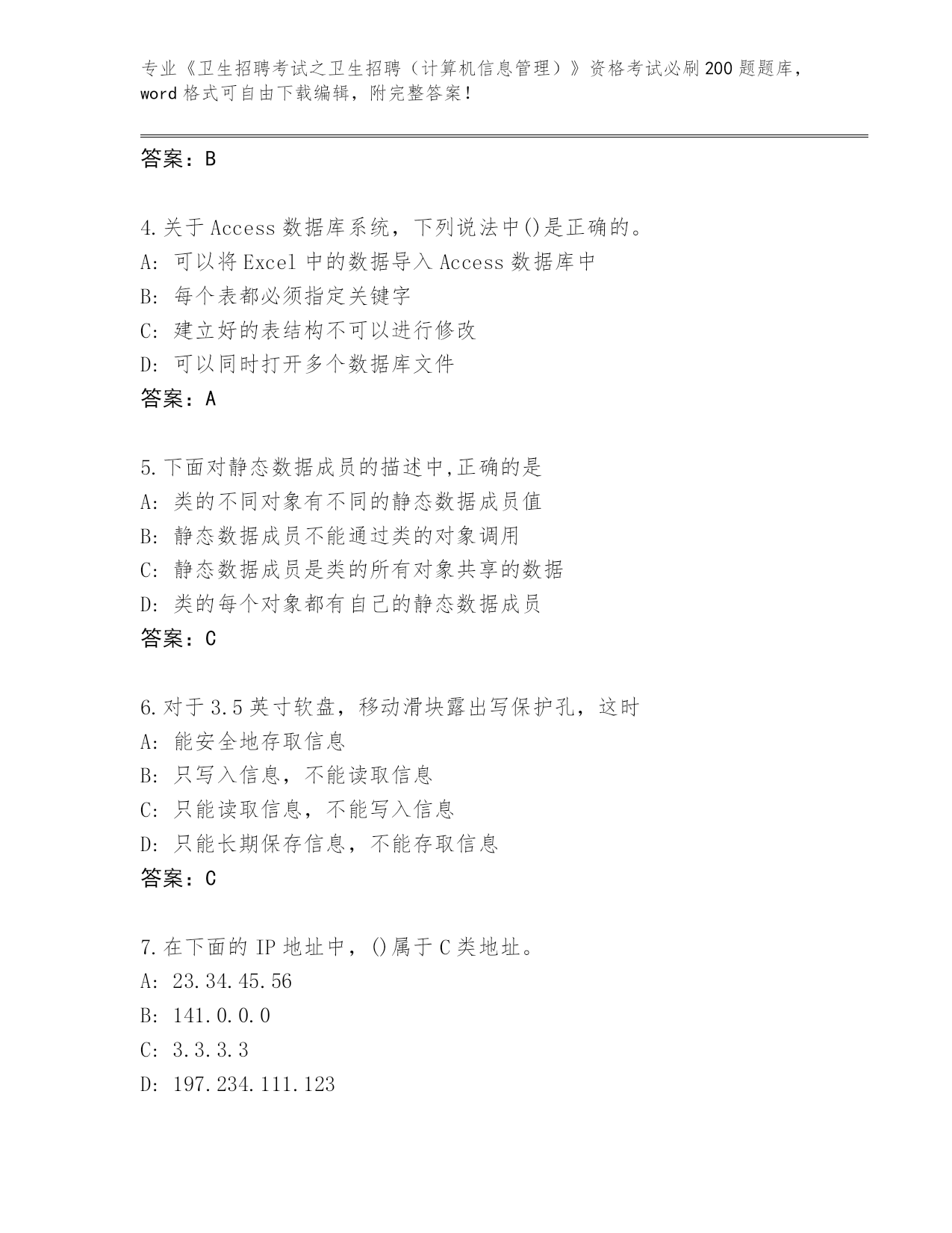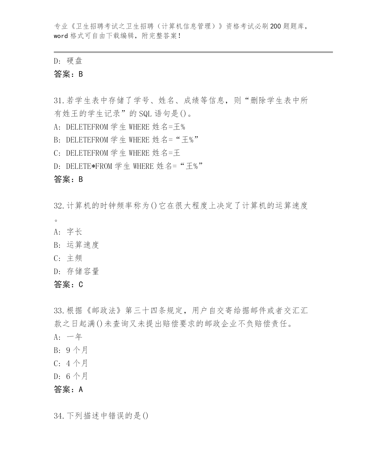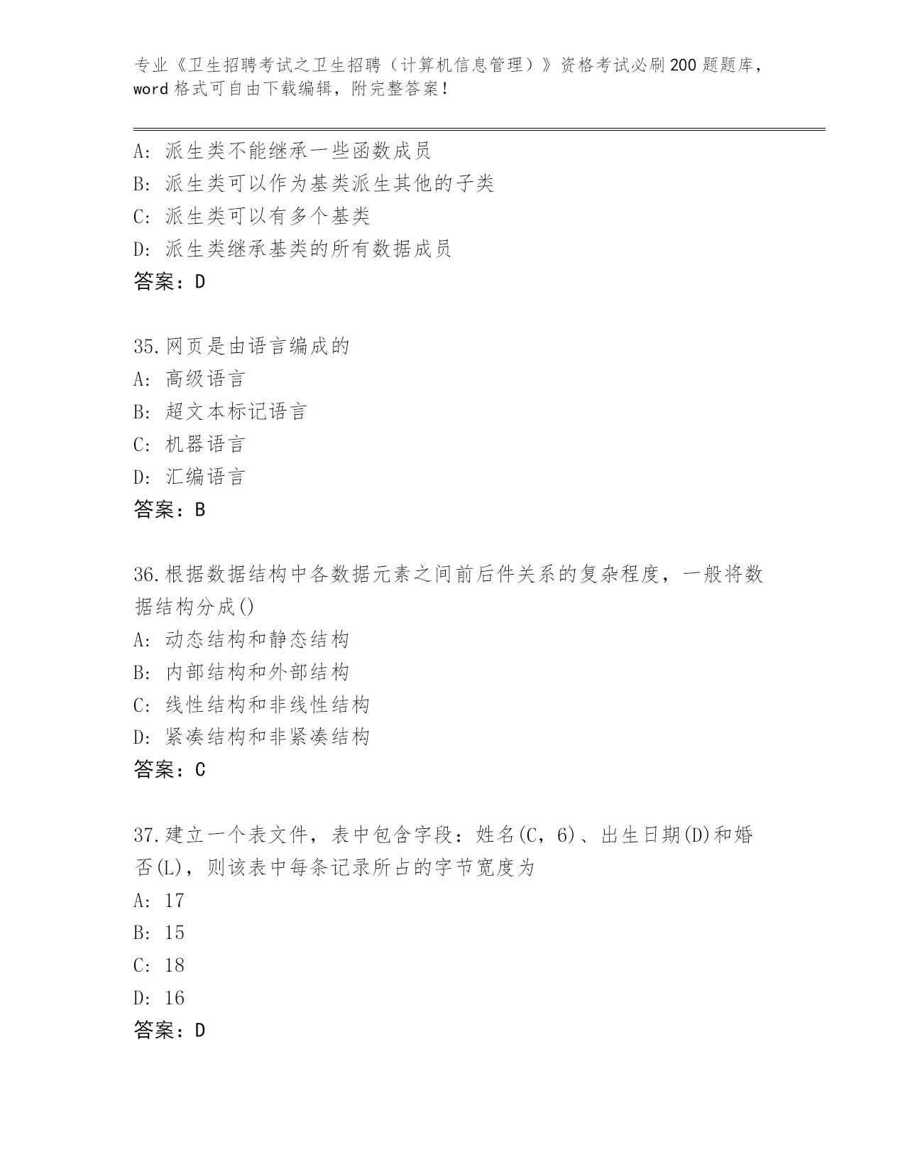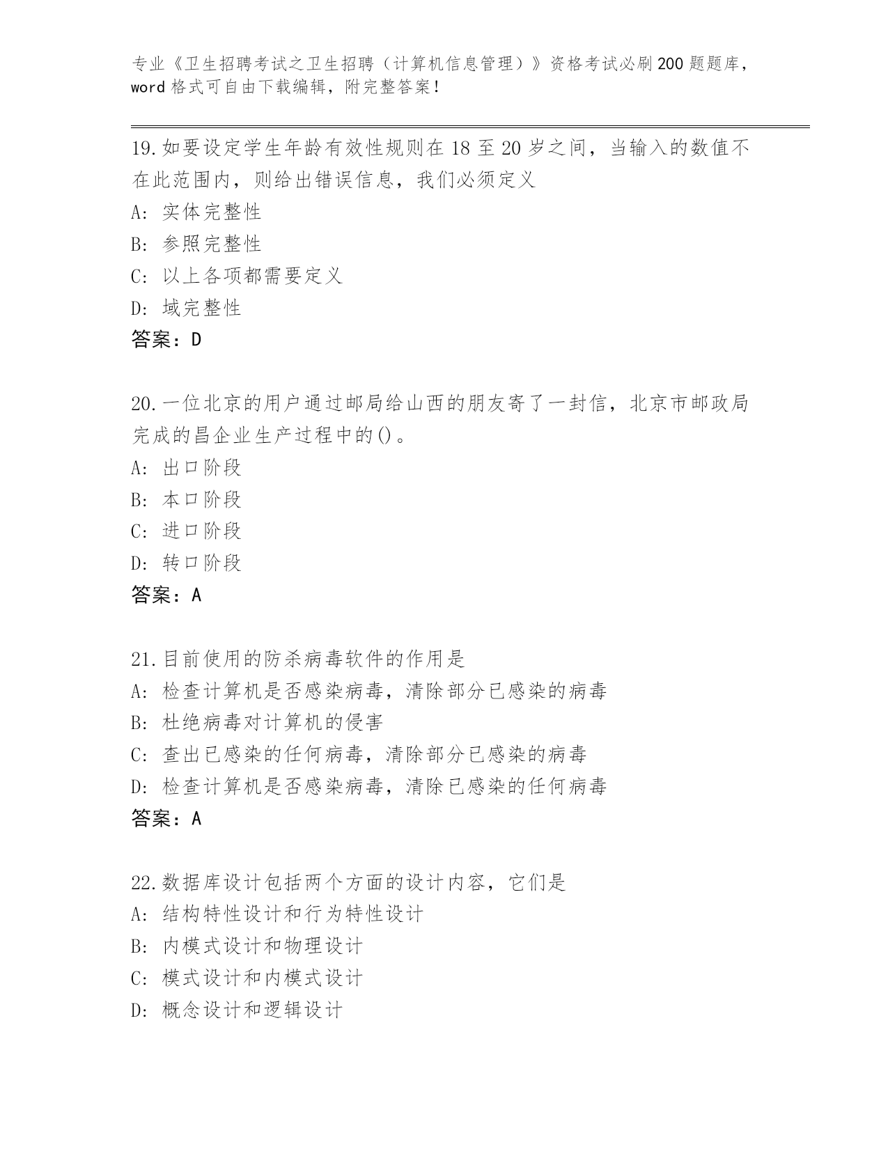 内部使用山西省沁水县《卫生招聘考试之卫生招聘(计算机信息管理)》资格考试必刷200题内部题库(A卷)