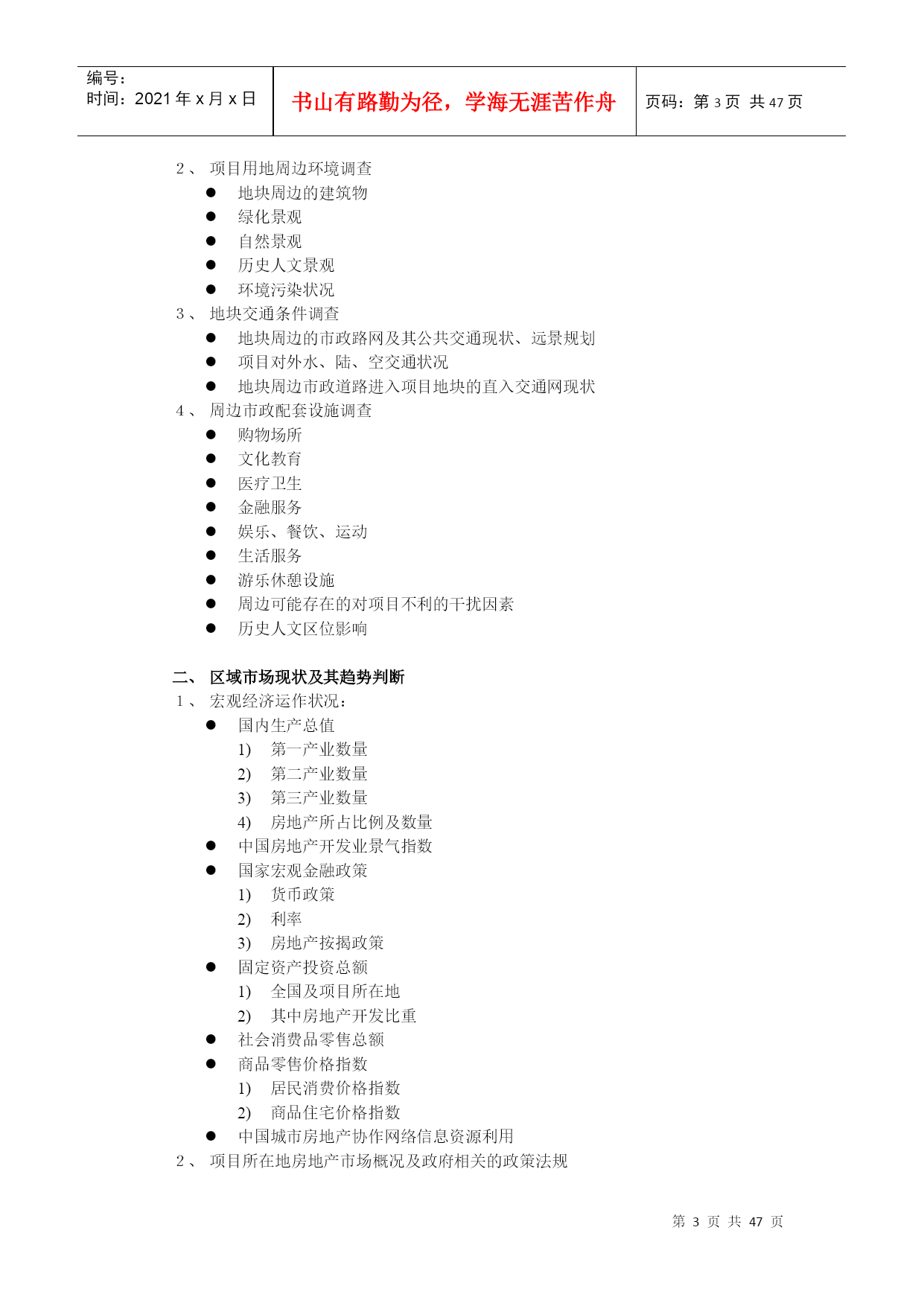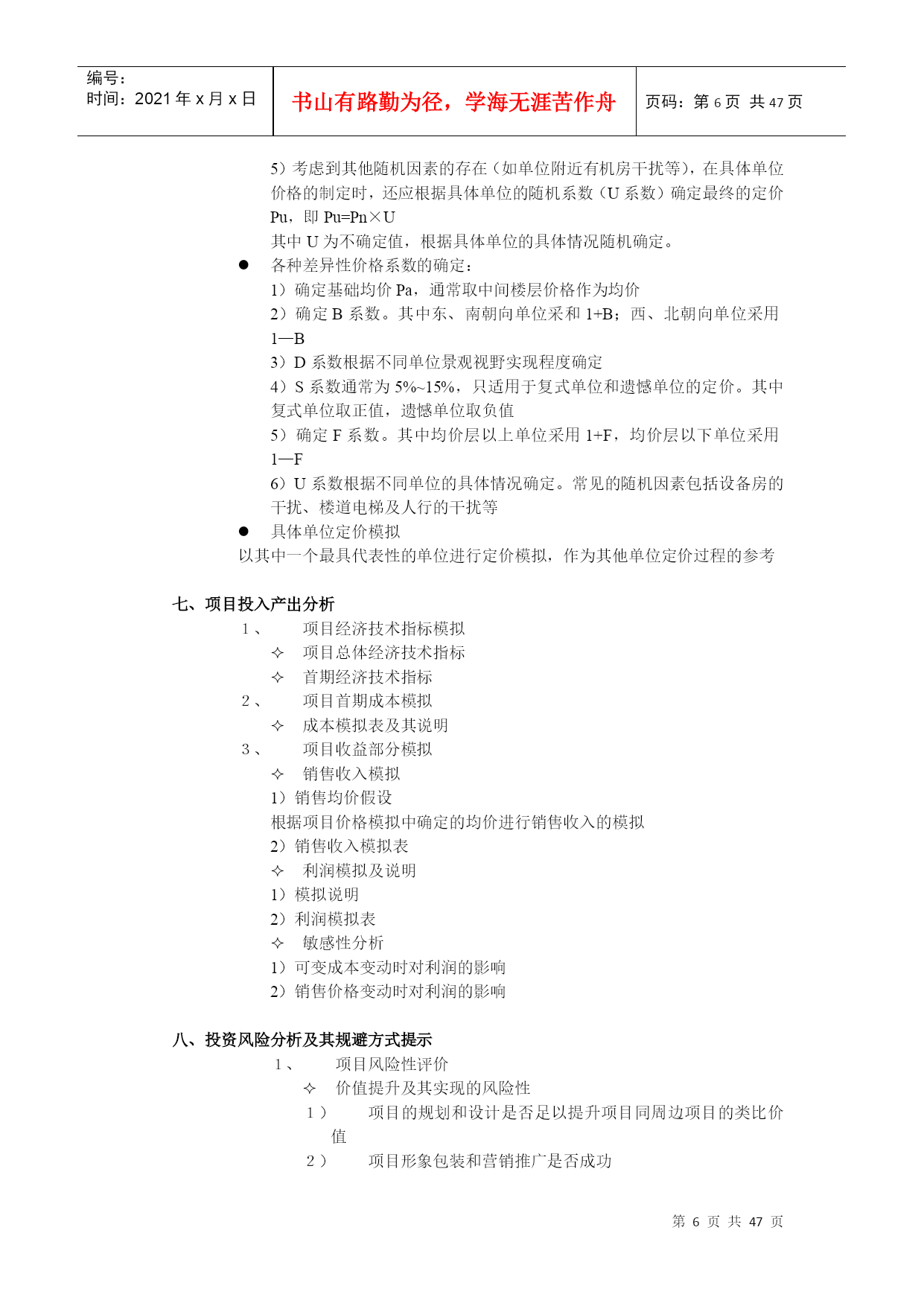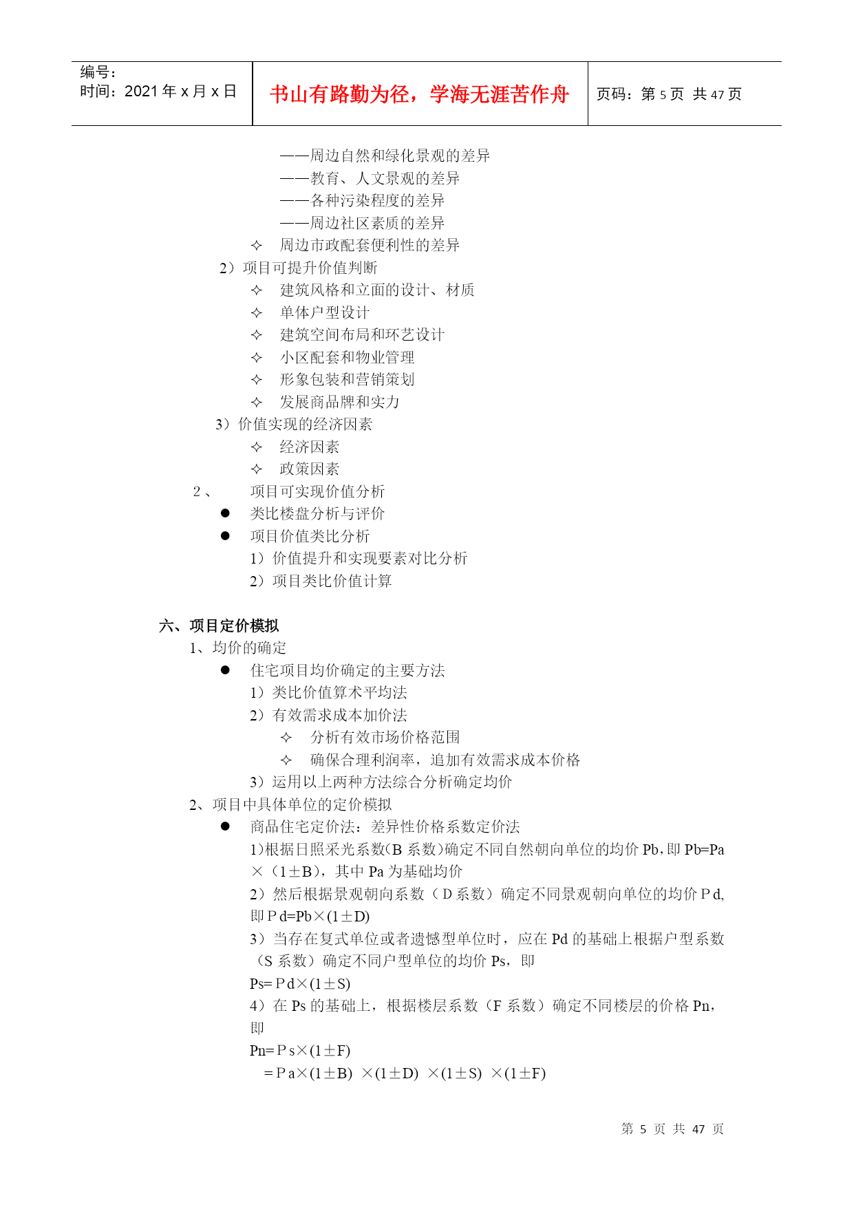 编号:时间:2021年x月x日书山有路勤为径,学海无涯苦作舟页码:第PAGE47页共NUMPAGES47页第PAGE\*MERGEFORMAT47页共NUMPAGES\*MERGEFORMAT47页房地产全程营销讲义第一部分REAL瑞尔特房地产全程营销理论体系房地产全程营销思想是中国房地产从卖方市场转变为买方市场的过程中,结合市场营销学的理论和实践产生的具有实践指导性的一套科学运作方法。不少发展商具有雄厚的实力进行房地产的规模开发,但却不能全面把握项目运作的各个环节。如果只靠发展商自己摸索项目操作方法,往往费时耗力,周期太长,机会成本很大,专业房地产营销策略的导入已成为当务之急,这种状况必然促进房地产全程营销的产生。房地产全程营销是从项目用地的初始状态就导入营销的科学方法,结合房地产行业的运作流程,逐步完善而形成的理论体系,其核心内容包括:项目投资营销;项目规划设计营销;项目质量工期营销;项目形象营销;项目推广策划;项目顾问、销售代理;项目服务营销;项目二次营销。项目投资营销项目投资营销的含义项目投资营销是房地产全程营销最为关键的环节,反映了房地产企业选择开发项目的过程,这个过程是考验、衡量开发商房地产运作能力的最重要环节,这个过程操作好了,就意味着项目成功了一半,在这个过程中多下些功夫,以后的开发经营中就可以事半功倍。项目投资营销通过对项目环境的综合考察和市场调研分析,以项目为核心,针对当前的经济环境,当地的房地产市场的供求状况,项目所在区域同类楼盘的现状及客户的购买行为进行调研分析,再结合项目进行SWOT分析,在以上基础上,对项目进行准确的市场定位,和项目价值发现分析,然后根据发展商提供的基本资料,对项目进行定价模拟和投入产出分析,并就规避开发风险进行策略提示,还对项目开发节奏提出专业意见。项目投资营销的具体内容项目用地周边环境分析项目土地性质调查地理位置地质地貌状况土地面积及其红线图七通一平现状项目用地周边环境调查地块周边的建筑物绿化景观自然景观历史人文景观环境污染状况地块交通条件调查地块周边的市政路网及其公共交通现状、远景规划项目对外水、陆、空交通状况地块周边市政道路进入项目地块的直入交通网现状周边市政配套设施调查购物场所文化教育医疗卫生金融服务娱乐、餐饮、运动生活服务游乐休憩设施周边可能存在的对项目不利的干扰因素历史人文区位影响区域市场现状及其趋势判断宏观经济运作状况:国内生产总值第一产业数量第二产业数量第三产业数量房地产所占比例及数量中国房地产开发业景气指数国家宏观金融政策货币政策利率房地产按揭政策固定资产投资总额全国及项目所在地其中房地产开发比重社会消费品零售总额商品零售价格指数居民消费价格指数商品住宅价格指数中国城市房地产协作网络信息资源利用项目所在地房地产市场概况及政府相关的政策法规项目所在地的居民住宅形态及比重政府对各类住宅的开发和流通方面的政策法规政府关于商品住宅在金融、市政规划等方面的政策法规短中期政府在项目所在地及项目地块周边的市政规划项目所在地房地产市场总体供求现状项目所在地商品住宅市场板块的划分及其差异项目所在地商品住宅平均价格走势及市场价值发现商品住宅客户构成及购买实态分析各种档次商品住宅客户分析商品住宅客户购买行为分析土地SWOT分析项目地块的优势项目地块的劣势项目地块的机会点项目地块的威胁及困难点项目市场定位类比竞争楼盘调研类比竞争楼盘基本资料项目户型结构详析项目规划设计及销售资料综合评判项目定位市场定位1)区域定位2)主力客户群定位功能定位建筑风格定位项目价值分析商品住宅项目价值分析的基本方法和概念商品住宅价值分析法:类比可实现价值分析法1)选择可类比项目2)确定该类楼盘价值实现的各要素及其在价值实现中的权重3)分析可类比项目价值实现的各要素之特征4)对比并量化本项目同各类比项目诸价值实现要素的对比值5)根据价值要素对比值判断本项目可实现的均价类比可实现价值决定因素1)类比土地价值:地段资源差异市政交通及直入交通的便利性的差异项目周边环境的差异,包括——周边自然和绿化景观的差异——教育、人文景观的差异——各种污染程度的差异——周边社区素质的差异周边市政配套便利性的差异2)项目可提升价值判断建筑风格和立面的设计、材质单体户型设计建筑空间布局和环艺设计小区配套和物业管理形象包装和营销策划发展商品牌和实力3)价值实现的经济因素经济因素政策因素项目可实现价值分析类比楼盘分析与评价项目价值类比分析1)价值提升