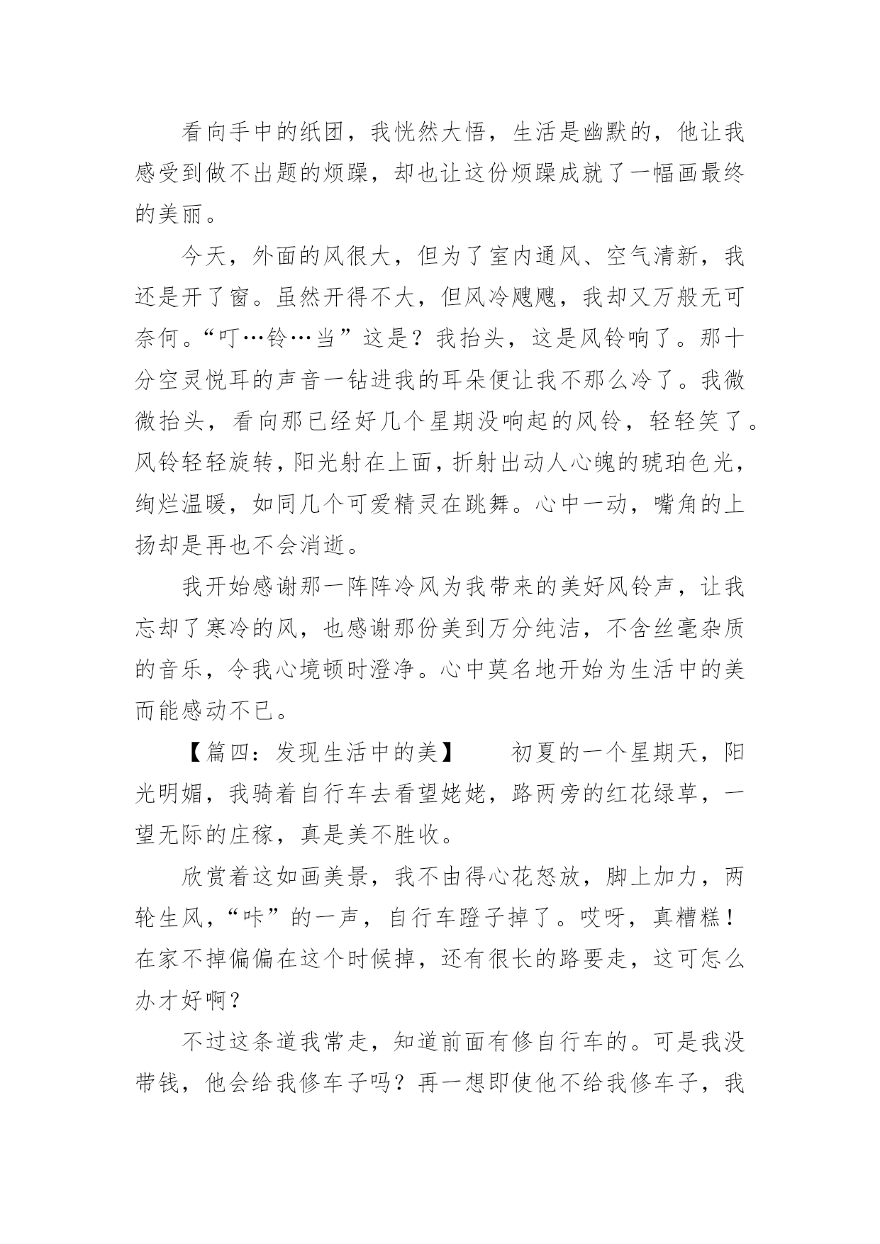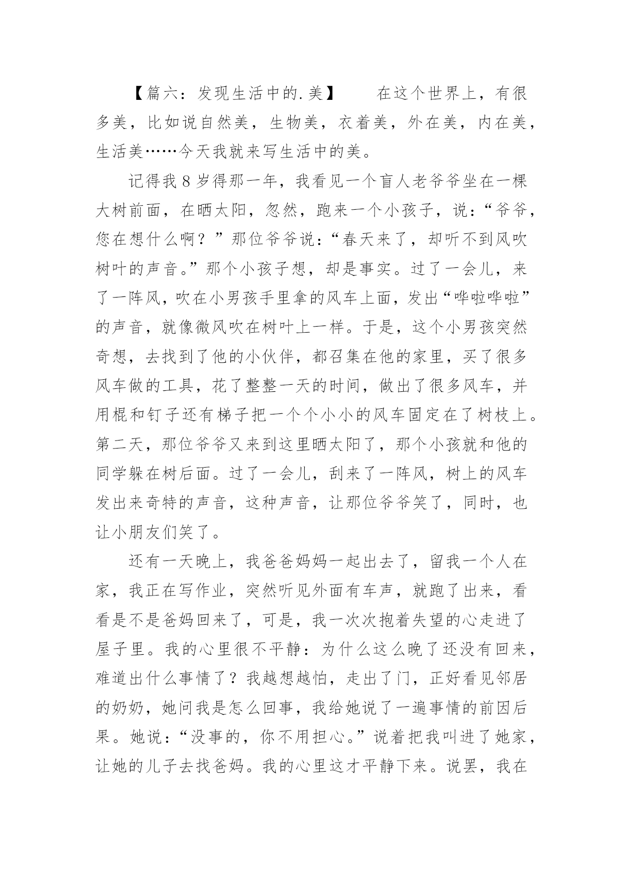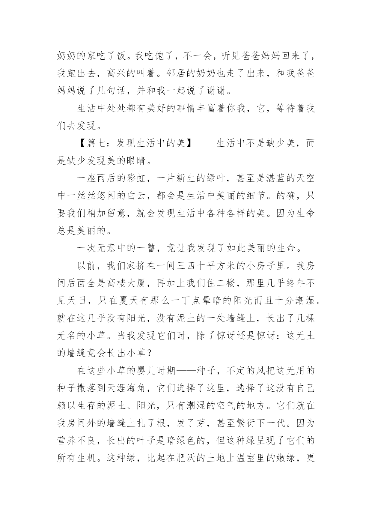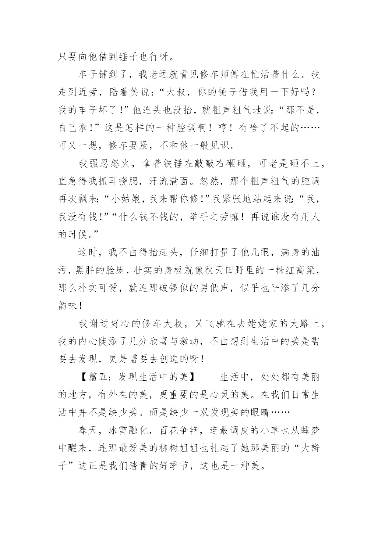 发现生活中的美作文发现生活中的美作文7篇【篇一:发现生活中的美】生活中不是缺少美,而是缺少发现美的眼睛。”罗丹曾经说过这样一句话。确实如此,美在生活中是到处都有,到处都可以找到的,不信,你看看下面的内容就知道了。品德美:在公交车上,到处都挤满了人。一位白发苍苍的老奶奶刚上车,马上有一位年轻的小伙子站起来说:“老奶奶,您坐我这个位置吧!”然后扶着老奶奶坐下来。“谢谢你,你真是个好心人啊!”老奶奶感激地说。“不用谢,这是我应该做的。”年轻人笑着说。美,原来在公交车上也可以找到它呀!心灵美:雨中,我看见一位小男孩没带雨伞,他焦急地站在学校门口。天越来越晚,突然,我看见一个比他高大的大男孩把自己的雨伞借给了小男孩,小男孩不好意思地说:“谢谢哥哥,可外面下着这么大的雨,你把雨伞给我,你会被淋感冒的。”“没关系!”大男孩说,“我的身体很棒,不会生病,你赶快回家吧!”那一刹那,我的心被深深的感动了。雨,还在沙沙地下,可没有干扰我心中美好的意念!美,原来在雨中也可以找到它呀!平常的美:商店里,商品琳琅满目,各式各样,还播放着优美的音乐。听,那歌声多美啊!一会儿快,一会儿慢,一会儿欢快,一会儿忧伤,让你忍不住想跟着大声歌唱!还有那些色彩缤纷的崭新的商品,穿着漂亮衣服的芭比娃娃,会唱歌的陀螺等等,让你眼花缭乱,目不暇接,多美啊!公园里,五颜六色争奇斗艳的花儿,还有花丛中扑闪着翅膀的蝴蝶和蜜蜂,在花丛旁边欢声笑语的人们……这是一幅多美的图画啊!美。在生活中无处不在,让我们一起去寻找它吧!【篇二:发现生活中的美】“生活中不缺少美,而是缺少发现美的眼睛。”带着一双不再挑剔的眼睛和一颗宁静的心我发现了是中的没。大自然中,春意盎然,花草树木都很美。小草虽然没有牡丹、杜鹃那样美丽,但它是坚强的,它经历着风吹雨打,电闪雷鸣。水有的波澜壮阔,有的水平如镜。山有的太峻了,有的太尊了,还有的太贵了。是多么美丽,我不惊一颤,是什么颤动了我?是自然中的美。你看,在那教师办公室的窗台下。老师还在辛勤的批改着作业,老师您的家人、亲人还等着您回去吃饭呢!那一瓶又一瓶的用尽的墨水瓶,那一支又一支写坏的红笔。不知这些年来,您用尽了多少墨,用坏了多少笔。老师您辛苦了!您又辛苦了一天,就别为我们费心了!啊,多么好的老师,多么感人的情景呀!应着日落的余辉,小道上一点黄晕的光。我走在回家的小路上,这时一位头发苍白的老太太不小心摔了一跤,一位小同学便立刻上前帮助,扶着老人走向了远处,看着这一老一少的身影渐渐消失,我的心瞬间变得温暖起来,这是多么美好的瞬间,多么美好的时刻。楼道里灯还亮着我知道,这一定是哪家的孩子还没回来,爸妈怕他害怕,点着灯等孩子回家呢。多么美好的时光啊,啊父亲,母亲你们在我来到这个世界上起,你们给予了我多少爱的付出?还将要给予我多少?啊,我的父亲,我的母亲,我爱着您们!啊,老师!是你给予我们无穷的知识,让我们明白了做人的道理……什么是生活中的美?这就是生活中的美,就是这么简简单单、平平常常的小事。【篇三:发现生活中的美作文】有些人觉得生活中一点也不美,枯燥不已。我却不然,生活其实是美丽浪漫的。我用一只铅笔,斜斜地涂在纸上,纸上映出上页上写过字的痕迹。灰蒙蒙的颜色夹杂着些许白色,星星点点,朦朦胧胧,有种古典气质。阳光懒懒地散在纸上,简约、而又异常唯美,赏心悦目!可谁又想到这只是铅与一张纸的简单结合呢?死守着一题数学题目,我已经演练了七八遍了,就是做不出。我恼怒地用笔把一切划去,把草稿狠狠地揉成团,丢弃在地上。坐我旁边画画的妈妈有一下没一下地持着画笔在画板上润色,终究觉得缺了些什么。见我如此,笑了,捡起我的纸团,微微摆弄了一下,用粉帅均匀涂上水粉颜料,往画板上一压。一朵娇嫩的玫瑰花跃然纸上,鲜红可爱,灿烂如斯。我惊讶得说不出一句话来,接过妈妈手中的纸团,往纸上一压、两压。看这些花儿,我享受着创作带给我的快感,也惊叹着无处不在的美丽。看向手中的纸团,我恍然大悟,生活是幽默的,他让我感受到做不出题的烦躁,却也让这份烦躁成就了一幅画最终的美丽。今天,外面的风很大,但为了室内通风、空气清新,我还是开了窗。虽然开得不大,但风冷飕飕,我却又万般无可奈何。“叮…铃…当”这是?我抬头,这是风铃响了。那十分空灵悦耳的声音一钻进我的耳朵便让我不那么冷了。我微微抬头,看向那已经好几个星期没响起的风铃,轻轻笑了。风铃轻轻旋转,阳光射在上面,折射出动人心魄的琥珀色光,绚烂温暖,如同几个可爱精灵在跳舞。心中一动,嘴角的上扬却是再也不会消逝。我开始感谢那一阵阵冷风为我带来的美好风铃声,让我忘却了寒冷的风,也感谢那份美到万分纯洁,不含丝毫杂质的音乐,令我心境顿时澄净。心中莫名地开始为生活中的美而能感动不已。【篇四:发现生活中的美】初夏的一个星期天,阳光明媚,我骑着自行车去看望姥姥,路两旁的红花绿草,一望