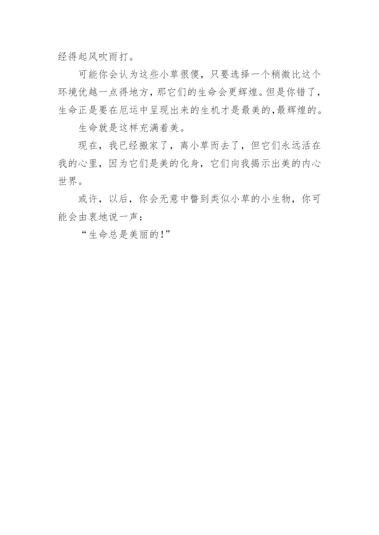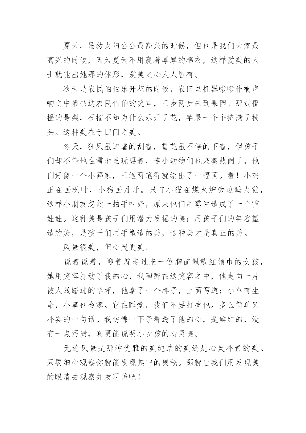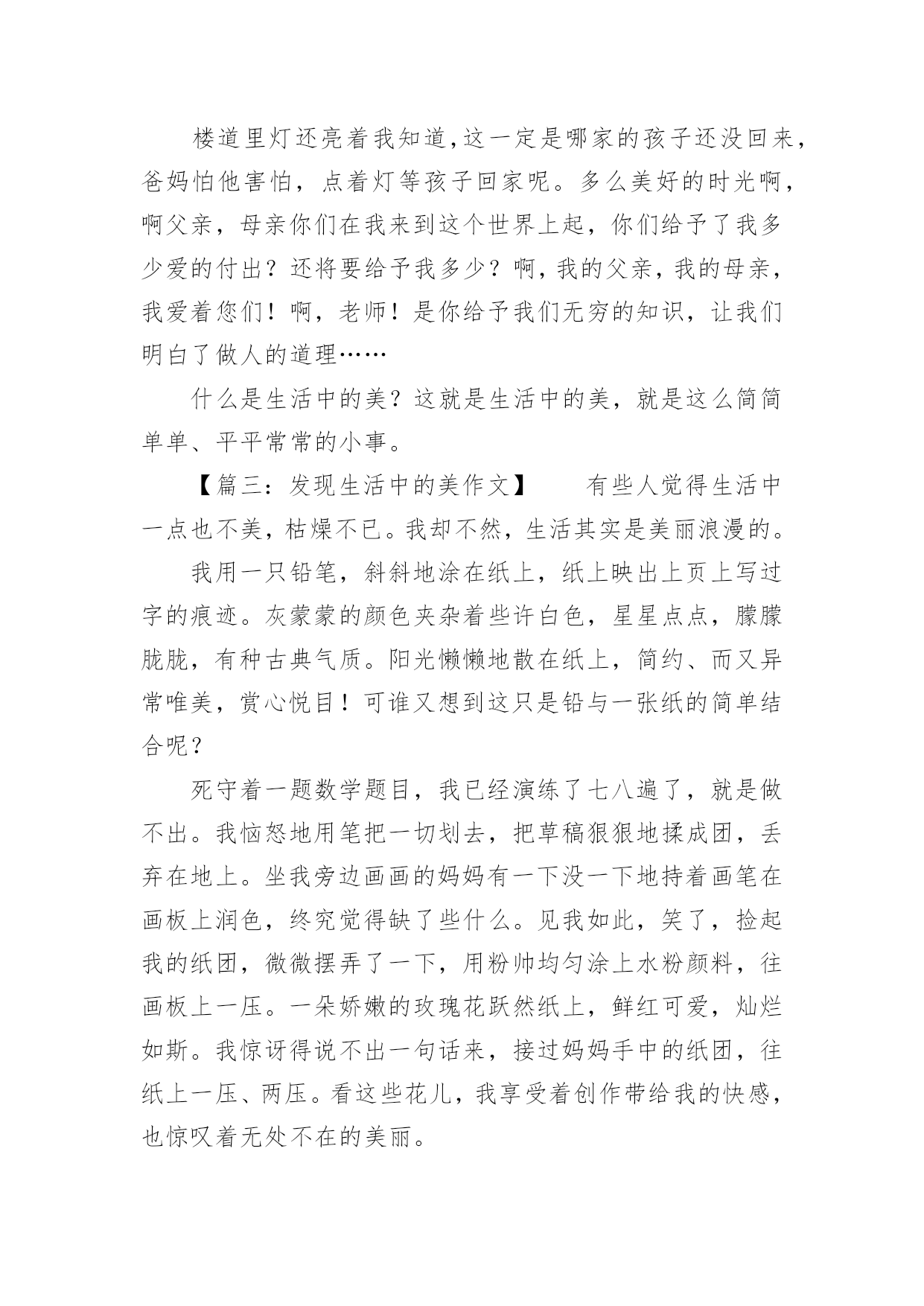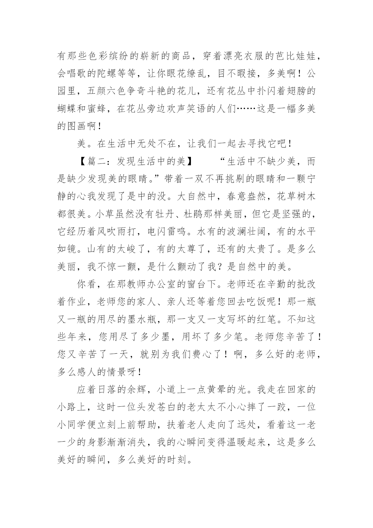 发现生活中的美作文发现生活中的美作文7篇【篇一:发现生活中的美】生活中不是缺少美,而是缺少发现美的眼睛。”罗丹曾经说过这样一句话。确实如此,美在生活中是到处都有,到处都可以找到的,不信,你看看下面的内容就知道了。品德美:在公交车上,到处都挤满了人。一位白发苍苍的老奶奶刚上车,马上有一位年轻的小伙子站起来说:“老奶奶,您坐我这个位置吧!”然后扶着老奶奶坐下来。“谢谢你,你真是个好心人啊!”老奶奶感激地说。“不用谢,这是我应该做的。”年轻人笑着说。美,原来在公交车上也可以找到它呀!心灵美:雨中,我看见一位小男孩没带雨伞,他焦急地站在学校门口。天越来越晚,突然,我看见一个比他高大的大男孩把自己的雨伞借给了小男孩,小男孩不好意思地说:“谢谢哥哥,可外面下着这么大的雨,你把雨伞给我,你会被淋感冒的。”“没关系!”大男孩说,“我的身体很棒,不会生病,你赶快回家吧!”那一刹那,我的心被深深的感动了。雨,还在沙沙地下,可没有干扰我心中美好的意念!美,原来在雨中也可以找到它呀!平常的美:商店里,商品琳琅满目,各式各样,还播放着优美的音乐。听,那歌声多美啊!一会儿快,一会儿慢,一会儿欢快,一会儿忧伤,让你忍不住想跟着大声歌唱!还有那些色彩缤纷的崭新的商品,穿着漂亮衣服的芭比娃娃,会唱歌的陀螺等等,让你眼花缭乱,目不暇接,多美啊!公园里,五颜六色争奇斗艳的花儿,还有花丛中扑闪着翅膀的蝴蝶和蜜蜂,在花丛旁边欢声笑语的人们……这是一幅多美的图画啊!美。在生活中无处不在,让我们一起去寻找它吧!【篇二:发现生活中的美】“生活中不缺少美,而是缺少发现美的眼睛。”带着一双不再挑剔的眼睛和一颗宁静的心我发现了是中的没。大自然中,春意盎然,花草树木都很美。小草虽然没有牡丹、杜鹃那样美丽,但它是坚强的,它经历着风吹雨打,电闪雷鸣。水有的波澜壮阔,有的水平如镜。山有的太峻了,有的太尊了,还有的太贵了。是多么美丽,我不惊一颤,是什么颤动了我?是自然中的美。你看,在那教师办公室的窗台下。老师还在辛勤的批改着作业,老师您的家人、亲人还等着您回去吃饭呢!那一瓶又一瓶的用尽的墨水瓶,那一支又一支写坏的红笔。不知这些年来,您用尽了多少墨,用坏了多少笔。老师您辛苦了!您又辛苦了一天,就别为我们费心了!啊,多么好的老师,多么感人的情景呀!应着日落的余辉,小道上一点黄晕的光。我走在回家的小路上,这时一位头发苍白的老太太不小心摔了一跤,一位小同学便立刻上前帮助,扶着老人走向了远处,看着这一老一少的身影渐渐消失,我的心瞬间变得温暖起来,这是多么美好的瞬间,多么美好的时刻。楼道里灯还亮着我知道,这一定是哪家的孩子还没回来,爸妈怕他害怕,点着灯等孩子回家呢。多么美好的时光啊,啊父亲,母亲你们在我来到这个世界上起,你们给予了我多少爱的付出?还将要给予我多少?啊,我的父亲,我的母亲,我爱着您们!啊,老师!是你给予我们无穷的知识,让我们明白了做人的道理……什么是生活中的美?这就是生活中的美,就是这么简简单单、平平常常的小事。【篇三:发现生活中的美作文】有些人觉得生活中一点也不美,枯燥不已。我却不然,生活其实是美丽浪漫的。我用一只铅笔,斜斜地涂在纸上,纸上映出上页上写过字的痕迹。灰蒙蒙的颜色夹杂着些许白色,星星点点,朦朦胧胧,有种古典气质。阳光懒懒地散在纸上,简约、而又异常唯美,赏心悦目!可谁又想到这只是铅与一张纸的简单结合呢?死守着一题数学题目,我已经演练了七八遍了,就是做不出。我恼怒地用笔把一切划去,把草稿狠狠地揉成团,丢弃在地上。坐我旁边画画的妈妈有一下没一下地持着画笔在画板上润色,终究觉得缺了些什么。见我如此,笑了,捡起我的纸团,微微摆弄了一下,用粉帅均匀涂上水粉颜料,往画板上一压。一朵娇嫩的玫瑰花跃然纸上,鲜红可爱,灿烂如斯。我惊讶得说不出一句话来,接过妈妈手中的纸团,往纸上一压、两压。看这些花儿,我享受着创作带给我的快感,也惊叹着无处不在的美丽。看向手中的纸团,我恍然大悟,生活是幽默的,他让我感受到做不出题的烦躁,却也让这份烦躁成就了一幅画最终的美丽。今天,外面的风很大,但为了室内通风、空气清新,我还是开了窗。虽然开得不大,但风冷飕飕,我却又万般无可奈何。“叮…铃…当”这是?我抬头,这是风铃响了。那十分空灵悦耳的声音一钻进我的耳朵便让我不那么冷了。我微微抬头,看向那已经好几个星期没响起的风铃,轻轻笑了。风铃轻轻旋转,阳光射在上面,折射出动人心魄的琥珀色光,绚烂温暖,如同几个可爱精灵在跳舞。心中一动,嘴角的上扬却是再也不会消逝。我开始感谢那一阵阵冷风为我带来的美好风铃声,让我忘却了寒冷的风,也感谢那份美到万分纯洁,不含丝毫杂质的音乐,令我心境顿时澄净。心中莫名地开始为生活中的美而能感动不已。【篇四:发现生活中的美】初夏的一个星期天,阳光明媚,我骑着自行车去看望姥姥,路两旁的红花绿草,一望
