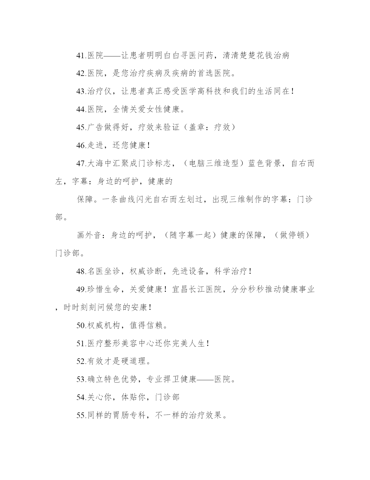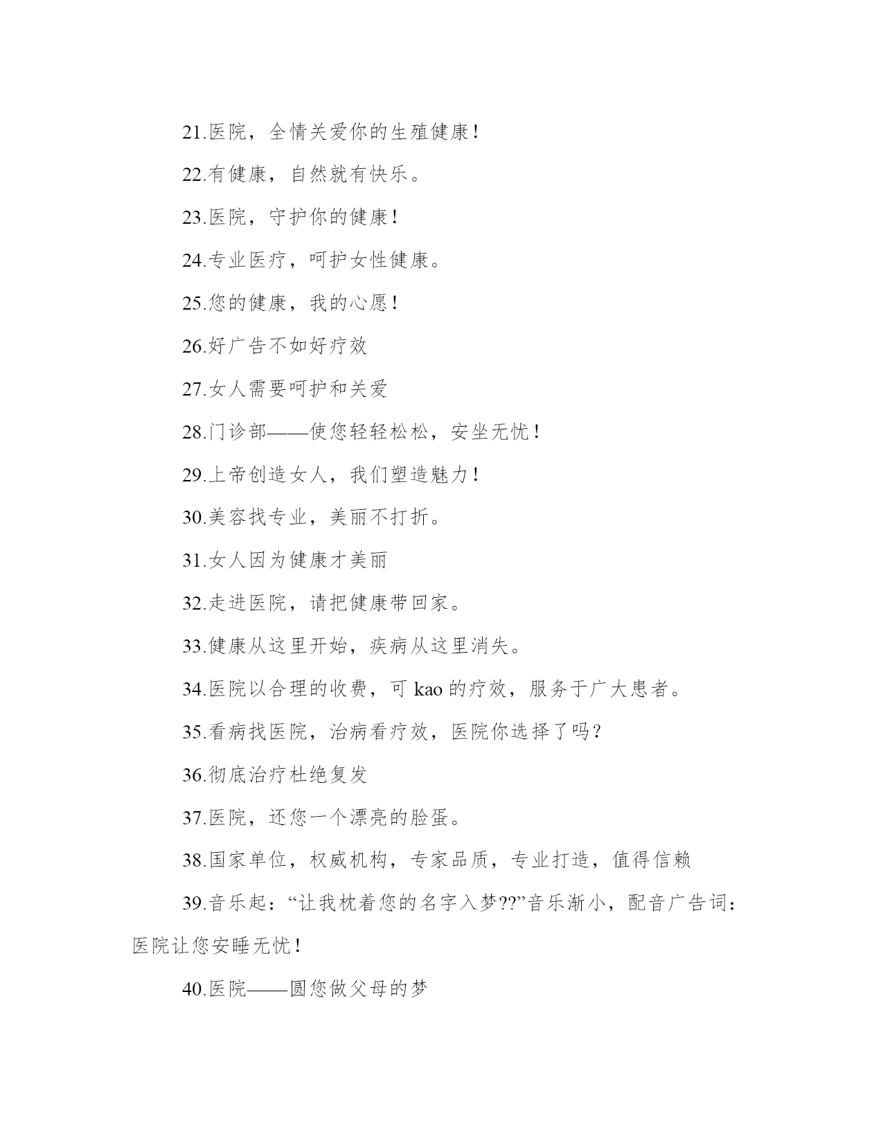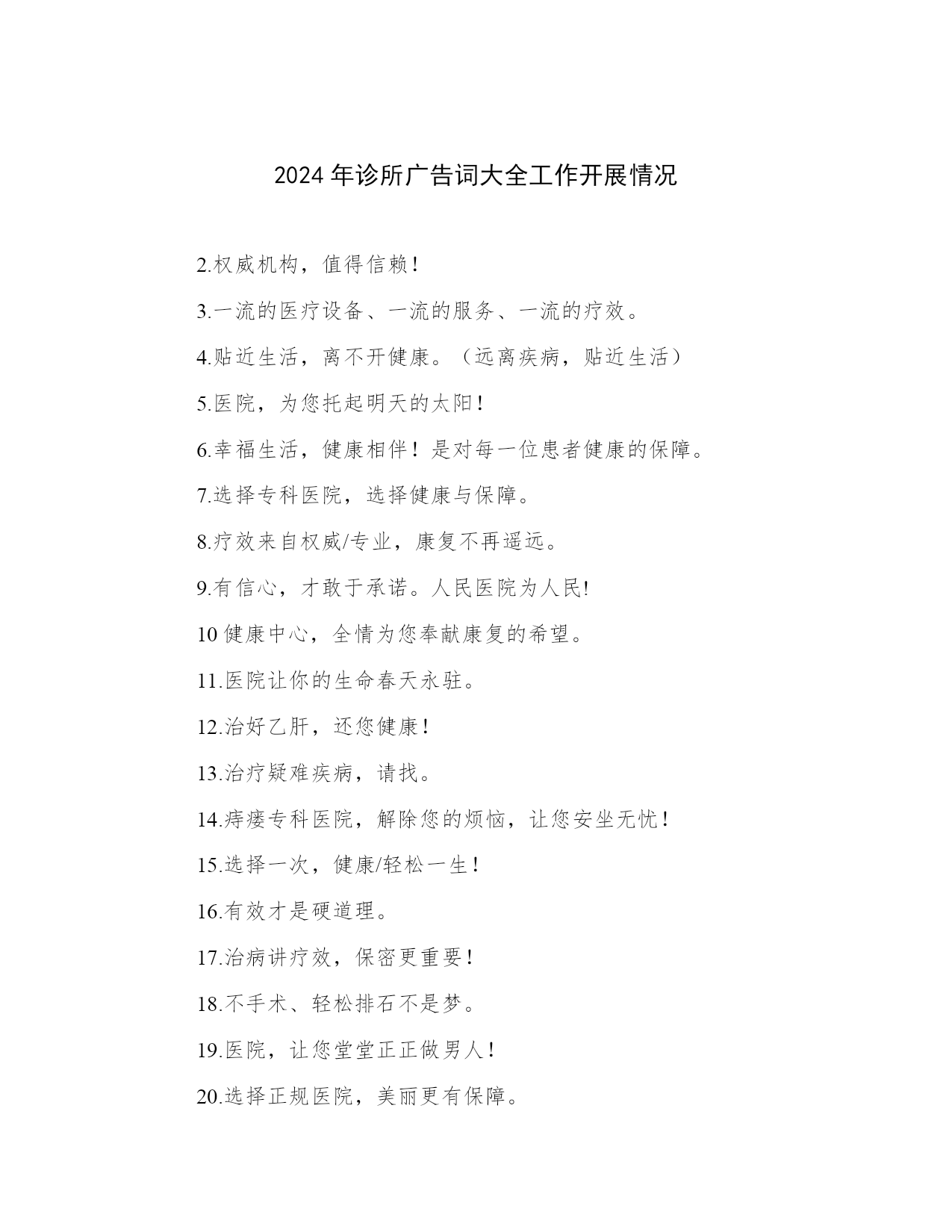 2024年诊所广告词大全工作开展情况2.权威机构,值得信赖!3.一流的医疗设备、一流的服务、一流的疗效。4.贴近生活,离不开健康。(远离疾病,贴近生活)5.医院,为您托起明天的太阳!6.幸福生活,健康相伴!是对每一位患者健康的保障。7.选择专科医院,选择健康与保障。8.疗效来自权威/专业,康复不再遥远。9.有信心,才敢于承诺。人民医院为人民!10健康中心,全情为您奉献康复的希望。11.医院让你的生命春天永驻。12.治好乙肝,还您健康!13.治疗疑难疾病,请找。14.痔瘘专科医院,解除您的烦恼,让您安坐无忧!15.选择一次,健康/轻松一生!16.有效才是硬道理。17.治病讲疗效,保密更重要!18.不手术、轻松排石不是梦。19.医院,让您堂堂正正做男人!20.选择正规医院,美丽更有保障。21.医院,全情关爱你的生殖健康!22.有健康,自然就有快乐。23.医院,守护你的健康!24.专业医疗,呵护女性健康。25.您的健康,我的心愿!26.好广告不如好疗效27.女人需要呵护和关爱28.门诊部——使您轻轻松松,安坐无忧!29.上帝创造女人,我们塑造魅力!30.美容找专业,美丽不打折。31.女人因为健康才美丽32.走进医院,请把健康带回家。33.健康从这里开始,疾病从这里消失。34.医院以合理的收费,可kao的疗效,服务于广大患者。35.看病找医院,治病看疗效,医院你选择了吗?36.彻底治疗杜绝复发37.医院,还您一个漂亮的脸蛋。38.国家单位,权威机构,专家品质,专业打造,值得信赖39.音乐起:“让我枕着您的名字入梦??”音乐渐小,配音广告词:医院让您安睡无忧!40.医院——圆您做父母的梦41.医院——让患者明明白白寻医问药,清清楚楚花钱治病42.医院,是您治疗疾病及疾病的首选医院。43.治疗仪,让患者真正感受医学高科技和我们的生活同在!44.医院,全情关爱女性健康。45.广告做得好,疗效来验证(盖章:疗效)46.走进,还您健康!47.大海中汇聚成门诊标志,(电脑三维造型)蓝色背景,自右而左,字幕:身边的呵护,健康的保障。一条曲线闪光自右而左划过,出现三维制作的字幕:门诊部。画外音:身边的呵护,(随字幕一起)健康的保障,(做停顿)门诊部。48.名医坐诊,权威诊断,先进设备,科学治疗!49.珍惜生命,关爱健康!宜昌长江医院,分分秒秒推动健康事业,时时刻刻问候您的安康!50.权威机构,值得信赖。51.医疗整形美容中心还你完美人生!52.有效才是硬道理。53.确立特色优势,专业捍卫健康——医院。54.关心你,体贴你,门诊部55.同样的胃肠专科,不一样的治疗效果。56.点滴关爱,汇流成河——医院,全情呵护您的健康。57.治好乙肝,还您健康!58.我以真诚服务患者,您以疗效检验广告59.一美丽护士伸出双手,从手掌中弹出文字“选择一次,美丽一生”。60.关心你,体贴你,门诊部