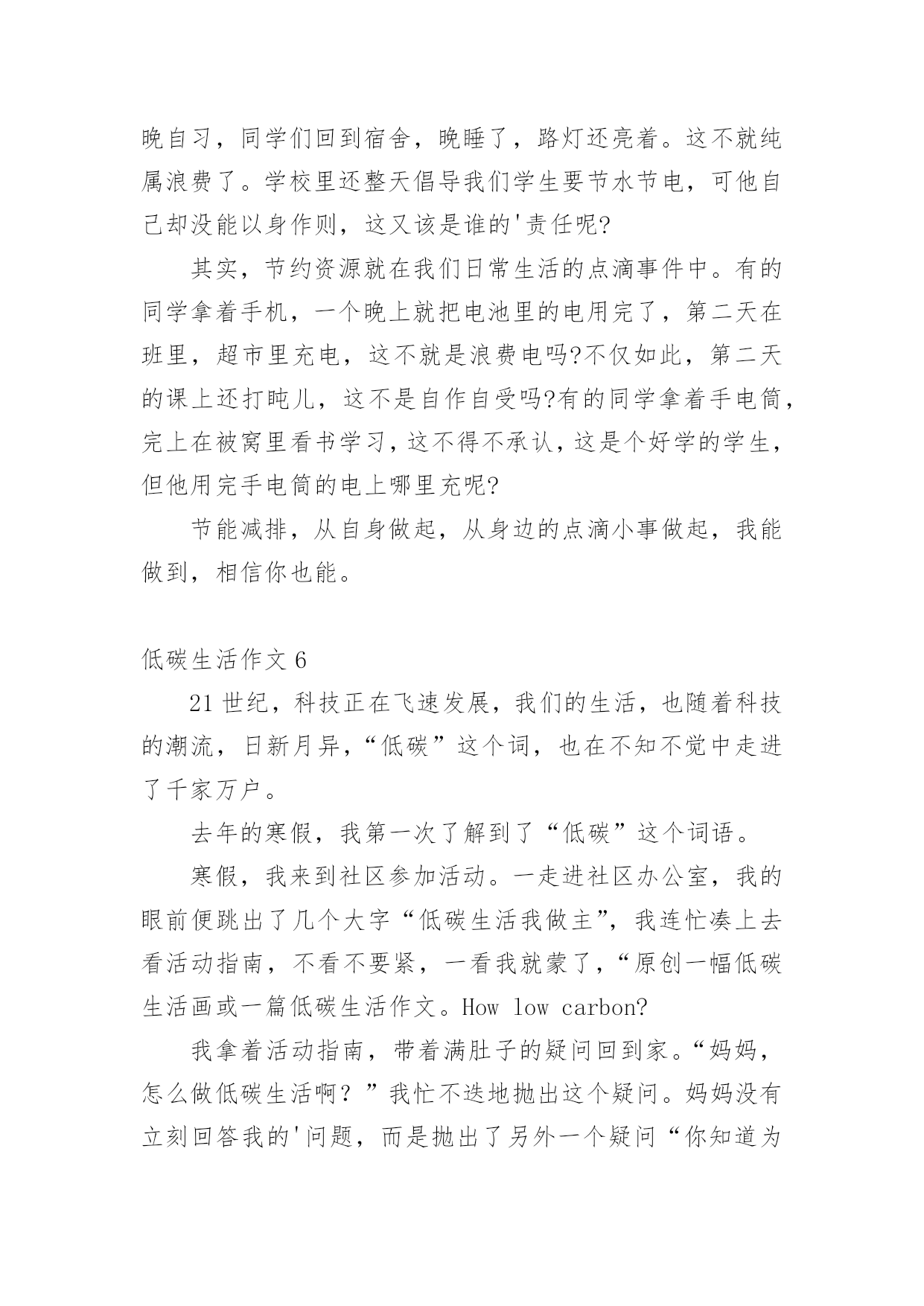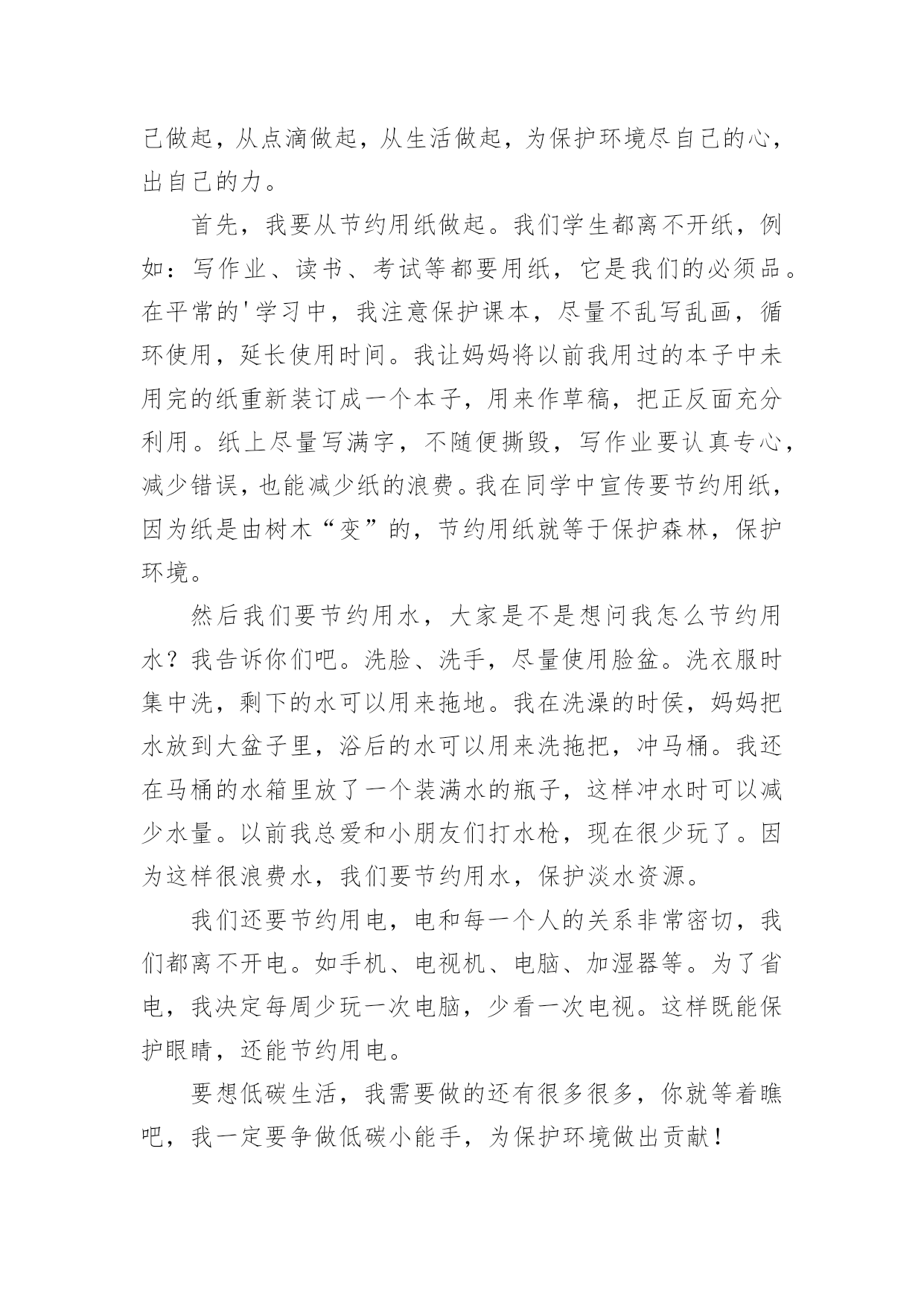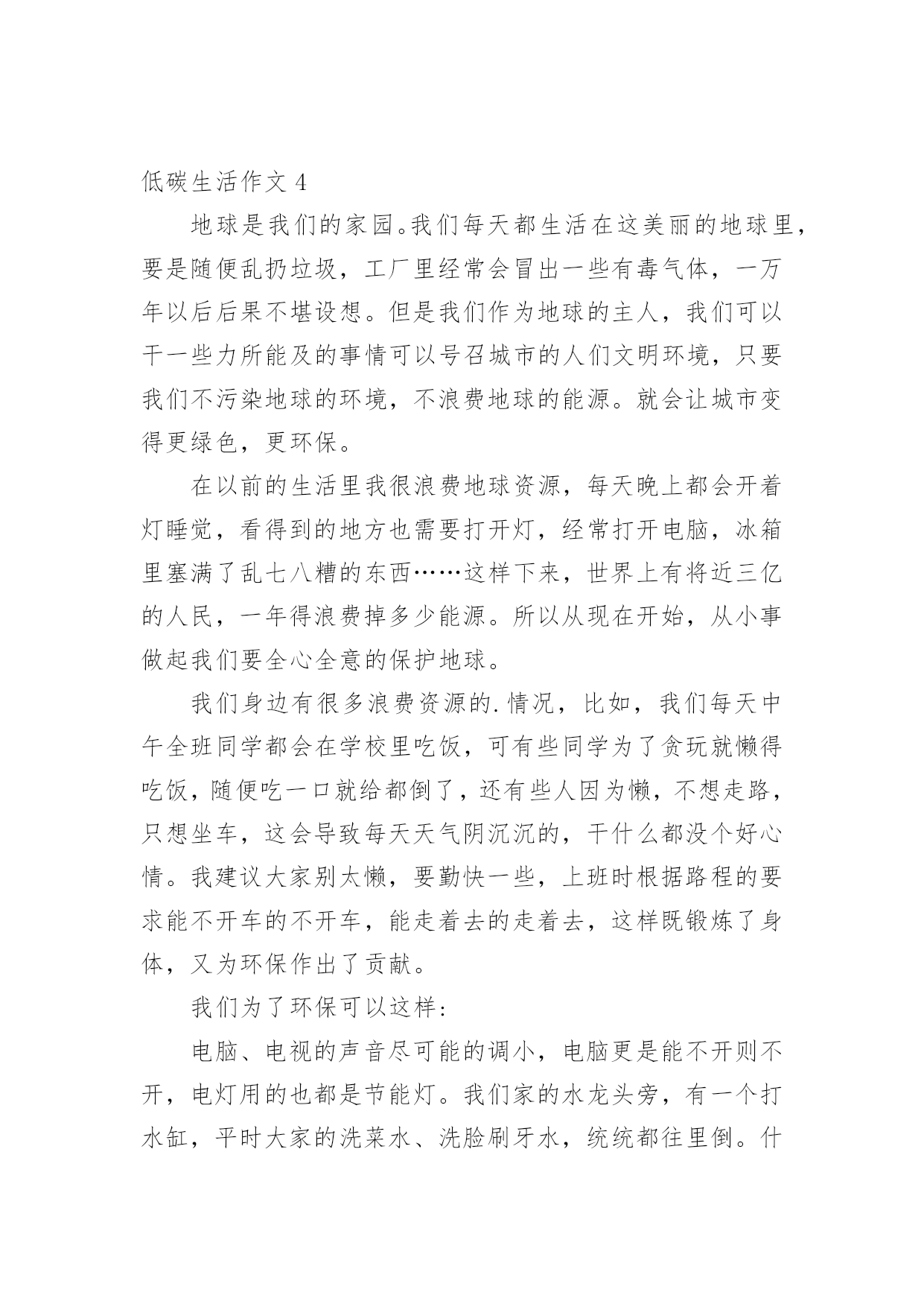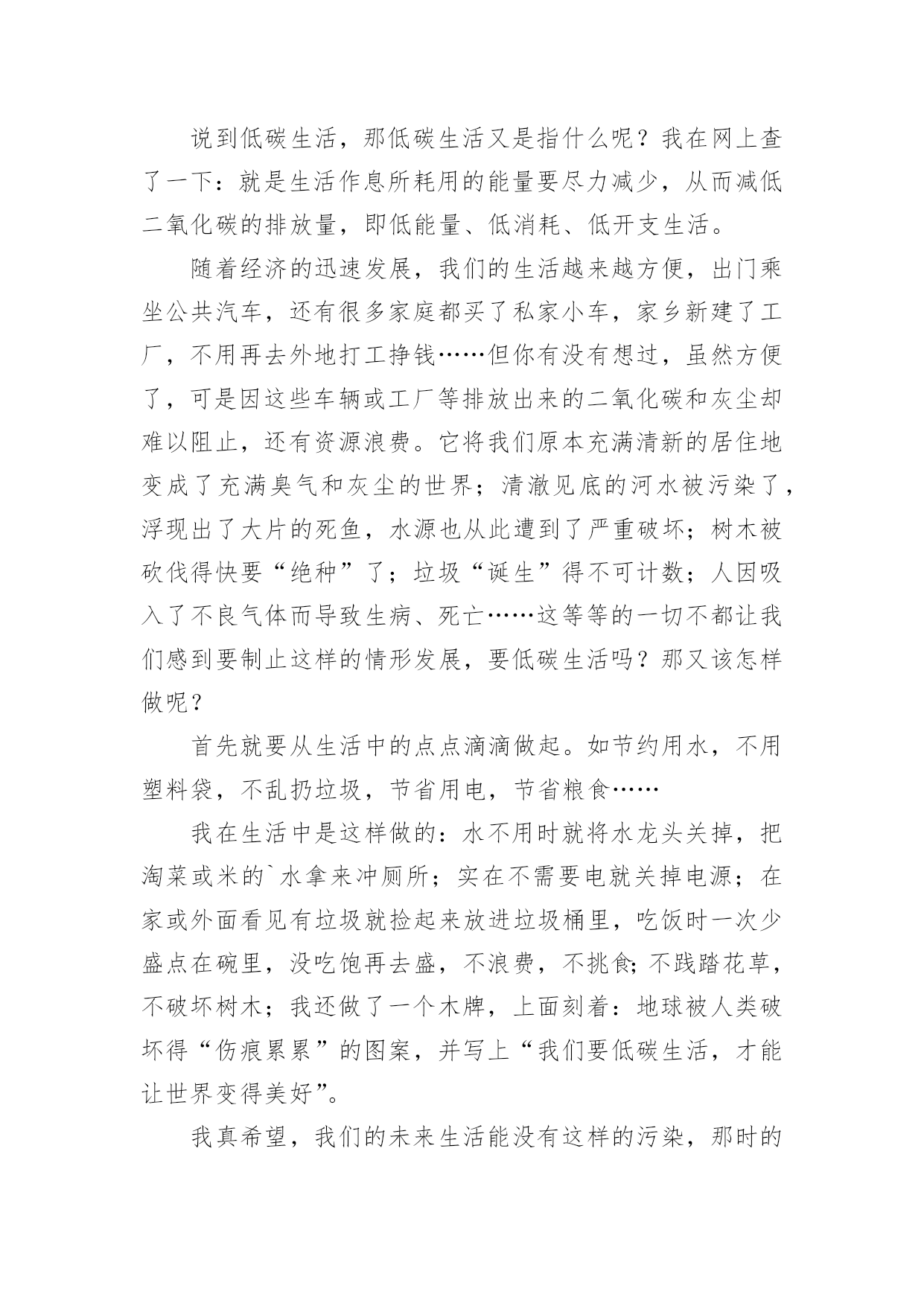 低碳生活作文低碳生活作文大全(15篇)在日复一日的学习、工作或生活中,大家或多或少都会接触过作文吧,作文要求篇章结构完整,一定要避免无结尾作文的出现。你知道作文怎样写才规范吗?以下是小编精心整理的低碳生活作文,仅供参考,希望能够帮助到大家。低碳生活作文1为了节约,我过了一天的低碳生活。早晨,我早早的起了床开始了一天的低碳生活。今天我洗脸刷牙都是用的洗澡节约下来的水,现在的'阳光充足正是个看书的好天气,还节约了电量。等到妈妈起来,我们吃了中饭,妈妈决定到雨花亭沃尔玛去逛一逛。这样不就又节约了吗?我双手表示赞同。我对妈妈说:""妈妈我们不如走楼梯下去吧!要过低碳生活,我们家虽然在十楼,但是下楼梯非常轻松的,妈妈,好吗?""妈妈为了让我过一过低碳生活,所以同意了。我们坐着公交车准备去雨花亭沃尔玛,这样不但省了石油,还对环境得到了有效的保护。走进超市,我突然发现超市旁边有一个小水龙头没有关掉,水都溢出来了,我马上跑过去把水龙头关紧。回家的时候我们还是决定坐公交车,这个时候是黄昏了,红红的太阳映着美丽的岳麓山。我陶醉在这美丽的景色中不知不觉中就到了家。上楼的时候我还是坚持爬楼梯上去,妈妈似乎不同意,我说:""我帮你提一点东西,然后我们一起唱歌上去,这样就轻松多了······""妈妈听了我一大堆的道理,终于同意一起爬上去了。过了十到五分钟的时间我们才满头大汗,气喘嘘嘘,腿脚酸痛的爬上了这整整十楼还要提一大堆的东西。我们懒洋洋的躺在沙发上休息。过了一会儿,妈妈去做饭我就来帮忙,我对妈妈说:“淘米水留下来最有用,它可以做好多事情呢!”吃玩饭后,我用留下来的淘米水把碗和碟子都刷了一遍,尽量减少洗涤剂对水的污染。吃完饭后,为了节约我们一起去散步,一个小时后回到家洗澡。洗完头发后,我问妈妈要一条干净的毛巾来,这样就可以不用电吹风吹头发了。就这样我过了一天的低碳生活。低碳生活作文2古往今来,地球妈妈用甘甜的乳汁哺育了无数代子孙。原来的她被小辈们装饰得楚楚动人。可是,现在人类为了自身的利益,将她折磨得天昏地暗。人类只有一个地球;而地球正面临着严峻的环境危机。“救救地球”已成为世界各国人民最强烈的呼声。近年来,全球气候变幻无常、水土流失严重、温室效应明显、耕地沙化蔓延、生存环境日益恶化,严重威胁着当今世界全人类的健康与生命。去年,一部美国灾难大片《20xx》就此应运而生,让世界各国人民为气候变暖可能给人类造成的灭顶之灾吓出了一身冷汗,当然我也不例外。低碳生活,对于我们普通人来说,是一种态度,而不是能力,我们应该积极提倡并去实践低碳生活,我们不应该只在这里发出倡议,我们应该不仅从节电、节水、节碳、节油、节气这种小事做起,更应该注重从我们的日常的衣食住行上做起。低碳生活是我们要建立的绿色生活方式,只要我们去行动,就可以接近低碳生活,甚至可以达到低碳生活的标准。先从身旁的小事做起,我们只管即便少用纸巾,节约用纸,每张纸都双面打印,相当于保留下半片原本将被砍掉的森林;随手关灯、拔插头,不坐电梯爬楼梯,省下各人的电,换自己的健康;只管即便少施用一次性牙刷、一次性塑料袋、一次性水杯,因为低碳生活与这些行为有关……或许我们做得不够,或许我们的力量很渺小,但是我相信:不积跬步,无以至千里;不积小流,无以成江海。让我们从身边的点点滴滴做起,为低碳生活做出贡献,尽自己的绵薄之力。希望通过我们的`努力,把“低碳生活”的概念传递给每一个家庭。地球是我们的家园,我们应该保护它,不要污染它,不要让电影《20xx》中那惨绝人寰的场景在不久的将来发生!低碳生活作文3我是一名小学6年级的学生,学校给我们一人发了一本《低碳环保》的知识读本。起初,我并不知道什么是低碳生活,通过阅读书中的内容,我知道了全球环境污染严重,生态平衡遭到破坏,严重影响了我们的生活质量。我决心从自己做起,从点滴做起,从生活做起,为保护环境尽自己的心,出自己的力。首先,我要从节约用纸做起。我们学生都离不开纸,例如:写作业、读书、考试等都要用纸,它是我们的必须品。在平常的'学习中,我注意保护课本,尽量不乱写乱画,循环使用,延长使用时间。我让妈妈将以前我用过的本子中未用完的纸重新装订成一个本子,用来作草稿,把正反面充分利用。纸上尽量写满字,不随便撕毁,写作业要认真专心,减少错误,也能减少纸的浪费。我在同学中宣传要节约用纸,因为纸是由树木“变”的,节约用纸就等于保护森林,保护环境。然后我们要节约用水,大家是不是想问我怎么节约用水?我告诉你们吧。洗脸、洗手,尽量使用脸盆。洗衣服时集中洗,剩下的水可以用来拖地。我在洗澡的时侯,妈妈把水放到大盆子里,浴后的水可以用来洗拖把,冲马桶。我还在马桶的水箱里放了一个装满水的瓶子,这样冲水时可以减少水量。以前我总爱和小朋友们打水枪,现在很少玩了。因为这样很浪费水,我们要节约用水,保护淡水