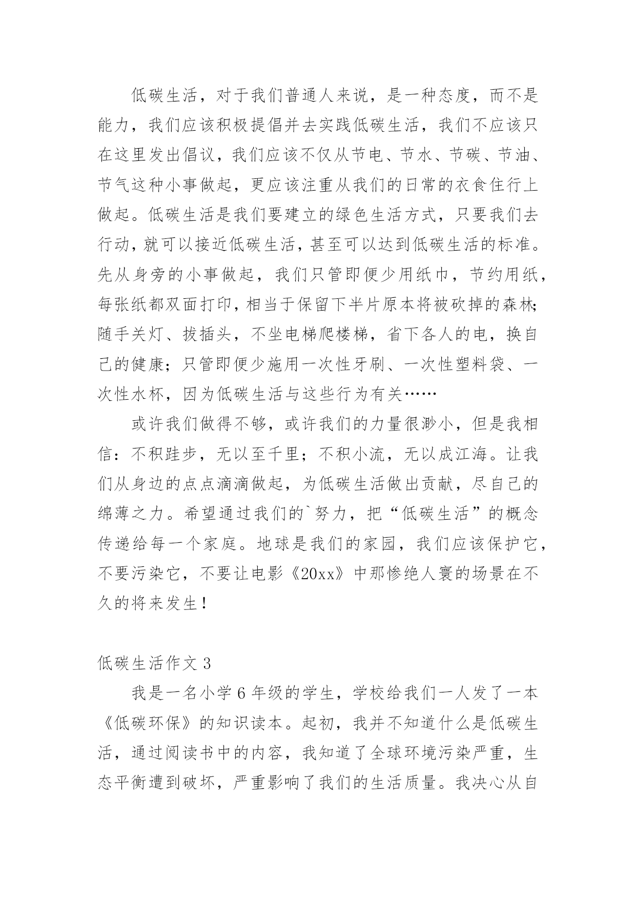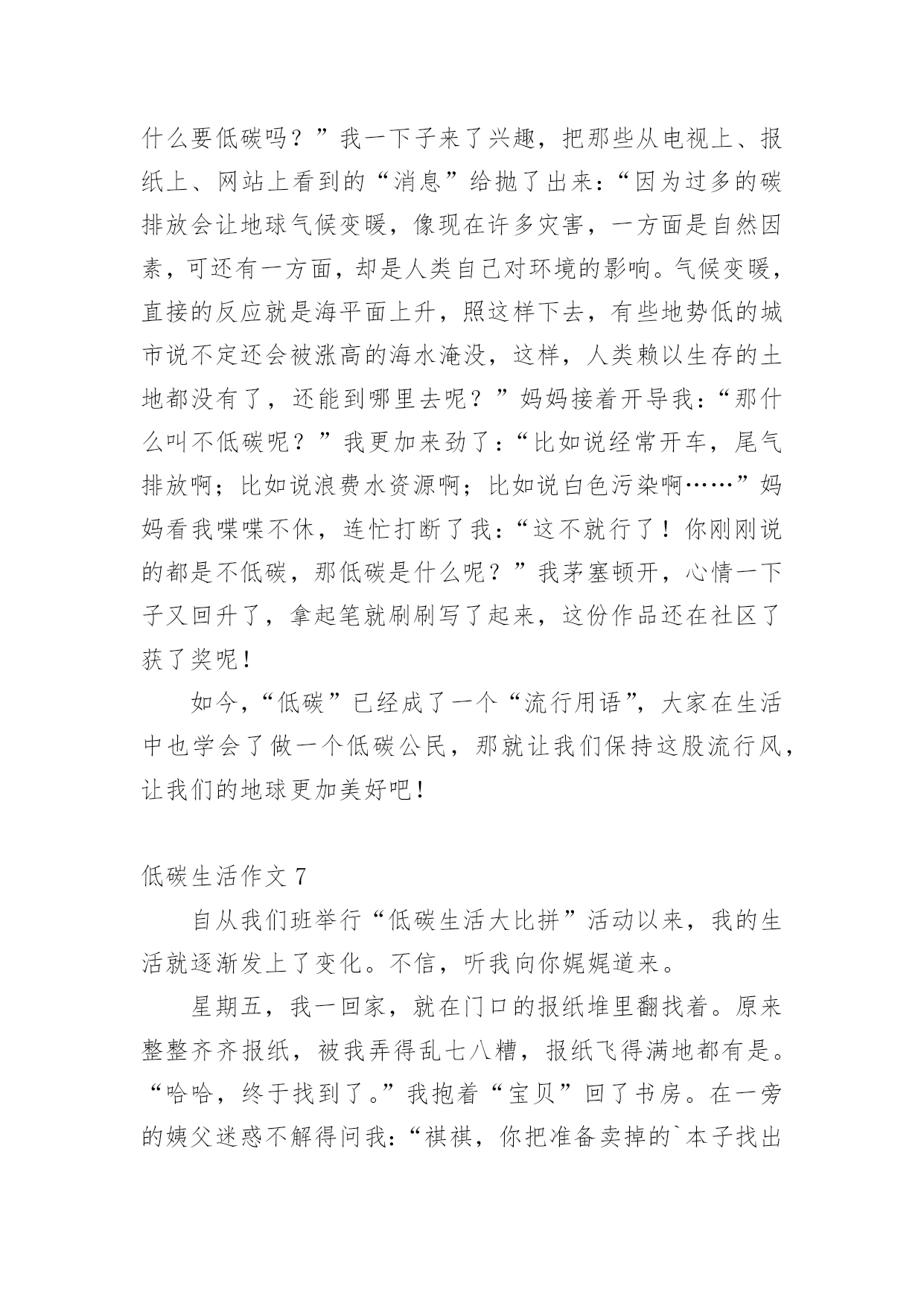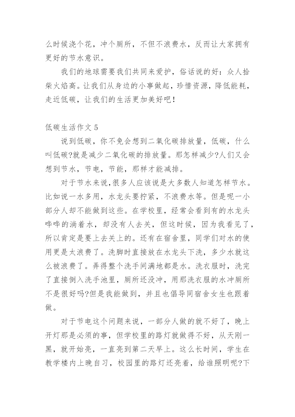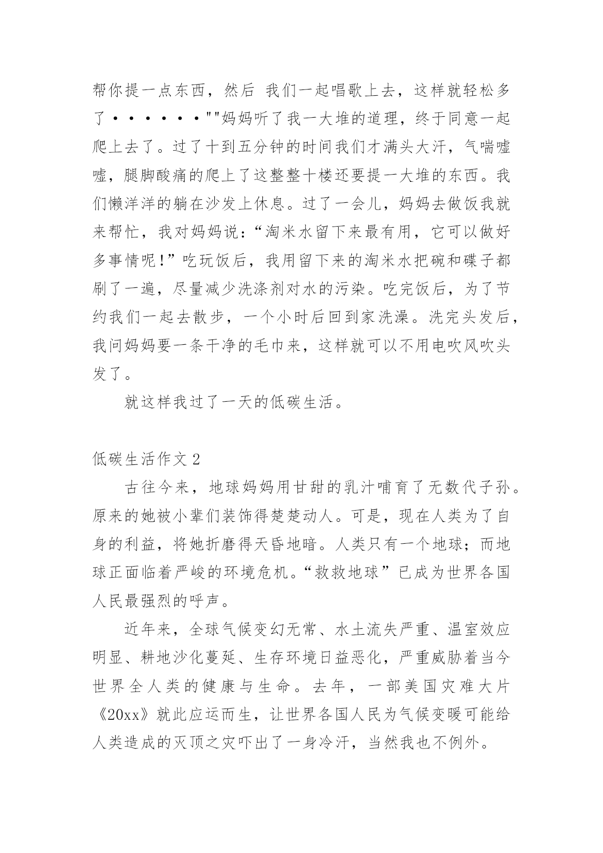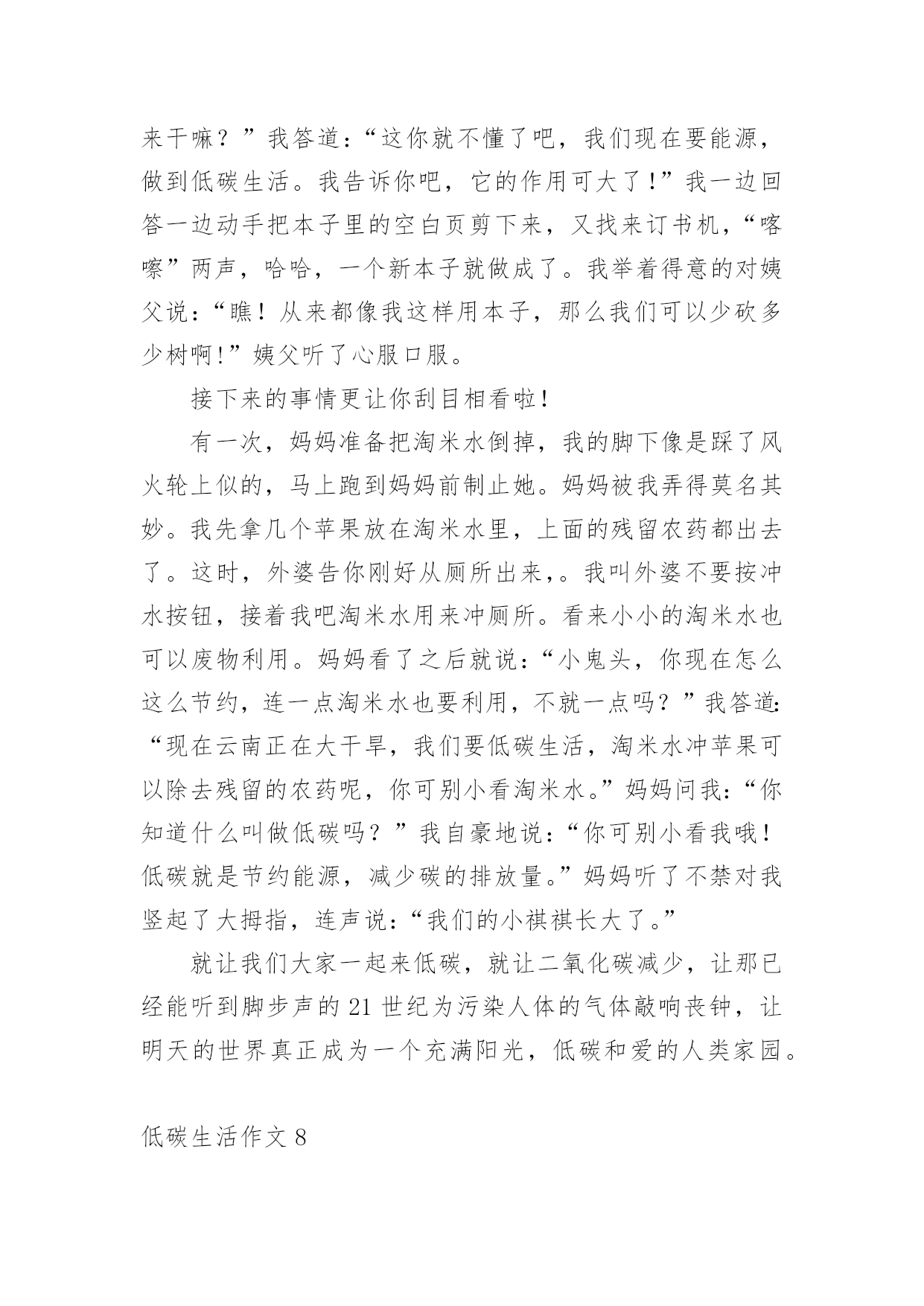 低碳生活作文低碳生活作文大全(15篇)在日复一日的学习、工作或生活中,大家或多或少都会接触过作文吧,作文要求篇章结构完整,一定要避免无结尾作文的出现。你知道作文怎样写才规范吗?以下是小编精心整理的低碳生活作文,仅供参考,希望能够帮助到大家。低碳生活作文1为了节约,我过了一天的低碳生活。早晨,我早早的起了床开始了一天的低碳生活。今天我洗脸刷牙都是用的洗澡节约下来的水,现在的'阳光充足正是个看书的好天气,还节约了电量。等到妈妈起来,我们吃了中饭,妈妈决定到雨花亭沃尔玛去逛一逛。这样不就又节约了吗?我双手表示赞同。我对妈妈说:""妈妈我们不如走楼梯下去吧!要过低碳生活,我们家虽然在十楼,但是下楼梯非常轻松的,妈妈,好吗?""妈妈为了让我过一过低碳生活,所以同意了。我们坐着公交车准备去雨花亭沃尔玛,这样不但省了石油,还对环境得到了有效的保护。走进超市,我突然发现超市旁边有一个小水龙头没有关掉,水都溢出来了,我马上跑过去把水龙头关紧。回家的时候我们还是决定坐公交车,这个时候是黄昏了,红红的太阳映着美丽的岳麓山。我陶醉在这美丽的景色中不知不觉中就到了家。上楼的时候我还是坚持爬楼梯上去,妈妈似乎不同意,我说:""我帮你提一点东西,然后我们一起唱歌上去,这样就轻松多了······""妈妈听了我一大堆的道理,终于同意一起爬上去了。过了十到五分钟的时间我们才满头大汗,气喘嘘嘘,腿脚酸痛的爬上了这整整十楼还要提一大堆的东西。我们懒洋洋的躺在沙发上休息。过了一会儿,妈妈去做饭我就来帮忙,我对妈妈说:“淘米水留下来最有用,它可以做好多事情呢!”吃玩饭后,我用留下来的淘米水把碗和碟子都刷了一遍,尽量减少洗涤剂对水的污染。吃完饭后,为了节约我们一起去散步,一个小时后回到家洗澡。洗完头发后,我问妈妈要一条干净的毛巾来,这样就可以不用电吹风吹头发了。就这样我过了一天的低碳生活。低碳生活作文2古往今来,地球妈妈用甘甜的乳汁哺育了无数代子孙。原来的她被小辈们装饰得楚楚动人。可是,现在人类为了自身的利益,将她折磨得天昏地暗。人类只有一个地球;而地球正面临着严峻的环境危机。“救救地球”已成为世界各国人民最强烈的呼声。近年来,全球气候变幻无常、水土流失严重、温室效应明显、耕地沙化蔓延、生存环境日益恶化,严重威胁着当今世界全人类的健康与生命。去年,一部美国灾难大片《20xx》就此应运而生,让世界各国人民为气候变暖可能给人类造成的灭顶之灾吓出了一身冷汗,当然我也不例外。低碳生活,对于我们普通人来说,是一种态度,而不是能力,我们应该积极提倡并去实践低碳生活,我们不应该只在这里发出倡议,我们应该不仅从节电、节水、节碳、节油、节气这种小事做起,更应该注重从我们的日常的衣食住行上做起。低碳生活是我们要建立的绿色生活方式,只要我们去行动,就可以接近低碳生活,甚至可以达到低碳生活的标准。先从身旁的小事做起,我们只管即便少用纸巾,节约用纸,每张纸都双面打印,相当于保留下半片原本将被砍掉的森林;随手关灯、拔插头,不坐电梯爬楼梯,省下各人的电,换自己的健康;只管即便少施用一次性牙刷、一次性塑料袋、一次性水杯,因为低碳生活与这些行为有关……或许我们做得不够,或许我们的力量很渺小,但是我相信:不积跬步,无以至千里;不积小流,无以成江海。让我们从身边的点点滴滴做起,为低碳生活做出贡献,尽自己的绵薄之力。希望通过我们的`努力,把“低碳生活”的概念传递给每一个家庭。地球是我们的家园,我们应该保护它,不要污染它,不要让电影《20xx》中那惨绝人寰的场景在不久的将来发生!低碳生活作文3我是一名小学6年级的学生,学校给我们一人发了一本《低碳环保》的知识读本。起初,我并不知道什么是低碳生活,通过阅读书中的内容,我知道了全球环境污染严重,生态平衡遭到破坏,严重影响了我们的生活质量。我决心从自己做起,从点滴做起,从生活做起,为保护环境尽自己的心,出自己的力。首先,我要从节约用纸做起。我们学生都离不开纸,例如:写作业、读书、考试等都要用纸,它是我们的必须品。在平常的'学习中,我注意保护课本,尽量不乱写乱画,循环使用,延长使用时间。我让妈妈将以前我用过的本子中未用完的纸重新装订成一个本子,用来作草稿,把正反面充分利用。纸上尽量写满字,不随便撕毁,写作业要认真专心,减少错误,也能减少纸的浪费。我在同学中宣传要节约用纸,因为纸是由树木“变”的,节约用纸就等于保护森林,保护环境。然后我们要节约用水,大家是不是想问我怎么节约用水?我告诉你们吧。洗脸、洗手,尽量使用脸盆。洗衣服时集中洗,剩下的水可以用来拖地。我在洗澡的时侯,妈妈把水放到大盆子里,浴后的水可以用来洗拖把,冲马桶。我还在马桶的水箱里放了一个装满水的瓶子,这样冲水时可以减少水量。以前我总爱和小朋友们打水枪,现在很少玩了。因为这样很浪费水,我们要节约用水,保护淡水