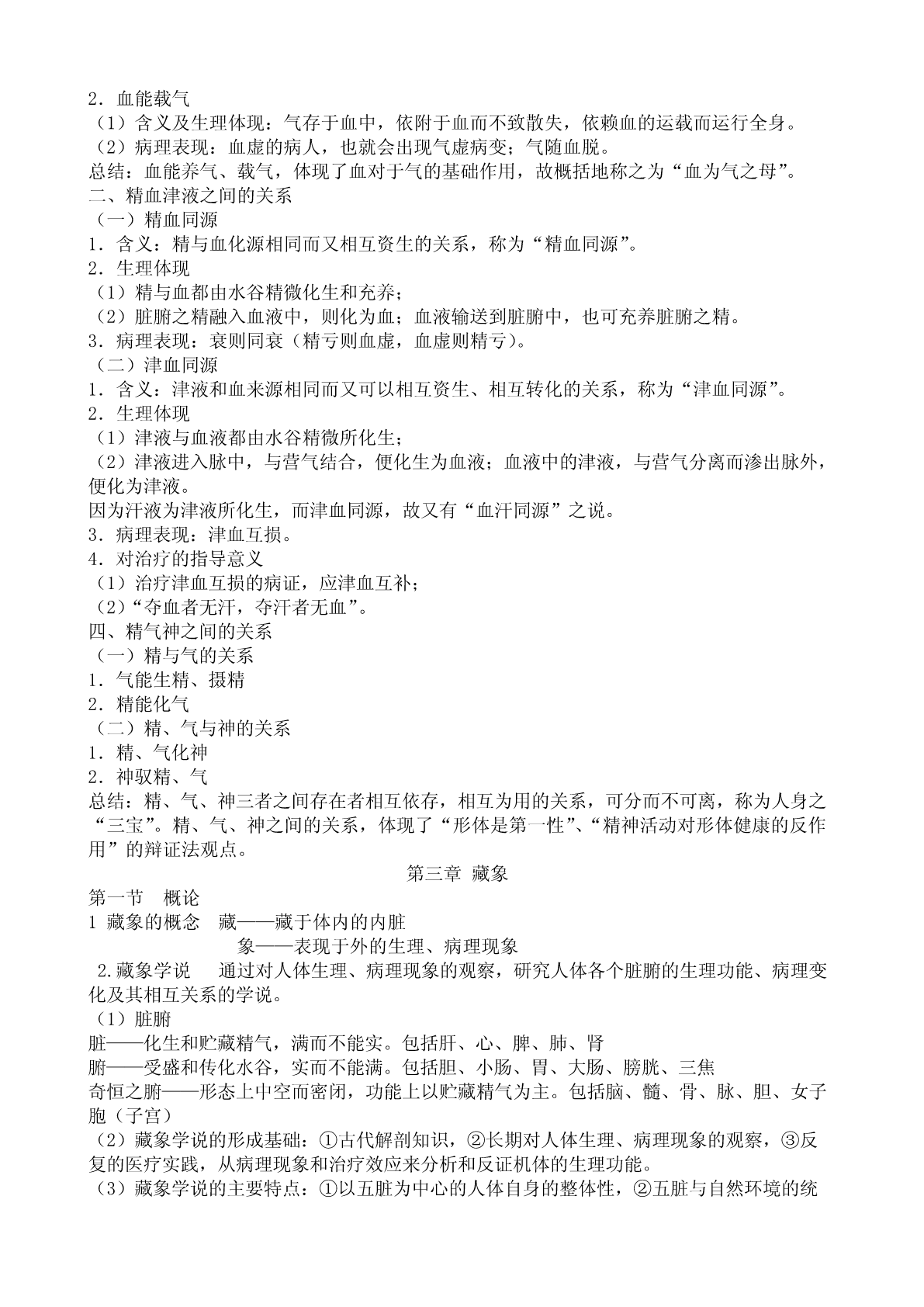中医基础理论绪论中医学:是研究人体生理、病理以及疾病的诊断和防治的一门科学,它有独特的理论体系和丰富的临床经验。中医基础理论:是关于中医学的基本理论、基本知识和基本思维方法的学科,也是阐释和介绍中医学的基本理论、基本知识和基本思维方法的课程。一、中医学理论体系的形成1、中医学的学科属性①中医学受到中国古代哲学的深刻影响②自然科学及社会科学的双重性③中医学是多学科交互渗透的知识体系2、中医学理论体系的形成和发展(1)中医学理论体系的形成时期战国至秦汉时期,《黄帝内经》、《难经》、《神农本草经》、《伤寒杂病论》的问世标志着中医学理论体系的基本建立。《黄帝内经》:我国现存最早的一部医学典籍,中医学理论体系形成的主要标志,其全面奠定了中医理论的基础。《难经》:继《黄帝内经》之后的又一部重要的医学着作,创造性的提出了“独取寸口”的诊脉方法。《神农本草经》:我国第一部药学专着,成书于两汉之间,全书收载365味中药,提出寒凉温热、酸苦甘辛咸之四气五味的理论,确立了中药理论的基础。《伤寒杂病论》:东汉末年着名医家张仲景所着,后经宋代林亿等整理而成《伤寒论》、《金匮要略》两本书。《伤寒论》确立了中医辨证论治的基本原则。(2)中医学理论体系的发展时期1)魏晋隋唐时期:《针灸甲乙经》:晋代皇甫谧所着,我国第一部针灸专着。《脉经》:晋代王叔和所着,我国第一部脉学专着。《诸病源候论》:隋代巢元方所着,中医第一部病因病机证候学专着。《千金要方》、《千金翼方》:唐代孙思邈所着,使脏腑辨证更加完善。2)宋、金、元时期《三因极一病证方论》:宋代陈无择所着,确立了三因之病因分类法。“金元四大家”:金、元时期我国医学史上的重要医学流派。刘完素(河间)主寒凉,提出“六气皆从火化”之火热论;张从正主攻邪,认为病皆由邪生,故“邪去则正安”;李杲(东垣)提出“内伤脾胃,百病由生”的观点,治以补益脾胃;朱震亨(丹溪)以“阳常有余,阴常不足”立论而主养阴。3)明、清时期出现了大批集成性着作。如明代张介宾之《景岳全书》,李中梓之《医宗必读》,清代王清任之《医林改错》等。叶桂(天士),吴塘(鞠通)等为代表,创立了以卫气营血、三焦为核心的温病的辨证论治的体系,形成了“温病学派”。4)近代和现代三、中医理论体系的主要特点1、整体观念(1)定义:人体是一个有机的整体,人与自然界息息相关、密切相联,人体受社会、生存环境影响,这种机体自身整体性思想及其内外环境的统一性,称之为整体观念。中医的整体观念贯穿与中医的生理、病理及诊治等各个方面。(2)整体观念主要内容1)人是一个有机整体①生理上的整体性:五脏一体观;形神一体观。②病理上的整体性;③诊治上的整体性。2)人与自然环境的统一性①自然环境对人体生理的影响:气候昼夜晨昏的变化地域环境②自然环境对人体病理的影响:3)人与社会环境的统一性2、辨证论治(1)辨证论治包括辨证和论治两方面,是中医认识和处理疾病的基本原则。辨证,就是通过对四诊(望、闻、问、切)所搜集的临床资料(包括症状、体征、病史)进行分析、归纳综合,从而辨识出疾病在这一特定时间范围的原因、病位、性质及邪正关系等病理本质内容。论治,是在辩证基础上所确定的治疗法则。(2)“症”、“病”、“证”的区别联系:1)症:指疾病过程中出现的个别、孤立的现象,包括症状和体征。2)病:是机体发生病变时,对疾病全过程的特点及规律所作的概括。3)证:指证候,是对疾病过程中某一阶段或某一类型的病理概括。“症”、“病”、“证”三者有着密切的关系:症是证的依据,证的本质即是由一组有内在联系的症状和体征反映出来的。证是病的某一特定阶段病理变化的实质,中医学尤注重对证的辨识。(3)同病异治与异病同治第一章中医学的哲学基础一、精气学说1、精与气的基本概念(1)精:在古代哲学中又称精气,泛指气,是指无形而运动不息的极细微物质,是构成世界万物(包括人体)的本原,有时是指气的精粹部分。在中医学中,精是指精,是人体生命的构成本原,是一种有形的液态物质。(2)气:是无形而运行不息的极细微物质,是构成宇宙的本原。在中医学中,气是推动和调控人体生命活动的动力来源,是无形的运行不息的精微物质。2、精气学说的主要内容(1)精气是构成宇宙的本原。(2)精气的运动与变化:1)气机:指气的运动。2)气化:指气的运动产生宇宙中各种变化的过程。(3)精气是天地万物相互联系的中介。(4)天地精气化生为人。二、阴阳学说(1)概念:阴阳是对自然界相互关联的某些事物和现象对立双方的属性的概括。即含有对立统一的概念。(2)阴阳的基本特征:《素问.阴阳应象大论》说:“水