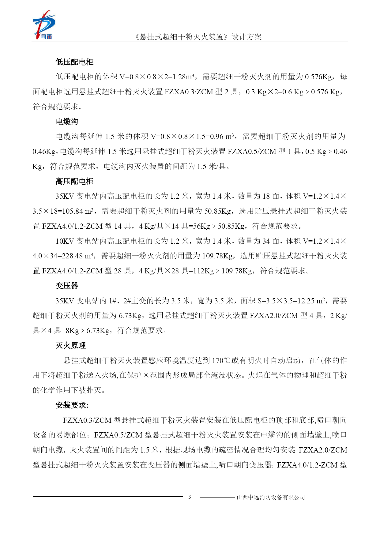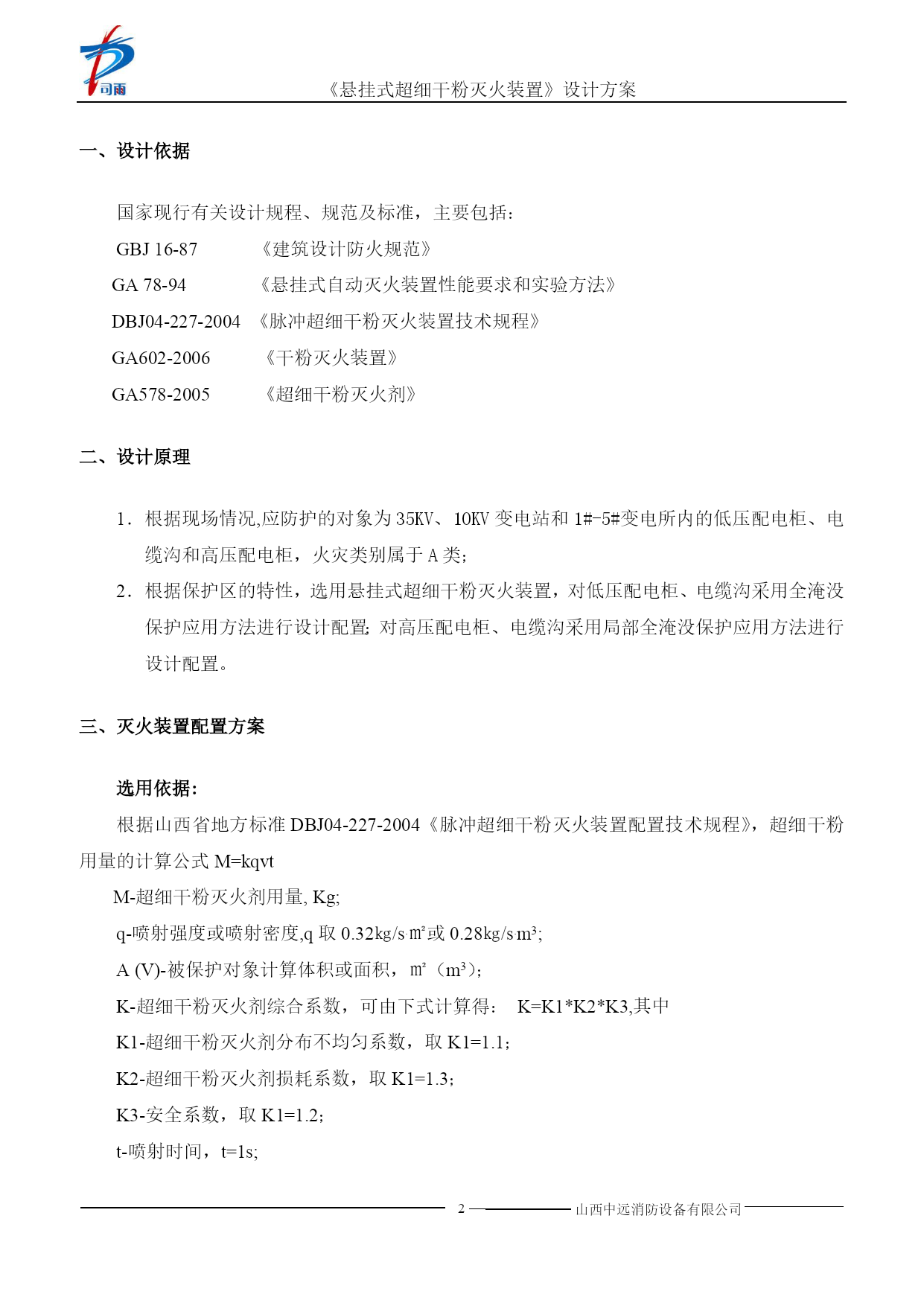 《悬挂式超细干粉灭火装置》设计方案PAGEPAGE4山西中远消防设备有限公司山西福龙煤化有限公司《悬挂式超细干粉灭火装置》设计方案山西中远消防设备有限公司二OO八年十月六日目录TOC\o"1-3"\h\zHYPERLINK\l"_Toc211223541"一、设计依据PAGEREF_Toc211223541\h2HYPERLINK\l"_Toc211223542"二、设计原理PAGEREF_Toc211223542\h2HYPERLINK\l"_Toc211223543"三、灭火装置配置方案PAGEREF_Toc211223543\h2HYPERLINK\l"_Toc211223544"四、灭火装置维护与更换PAGEREF_Toc211223544\h4一、设计依据国家现行有关设计规程、规范及标准,主要包括:GBJ16-87《建筑设计防火规范》GA78-94《悬挂式自动灭火装置性能要求和实验方法》DBJ04-227-2004《脉冲超细干粉灭火装置技术规程》GA602-2006《干粉灭火装置》GA578-2005《超细干粉灭火剂》二、设计原理根据现场情况,应防护的对象为35KV、10KV变电站和1#-5#变电所内的低压配电柜、电缆沟和高压配电柜,火灾类别属于A类;根据保护区的特性,选用悬挂式超细干粉灭火装置,对低压配电柜、电缆沟采用全淹没保护应用方法进行设计配置;对高压配电柜、电缆沟采用局部全淹没保护应用方法进行设计配置。三、灭火装置配置方案选用依据:根据山西省地方标准DBJ04-227-2004《脉冲超细干粉灭火装置配置技术规程》,超细干粉用量的计算公式M=kqvtM-超细干粉灭火剂用量,Kg;q-喷射强度或喷射密度,q取0.32㎏/s.㎡或0.28㎏/s.m3;A(V)-被保护对象计算体积或面积,㎡(m3);K-超细干粉灭火剂综合系数,可由下式计算得:K=K1*K2*K3,其中K1-超细干粉灭火剂分布不均匀系数,取K1=1.1;K2-超细干粉灭火剂损耗系数,取K1=1.3;K3-安全系数,取K1=1.2;t-喷射时间,t=1s;低压配电柜低压配电柜的体积V=0.8×0.8×2=1.28m3,需要超细干粉灭火剂的用量为0.576Kg,每面配电柜选用悬挂式超细干粉灭火装置FZXA0.3/ZCM型2具,0.3Kg×2=0.6Kg﹥0.576Kg,符合规范要求。电缆沟电缆沟每延伸1.5米的体积V=0.8×0.8×1.5=0.96m3,需要超细干粉灭火剂的用量为0.46Kg,电缆沟每延伸1.5米选用悬挂式超细干粉灭火装置FZXA0.5/ZCM型1具,0.5Kg﹥0.46Kg,符合规范要求,电缆沟内灭火装置的间距为1.5米/具。高压配电柜35KV变电站内高压配电柜的长为1.2米,宽为1.4米,数量为18面,体积V=1.2×1.4×3.5×18=105.84m3,需要超细干粉灭火剂的用量为50.85Kg,选用贮压悬挂式超细干粉灭火装置FZXA4.0/1.2-ZCM型14具,4Kg/具×14具=56Kg﹥50.85Kg,符合规范要求。10KV变电站内高压配电柜的长为1.2米,宽为1.4米,数量为34面,体积V=1.2×1.4×4.0×34=228.48m3,需要超细干粉灭火剂的用量为109.78Kg,选用贮压悬挂式超细干粉灭火装置FZXA4.0/1.2-ZCM型28具,4Kg/具×28具=112Kg﹥109.78Kg,符合规范要求。变压器35KV变电站内1#、2#主变的长为3.5米,宽为3.5米,面积S=3.5×3.5=12.25m2,需要超细干粉灭火剂的用量为6.73Kg,选用悬挂式超细干粉灭火装置FZXA2.0/ZCM型4具,2Kg/具×4具=8Kg﹥6.73Kg,符合规范要求。灭火原理悬挂式超细干粉灭火装置感应环境温度达到170℃或有明火时自动启动,在气体的作用下将超细干粉送入火场,在保护区范围内形成局部全淹没状态。火焰在气体的物理和超细干粉的化学作用下被扑灭。安装要求:FZXA0.3/ZCM型悬挂式超细干粉灭火装置安装在低压配电柜的顶部和底部,喷口朝向设备的易燃部位;FZXA0.5/ZCM型悬挂式超细干粉灭火装置安装在电缆沟的侧面墙壁上,喷口朝向电缆,灭火装置间的间距为1.5米,根据现场电缆的疏密情况合理均匀安装;FZXA2.0/ZCM型悬挂式超细干粉灭火装置安装在变压器的侧面墙壁上,喷口朝向变压器;FZXA4.0/1.2-ZCM型悬挂式超细干粉灭火装置安装在高压配电柜的顶部,喷口朝下,灭火装置每三