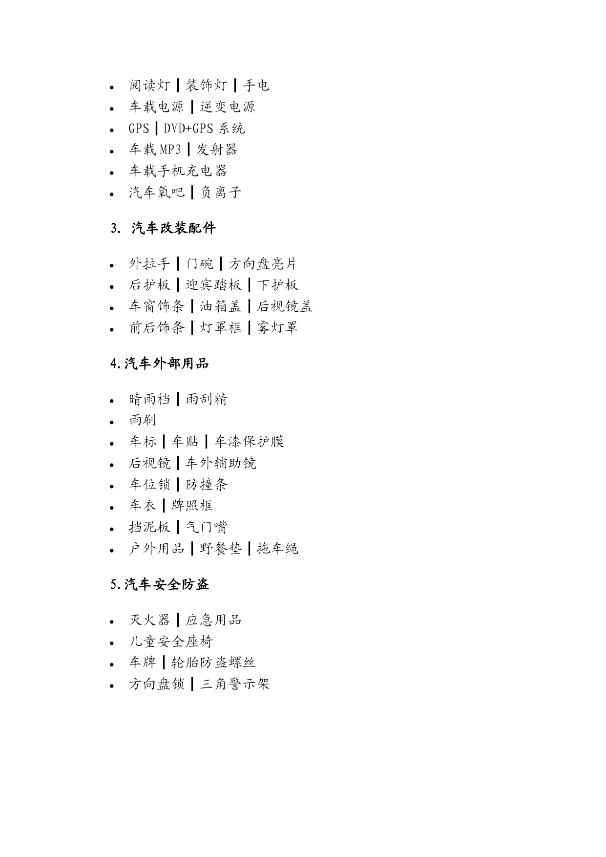 汕头市SY汽车用品分类1.汽车内部用品夏季┃毛垫┃坐垫冬季┃毛垫┃坐垫HYPERLINK"http://hongzhi.mall.taobao.com/?scid=96667400&queryType=cat&categoryName=座椅套&search=y"座椅套脚垫┃后备箱垫方向盘套HYPERLINK"http://hongzhi.mall.taobao.com/?scid=96667403&queryType=cat&categoryName=头枕┃抱枕┃腰靠┃护颈枕&search=y"头枕┃抱枕┃腰靠┃护颈枕手刹套┃排档套┃把手套HYPERLINK"http://hongzhi.mall.taobao.com/?scid=96667405&queryType=cat&categoryName=纸巾盒套┃垃圾桶&search=y"纸巾盒套┃垃圾桶HYPERLINK"http://hongzhi.mall.taobao.com/?scid=96667462&queryType=cat&categoryName=后视镜套┃安全带套&search=y"后视镜套┃安全带套HYPERLINK"http://hongzhi.mall.taobao.com/?scid=96667406&queryType=cat&categoryName=遮阳挡&search=y"遮阳挡安全带夹/扣┃眼镜夹HYPERLINK"http://hongzhi.mall.taobao.com/?scid=96667408&queryType=cat&categoryName=遮阳板袋┃证件袋┃CD夹┃CD袋&search=y"遮阳板袋┃证件袋┃CD夹┃CD袋手机架┃饮料架┃烟灰缸摆饰┃挂饰┃防滑垫┃摇头娃娃HYPERLINK"http://hongzhi.mall.taobao.com/?scid=96667411&queryType=cat&categoryName=置物筒┃置物盒┃椅背挂袋&search=y"置物筒┃置物盒┃椅背挂袋伞袋┃衣架HYPERLINK"http://hongzhi.mall.taobao.com/?scid=96667413&queryType=cat&categoryName=托盘┃餐台┃挂钩&search=y"托盘┃餐台┃挂钩除静电用品┃钥匙扣┃钥匙包电子罗盘┃指南球┃助力球HYPERLINK"http://hongzhi.mall.taobao.com/?scid=96667416&queryType=cat&categoryName=电子钟┃温湿度计&search=y"电子钟┃温湿度计香水┃香座┃香薰HYPERLINK"http://hongzhi.mall.taobao.com/?scid=96667463&queryType=cat&categoryName=空气净化┃除异味&search=y"空气净化┃除异味HYPERLINK"http://hongzhi.mall.taobao.com/?scid=96667535&queryType=cat&categoryName=水晶饰品&search=y"水晶饰品HYPERLINK"http://hongzhi.mall.taobao.com/?scid=96667540&queryType=cat&categoryName=扶手箱&search=y"扶手箱2.汽车电子电器打气泵┃吸尘器┃胎压计车载冰箱┃冷热杯┃咖啡壶HYPERLINK"http://hongzhi.mall.taobao.com/?scid=96667424&queryType=cat&categoryName=点烟器┃电源分配器&search=y"点烟器┃电源分配器HYPERLINK"http://hongzhi.mall.taobao.com/?scid=96667423&queryType=cat&categoryName=阅读灯┃装饰灯┃手电&search=y"阅读灯┃装饰灯┃手电车载电源┃逆变电源GPS┃DVD+GPS系统车载MP3┃发射器HYPERLINK"http://hongzhi.mall.taobao.com/?scid=96667532&queryType=cat&categoryName=车载手机充电器&search=y"车载手机充电器汽车氧吧┃负离子3.汽车改装配件HYPERLINK"http://hongzhi.mall.taobao.com/?scid=96667506&queryType=cat&cate