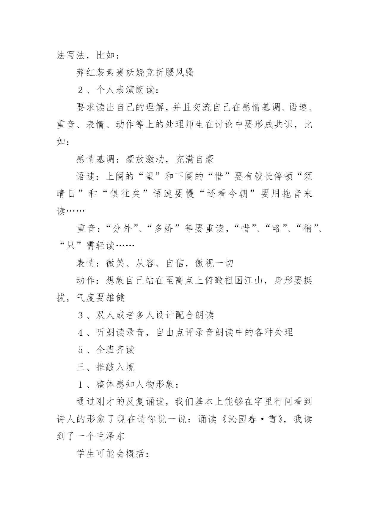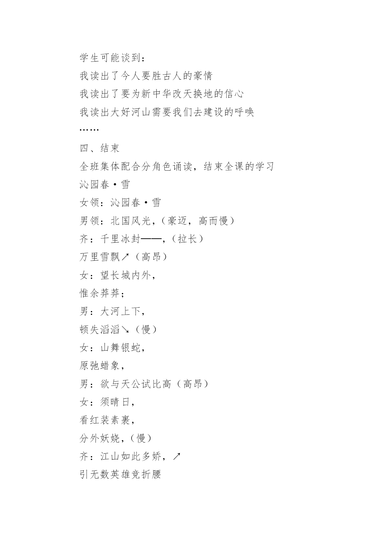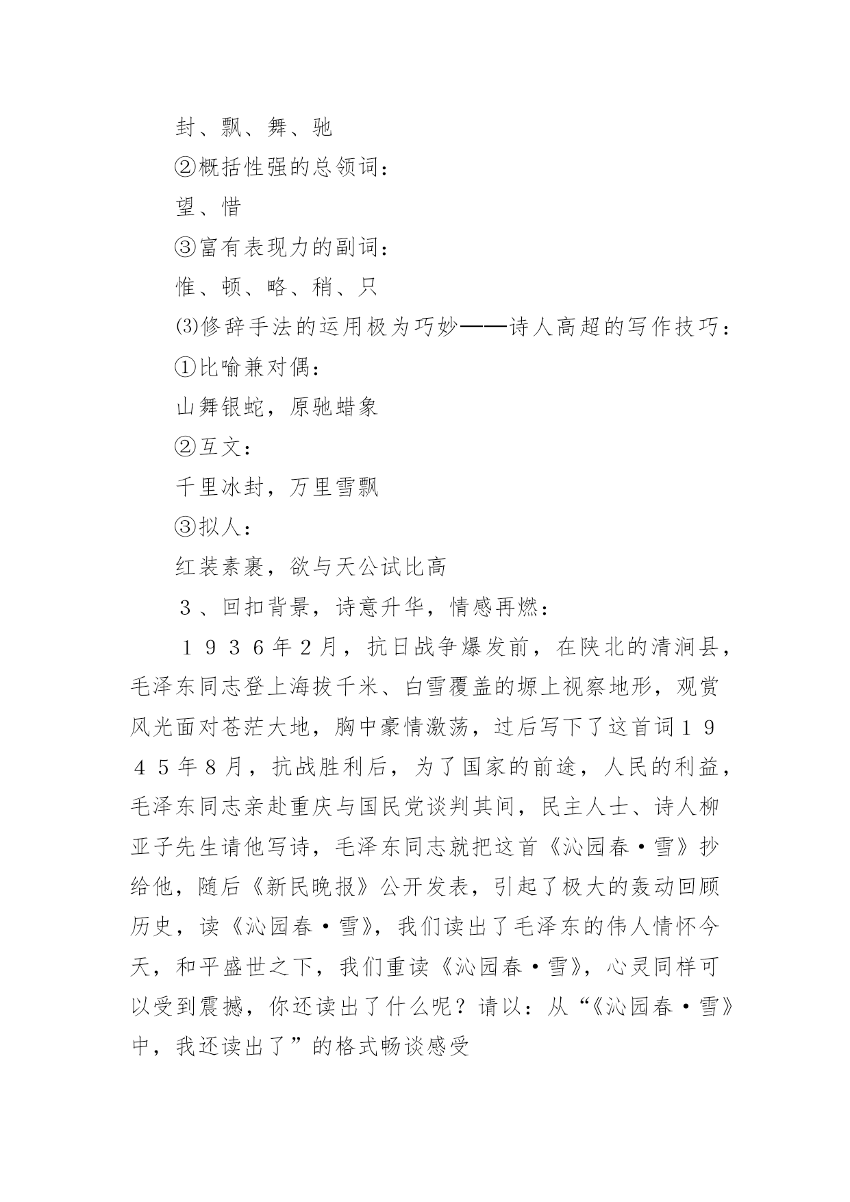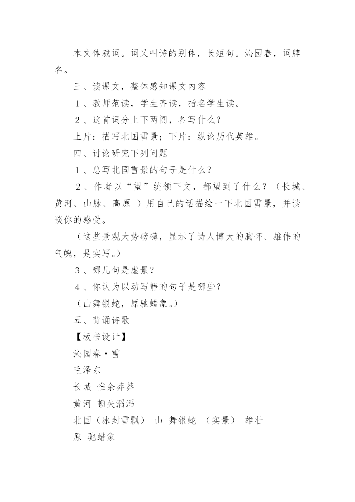 沁园春雪教学设计沁园春雪教学设计(通用21篇)在教学工作者开展教学活动前,就不得不需要编写教学设计,借助教学设计可以更好地组织教学活动。那么大家知道规范的教学设计是怎么写的吗?下面是小编为大家整理的沁园春雪教学设计,希望能够帮助到大家。沁园春雪教学设计篇1【知识目标】1、写景、议论、抒情的表达方式。2、背诵课文、默写课文。【能力目标】理解背景、把握大意。【思想目标】热爱祖国大好河山,树立伟大抱负和坚定信念。【重点、难点】理解“数风流人物还看今朝”。【课时】两课时。第一课时〖教学目标〗1、熟读并背诵诗歌。2、学习诗歌上阕。〖教学过程〗一、检查预习1、指名朗读课文。2、让学生谈谈对这首词的初步理解。二、题解与背景本文体裁词。词又叫诗的别体,长短句。沁园春,词牌名。三、读课文,整体感知课文内容1、教师范读,学生齐读,指名学生读。2、这首词分上下两阕,各写什么?上片:描写北国雪景;下片:纵论历代英雄。四、讨论研究下列问题1、总写北国雪景的句子是什么?2、作者以“望”统领下文,都望到了什么?(长城、黄河、山脉、高原)用自己的话描绘一下北国雪景,并谈谈你的感受。(这些景观大势磅礴,显示了诗人博大的胸怀、雄伟的气魄,是实写。)3、哪几句是虚景?4、你认为以动写静的句子是哪些?(山舞银蛇,原驰蜡象。)五、背诵诗歌【板书设计】沁园春·雪毛泽东长城惟余莽莽黄河顿失滔滔北国(冰封雪飘)山舞银蛇(实景)雄壮原驰蜡象晴日→红装素裹(虚景)秀丽第二课时〖教学目标〗1、理解“俱往矣,数风流人物,还看今朝”的含义及全词表达的感情。2、了解词多种表达方式共用的特点。〖教学过程〗一、检查背诵,复习上阕二、学习下阕1、齐颂下阕。2、提问:下阕前两句在结构上起什么作用?3、提问:在下片中,能起到领起下文的字是?(惜)它领起哪些句子?4、怎样理解“俱往矣,数风流人物,还看今朝”?(诗人描写北国雪景,有雄壮之气势,豪放的风格,抒发了诗人对祖国山河的热爱,表现了诗人豪迈的胸怀。)三、重点词句子的理解1、“山舞银蛇,原驰蜡象”的含义。2、“江山如此多娇,引无数英雄竞折腰”在结构上的作用。承上启下,过渡作用。3、结句“俱往矣,数风流人物,还看今朝”有何寓意?(只有今天的一代英雄人物,才能使多娇江山完全称意。这是对一代新人的呼唤和企盼。)四、小结五、处理课后第三题沁园春雪教学设计篇2【教学目标】1、诗歌诵读训练2、欣赏本诗描写、抒情、议论的完美结合,感受诗词炼字的魅力3、感受毛泽东豪迈奔放的伟人情怀【教学重难点】1、诗歌诵读训练:以读动情,以读识文通过齐读、轮读、领读等丰富多彩的朗读方式让学生走进诗歌、走进作者2、感受诗词炼字炼词的魅力让学生通过词语的咀嚼玩味,体会本诗表达的精妙【课时安排】一课时【教学流程】第一课时一、诗歌导入诗人毛泽东任先青你用平平仄仄的枪声写诗二万五千里是最长的一行常于马背构思便具有了战略家的目光战地黄花如血残阳成了最美的意象有时潇洒地抽烟抬头望断南飞雁宽阔的脑际却有大江流淌雪天更善畅想神思飞扬起来飘成梅花漫天的北国风光相信你是最严肃的诗人屈指数算一首气势磅礴的诗调动了半个世纪的酝酿轻易不朗诵天安门城楼上只那一句便站成了世界的诗眼嘹亮了东方毛泽东是革命领袖,是共和国的缔造者,同时也是诗人梅花瑞雪,战地黄花,残阳如血,击水新唱,指点江山,激扬文字,他的诗词作品把典雅高古的旧体诗词同中国革命的历史风云紧密融合,绽成了诗词创作中的一朵奇葩今天,我们就来学习他的著名诗篇《沁园春·雪》二、诵读入情1、个人自由诵读:要求读准字音,了解诗歌基本内容,关注重点词语的读法写法,比如:莽红装素裹妖娆竞折腰风骚2、个人表演朗读:要求读出自己的理解,并且交流自己在感情基调、语速、重音、表情、动作等上的处理师生在讨论中要形成共识,比如:感情基调:豪放激动,充满自豪语速:上阕的“望”和下阕的“惜”要有较长停顿“须晴日”和“俱往矣”语速要慢“还看今朝”要用拖音来读……重音:“分外”、“多娇”等要重读,“惜”、“略”、“稍”、“只”需轻读……表情:微笑、从容、自信,傲视一切动作:想象自己站在至高点上俯瞰祖国江山,身形要挺拔,气度要雄健3、双人或者多人设计配合朗读4、听朗读录音,自由点评录音朗读中的各种处理5、全班齐读三、推敲入境1、整体感知人物形象:通过刚才的反复诵读,我们基本上能够在字里行间看到诗人的形象了现在请你说一说:诵读《沁园春·雪》,我读到了一个毛泽东学生可能会概括:我读到了一个豪放的毛泽东我读到了一个充满瑰丽想象的毛泽东我读到了一个画家毛泽东我读到了一个胸怀天下的政治家毛泽东我读到了一个骄傲的毛泽东我读到了一个要主宰历史的毛泽东……2、咀嚼诗句,由文见人:可以任意选择其中的一两个话题(或者自设话题),紧扣诗歌的精妙之点来说:从毛泽东的写景之妙来看毛泽东从毛泽东点评之奇来看