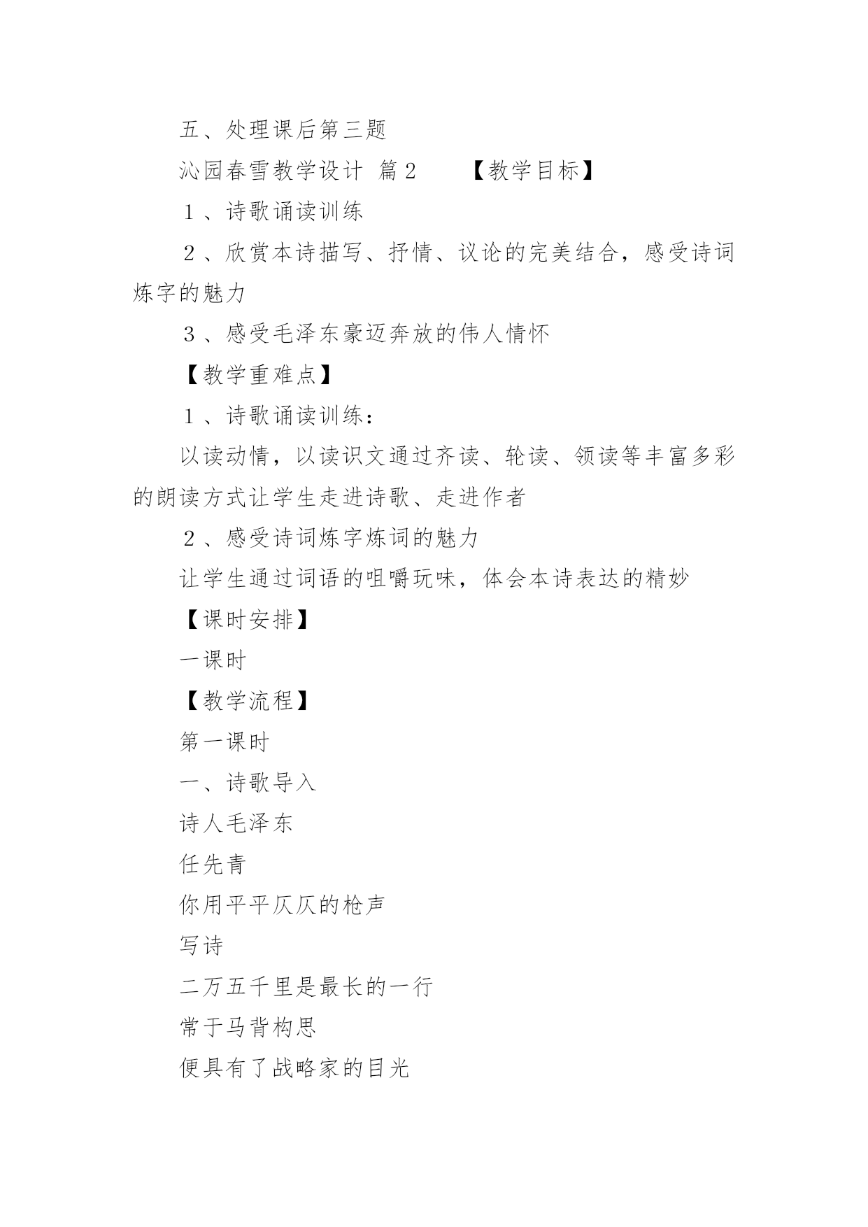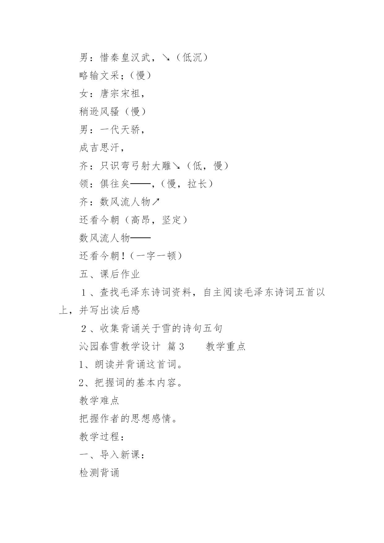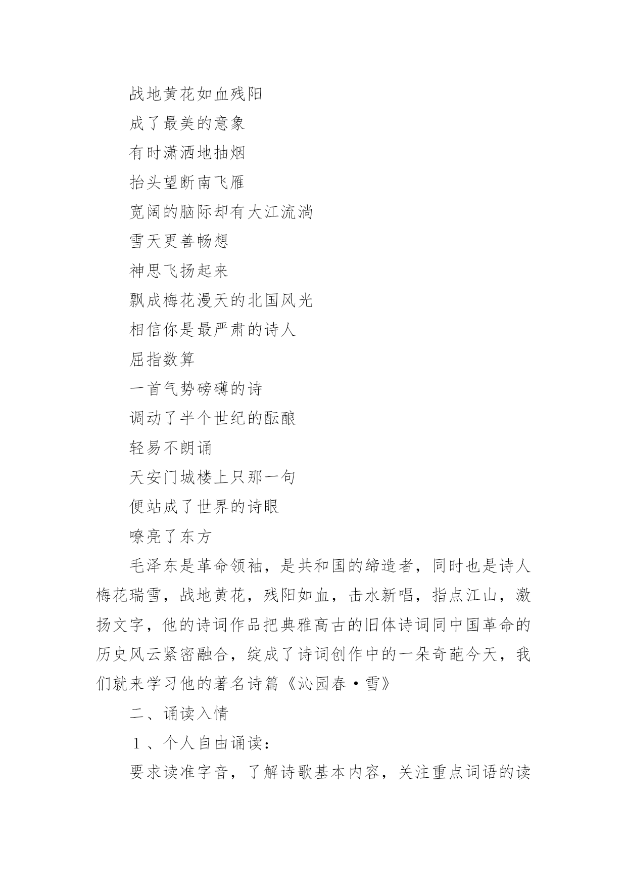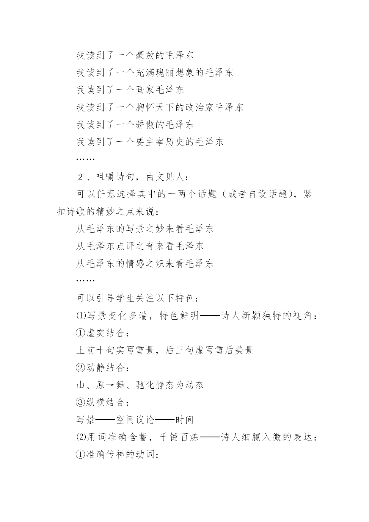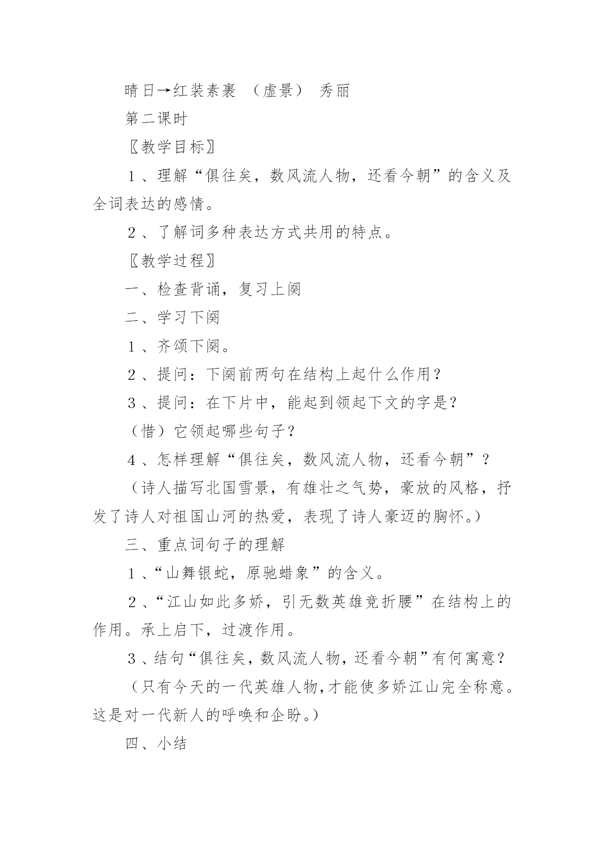 沁园春雪教学设计沁园春雪教学设计(通用21篇)在教学工作者开展教学活动前,就不得不需要编写教学设计,借助教学设计可以更好地组织教学活动。那么大家知道规范的教学设计是怎么写的吗?下面是小编为大家整理的沁园春雪教学设计,希望能够帮助到大家。沁园春雪教学设计篇1【知识目标】1、写景、议论、抒情的表达方式。2、背诵课文、默写课文。【能力目标】理解背景、把握大意。【思想目标】热爱祖国大好河山,树立伟大抱负和坚定信念。【重点、难点】理解“数风流人物还看今朝”。【课时】两课时。第一课时〖教学目标〗1、熟读并背诵诗歌。2、学习诗歌上阕。〖教学过程〗一、检查预习1、指名朗读课文。2、让学生谈谈对这首词的初步理解。二、题解与背景本文体裁词。词又叫诗的别体,长短句。沁园春,词牌名。三、读课文,整体感知课文内容1、教师范读,学生齐读,指名学生读。2、这首词分上下两阕,各写什么?上片:描写北国雪景;下片:纵论历代英雄。四、讨论研究下列问题1、总写北国雪景的句子是什么?2、作者以“望”统领下文,都望到了什么?(长城、黄河、山脉、高原)用自己的话描绘一下北国雪景,并谈谈你的感受。(这些景观大势磅礴,显示了诗人博大的胸怀、雄伟的气魄,是实写。)3、哪几句是虚景?4、你认为以动写静的句子是哪些?(山舞银蛇,原驰蜡象。)五、背诵诗歌【板书设计】沁园春·雪毛泽东长城惟余莽莽黄河顿失滔滔北国(冰封雪飘)山舞银蛇(实景)雄壮原驰蜡象晴日→红装素裹(虚景)秀丽第二课时〖教学目标〗1、理解“俱往矣,数风流人物,还看今朝”的含义及全词表达的感情。2、了解词多种表达方式共用的特点。〖教学过程〗一、检查背诵,复习上阕二、学习下阕1、齐颂下阕。2、提问:下阕前两句在结构上起什么作用?3、提问:在下片中,能起到领起下文的字是?(惜)它领起哪些句子?4、怎样理解“俱往矣,数风流人物,还看今朝”?(诗人描写北国雪景,有雄壮之气势,豪放的风格,抒发了诗人对祖国山河的热爱,表现了诗人豪迈的胸怀。)三、重点词句子的理解1、“山舞银蛇,原驰蜡象”的含义。2、“江山如此多娇,引无数英雄竞折腰”在结构上的作用。承上启下,过渡作用。3、结句“俱往矣,数风流人物,还看今朝”有何寓意?(只有今天的一代英雄人物,才能使多娇江山完全称意。这是对一代新人的呼唤和企盼。)四、小结五、处理课后第三题沁园春雪教学设计篇2【教学目标】1、诗歌诵读训练2、欣赏本诗描写、抒情、议论的完美结合,感受诗词炼字的魅力3、感受毛泽东豪迈奔放的伟人情怀【教学重难点】1、诗歌诵读训练:以读动情,以读识文通过齐读、轮读、领读等丰富多彩的朗读方式让学生走进诗歌、走进作者2、感受诗词炼字炼词的魅力让学生通过词语的咀嚼玩味,体会本诗表达的精妙【课时安排】一课时【教学流程】第一课时一、诗歌导入诗人毛泽东任先青你用平平仄仄的枪声写诗二万五千里是最长的一行常于马背构思便具有了战略家的目光战地黄花如血残阳成了最美的意象有时潇洒地抽烟抬头望断南飞雁宽阔的脑际却有大江流淌雪天更善畅想神思飞扬起来飘成梅花漫天的北国风光相信你是最严肃的诗人屈指数算一首气势磅礴的诗调动了半个世纪的酝酿轻易不朗诵天安门城楼上只那一句便站成了世界的诗眼嘹亮了东方毛泽东是革命领袖,是共和国的缔造者,同时也是诗人梅花瑞雪,战地黄花,残阳如血,击水新唱,指点江山,激扬文字,他的诗词作品把典雅高古的旧体诗词同中国革命的历史风云紧密融合,绽成了诗词创作中的一朵奇葩今天,我们就来学习他的著名诗篇《沁园春·雪》二、诵读入情1、个人自由诵读:要求读准字音,了解诗歌基本内容,关注重点词语的读法写法,比如:莽红装素裹妖娆竞折腰风骚2、个人表演朗读:要求读出自己的理解,并且交流自己在感情基调、语速、重音、表情、动作等上的处理师生在讨论中要形成共识,比如:感情基调:豪放激动,充满自豪语速:上阕的“望”和下阕的“惜”要有较长停顿“须晴日”和“俱往矣”语速要慢“还看今朝”要用拖音来读……重音:“分外”、“多娇”等要重读,“惜”、“略”、“稍”、“只”需轻读……表情:微笑、从容、自信,傲视一切动作:想象自己站在至高点上俯瞰祖国江山,身形要挺拔,气度要雄健3、双人或者多人设计配合朗读4、听朗读录音,自由点评录音朗读中的各种处理5、全班齐读三、推敲入境1、整体感知人物形象:通过刚才的反复诵读,我们基本上能够在字里行间看到诗人的形象了现在请你说一说:诵读《沁园春·雪》,我读到了一个毛泽东学生可能会概括:我读到了一个豪放的毛泽东我读到了一个充满瑰丽想象的毛泽东我读到了一个画家毛泽东我读到了一个胸怀天下的政治家毛泽东我读到了一个骄傲的毛泽东我读到了一个要主宰历史的毛泽东……2、咀嚼诗句,由文见人:可以任意选择其中的一两个话题(或者自设话题),紧扣诗歌的精妙之点来说:从毛泽东的写景之妙来看毛泽东从毛泽东点评之奇来看