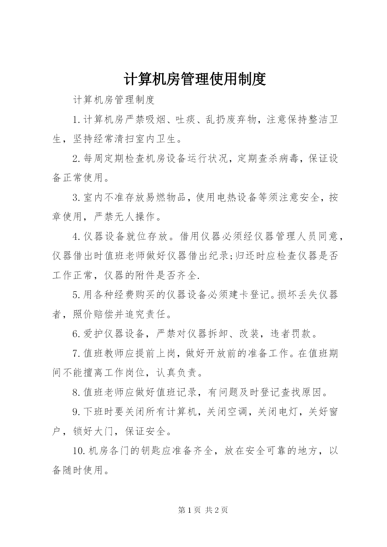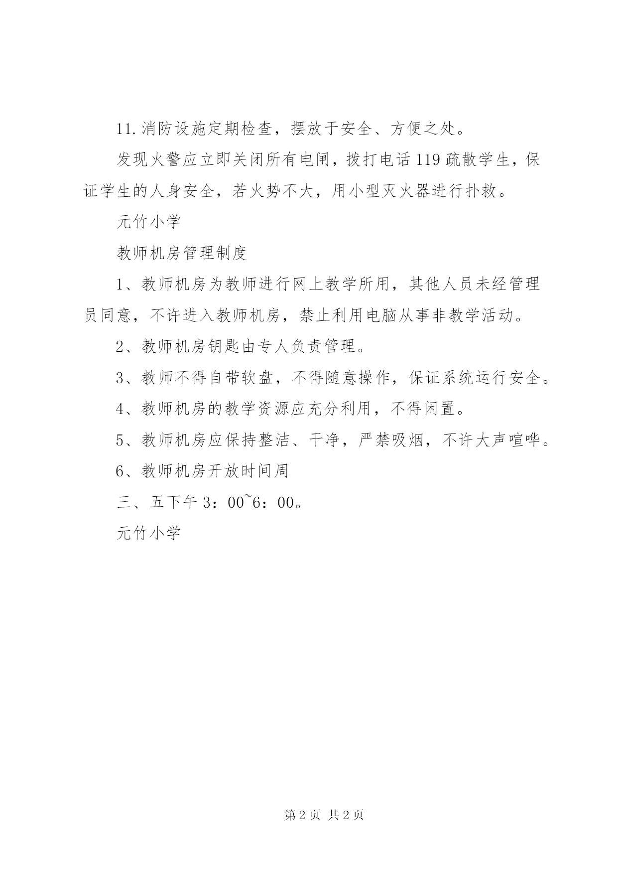 第PAGE\*Arabic\*MERGEFORMAT2页共NUMPAGES\*MERGEFORMAT2页计算机房管理使用制度计算机房管理制度1.计算机房严禁吸烟、吐痰、乱扔废弃物,注意保持整洁卫生,坚持经常清扫室内卫生。2.每周定期检查机房设备运行状况,定期查杀病毒,保证设备正常使用。3.室内不准存放易燃物品,使用电热设备等须注意安全,按章使用,严禁无人操作。4.仪器设备就位存放。借用仪器必须经仪器管理人员同意,仪器借出时值班老师做好仪器借出纪录;归还时应检查仪器是否工作正常,仪器的附件是否齐全.5.用各种经费购买的仪器设备必须建卡登记。损坏丢失仪器者,照价赔偿并追究责任。6.爱护仪器设备,严禁对仪器拆卸、改装,违者罚款。7.值班教师应提前上岗,做好开放前的准备工作。在值班期间不能擅离工作岗位,认真负责。8.值班老师应做好值班记录,有问题及时登记查找原因。9.下班时要关闭所有计算机,关闭空调,关闭电灯,关好窗户,锁好大门,保证安全。10.机房各门的钥匙应准备齐全,放在安全可靠的地方,以备随时使用。11.消防设施定期检查,摆放于安全、方便之处。发现火警应立即关闭所有电闸,拨打电话119疏散学生,保证学生的人身安全,若火势不大,用小型灭火器进行扑救。元竹小学教师机房管理制度1、教师机房为教师进行网上教学所用,其他人员未经管理员同意,不许进入教师机房,禁止利用电脑从事非教学活动。2、教师机房钥匙由专人负责管理。3、教师不得自带软盘,不得随意操作,保证系统运行安全。4、教师机房的教学资源应充分利用,不得闲置。5、教师机房应保持整洁、干净,严禁吸烟,不许大声喧哗。6、教师机房开放时间周三、五下午3:00~6:00。元竹小学