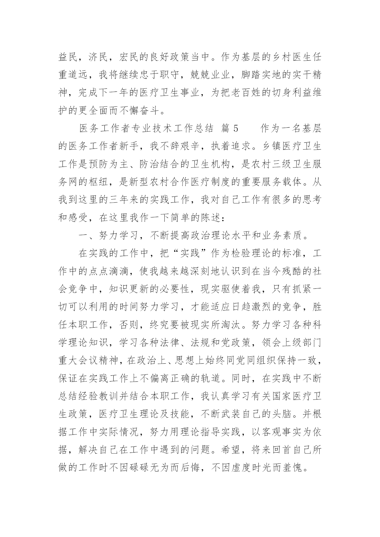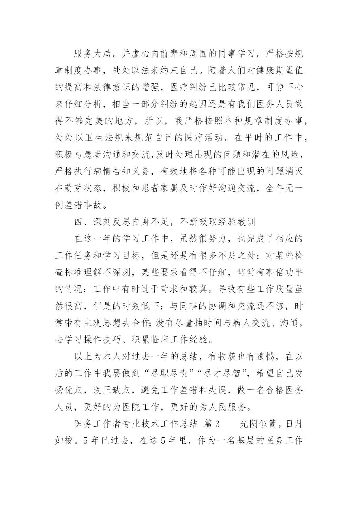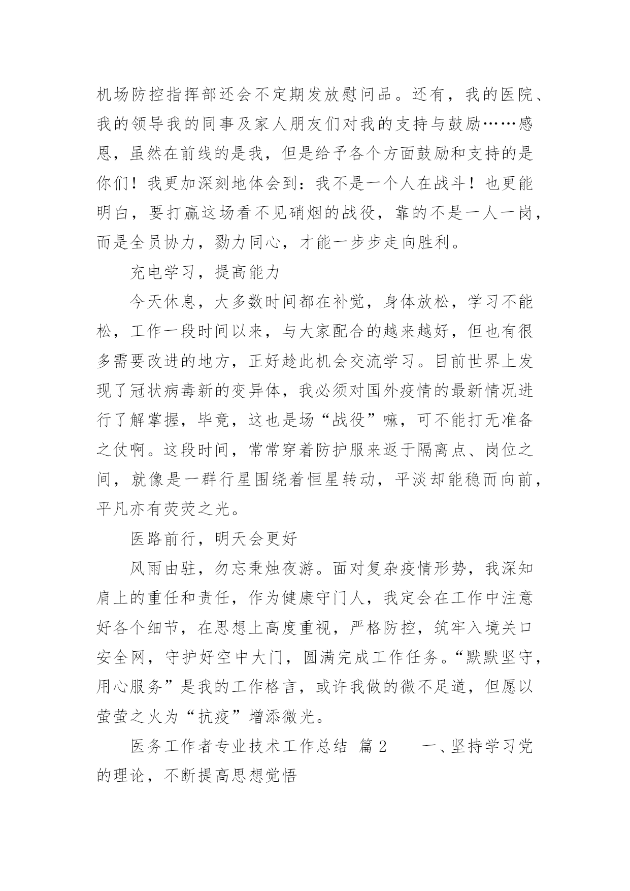 医务工作者专业技术工作总结医务工作者专业技术工作总结(通用15篇)时光在流逝,从不停歇,一段时间的工作已经结束了,回顾这段时间的工作,在取得成绩的同时,我们也找到了工作中的不足和问题,这也意味着,又要准备开始写工作总结了。那么要如何写呢?下面是小编精心整理的医务工作者专业技术工作总结,供大家参考借鉴,希望可以帮助到有需要的朋友。医务工作者专业技术工作总结篇1接到支援xx国际机场的通知,我激动不已,能够作为xx县妇计中心第三批支援机场护士到一线去支援,是我的荣幸。这是最疲惫的日子,却也是我精神上最充实富有的时刻……初来乍到20xx年10月22日早上,带着领导的信任和家人的嘱托,我坚定的踏上了支援xx国际机场的征程。到达驻地后,匆匆放下行李就进入紧张的培训,晚上就开始了10小时的复测体温工作。岗位值守第一次值守在T3国际出发口,我思绪万千,时而为自己参与到抗疫而骄傲自豪,时而又为即将面对疑似发热的病人有些紧张,又生怕自己在紧张之下出现失误……我紧盯复测入口,对红外线体温检测体温超过37.3℃的旅客,我将用水银温度计对旅客进行3次复测,并进行流行病学史的调查,针对发热旅客向上级疫情防控指挥部进行汇报,并配合流调,转运,公安等相关部门进行对接工作,在防控部门统一协调下将发热旅客转入指定机构沟沟坎坎新岗位新职责的紧张与激动很快被忙碌的工作而磨平,两点一线的生活模式、昼夜颠倒的作息时间、紧张压抑的工作环境,一度让我喘不过气来。开始几天的适应期实属不易,肠胃不适、睡眠质量差等问题频频出现。在这关键时刻,正是我们年轻人挺身而出的时候,我不能退缩,必须迅速克服困难……随着作息时间的适应,每日报告零输入病例,我的工作、生活、心态逐渐步入了正轨。惊心动魄,准备“战斗”用水银温度计复测体温过程中,遇到了2位红外线检测异常旅客。清晰的记得,其中一位旅客一次与二次复测体温均是37。9度,体温的居高不下,那一刻,我能感觉到旅客的慌乱与紧张,在担心之余,我积极安抚旅客情绪。时间一分一秒的过去,千呼万唤的第三次复测结果终于出来了,“哇,36.5度,体温恢复正常”,我悬着的心也随之放下。这也给了我最深的感触:不管是日常防护,还是防疫前线,细致入微、耐心倾听的工作态度都是相通的,监测体温这项工作,并不是冷冰冰的你问我答,也需要有心人用“温度”去投入。后方支援,暖心虽工作时间特殊,但酒店工作人员会按时准备好饭菜,机场防控指挥部还会不定期发放慰问品。还有,我的医院、我的领导我的同事及家人朋友们对我的支持与鼓励……感恩,虽然在前线的是我,但是给予各个方面鼓励和支持的是你们!我更加深刻地体会到:我不是一个人在战斗!也更能明白,要打赢这场看不见硝烟的战役,靠的不是一人一岗,而是全员协力,勠力同心,才能一步步走向胜利。充电学习,提高能力今天休息,大多数时间都在补觉,身体放松,学习不能松,工作一段时间以来,与大家配合的越来越好,但也有很多需要改进的地方,正好趁此机会交流学习。目前世界上发现了冠状病毒新的变异体,我必须对国外疫情的最新情况进行了解掌握,毕竟,这也是场“战役”嘛,可不能打无准备之仗啊。这段时间,常常穿着防护服来返于隔离点、岗位之间,就像是一群行星围绕着恒星转动,平淡却能稳而向前,平凡亦有荧荧之光。医路前行,明天会更好风雨由驻,勿忘秉烛夜游。面对复杂疫情形势,我深知肩上的重任和责任,作为健康守门人,我定会在工作中注意好各个细节,在思想上高度重视,严格防控,筑牢入境关口安全网,守护好空中大门,圆满完成工作任务。“默默坚守,用心服务”是我的工作格言,或许我做的微不足道,但愿以萤萤之火为“抗疫”增添微光。医务工作者专业技术工作总结篇2一、坚持学习党的理论,不断提高思想觉悟坚持学习党的理论,不断提高思想觉悟是我作为一名共产党党员的义务。我认真学习党的十八大精神,结合“十二五”工作目标,着力提升自身职业道德水平和专业素质,提高医疗服务质量和服务水平。二、提高自律能力,具有良好的医德医风千百年来,无论是希波拉底宣言还是孙思邈《大医精诚》都强调了医德医风对医疗工作者的重要性。自从选择了医生这个职业,从某种意义上说,就是选择了奉献,医务工作者从事的是救死扶伤的职业,曾被誉为白衣天使和生命的守护神,可只有医务工作者自己才知道实际工作中的艰辛。平时经常加班加点,早出晚归,特别作为一名皮肤科医生,凭着一份执着的追求,一股处处为病人着想的热情,认真诊治每一位病人,面对病人的需求,想方设法从细节入手,让病人处处感到真情可贵。面对家人的埋怨,朋友的不解,有时我甚至对自己从事的职业动摇过,可每当看到病人康复的笑脸,所有的辛苦,委屈都会烟消云散。救死扶伤、不辞艰辛、献身医学事业是我们共同的追求。我在临床实践中,坚持对待患者做到“五心”:即“爱心”“热心”“诚心”“实心”“耐心”,《素问》指出:“
