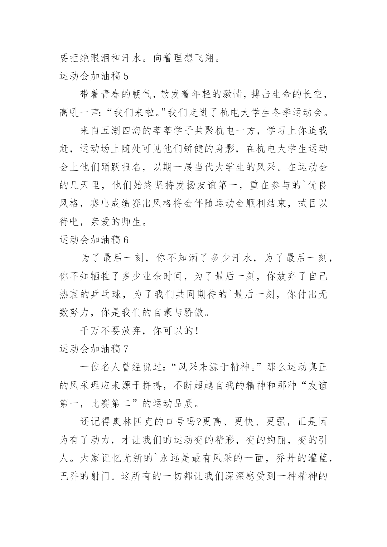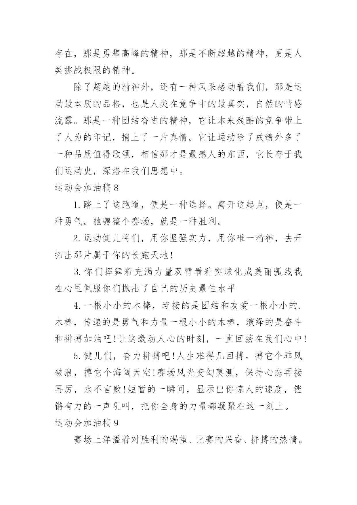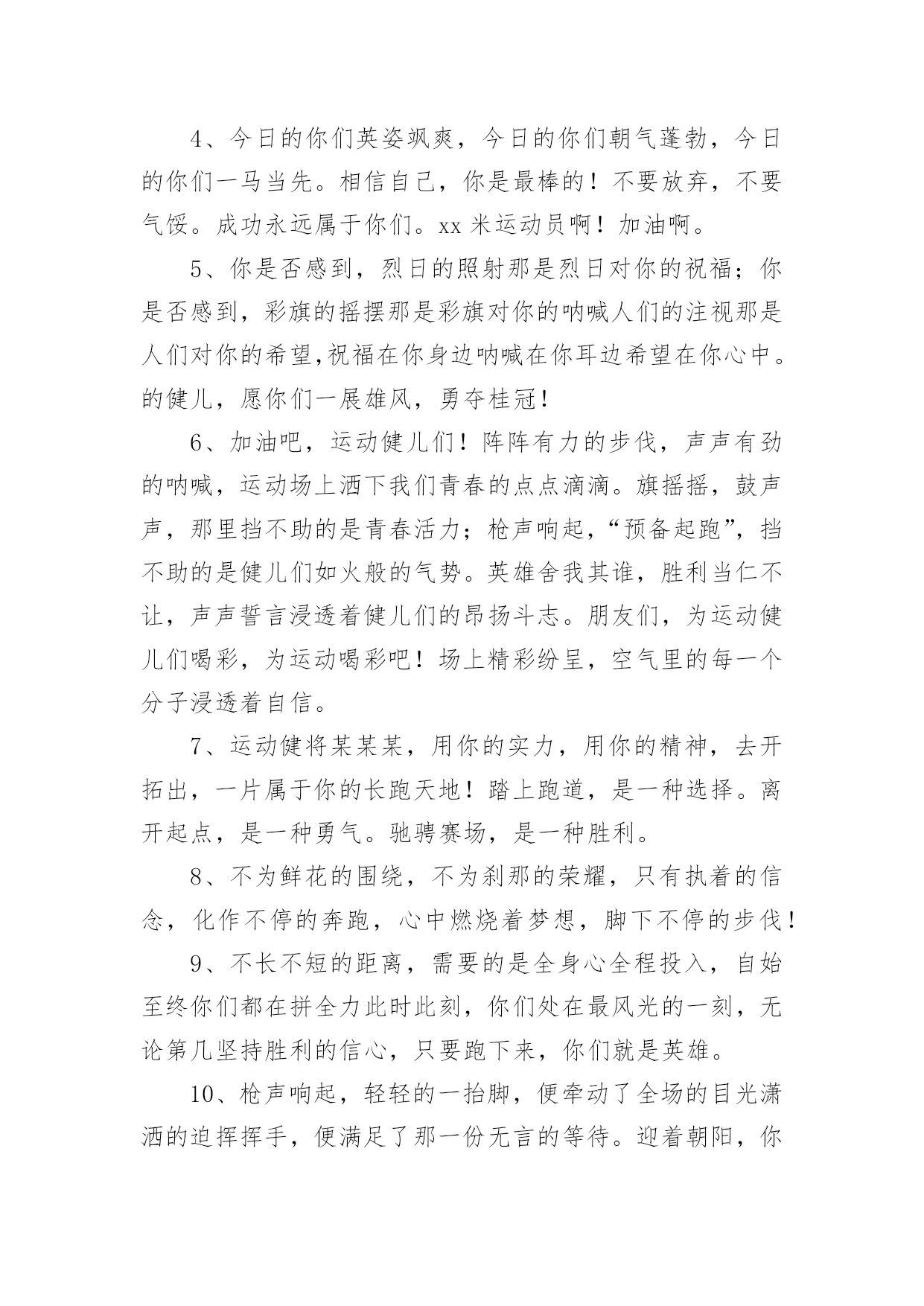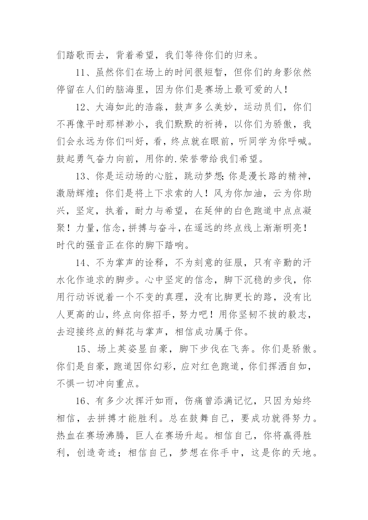 运动会加油稿运动会加油稿20篇在充满活力,日益开放的今天,很多情况下我们需要用到加油稿,加油稿可以起到鼓励场上的人、增添其信心的作用。为了让您在写加油稿时更加简单方便,以下是小编整理的运动会加油稿,希望对大家有所帮助。运动会加油稿1自古巾帼不让须眉,而今武妆更胜红妆。此刻,你们不是温婉柔弱的水,即便没有刚强如铁的臂膀,你们挺直了不会轻易屈服的脊梁;你们也不是娇羞欲滴的花,在挥汗如雨的'赛场上,你们勇敢地站在最前线。加油,美丽自信的姑娘们。运动会加油稿2蔚蓝的天空下,有你矫健的身影,热闹的'操场上,有你坚定的步伐,美丽的鲜花后有你辛勤的汗水,我们的喝彩中,有你的自豪与骄傲!体育健儿们,我们知道你们的辛勤,我们了解你们的辛苦,加油吧!不论你是成功还是失败,我们都是你们坚强的后盾,胜也爱你,败也爱你,我们永远支持你,你们永远是“最特别的存在”。运动会加油稿3面对的依然是蓝色的天空,依然是金色的阳光,依然是绿色的草地,依然是红色的跑道,依然是你,勇敢的你,坚强的你。不同的是,天空更加蔚蓝,阳光更加灿烂,草地更如翡翠一般,跑道更加的`鲜艳,而你,定会更加的自信,你的成绩,必然更加辉煌。运动会加油稿4年轻的心年轻的心微笑着走上跑道,心中充满对胜利的渴望。年轻的心舒展得将信念转化为动力,年轻的心奔腾着要让风放飞自己的梦,行到梦实现的地方。年轻的心永不畏惧无论是敌人还是自己,年轻的心永不言败拼搏了便再没遗憾,年轻的心拥有的.只有自信,相信自己必胜的信念永不改变,年轻的心永远前进永不改变!目标你是否有这种感觉:目标越接近,困难越增加。征服困难的条件是简单的,只要艰苦一时,忍耐一时,抱着信念,永不回头。为了你心中永恒的目标,为了你夺取胜利后的微笑,不要拒绝眼泪和汗水。向着理想飞翔。运动会加油稿5带着青春的朝气,散发着年轻的激情,搏击生命的长空,高吼一声:“我们来啦。”我们走进了杭电大学生冬季运动会。来自五湖四海的莘莘学子共聚杭电一方,学习上你追我赶,运动场上随处可见他们矫健的身影,在杭电大学生运动会上他们踊跃报名,以期一展当代大学生的风采。在运动会的几天里,他们始终坚持发扬友谊第一,重在参与的`优良风格,赛出成绩赛出风格将会伴随运动会顺利结束,拭目以待吧,亲爱的师生。运动会加油稿6为了最后一刻,你不知洒了多少汗水,为了最后一刻,你不知牺牲了多少业余时间,为了最后一刻,你放弃了自己热衷的乒乓球,为了我们共同期待的`最后一刻,你付出无数努力,你是我们的自豪与骄傲。千万不要放弃,你可以的!运动会加油稿7一位名人曾经说过:“风采来源于精神。”那么运动真正的风采理应来源于拼搏,不断超越自我的精神和那种“友谊第一,比赛第二”的运动品质。还记得奥林匹克的口号吗?更高、更快、更强,正是因为有了动力,才让我们的运动变的精彩,变的绚丽,变的引人。大家记忆尤新的`永远是最有风采的一面,乔丹的灌蓝,巴乔的射门。这所有的一切都让我们深深感受到一种精神的存在,那是勇攀高峰的精神,那是不断超越的精神,更是人类挑战极限的精神。除了超越的精神外,还有一种风采感动着我们,那是运动最本质的品格,也是人类在竞争中的最真实,自然的情感流露。那是一种团结奋进的精神,它让本来残酷的竞争带上了人为的印记,捎上了一片真情。它让运动除了成绩外多了一种品质值得歌颂,相信那才是最感人的东西,它长存于我们运动史,深烙在我们思想中。运动会加油稿81.踏上了这跑道,便是一种选择。离开这起点,便是一种勇气。驰骋整个赛场,就是一种胜利。2.运动健儿将们,用你坚强实力,用你唯一精神,去开拓出那片属于你的长跑天地!3.你们挥舞着充满力量双臂看着实球化成美丽弧线我在心里佩服你们抛出了自己的历史最佳水平4.一根小小的木棒,连接的是团结和友爱一根小小的.木棒,传递的是勇气和力量一根小小的木棒,演绎的是奋斗和拼搏加油吧!让这激动人心的时刻,一直回荡在我们心中!5.健儿们,奋力拼搏吧!人生难得几回搏。搏它个乖风破浪,搏它个海阔天空!赛场风光变幻莫测,保持心态再接再厉,永不言败!短暂的一瞬间,显示出你惊人的速度,铿锵有力的一声吼叫,把你全身的力量都凝聚在这一刻上。运动会加油稿9赛场上洋溢着对胜利的渴望、比赛的兴奋、拼搏的热情。运动健儿们奔跑的`身影定格在我们心中。你们是让我们骄傲的勇者,你们是让我们欢呼喝彩的胜者,驰骋在跑道一道道耀眼的光芒是你们矫健身影的掠过,没有华丽的辞藻去形容你们傲人的成绩,有的只是对你们最真实的赞颂。前方会有胜利的终点,前方会有更多的掌声,让我们在充满活力的赛场上勇于拼搏。大声呐喊助威吧!加油!运动会加油稿101、你和红色的地面有个约定,那上方,总有你奔跑的身影;你与绿色的草坪有个约定,那上方,浸着你辛劳的汗渍。你与我们有个约定,说你必须要赢,也必须会赢。你喊着跑着,迈开大步,跨过世纪。我们相信你,