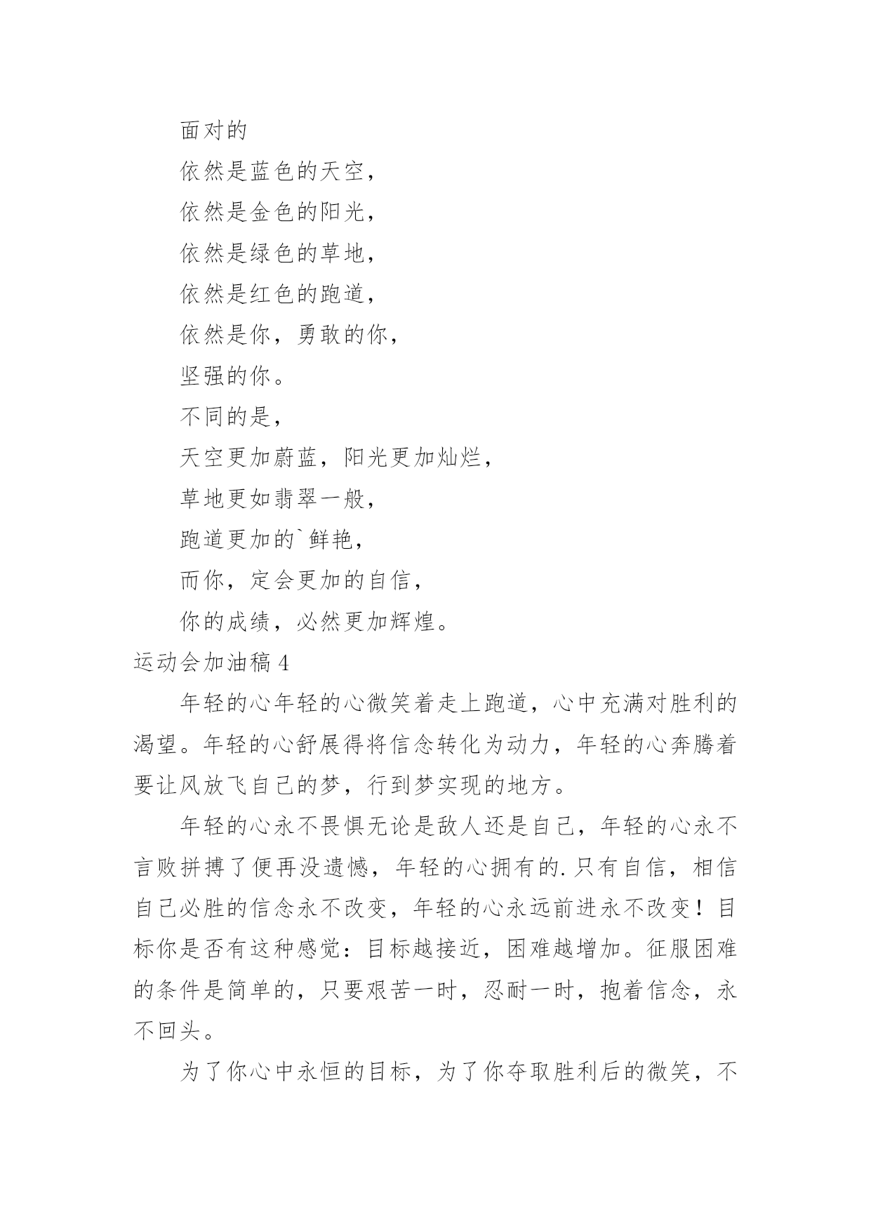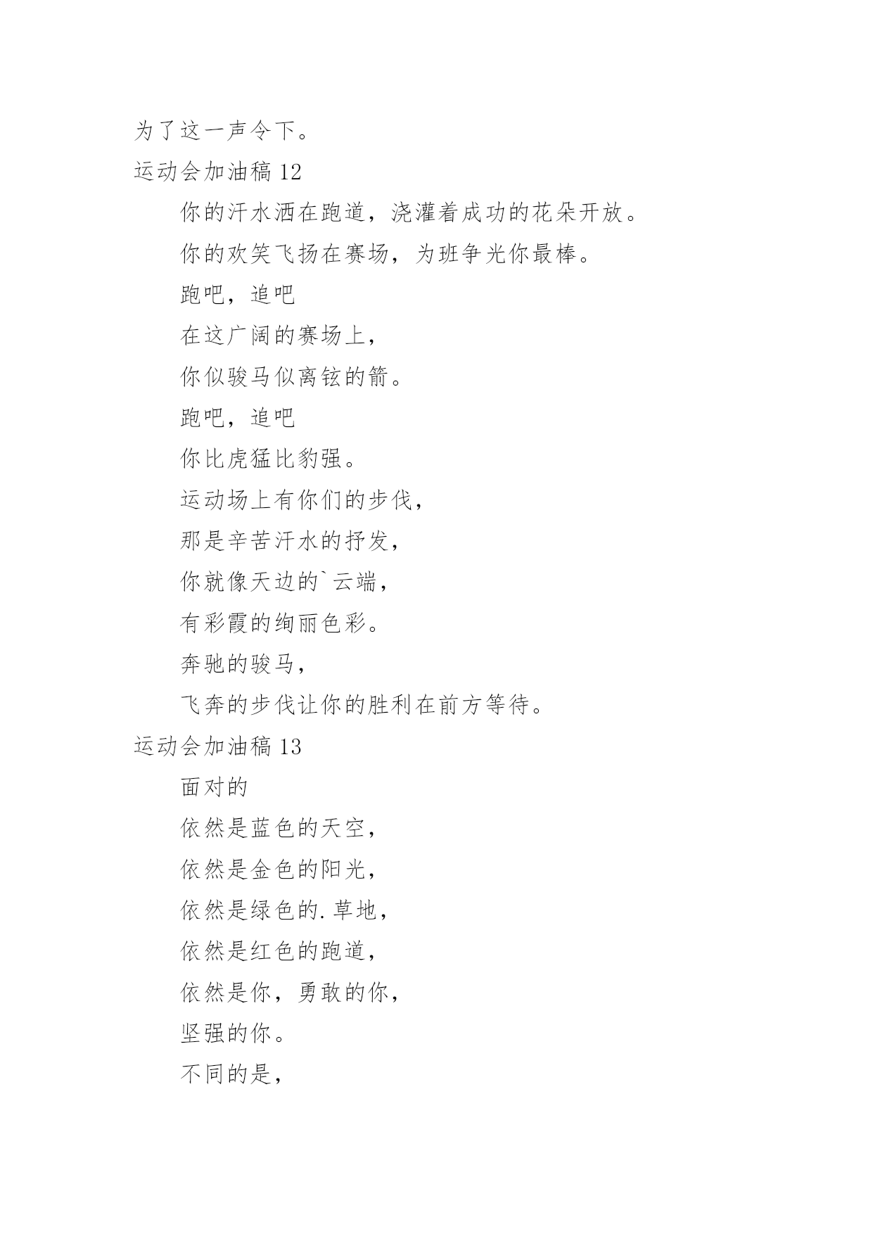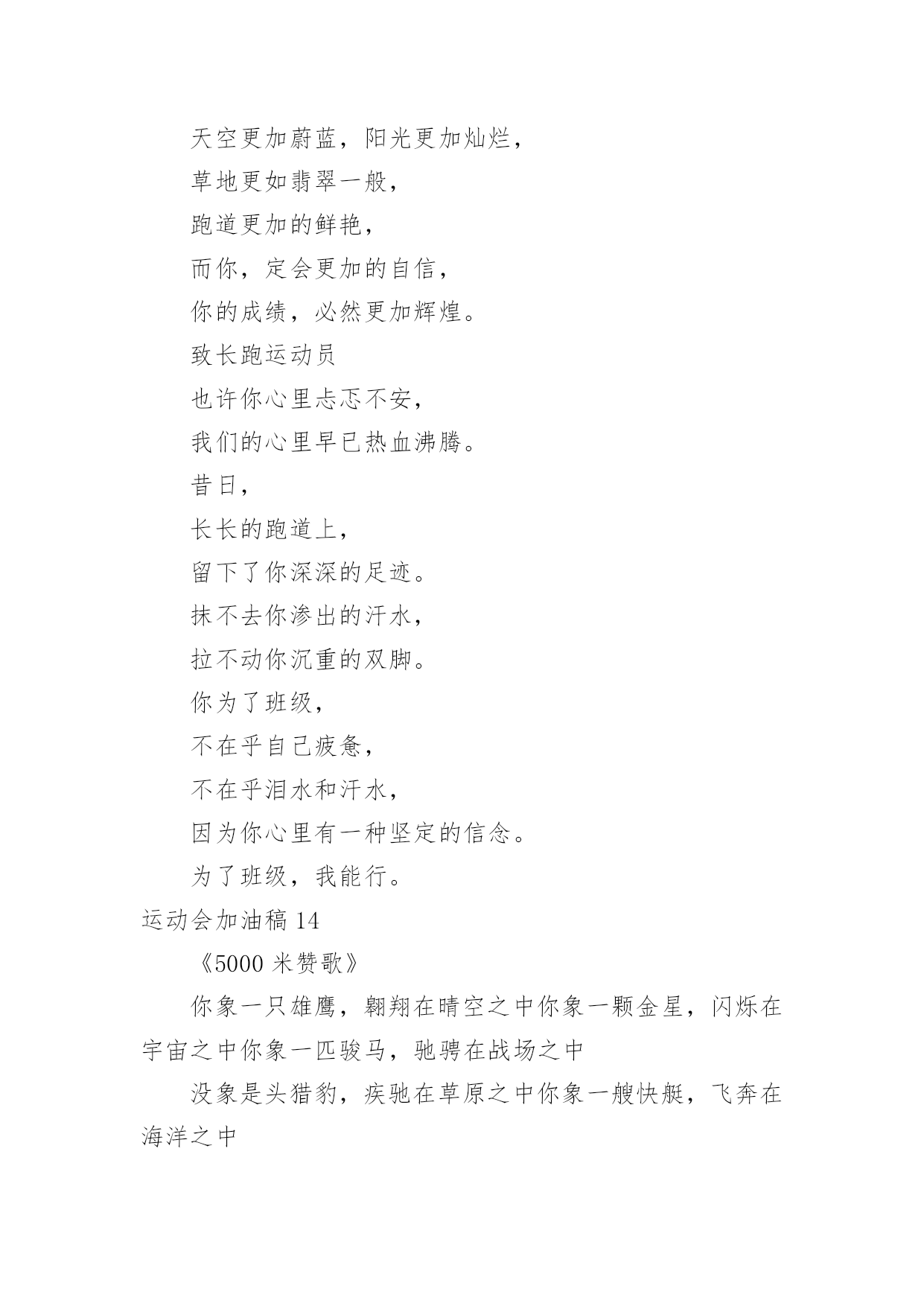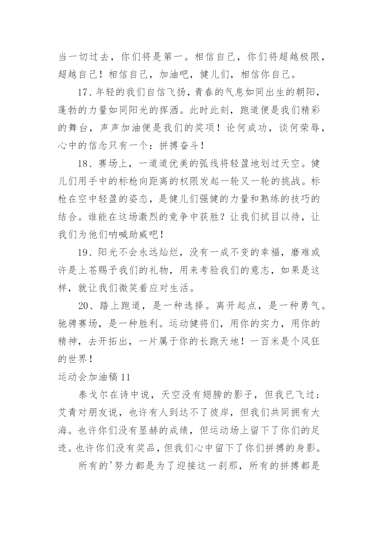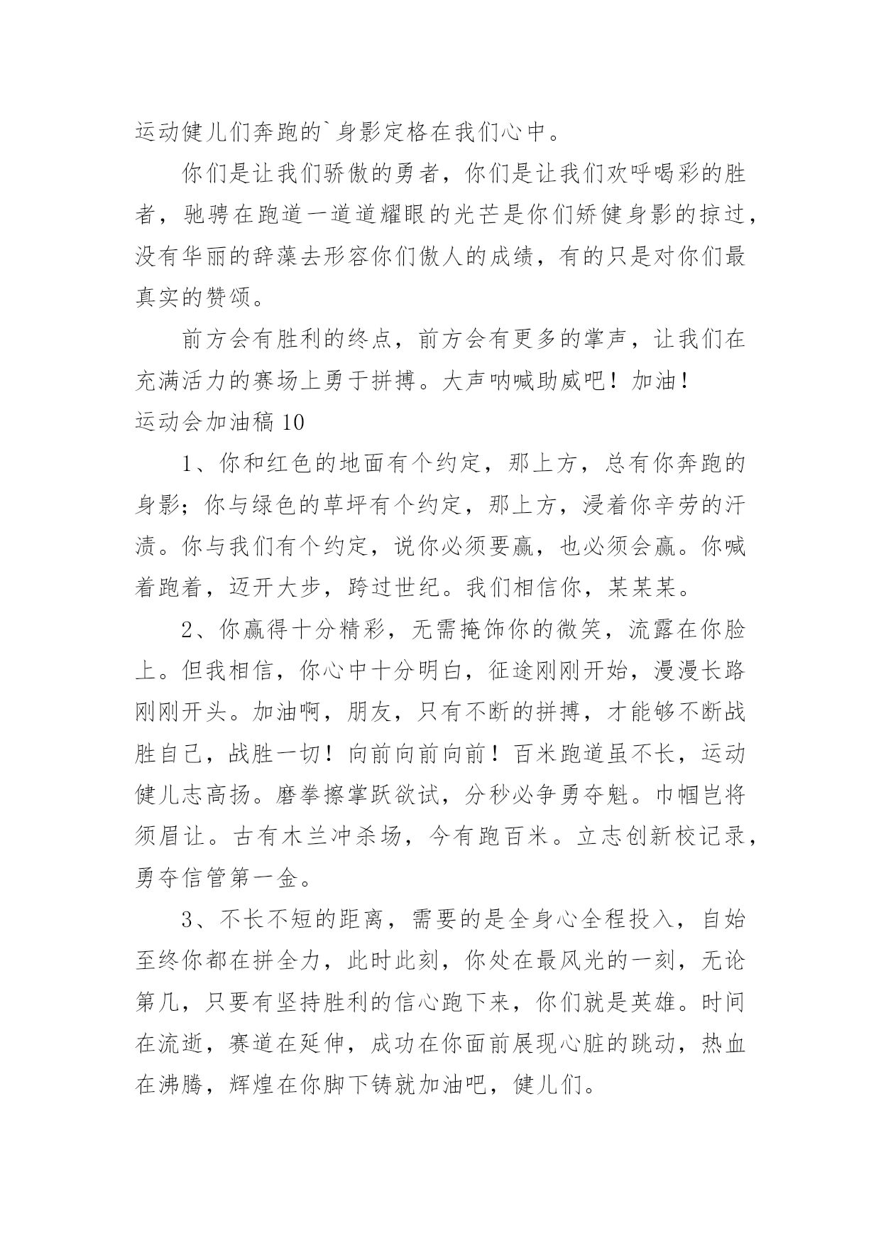 运动会加油稿运动会加油稿20篇在充满活力,日益开放的今天,很多情况下我们需要用到加油稿,加油稿可以起到鼓励场上的人、增添其信心的作用。为了让您在写加油稿时更加简单方便,以下是小编整理的运动会加油稿,希望对大家有所帮助。运动会加油稿1自古巾帼不让须眉,而今武妆更胜红妆。此刻,你们不是温婉柔弱的水,即便没有刚强如铁的臂膀,你们挺直了不会轻易屈服的脊梁;你们也不是娇羞欲滴的花,在挥汗如雨的'赛场上,你们勇敢地站在最前线。加油,美丽自信的姑娘们。运动会加油稿2蔚蓝的天空下,有你矫健的身影,热闹的'操场上,有你坚定的步伐,美丽的鲜花后有你辛勤的汗水,我们的喝彩中,有你的自豪与骄傲!体育健儿们,我们知道你们的辛勤,我们了解你们的辛苦,加油吧!不论你是成功还是失败,我们都是你们坚强的后盾,胜也爱你,败也爱你,我们永远支持你,你们永远是“最特别的存在”。运动会加油稿3面对的依然是蓝色的天空,依然是金色的阳光,依然是绿色的草地,依然是红色的跑道,依然是你,勇敢的你,坚强的你。不同的是,天空更加蔚蓝,阳光更加灿烂,草地更如翡翠一般,跑道更加的`鲜艳,而你,定会更加的自信,你的成绩,必然更加辉煌。运动会加油稿4年轻的心年轻的心微笑着走上跑道,心中充满对胜利的渴望。年轻的心舒展得将信念转化为动力,年轻的心奔腾着要让风放飞自己的梦,行到梦实现的地方。年轻的心永不畏惧无论是敌人还是自己,年轻的心永不言败拼搏了便再没遗憾,年轻的心拥有的.只有自信,相信自己必胜的信念永不改变,年轻的心永远前进永不改变!目标你是否有这种感觉:目标越接近,困难越增加。征服困难的条件是简单的,只要艰苦一时,忍耐一时,抱着信念,永不回头。为了你心中永恒的目标,为了你夺取胜利后的微笑,不要拒绝眼泪和汗水。向着理想飞翔。运动会加油稿5带着青春的朝气,散发着年轻的激情,搏击生命的长空,高吼一声:“我们来啦。”我们走进了杭电大学生冬季运动会。来自五湖四海的莘莘学子共聚杭电一方,学习上你追我赶,运动场上随处可见他们矫健的身影,在杭电大学生运动会上他们踊跃报名,以期一展当代大学生的风采。在运动会的几天里,他们始终坚持发扬友谊第一,重在参与的`优良风格,赛出成绩赛出风格将会伴随运动会顺利结束,拭目以待吧,亲爱的师生。运动会加油稿6为了最后一刻,你不知洒了多少汗水,为了最后一刻,你不知牺牲了多少业余时间,为了最后一刻,你放弃了自己热衷的乒乓球,为了我们共同期待的`最后一刻,你付出无数努力,你是我们的自豪与骄傲。千万不要放弃,你可以的!运动会加油稿7一位名人曾经说过:“风采来源于精神。”那么运动真正的风采理应来源于拼搏,不断超越自我的精神和那种“友谊第一,比赛第二”的运动品质。还记得奥林匹克的口号吗?更高、更快、更强,正是因为有了动力,才让我们的运动变的精彩,变的绚丽,变的引人。大家记忆尤新的`永远是最有风采的一面,乔丹的灌蓝,巴乔的射门。这所有的一切都让我们深深感受到一种精神的存在,那是勇攀高峰的精神,那是不断超越的精神,更是人类挑战极限的精神。除了超越的精神外,还有一种风采感动着我们,那是运动最本质的品格,也是人类在竞争中的最真实,自然的情感流露。那是一种团结奋进的精神,它让本来残酷的竞争带上了人为的印记,捎上了一片真情。它让运动除了成绩外多了一种品质值得歌颂,相信那才是最感人的东西,它长存于我们运动史,深烙在我们思想中。运动会加油稿81.踏上了这跑道,便是一种选择。离开这起点,便是一种勇气。驰骋整个赛场,就是一种胜利。2.运动健儿将们,用你坚强实力,用你唯一精神,去开拓出那片属于你的长跑天地!3.你们挥舞着充满力量双臂看着实球化成美丽弧线我在心里佩服你们抛出了自己的历史最佳水平4.一根小小的木棒,连接的是团结和友爱一根小小的.木棒,传递的是勇气和力量一根小小的木棒,演绎的是奋斗和拼搏加油吧!让这激动人心的时刻,一直回荡在我们心中!5.健儿们,奋力拼搏吧!人生难得几回搏。搏它个乖风破浪,搏它个海阔天空!赛场风光变幻莫测,保持心态再接再厉,永不言败!短暂的一瞬间,显示出你惊人的速度,铿锵有力的一声吼叫,把你全身的力量都凝聚在这一刻上。运动会加油稿9赛场上洋溢着对胜利的渴望、比赛的兴奋、拼搏的热情。运动健儿们奔跑的`身影定格在我们心中。你们是让我们骄傲的勇者,你们是让我们欢呼喝彩的胜者,驰骋在跑道一道道耀眼的光芒是你们矫健身影的掠过,没有华丽的辞藻去形容你们傲人的成绩,有的只是对你们最真实的赞颂。前方会有胜利的终点,前方会有更多的掌声,让我们在充满活力的赛场上勇于拼搏。大声呐喊助威吧!加油!运动会加油稿101、你和红色的地面有个约定,那上方,总有你奔跑的身影;你与绿色的草坪有个约定,那上方,浸着你辛劳的汗渍。你与我们有个约定,说你必须要赢,也必须会赢。你喊着跑着,迈开大步,跨过世纪。我们相信你,