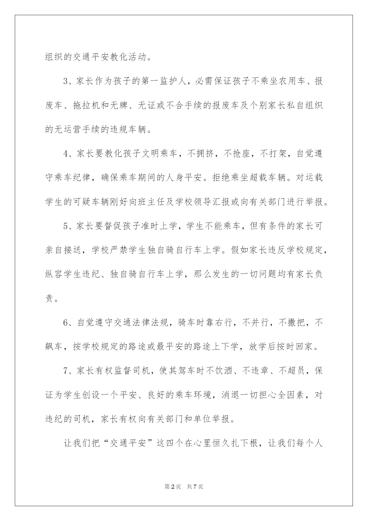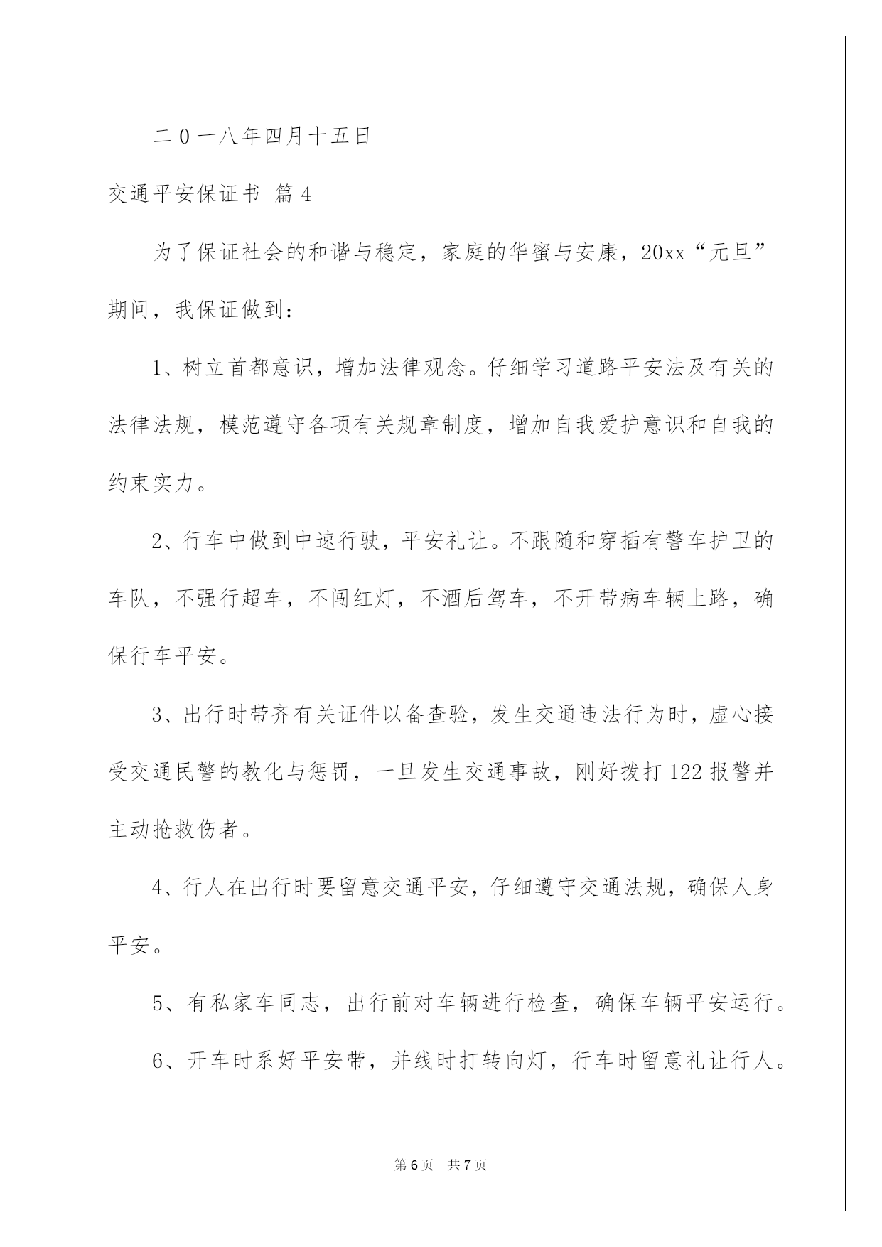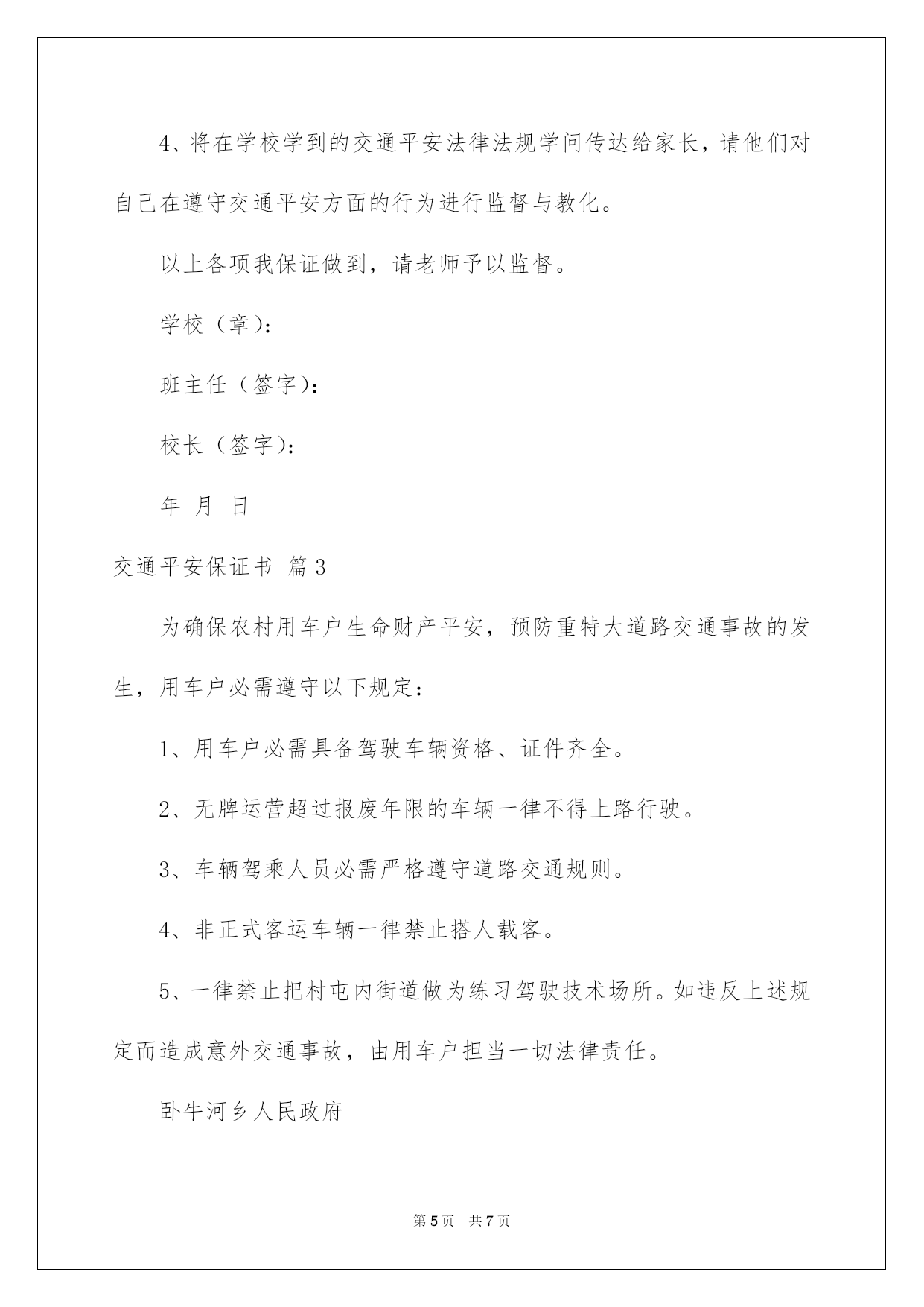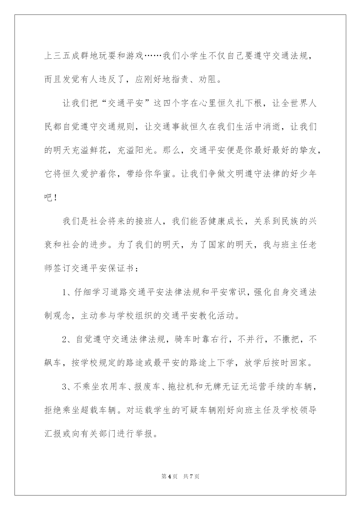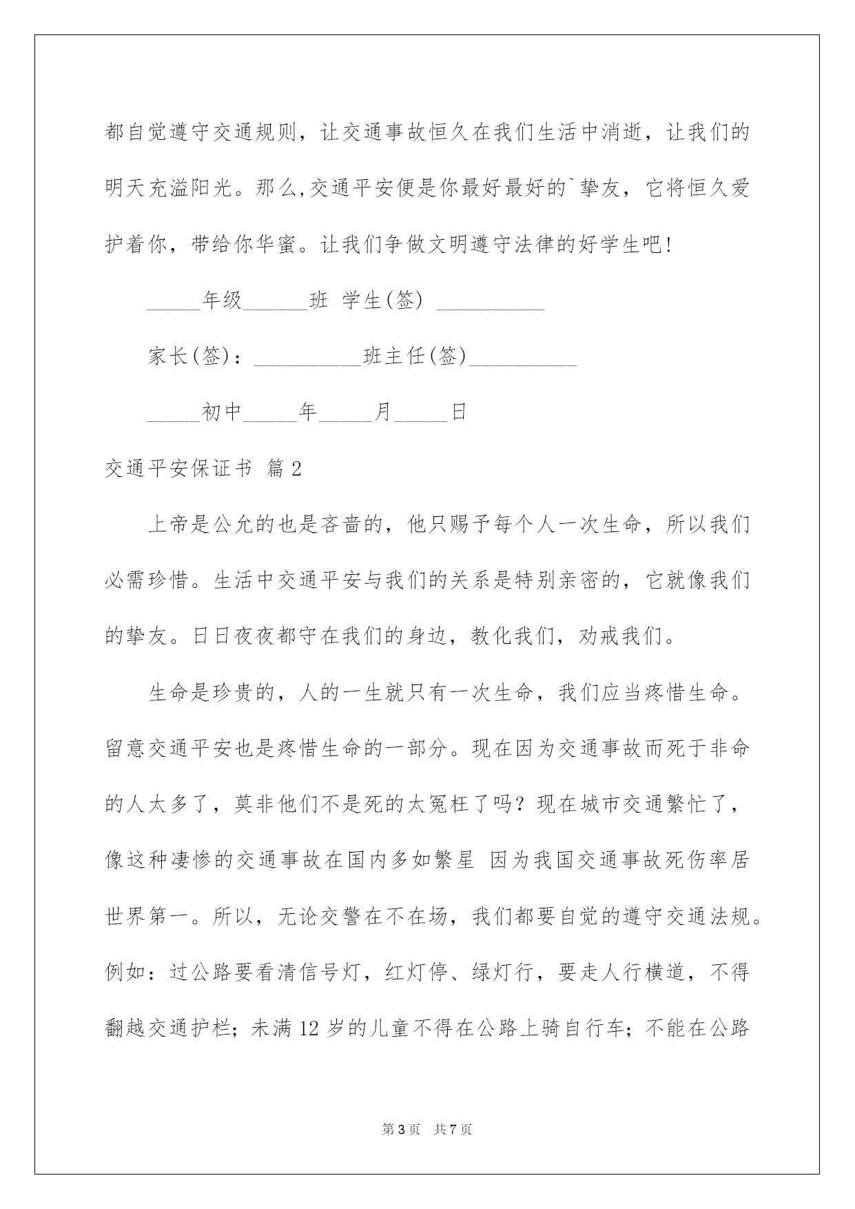 第PAGE\*Arabic\*MERGEFORMAT7页共NUMPAGES\*Arabic\*MERGEFORMAT7页第PAGE\*MERGEFORMAT7页共NUMPAGES\*MERGEFORMAT7页第PAGE\*MERGEFORMAT7页共NUMPAGES\*MERGEFORMAT7页第PAGE\*MERGEFORMAT7页共NUMPAGES\*MERGEFORMAT7页第PAGE\*MERGEFORMAT7页共NUMPAGES\*MERGEFORMAT7页第PAGE\*MERGEFORMAT7页共NUMPAGES\*MERGEFORMAT7页第PAGE\*MERGEFORMAT7页共NUMPAGES\*MERGEFORMAT7页第PAGE\*MERGEFORMAT7页共NUMPAGES\*MERGEFORMAT7页第PAGE\*MERGEFORMAT7页共NUMPAGES\*MERGEFORMAT7页第PAGE\*MERGEFORMAT7页共NUMPAGES\*MERGEFORMAT7页第PAGE\*MERGEFORMAT7页共NUMPAGES\*MERGEFORMAT7页2022交通安全保证书好用的交通平安保证书4篇在当下社会,接触并运用保证书的人越来越多,有效的保证书只能基于自己有权处分的物进行处分,不能因此侵扰他人的合法利益。你还在对写保证书感到一筹莫展吗?以下是我为大家整理的交通平安保证书4篇,欢迎大家借鉴与参考,希望对大家有所帮助。交通平安保证书篇1为仔细贯切落实诸城市教化局和中心校对学校交通平安工作的要求,推动平安校内创建工作深化开展,努力营造平安、稳定、和谐的育人环境。_____初中学生、家长签订交通平安保证书,详细内容如下:1、家长要仔细教化孩子,自觉遵守交通法规,养成良好的行为习惯.不在马路上踢球、游玩、戏闹。放学途中不准购物、串门、并排走,时时到处留意交通平安。2、教化孩子乘车时要遵守秩序,留意乘车平安。仔细学习道路交通平安法律法规和平安常识,强化自身交通法制观念,主动参与学校组织的交通平安教化活动。3、家长作为孩子的第一监护人,必需保证孩子不乘坐农用车、报废车、拖拉机和无牌、无证或不合手续的报废车及个别家长私自组织的无运营手续的违规车辆。4、家长要教化孩子文明乘车,不拥挤,不抢座,不打架,自觉遵守乘车纪律,确保乘车期间的人身平安。拒绝乘坐超载车辆。对运载学生的可疑车辆刚好向班主任及学校领导汇报或向有关部门进行举报。5、家长要督促孩子准时上学,学生不能乘车,但有条件的家长可亲自接送,学校严禁学生独自骑自行车上学。假如家长违反学校规定,纵容学生违纪、独自骑自行车上学,那么发生的一切问题均有家长负责。6、自觉遵守交通法律法规,骑车时靠右行,不并行,不撒把,不飙车,按学校规定的路途或最平安的路途上下学,放学后按时回家。7、家长有权监督司机,使其驾车时不饮酒、不违章、不超员,保证为学生创设一个平安、良好的乘车环境,消退一切担心全因素,对违纪的司机,家长有权向有关部门和单位举报。让我们把“交通平安”这四个在心里恒久扎下根,让我们每个人都自觉遵守交通规则,让交通事故恒久在我们生活中消逝,让我们的明天充溢阳光。那么,交通平安便是你最好最好的`挚友,它将恒久爱护着你,带给你华蜜。让我们争做文明遵守法律的好学生吧!_____年级______班学生(签)__________家长(签):__________班主任(签)_______________初中_____年_____月_____日交通平安保证书篇2上帝是公允的也是吝啬的,他只赐予每个人一次生命,所以我们必需珍惜。生活中交通平安与我们的关系是特别亲密的,它就像我们的挚友。日日夜夜都守在我们的身边,教化我们,劝戒我们。生命是珍贵的,人的一生就只有一次生命,我们应当疼惜生命。留意交通平安也是疼惜生命的一部分。现在因为交通事故而死于非命的人太多了,莫非他们不是死的太冤枉了吗?现在城市交通繁忙了,像这种凄惨的交通事故在国内多如繁星因为我国交通事故死伤率居世界第一。所以,无论交警在不在场,我们都要自觉的遵守交通法规。例如:过公路要看清信号灯,红灯停、绿灯行,要走人行横道,不得翻越交通护栏;未满12岁的儿童不得在公路上骑自行车;不能在公路上三五成群地玩耍和游戏……我们小学生不仅自己要遵守交通法规,而且发觉有人违反了,应刚好地指责、劝阻。让我们把“交通平安”这四个字在心里恒久扎下根,让全世界人民都自觉遵守交通规则,让交通事故恒久在我们生活中消逝,让我们的明天充溢鲜花,充溢阳光。那么,交通平安便是你最好最好的挚友,它将恒久