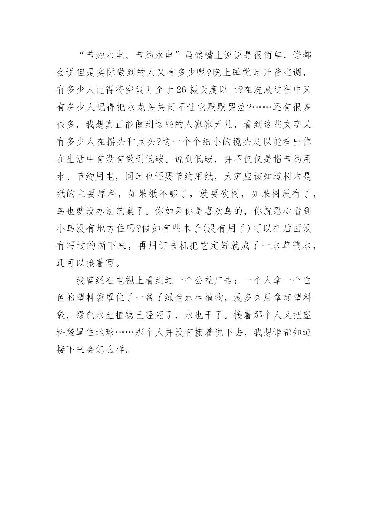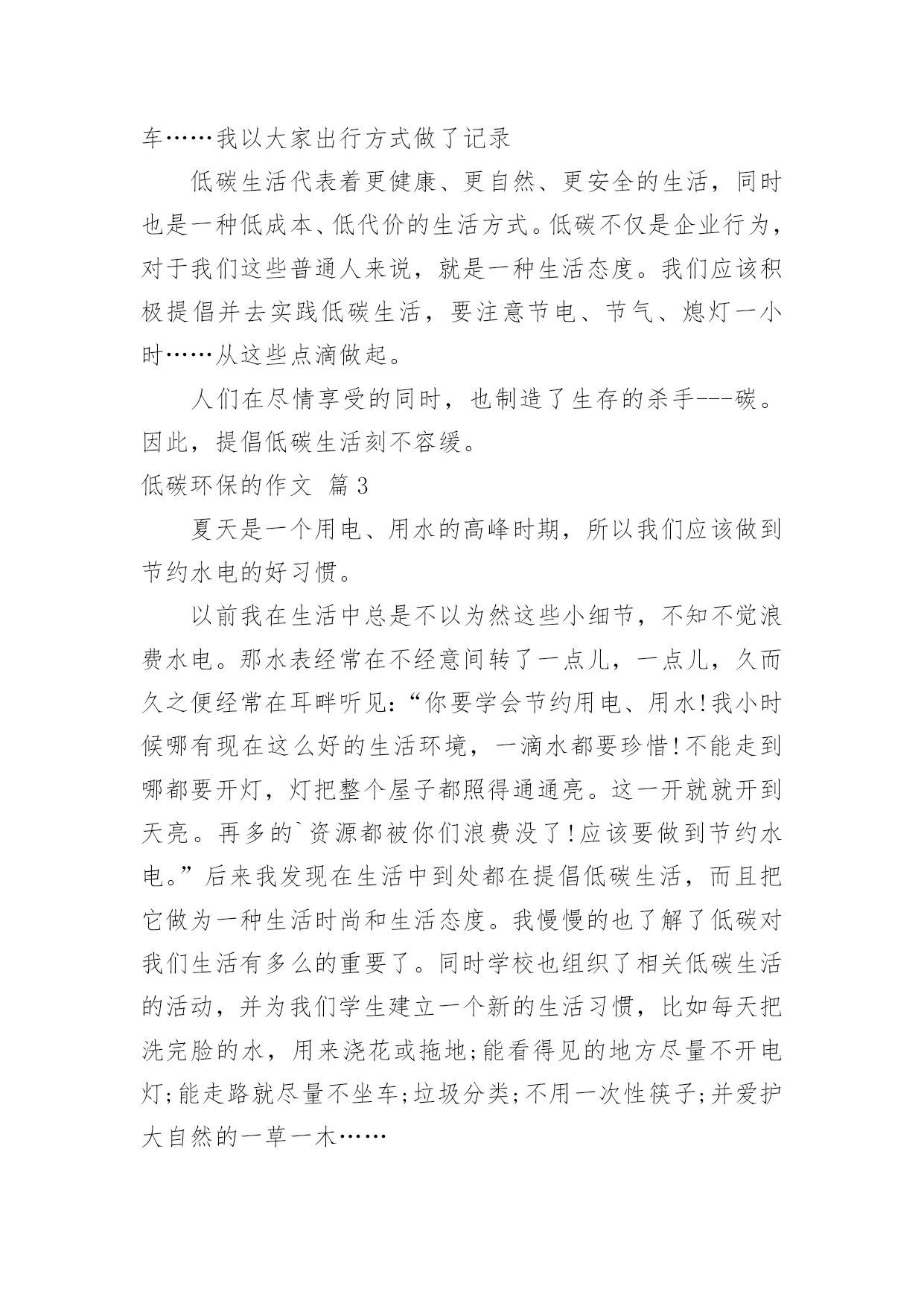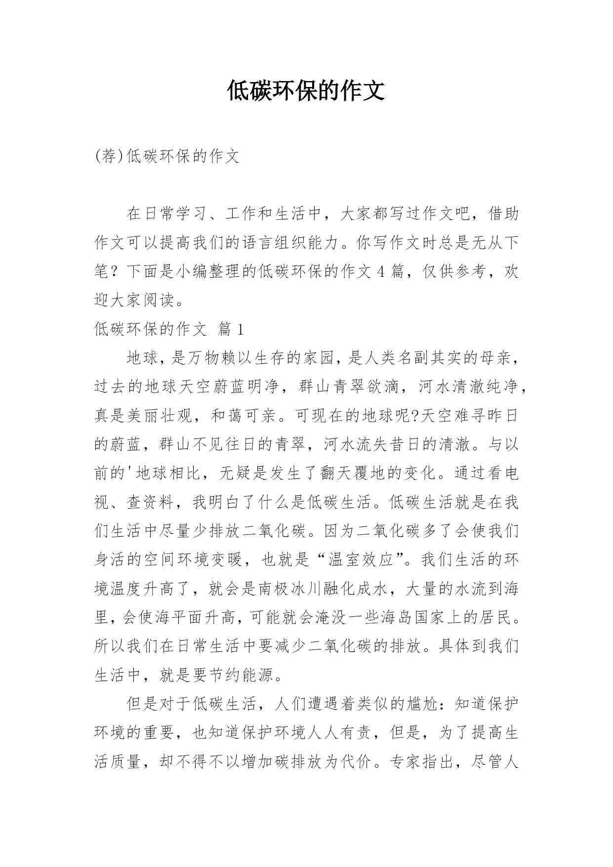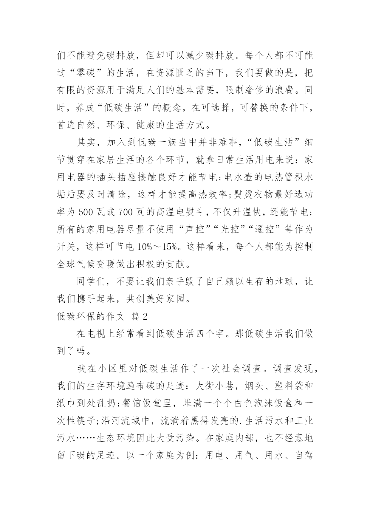 低碳环保的作文(荐)低碳环保的作文在日常学习、工作和生活中,大家都写过作文吧,借助作文可以提高我们的语言组织能力。你写作文时总是无从下笔?下面是小编整理的低碳环保的作文4篇,仅供参考,欢迎大家阅读。低碳环保的作文篇1地球,是万物赖以生存的家园,是人类名副其实的母亲,过去的地球天空蔚蓝明净,群山青翠欲滴,河水清澈纯净,真是美丽壮观,和蔼可亲。可现在的地球呢?天空难寻昨日的蔚蓝,群山不见往日的青翠,河水流失昔日的清澈。与以前的'地球相比,无疑是发生了翻天覆地的变化。通过看电视、查资料,我明白了什么是低碳生活。低碳生活就是在我们生活中尽量少排放二氧化碳。因为二氧化碳多了会使我们身活的空间环境变暖,也就是“温室效应”。我们生活的环境温度升高了,就会是南极冰川融化成水,大量的水流到海里,会使海平面升高,可能就会淹没一些海岛国家上的居民。所以我们在日常生活中要减少二氧化碳的排放。具体到我们生活中,就是要节约能源。但是对于低碳生活,人们遭遇着类似的尴尬:知道保护环境的重要,也知道保护环境人人有责,但是,为了提高生活质量,却不得不以增加碳排放为代价。专家指出,尽管人们不能避免碳排放,但却可以减少碳排放。每个人都不可能过“零碳”的生活,在资源匮乏的当下,我们要做的是,把有限的资源用于满足人们的基本需要,限制奢侈的浪费。同时,养成“低碳生活”的概念,在可选择,可替换的条件下,首选自然、环保、健康的生活方式。其实,加入到低碳一族当中并非难事,“低碳生活”细节贯穿在家居生活的各个环节,就拿日常生活用电来说:家用电器的插头插座接触良好才能节电;电水壶的电热管积水垢后要及时清除,这样才能提高热效率;熨烫衣物最好选功率为500瓦或700瓦的高温电熨斗,不仅升温快,还能节电;所有的家用电器尽量不使用“声控”“光控”“遥控”等作为开关,这样可节电10%~15%。这样看来,每个人都能为控制全球气候变暖做出积极的贡献。同学们,不要让我们亲手毁了自己赖以生存的地球,让我们携手起来,共创美好家园。低碳环保的作文篇2在电视上经常看到低碳生活四个字。那低碳生活我们做到了吗。我在小区里对低碳生活作了一次社会调查。调查发现,我们的生存环境遍布碳的足迹:大街小巷,烟头、塑料袋和纸巾到处乱扔;餐馆饭堂里,堆满一个个白色泡沫饭盒和一次性筷子;沿河流域中,流淌着黑得发亮的.生活污水和工业污水……生态环境因此大受污染。在家庭内部,也不经意地留下碳的足迹。以一个家庭为例:用电、用气、用水、自驾车……我以大家出行方式做了记录低碳生活代表着更健康、更自然、更安全的生活,同时也是一种低成本、低代价的生活方式。低碳不仅是企业行为,对于我们这些普通人来说,就是一种生活态度。我们应该积极提倡并去实践低碳生活,要注意节电、节气、熄灯一小时……从这些点滴做起。人们在尽情享受的同时,也制造了生存的杀手---碳。因此,提倡低碳生活刻不容缓。低碳环保的作文篇3夏天是一个用电、用水的高峰时期,所以我们应该做到节约水电的好习惯。以前我在生活中总是不以为然这些小细节,不知不觉浪费水电。那水表经常在不经意间转了一点儿,一点儿,久而久之便经常在耳畔听见:“你要学会节约用电、用水!我小时候哪有现在这么好的生活环境,一滴水都要珍惜!不能走到哪都要开灯,灯把整个屋子都照得通通亮。这一开就就开到天亮。再多的`资源都被你们浪费没了!应该要做到节约水电。”后来我发现在生活中到处都在提倡低碳生活,而且把它做为一种生活时尚和生活态度。我慢慢的也了解了低碳对我们生活有多么的重要了。同时学校也组织了相关低碳生活的活动,并为我们学生建立一个新的生活习惯,比如每天把洗完脸的水,用来浇花或拖地;能看得见的地方尽量不开电灯;能走路就尽量不坐车;垃圾分类;不用一次性筷子;并爱护大自然的一草一木……“节约水电、节约水电”虽然嘴上说说是很简单,谁都会说但是实际做到的人又有多少呢?晚上睡觉时开着空调,有多少人记得将空调开至于26摄氏度以上?在洗漱过程中又有多少人记得把水龙头关闭不让它默默哭泣?……还有很多很多,我想真正能做到这些的人寥寥无几,看到这些文字又有多少人在摇头和点头?这一个个细小的镜头足以能看出你在生活中有没有做到低碳。说到低碳,并不仅仅是指节约用水、节约用电,同时也还要节约用纸,大家应该知道树木是纸的主要原料,如果纸不够了,就要砍树,如果树没有了,鸟也就没办法筑巢了。你如果你是喜欢鸟的,你就忍心看到小鸟没有地方住吗?假如有些本子(没有用了)可以把后面没有写过的撕下来,再用订书机把它定好就成了一本草稿本,还可以接着写。我曾经在电视上看到过一个公益广告:一个人拿一个白色的塑料袋罩住了一盆了绿色水生植物,没多久后拿起塑料袋,绿色水生植物已经死了,水也干了。接着那个人又把塑料袋罩住地球……那个人并没有接着说下去,我想谁都知道接下来会怎么样。