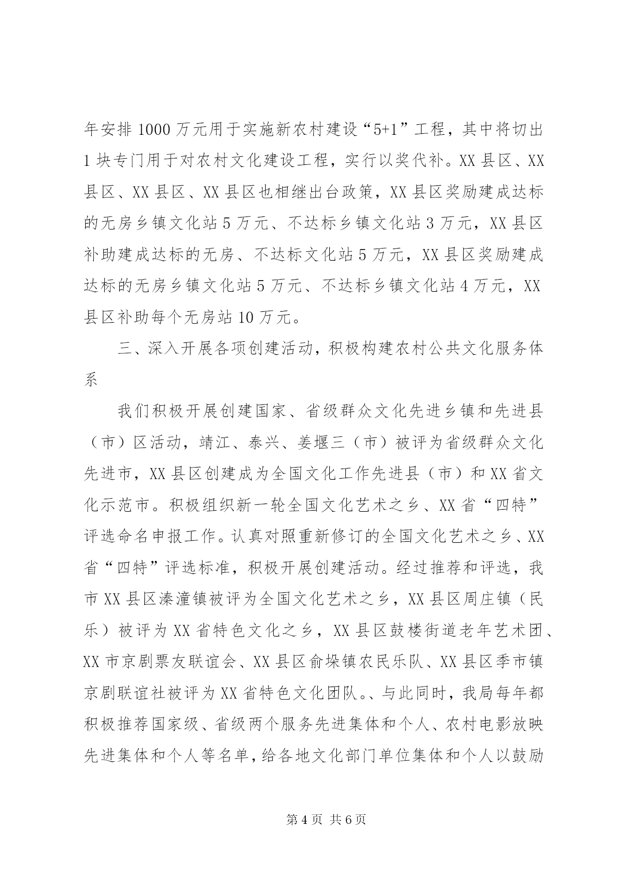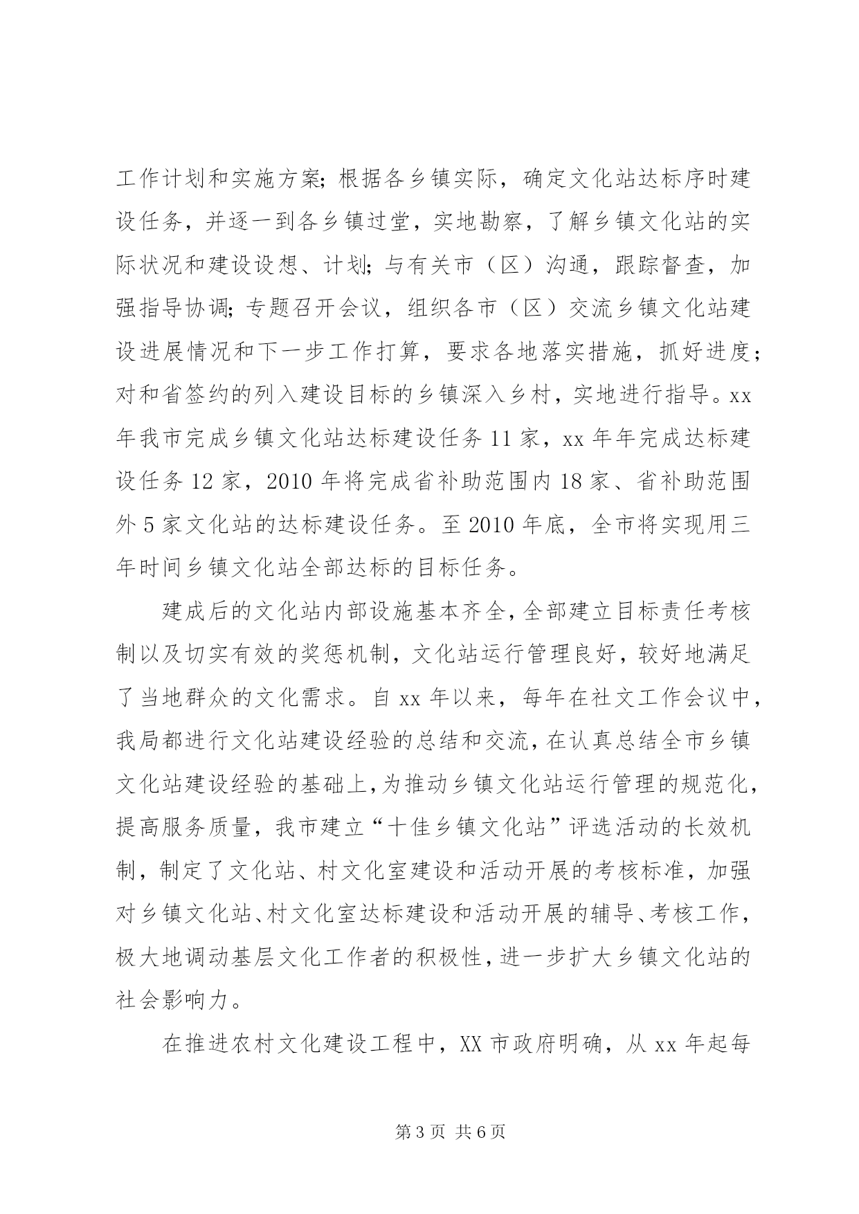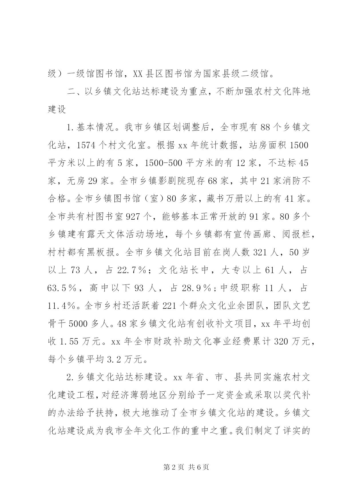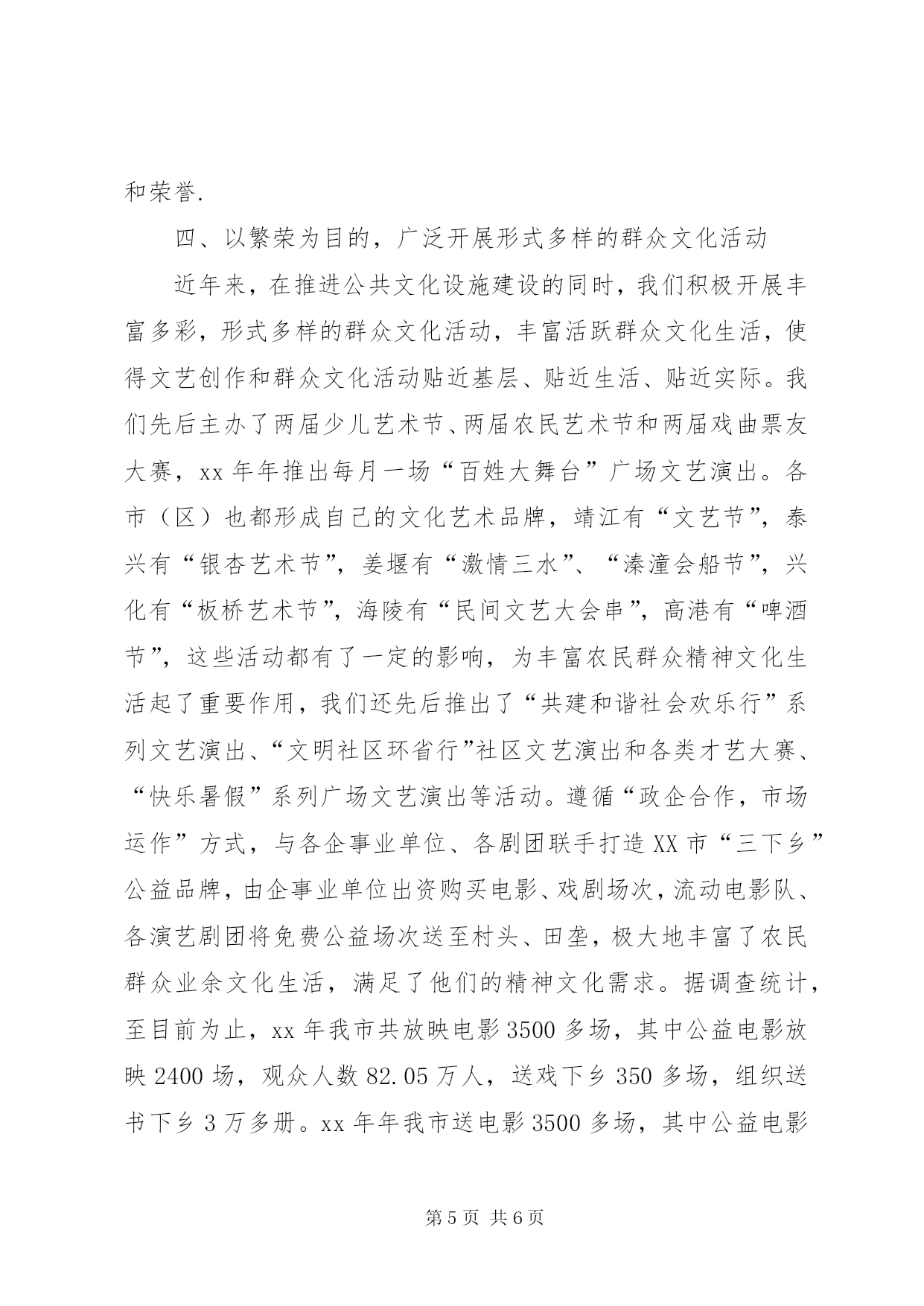 第PAGE\*Arabic\*MERGEFORMAT6页共NUMPAGES\*MERGEFORMAT6页市公共文化设施建设有关情况的汇报近年来,随着新泰州建设步伐的加快,为了满足人民群众日益增长的精神文化需求,XX市各级政府加大投入,全市公共文化设施建设稳步推进。按照调研考察的内容提纲,结合文化主管部门的工作职能,现将我市公共文化设施建设的有关情况简要汇报如下:一、加大政府投入,努力推进市、县两馆建设抓住国家公共图书馆、文化馆评估定级等契机,积极争取政府投入,通过新建、置换等方式,全市两馆建设迈上新台阶。(一)文化馆建设情况我市所属四市两区文化馆,其中XX县区、XX县区、XX县区、XX县区均达到国家一级馆标准,XX县区文化中心新馆xx年年建成已经正式对外开放;XX县区文化馆新馆也已经进入内部设计,但是新馆面积没有达到国家一级馆的要求;市文化馆硬件条件达不到国家文化馆评估定级三级馆的必备要求,但新馆建设已列入了市文化中心建设工程,整个工程已经动工在建。(二)公共图书馆建设情况XX市图书馆现馆建于1994年12月,1996年上划为地级市图书馆。XX市图书馆软件完全可以达到国家一级馆的要求,但是由于面积不达标,因此目前勉强定级为国家二级馆。我市尚没有独立的少儿图书馆。XX县区、XX县区、XX县区均为国家(县级)一级馆图书馆,XX县区图书馆为国家县级二级馆。二、以乡镇文化站达标建设为重点,不断加强农村文化阵地建设1.基本情况。我市乡镇区划调整后,全市现有88个乡镇文化站,1574个村文化室。根据xx年统计数据,站房面积1500平方米以上的有5家,1500-500平方米的有12家,不达标45家,无房29家。全市乡镇影剧院现存68家,其中21家消防不合格。全市乡镇图书馆(室)80多家,藏书万册以上的有41家。全市共有村图书室927个,能够基本正常开放的91家。80多个乡镇建有露天文体活动场地,每个乡镇都有宣传画廊、阅报栏,村村都有黑板报。全市乡镇文化站目前在岗人数321人,50岁以上73人,占22.7%;文化站长中,大专以上61人,占63.5%,高中以下93人,占28.9%;中级职称11人,占11.4%。全市乡村还活跃着221个群众文化业余团队,团队文艺骨干5000多人。48家乡镇文化站有创收补文项目,xx年平均创收1.55万元。xx年全市财政补助文化事业经费累计320万元,每个乡镇平均3.2万元。2.乡镇文化站达标建设。xx年省、市、县共同实施农村文化建设工程,对经济薄弱地区分别给予一定资金或采取以奖代补的办法给予扶持,极大地推动了全市乡镇文化站的建设。乡镇文化站建设成为我市全年文化工作的重中之重。我们制定了详实的工作计划和实施方案;根据各乡镇实际,确定文化站达标序时建设任务,并逐一到各乡镇过堂,实地勘察,了解乡镇文化站的实际状况和建设设想、计划;与有关市(区)沟通,跟踪督查,加强指导协调;专题召开会议,组织各市(区)交流乡镇文化站建设进展情况和下一步工作打算,要求各地落实措施,抓好进度;对和省签约的列入建设目标的乡镇深入乡村,实地进行指导。xx年我市完成乡镇文化站达标建设任务11家,xx年年完成达标建设任务12家,2010年将完成省补助范围内18家、省补助范围外5家文化站的达标建设任务。至2010年底,全市将实现用三年时间乡镇文化站全部达标的目标任务。建成后的文化站内部设施基本齐全,全部建立目标责任考核制以及切实有效的奖惩机制,文化站运行管理良好,较好地满足了当地群众的文化需求。自xx年以来,每年在社文工作会议中,我局都进行文化站建设经验的总结和交流,在认真总结全市乡镇文化站建设经验的基础上,为推动乡镇文化站运行管理的规范化,提高服务质量,我市建立“十佳乡镇文化站”评选活动的长效机制,制定了文化站、村文化室建设和活动开展的考核标准,加强对乡镇文化站、村文化室达标建设和活动开展的辅导、考核工作,极大地调动基层文化工作者的积极性,进一步扩大乡镇文化站的社会影响力。在推进农村文化建设工程中,XX市政府明确,从xx年起每年安排1000万元用于实施新农村建设“5+1”工程,其中将切出1块专门用于对农村文化建设工程,实行以奖代补。XX县区、XX县区、XX县区、XX县区也相继出台政策,XX县区奖励建成达标的无房乡镇文化站5万元、不达标乡镇文化站3万元,XX县区补助建成达标的无房、不达标文化站5万元,XX县区奖励建成达标的无房乡镇文化站5万元、不达标乡镇文化站4万元,XX县区补助每个无房站10万元。三、深入开展各项创建活动,积极构建农村公共文化服务体系我们积极开展创建国家、省级群众文化先进乡镇和先进县(市)区活动,靖江、泰兴、姜堰三(市)被评为省级群众文化先进市,XX县区创建成为全国文化工作先进县(市)和XX省文化示范市。积