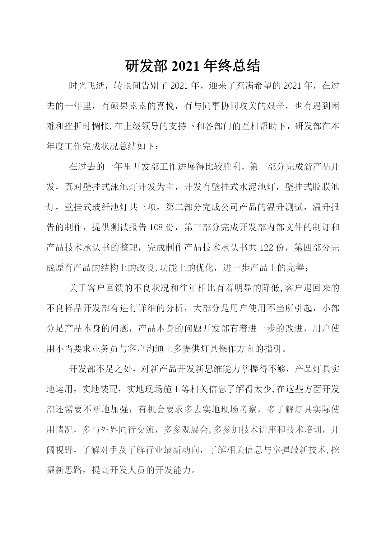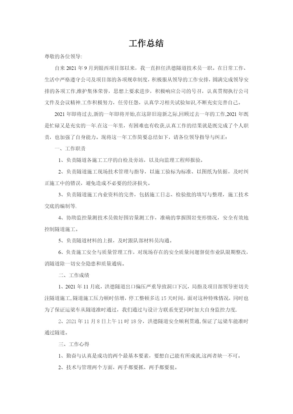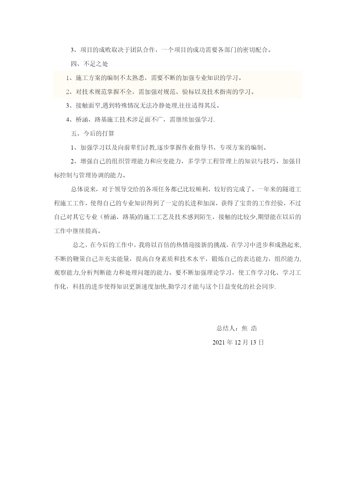隧道技术2017年年度工作总结实用文档(实用文档,可以直接使用,可编辑优秀版资料,欢迎下载)工作总结尊敬的各位领导:自来2021年9月到银西项目部以来,我一直担任洪德隧道技术员一职。在日常工作、生活中严格遵守公司及项目部的各项规章制度,积极服从领导的工作安排,圆满完成领导安排的各项工作,维护集体荣誉,思想上要求进步,积极响应公司的号召,认真贯彻执行公司文件及会议精神.工作积极努力,任劳任怨,认真学习相关试验知识,不断充实完善自己。2021年即将过去,新的一年即将开始,在这辞旧迎新之际,回顾过去一年的工作,2021年既是忙碌又是充实的一年.在这一年里,有困难也有收获,认真工作的结果就是既完成了个人职责,也加强了自身能力。现将这一年工作简要总结如下,请各位领导指导与纠正:一、工作职责1、负责隧道各施工工序的自检及旁站,以及向监理工程师报验。2、负责隧道施工现场技术管理与指导,以施工验标为标准、以图纸为依据,及时纠正施工中的错误,避免造成不必要的经济损失。3、负责隧道施工内业资料的完善,包括施工日志、检验批的填写与整理,施工技术交底的编制等.4、协助监控量测技术员做好围岩量测工作,准确的掌握围岩变形情况,安全有效地控制隧道施工。5、负责隧道材料的上报,及时跟队部材料员沟通。6、负责施工安全与质量管理工作,对现场存在的安全质量问题督促作业队限期整改,消隧道除一切安全隐患和质量通病。二、工作成绩1、2021年11月底,洪德隧道出口偏压严重导致洞口下沉,局指及项目部领导密切关注隧道施工,隧道施工压力顿时倍增,停工整顿多达15天时间,面对这种特殊情况,同时也为了保证运梁车从隧道准时通过,我们通过与设计方联系变更同时加大自身监控力度.2、2021年11月8日上午11时18分,洪德隧道安全顺利贯通,保证了运梁车能准时通过隧道。三、工作心得1、勤奋与认真是成功的两个最基本要素,要想自己能有所成就,这两者缺一不可。2、技术与管理两个方面,两手都要抓、两手都要狠。3、项目的成败取决于团队合作,一个项目的成功需要各部门的密切配合。四、不足之处1、施工方案的编制不太熟悉,需要不断的加强专业知识的学习。2、对技术规范掌握不全,需加强对规范、验标以及技术指南的学习。3、接触面窄,遇到特殊情况无法冷静处理,往往适得其反。4、桥涵、路基施工技术涉足面不广,需继续加强学习.五、今后的打算1、加强学习以及向前辈们讨教,逐步掌握作业指导书、专项方案的编制。2、增强自己的组织管理能力和应变能力,多学学工程管理上的知识与技巧,加强目标控制与管理协调的能力。总体说来,对于领导交给的各项任务都已比较顺利、较好的完成了。一年来的隧道工程施工工作,使得自己的专业知识得到了一定的长进和加深,获得了宝贵的工作经验,不过自己对其它专业(桥涵、路基)的施工工艺及技术感到陌生,接触的比较少,期望能在以后的工作中继续提高。总之,在今后的工作中,我将以百倍的热情迎接新的挑战,在学习中进步和成熟起来,不断的鞭策自己并充实能量,提高自身素质和技术水平,锻炼自己的表达能力,组织能力,观察能力,分析判断能力和处理问题的能力。要不断加强理论学习,使工作学习化、学习工作化,科技的进步使得知识更新速度加快,勤学习才能与这个日益变化的社会同步.总结人:焦浩2021年12月13日研发部2021年终总结时光飞逝,转眼间告别了2021年,迎来了充满希望的2021年,在过去的一年里,有硕果累累的喜悦,有与同事协同攻关的艰辛,也有遇到困难和挫折时惆怅,在上级领导的支持下和各部门的互相帮助下,研发部在本年度工作完成状况总结如下:在过去的一年里开发部工作进展得比较胜利,第一部分完成新产品开发,真对壁挂式泳池灯开发为主,开发有壁挂式水泥池灯,壁挂式胶膜池灯,壁挂式玻纤池灯共三项,第二部分完成公司产品的温升测试,温升报告的制作,提供测试报告108份,第三部分完成开发部内部文件的制订和产品技术承认书的整理,完成制作产品技术承认书共122份,第四部分完成原有产品的结构上的改良,功能上的优化,进一步产品上的完善;关于客户回馈的不良状况和往年相比有着明显的降低,客户退回来的不良样品开发部有进行详细的分析,大部分是用户使用不当所引起,小部分是产品本身的问题,产品本身的问题开发部有着进一步的改进,用户使用不当要求业务员与客户沟通上多提供灯具操作方面的指引。开发部不足之处,对新产品开发新思维能力掌握得不够,产品灯具实地运用,实地装配,实地现场施工等相关信息了解得太少,在这些方面开发部还需要不断地加强,有机会要求多去实地现场考察,多了解灯具实际使用情况,多与外界同行交流,多参观展会,多参加技术讲座和技术培训,开阔视野,了解对手及了解行业最新动向,了解相关信息与掌握最新技