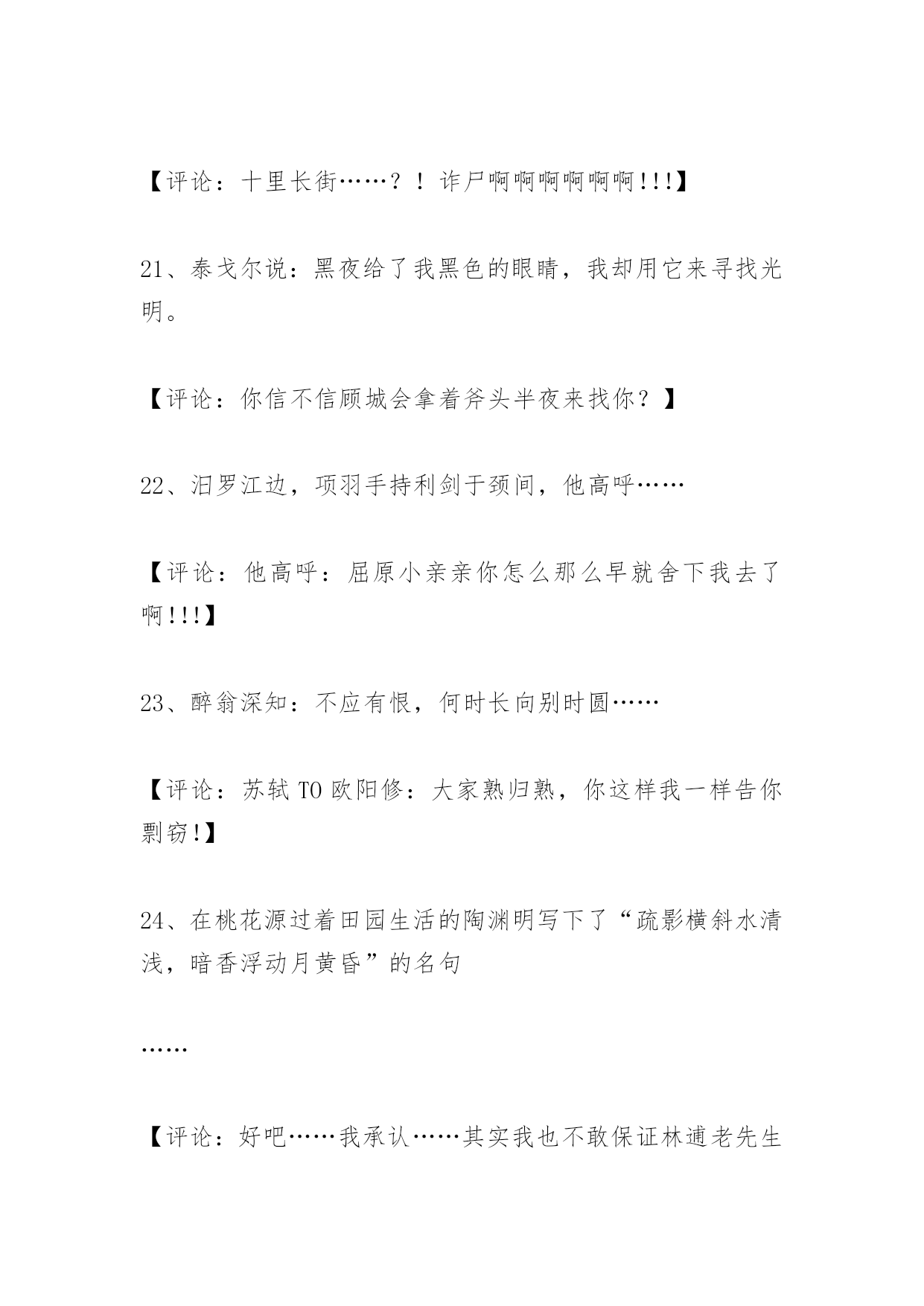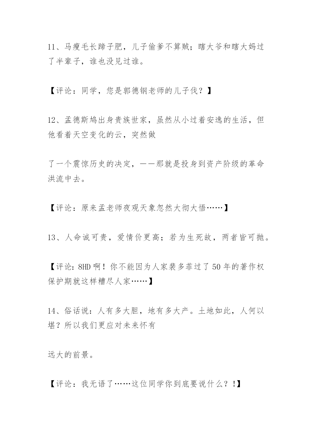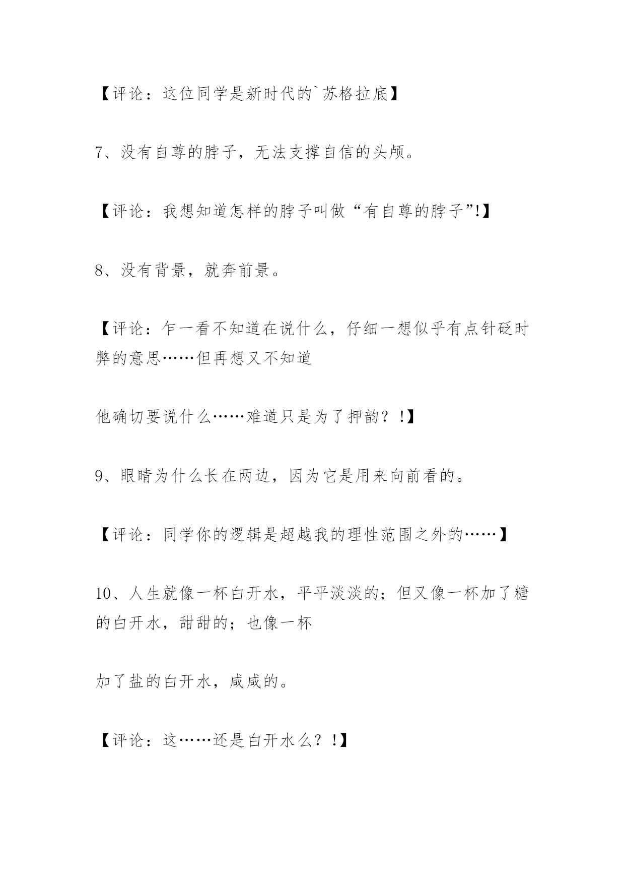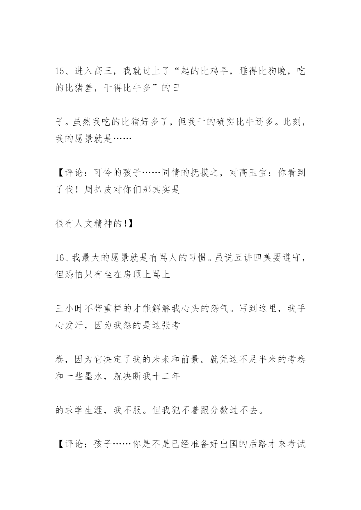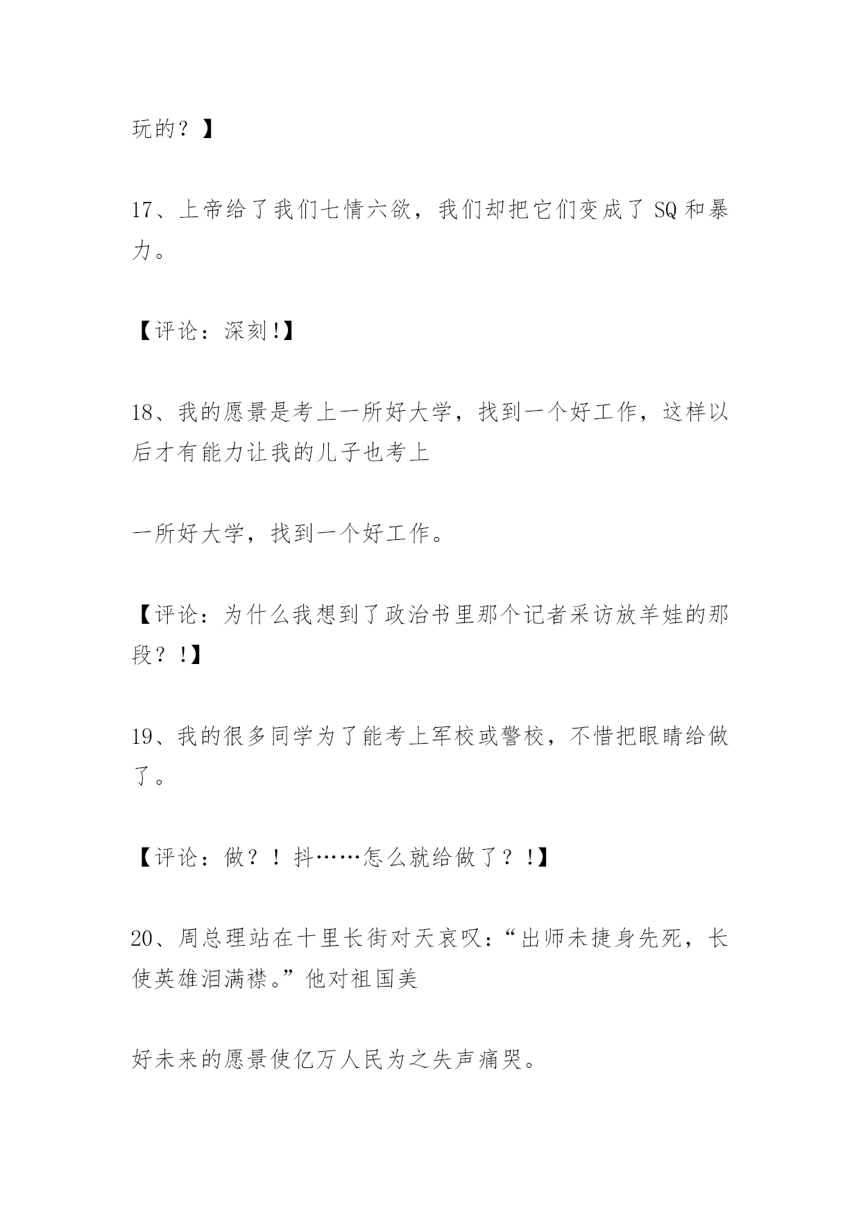 高考作文经典语句高考作文经典语句2、我的爸爸就像亲人一样爱我。【评论:敢情您老是您爸爸从垃圾箱里捡来的?】3、太阳离我们越来越近,像一个金黄的油饼。【评论:这位同学……你是木吃早饭就来考试的是伐?可怜的~~MOMO】4、周总理的愿望是国家的富强独立,在他心里只有四个大字:为人民服务!【评论:也许你的语文老师能容忍你,但你的数学老师不会原谅你!】5、我希望有一条健康的双腿,一个智慧的大脑,……【评论:同4】6、有一种自卑叫自信,有一种跌倒叫爬起。【评论:这位同学是新时代的`苏格拉底】7、没有自尊的脖子,无法支撑自信的头颅。【评论:我想知道怎样的脖子叫做“有自尊的脖子”!】8、没有背景,就奔前景。【评论:乍一看不知道在说什么,仔细一想似乎有点针砭时弊的意思……但再想又不知道他确切要说什么……难道只是为了押韵?!】9、眼睛为什么长在两边,因为它是用来向前看的。【评论:同学你的逻辑是超越我的理性范围之外的……】10、人生就像一杯白开水,平平淡淡的;但又像一杯加了糖的白开水,甜甜的;也像一杯加了盐的白开水,咸咸的。【评论:这……还是白开水么?!】11、马瘦毛长蹄子肥,儿子偷爹不算贼;瞎大爷和瞎大妈过了半辈子,谁也没见过谁。【评论:同学,您是郭德钢老师的儿子伐?】12、孟德斯鸠出身贵族世家,虽然从小过着安逸的生活,但他看着天空变化的云,突然做了一个震惊历史的决定,――那就是投身到资产阶级的革命洪流中去。【评论:原来孟老师夜观天象忽然大彻大悟……】13、人命诚可贵,爱情价更高;若为生死故,两者皆可抛。【评论:8HD啊!你不能因为人家裴多菲过了50年的著作权保护期就这样糟尽人家……】14、俗话说:人有多大胆,地有多大产。土地如此,人何以堪?所以我们更应对未来怀有远大的前景。【评论:我无语了……这位同学你到底要说什么?!】15、进入高三,我就过上了“起的比鸡早,睡得比狗晚,吃的比猪差,干得比牛多”的日子。虽然我吃的比猪好多了,但我干的确实比牛还多。此刻,我的愿景就是……【评论:可怜的孩子……同情的抚摸之,对高玉宝:你看到了伐!周扒皮对你们那其实是很有人文精神的!】16、我最大的愿景就是有骂人的习惯。虽说五讲四美要遵守,但恐怕只有坐在房顶上骂上三小时不带重样的才能解解我心头的怨气。写到这里,我手心发汗,因为我怨的是这张考卷,因为它决定了我的未来和前景。就凭这不足半米的考卷和一些墨水,就决断我十二年的求学生涯,我不服。但我犯不着跟分数过不去。【评论:孩子……你是不是已经准备好出国的后路才来考试玩的?】17、上帝给了我们七情六欲,我们却把它们变成了SQ和暴力。【评论:深刻!】18、我的愿景是考上一所好大学,找到一个好工作,这样以后才有能力让我的儿子也考上一所好大学,找到一个好工作。【评论:为什么我想到了政治书里那个记者采访放羊娃的那段?!】19、我的很多同学为了能考上军校或警校,不惜把眼睛给做了。【评论:做?!抖……怎么就给做了?!】20、周总理站在十里长街对天哀叹:“出师未捷身先死,长使英雄泪满襟。”他对祖国美好未来的愿景使亿万人民为之失声痛哭。【评论:十里长街……?!诈尸啊啊啊啊啊啊!!!】21、泰戈尔说:黑夜给了我黑色的眼睛,我却用它来寻找光明。【评论:你信不信顾城会拿着斧头半夜来找你?】22、汨罗江边,项羽手持利剑于颈间,他高呼……【评论:他高呼:屈原小亲亲你怎么那么早就舍下我去了啊!!!】23、醉翁深知:不应有恨,何时长向别时圆……【评论:苏轼TO欧阳修:大家熟归熟,你这样我一样告你剽窃!】24、在桃花源过着田园生活的陶渊明写下了“疏影横斜水清浅,暗香浮动月黄昏”的名句……【评论:好吧……我承认……其实我也不敢保证林逋老先生就一定不是陶渊明的邻居。】