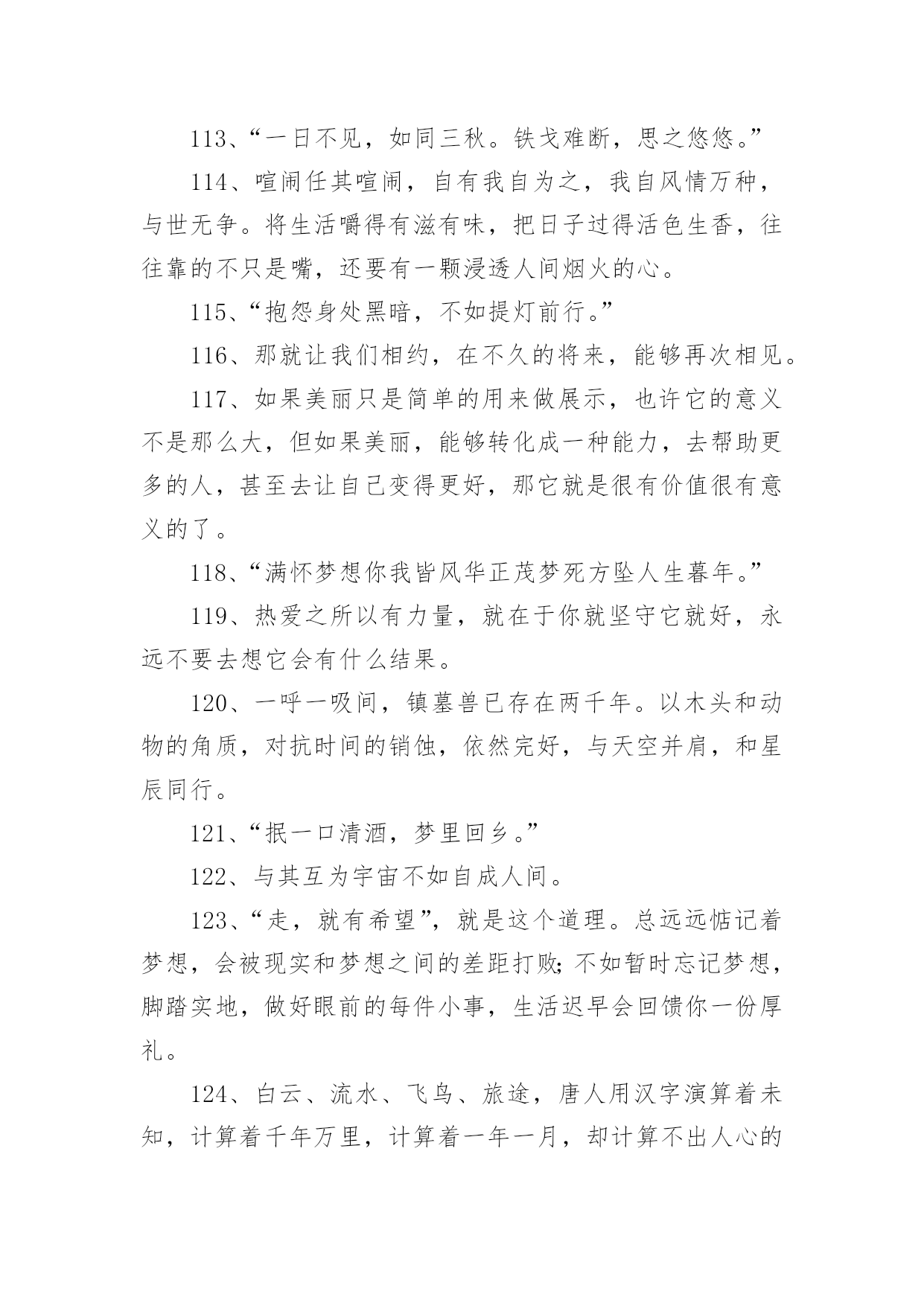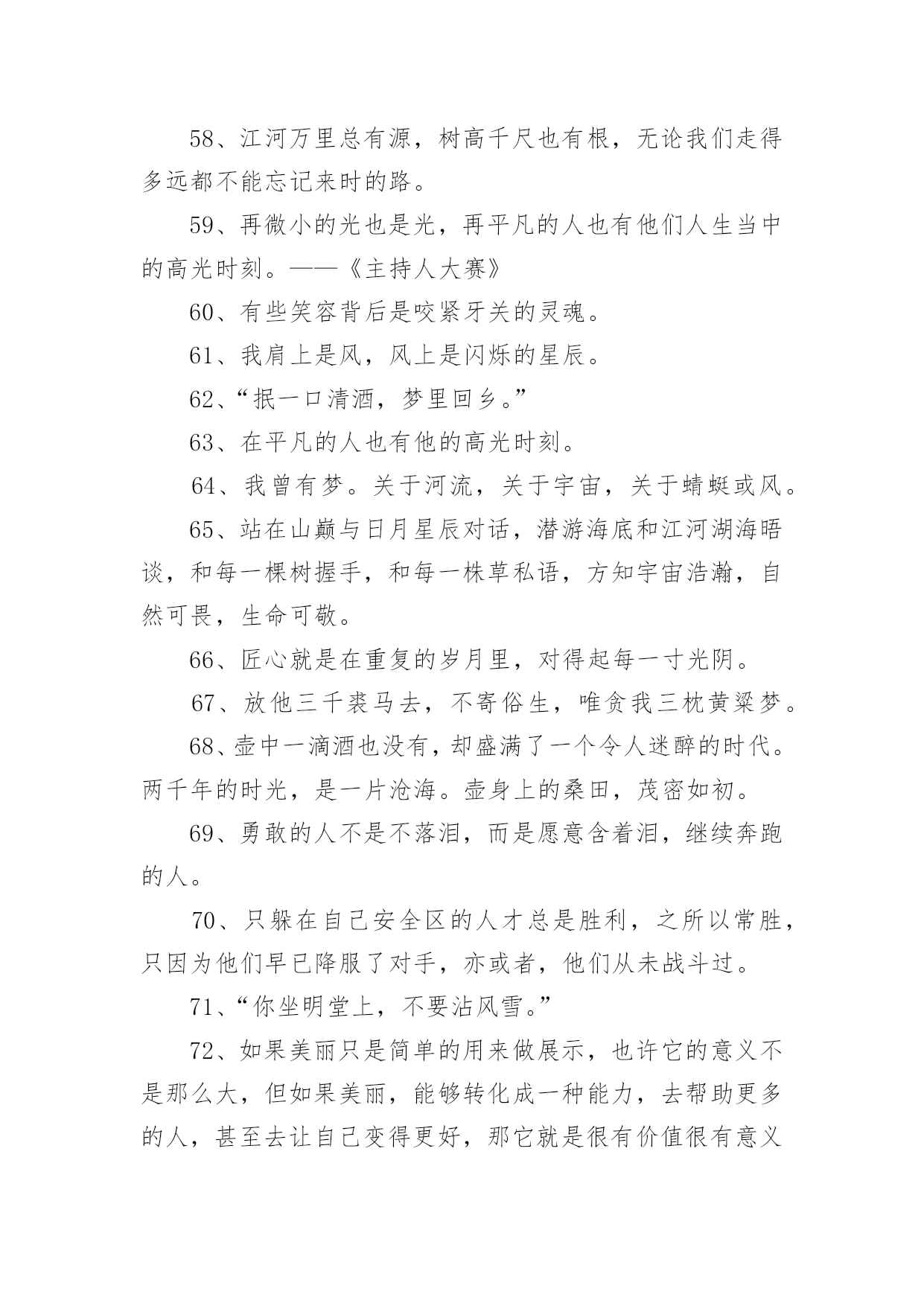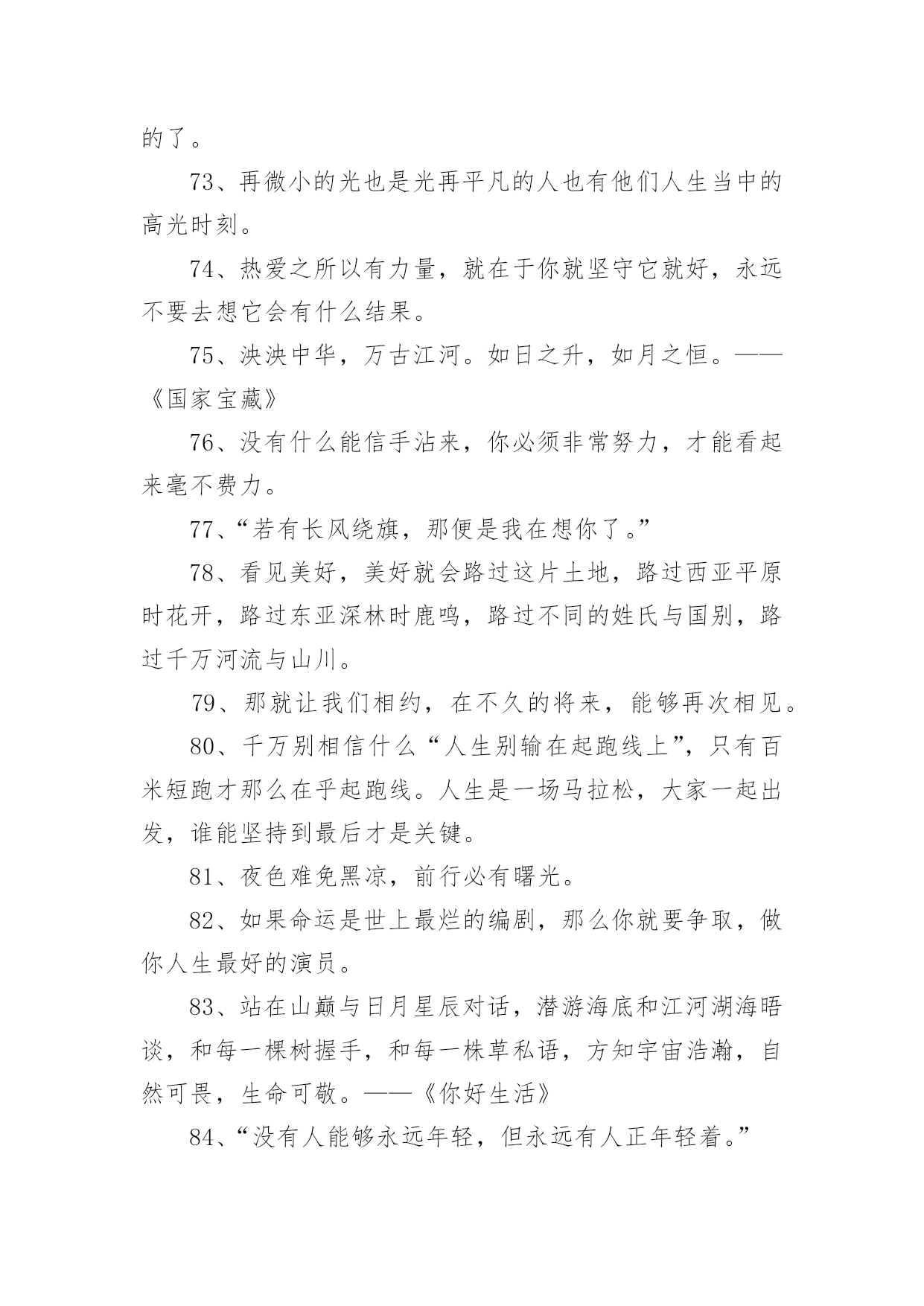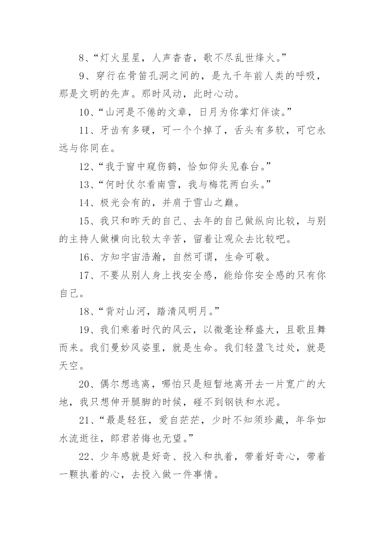 央视惊艳文案不负青春1央视惊艳文案不负青春随着线上的、虚拟的社交的迅猛发展,大家都不可避免地会接触到文案吧,文案用于跟亲朋好友分享个人生活情况。那么你有真正了解过文案吗?下面是小编帮大家整理的央视惊艳文案不负青春,欢迎大家借鉴与参考,希望对大家有所帮助。央视惊艳文案不负青春11、真正有光的人,压的时间越久,深度越深,绽放的光芒才可以越灿烂。2、诗句是天才创造的,但是诗意却是可以属于每一个追求真善美的灵魂。3、我们说“江河万里总有源,树高千尺也有根”无论我们走得多远,我们都不会忘记来时的路,这叫不忘初心,也要坚守自己的初心。4、在这些无数的疤痕中,见到了一个又一个历史的细节,在这些星辰般的碎片里,看到了人类在苦难中前行的脚步,我们哭着降临世界,却可以笑着走向永恒。5、人的潜能其实远超过自己的想象,你不挖掘就永远不会知道!6、“我把冬雪煮一遭,拈花折草,为你熬清宵。”7、“人间天上,看莺莺强如做道场,软玉温香,休道是相亲傍。”8、“灯火星星,人声杳杳,歌不尽乱世烽火。”9、穿行在骨笛孔洞之间的,是九千年前人类的呼吸,那是文明的先声。那时风动,此时心动。10、“山河是不倦的文章,日月为你掌灯伴读。”11、牙齿有多硬,可一个个掉了,舌头有多软,可它永远与你同在。12、“我于窗中窥伤鹤,恰如仰头见春台。”13、“何时仗尔看南雪,我与梅花两白头。”14、极光会有的,并肩于雪山之巅。15、我只和昨天的自己、去年的自己做纵向比较,与别的主持人做横向比较太辛苦,留着让观众去比较吧。16、方知宇宙浩瀚,自然可谓,生命可敬。17、不要从别人身上找安全感,能给你安全感的只有你自己。18、“背对山河,踏清风明月。”19、我们乘着时代的风云,以微毫诠释盛大,且歌且舞而来。我们曼妙风姿里,就是生命。我们轻盈飞过处,就是天空。20、偶尔想逃离,哪怕只是短暂地离开去一片宽广的大地,我只想伸开腿脚的时候,碰不到钢铁和水泥。21、“最是轻狂,爱自茫茫,少时不知须珍藏,年华如水流逝往,郎君若悔也无望。”22、少年感就是好奇、投入和执着,带着好奇心,带着一颗执着的心,去投入做一件事情。23、枪响之后,没有赢家。24、面对现实说话,你的困扰是:树欲静而风不止。而你唯一能做出的选择是:无论风怎样动,树静。25、今后我也不知道会怎么样,生活的魅力就在于它的不可知,我们只是去为未来做努力!26、生活不会像你想象的那么好,也不会像你想象的那么糟,无论好的,还是糟的时候,都需要坚强,人面对脆弱的能力,远远超乎自己的想象。27、再微小的光也是光。28、我性格当中有很好奇的一部分,用两个字概括是“归零”,我在能看到我极限的时候迅速归零,重新开始。29、幸福在哪里暂且不说,痛苦却是随时可以感受得到。30、作为一个新闻人,我们最重要的一个职责,就是通过我们的笔、通过我们的镜头、通过我们的话筒,去努力地推动着这个社会每一点每一滴的进步。31、我们从经典中,汲取九万里风鹏正举的力量,历练也无风雨也无晴的豁然,待到重阳日,我们还来就菊花。32、不要从别人身上找安全感能给你安全感的只有你自己。33、“春衫酒痕污,再一盅敬殊途。这一生,春秋寒暑才几步。“34、热爱之所以有力量,就在于你坚守它就好,永远不要去想它会有什么结果。35、我们凝望着最初的凝望,感到另一颗心跨越时空,望见生命的力量之合。36、人生没有一纸蓝图,更没有标准答案。37、人的一生注定要受苦,但我们必须寻找快乐,哪怕只是电光火石,因为快乐是照在沉沉大地上寥落的星辰。38、这个世界唯一不会变的就是,一切都在变。39、万千荣耀,不及日日晨昏间的琐细。40、“关山难越,谁悲失路之人。”41、纵使眼前迷雾漾漾,我仍然相信会有漂亮的风景。因为,我曾在那些净朗的日子里见过它的模样。所以,动身吧。恣意策马扬帆,最爱云开雾散。42、很多人的失败感,不是来自自己的感受,而是别人的眼光与当下世俗的标准。43、多年前所有的眼泪,已在今天的心底凝成雪白的结晶,用舌尖触碰,还能尝到淡淡的苦,随后慢慢地,竟有一丝的清甜。44、时间,无影无形的力量。万物生长,花开花谢。在这些亘古不变的轮回中,有的人被时间改变,有的人改变时间。45、那就让我们相约,在不久的将来,能够再次相见。46、当所有人都把欲望当理想,把世故当成熟。47、梦想应该是一本选择书。但是,它不应是你睡不着的时候翻两页给你催眠的书,而是当你做着噩梦醒过来的时候,你翻起这本书你会发现原来还有这么多美好的东西,等你重新再睡着的时候,后面的梦会是美梦。48、有人说生命如歌,那是因为他历尽山河,也有人说人生无词,那是因为他尝遍甘苦波折。49、你自己,没有多大能量,但你可以做一根火柴,使命不是燃烧自己,而是点燃人群中的热情。这样,火柴的价值才最大化。50、认清明天的去向,不忘,昨天的来处!51、站在山巅与日