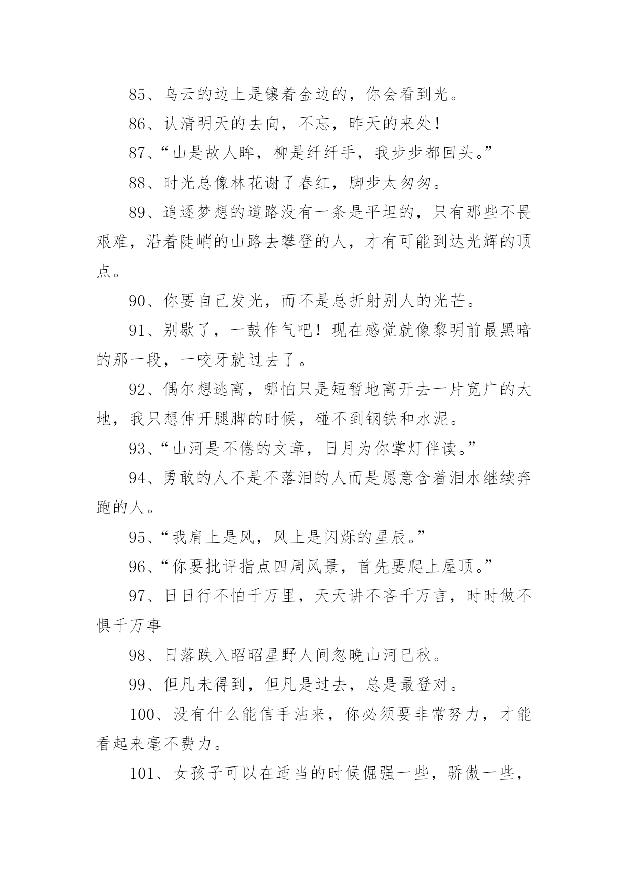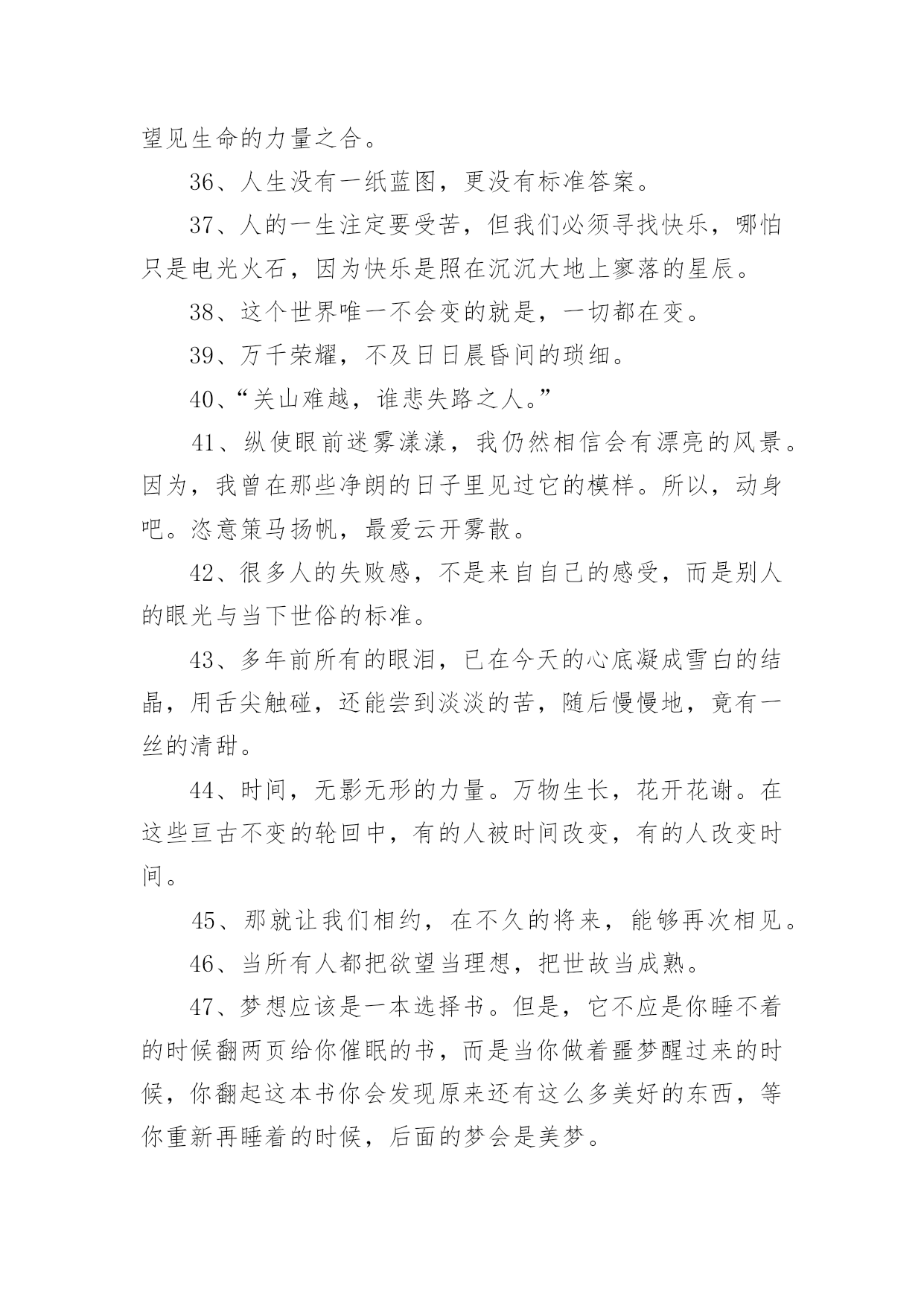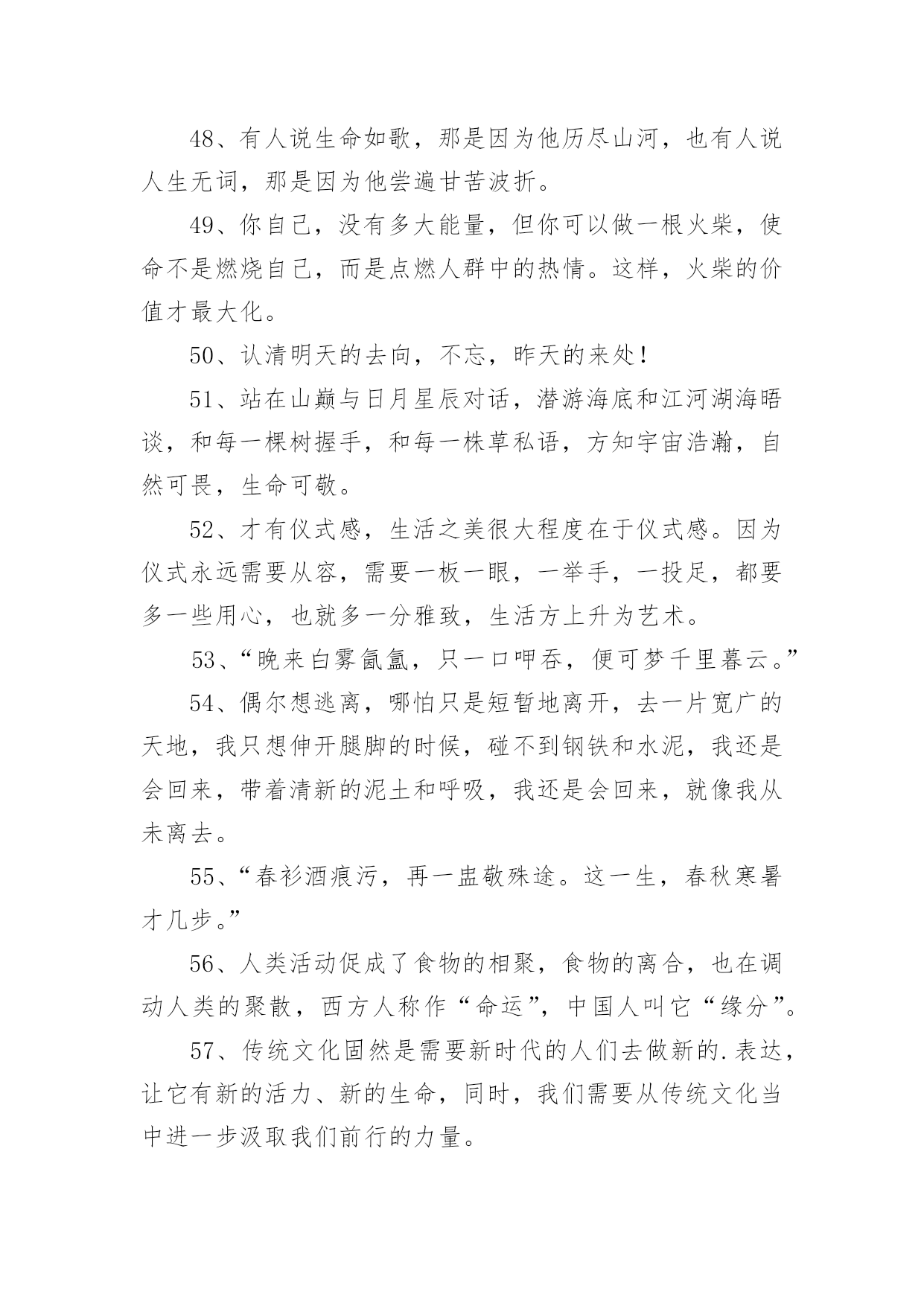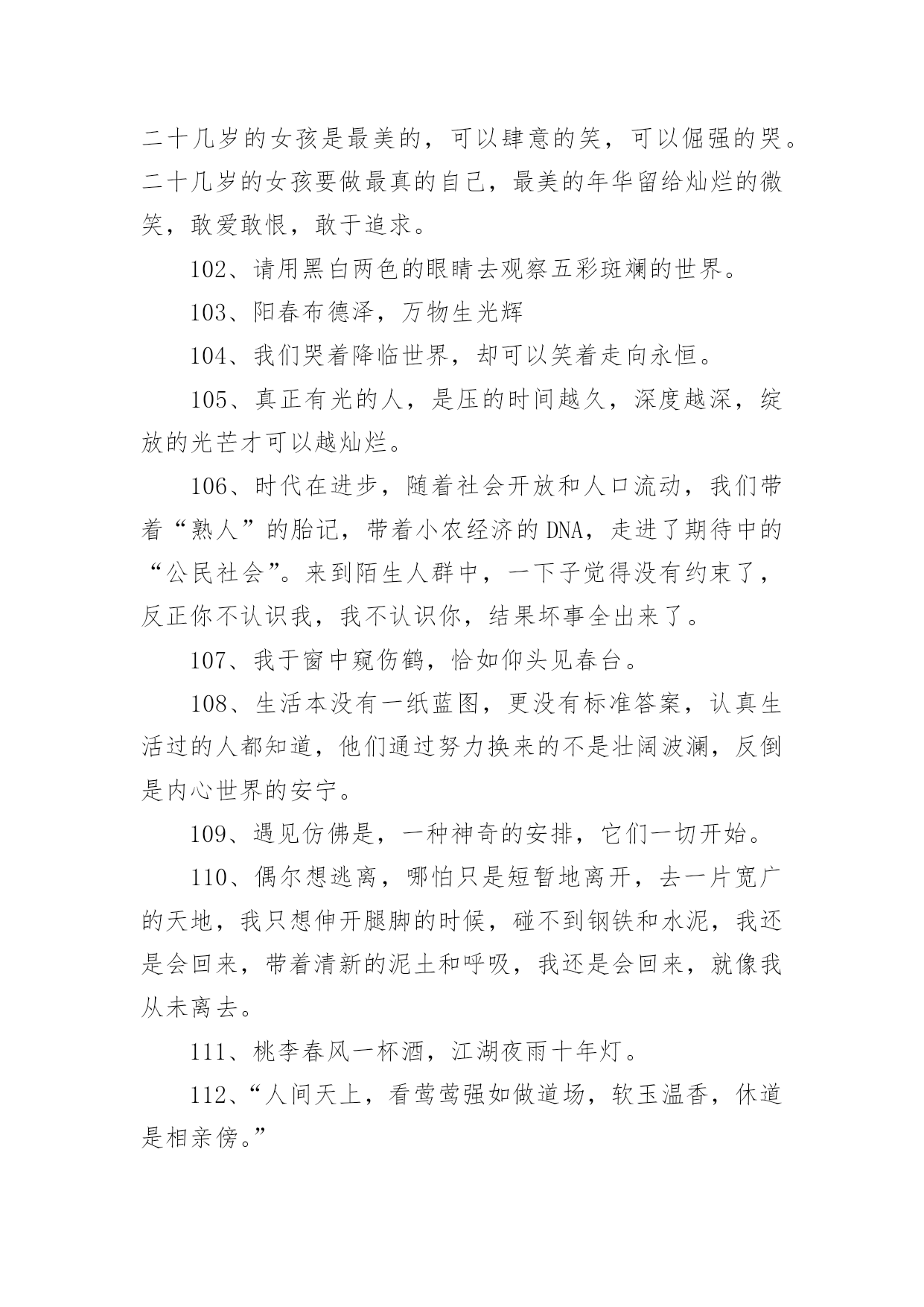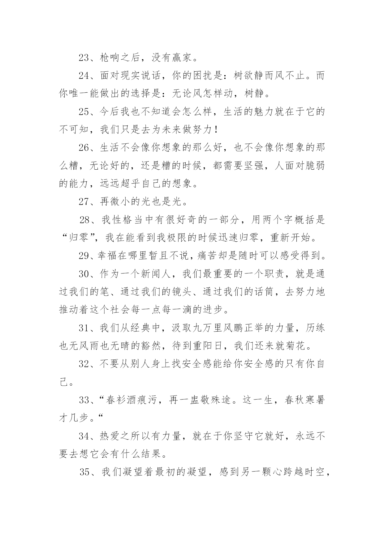 央视惊艳文案不负青春1央视惊艳文案不负青春随着线上的、虚拟的社交的迅猛发展,大家都不可避免地会接触到文案吧,文案用于跟亲朋好友分享个人生活情况。那么你有真正了解过文案吗?下面是小编帮大家整理的央视惊艳文案不负青春,欢迎大家借鉴与参考,希望对大家有所帮助。央视惊艳文案不负青春11、真正有光的人,压的时间越久,深度越深,绽放的光芒才可以越灿烂。2、诗句是天才创造的,但是诗意却是可以属于每一个追求真善美的灵魂。3、我们说“江河万里总有源,树高千尺也有根”无论我们走得多远,我们都不会忘记来时的路,这叫不忘初心,也要坚守自己的初心。4、在这些无数的疤痕中,见到了一个又一个历史的细节,在这些星辰般的碎片里,看到了人类在苦难中前行的脚步,我们哭着降临世界,却可以笑着走向永恒。5、人的潜能其实远超过自己的想象,你不挖掘就永远不会知道!6、“我把冬雪煮一遭,拈花折草,为你熬清宵。”7、“人间天上,看莺莺强如做道场,软玉温香,休道是相亲傍。”8、“灯火星星,人声杳杳,歌不尽乱世烽火。”9、穿行在骨笛孔洞之间的,是九千年前人类的呼吸,那是文明的先声。那时风动,此时心动。10、“山河是不倦的文章,日月为你掌灯伴读。”11、牙齿有多硬,可一个个掉了,舌头有多软,可它永远与你同在。12、“我于窗中窥伤鹤,恰如仰头见春台。”13、“何时仗尔看南雪,我与梅花两白头。”14、极光会有的,并肩于雪山之巅。15、我只和昨天的自己、去年的自己做纵向比较,与别的主持人做横向比较太辛苦,留着让观众去比较吧。16、方知宇宙浩瀚,自然可谓,生命可敬。17、不要从别人身上找安全感,能给你安全感的只有你自己。18、“背对山河,踏清风明月。”19、我们乘着时代的风云,以微毫诠释盛大,且歌且舞而来。我们曼妙风姿里,就是生命。我们轻盈飞过处,就是天空。20、偶尔想逃离,哪怕只是短暂地离开去一片宽广的大地,我只想伸开腿脚的时候,碰不到钢铁和水泥。21、“最是轻狂,爱自茫茫,少时不知须珍藏,年华如水流逝往,郎君若悔也无望。”22、少年感就是好奇、投入和执着,带着好奇心,带着一颗执着的心,去投入做一件事情。23、枪响之后,没有赢家。24、面对现实说话,你的困扰是:树欲静而风不止。而你唯一能做出的选择是:无论风怎样动,树静。25、今后我也不知道会怎么样,生活的魅力就在于它的不可知,我们只是去为未来做努力!26、生活不会像你想象的那么好,也不会像你想象的那么糟,无论好的,还是糟的时候,都需要坚强,人面对脆弱的能力,远远超乎自己的想象。27、再微小的光也是光。28、我性格当中有很好奇的一部分,用两个字概括是“归零”,我在能看到我极限的时候迅速归零,重新开始。29、幸福在哪里暂且不说,痛苦却是随时可以感受得到。30、作为一个新闻人,我们最重要的一个职责,就是通过我们的笔、通过我们的镜头、通过我们的话筒,去努力地推动着这个社会每一点每一滴的进步。31、我们从经典中,汲取九万里风鹏正举的力量,历练也无风雨也无晴的豁然,待到重阳日,我们还来就菊花。32、不要从别人身上找安全感能给你安全感的只有你自己。33、“春衫酒痕污,再一盅敬殊途。这一生,春秋寒暑才几步。“34、热爱之所以有力量,就在于你坚守它就好,永远不要去想它会有什么结果。35、我们凝望着最初的凝望,感到另一颗心跨越时空,望见生命的力量之合。36、人生没有一纸蓝图,更没有标准答案。37、人的一生注定要受苦,但我们必须寻找快乐,哪怕只是电光火石,因为快乐是照在沉沉大地上寥落的星辰。38、这个世界唯一不会变的就是,一切都在变。39、万千荣耀,不及日日晨昏间的琐细。40、“关山难越,谁悲失路之人。”41、纵使眼前迷雾漾漾,我仍然相信会有漂亮的风景。因为,我曾在那些净朗的日子里见过它的模样。所以,动身吧。恣意策马扬帆,最爱云开雾散。42、很多人的失败感,不是来自自己的感受,而是别人的眼光与当下世俗的标准。43、多年前所有的眼泪,已在今天的心底凝成雪白的结晶,用舌尖触碰,还能尝到淡淡的苦,随后慢慢地,竟有一丝的清甜。44、时间,无影无形的力量。万物生长,花开花谢。在这些亘古不变的轮回中,有的人被时间改变,有的人改变时间。45、那就让我们相约,在不久的将来,能够再次相见。46、当所有人都把欲望当理想,把世故当成熟。47、梦想应该是一本选择书。但是,它不应是你睡不着的时候翻两页给你催眠的书,而是当你做着噩梦醒过来的时候,你翻起这本书你会发现原来还有这么多美好的东西,等你重新再睡着的时候,后面的梦会是美梦。48、有人说生命如歌,那是因为他历尽山河,也有人说人生无词,那是因为他尝遍甘苦波折。49、你自己,没有多大能量,但你可以做一根火柴,使命不是燃烧自己,而是点燃人群中的热情。这样,火柴的价值才最大化。50、认清明天的去向,不忘,昨天的来处!51、站在山巅与日