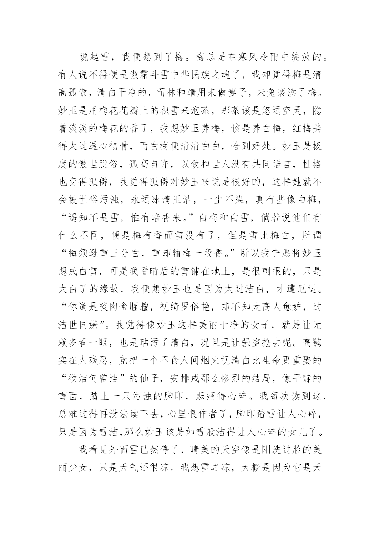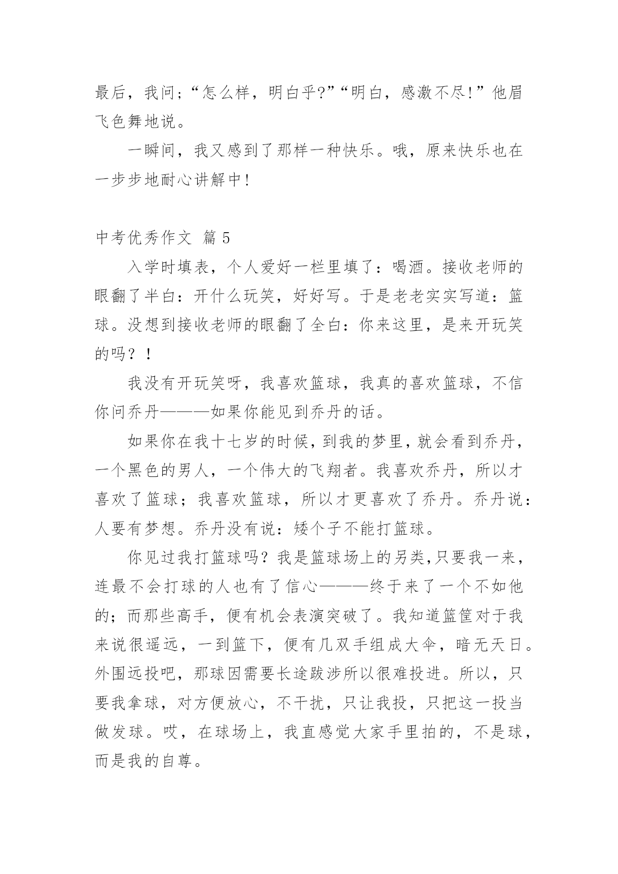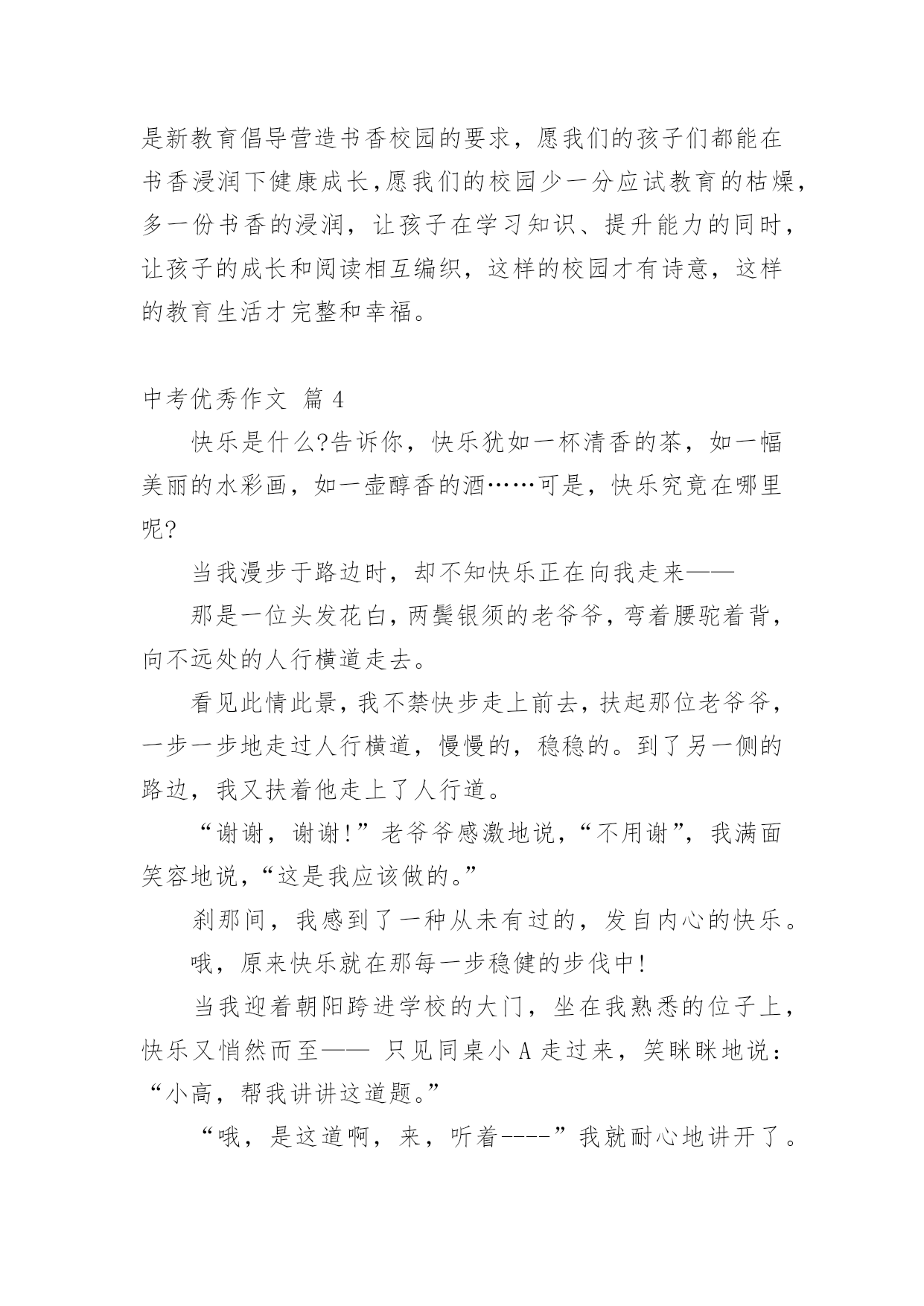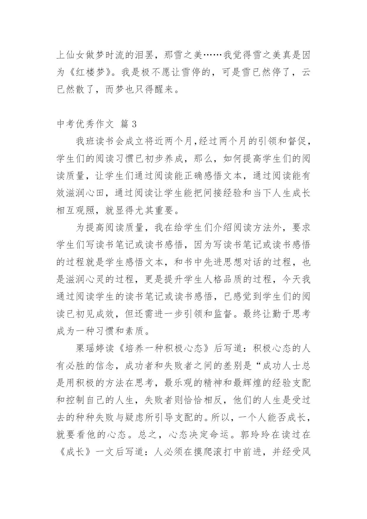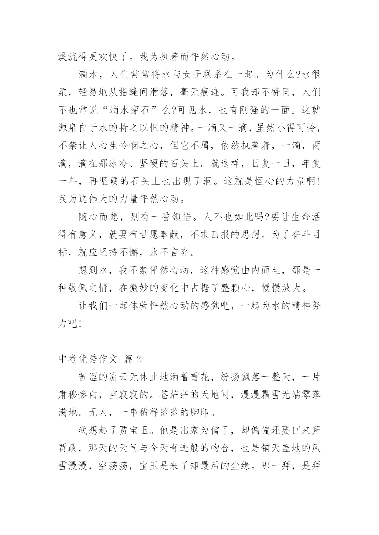 中考优秀作文【精品】中考优秀作文九篇无论在学习、工作或是生活中,大家都有写作文的经历,对作文很是熟悉吧,借助作文人们可以实现文化交流的目的。你写作文时总是无从下笔?以下是小编收集整理的中考优秀作文10篇,供大家参考借鉴,希望可以帮助到有需要的朋友。中考优秀作文篇1我爱水。水的情,水的柔,水的刚,触碰了我心灵的每一个角落,留下了我对人生的点滴感悟。雨,悄悄地来,静静地走。留下来万物滋润后的喜悦。它是那么潇洒,默默无闻,从不居功自傲。连杜甫都夸赞:“润物细无声。”它就这样滋润着大地,却不求回报。对于农民,雨就更珍贵了,没有雨水的哺育,哪来丰收的喜悦呢?不是有句谚语吗?“春雨贵如油”。是啊,它是万物希望。我怦然心动。溪。“哗,哗,哗”,一条小溪从山涧中飞泻而下。那一刻,便立下誓言,要汇入大海,它是那样执著,一路上奔腾不息似乎像一个富有活力的少年,为了理想而不断前进。杜甫曾这样评价过小溪,“在山水清,出山水浊。”我可要反对了。小溪那么坚持不懈,它可从未放弃过。放眼望去,它已汇入大海。我想应将它改为“在山水清,出山水涌”。看小溪流得更欢快了。我为执著而怦然心动。滴水,人们常常将水与女子联系在一起。为什么?水很柔,轻易地从指缝间滑落,毫无痕迹。可我却不赞同,人们不也常说“滴水穿石”么?可见水,也有刚强的一面。这就源泉自于水的持之以恒的精神。一滴又一滴,虽然小得可怜,不禁让人心生怜悯之心,但它不屑,依然执著着,一滴,两滴,滴在那冰冷、坚硬的石头上。就这样,日复一日,年复一年,再坚硬的石头上也出现了洞。这就是恒心的力量啊!我为这伟大的力量怦然心动。随心而想,别有一番领悟。人不也如此吗?要让生命活得有意义,就要有甘愿奉献,不求回报的思想。为了奋斗目标,就应坚持不懈,永不言弃。想到水,我不禁怦然心动,这种感觉由内而生,那是一种敬佩之情,在微妙的变化中占据了整颗心,慢慢放大。让我们一起体验怦然心动的感觉吧,一起为水的精神努力吧!中考优秀作文篇2苦涩的流云无休止地洒着雪花,纷扬飘落一整天,一片肃穆惨白,空寂寂的。苍茫茫的天地间,漫漫霜雪无端零落满地。无人,一串稀稀落落的脚印。我想起了贾宝玉。他是出家为僧了,却偏偏还要回来拜贾政,那天的天气与今天奇迹般的吻合,也是铺天盖地的风雪漫漫,空荡荡,宝玉是来了却最后的尘缘。那一拜,是拜去了十九年的生养恩,拜去了魂牵梦绕的女儿愁,拜去了幽怨缠绵的几多情,拜去了悲凉感伤的凡尘梦,自此世上再无贾宝玉这个人,贾政心中该怎么想,宝玉是他惟一的儿子,振兴家族的希望,亲嫡嫡的骨肉情,竟如此脆弱不堪一击,说离便离了,说谈便谈了,红尘滚滚,旧梦依稀,音容犹在,昔人相见却是陌生,荒凉的旷野飘着雪,埋葬了十几年的梦,梦醒雪落,散去无痕,这雪花寒得人心痛啊,那么宝玉便是一个让人心痛的,如凄风苦雪般的人儿。晴后的雪景是极美的,湛蓝蓝的天空,一捧晶莹冰雪,熠熠泛着寒光,我念着“山中高士晶莹雪”,便想薜宝钗是多么美的女子。薜家是珍珠如土金如铁,而宝钗却总平平淡淡一袭素衣。她不以显赫的家世自傲,也不凭花言巧语趋炎附势,宽容真诚对待每一个人。她是端雅大方,平易近人,却从骨子里让人觉得敬佩折服,就像初次见到雪山的感觉——庄重肃穆,不可玷污的圣洁与威严,坦坦荡荡,晶莹而细腻,稳重而敦厚,宝钗虽是“罕言寡语,人谓藏愚,安分随时,自去守拙。“而事实上机敏尖酸刻薄也一点不比林黛玉逊色。只是好太想嫁给宝玉了,太想要名份,太希望”好借凭风力,送我上青云了“。纵使这样,她也并不和凤姐一气,也并没有害过一个人。可是她的结局却那么惨,枉与他人作笑谈。她是不明白,晶莹的雪是不该热爱金碧辉煌的太阳的,更不该去追求,太阳是会灼痛熔化了雪的,她是被太阳迷了眼,本性并不是如此。那么宝薜便是如雪般迷茫,美得可怜的女子。说起雪,我便想到了梅。梅总是在寒风冷雨中绽放的。有人说不得便是傲霜斗雪中华民族之魂了,我却觉得梅是清高孤傲,清白干净的,而林和靖用来做妻子,未兔亵渎了梅。妙玉是用梅花花瓣上的积雪来泡茶,那茶该是悠远空灵,隐着淡淡的梅花的香了,我想妙玉养梅,该是养白梅,红梅美得太过透心彻骨,而白梅便清清白白,恰到好处。妙玉是极度的傲世脱俗,孤高自许,以致和世人没有共同语言,性格也变得孤僻,我觉得孤僻对妙玉来说是很好的,这样她就不会被世俗污浊,永远冰清玉洁,一尘不染,真有些像白梅,“遥知不是雪,惟有暗香来。”白梅和白雪,倘若说他们有什么不同,便是梅有香而雪没有了,但是雪比梅白,所谓“梅须逊雪三分白,雪却输梅一段香。”所以我宁愿将妙玉想成白雪,可是我看晴后的雪铺在地上,是很刺眼的,只是太白了的缘故,我便想妙玉也是因为太过洁白,才遭厄运。“你道是啖肉食腥膻,视绮罗俗艳,却不知太高人愈妒,过洁世同嫌”。我觉得像妙玉这样美丽干净的女子,就是让无赖多看一眼,也是玷污了清白,况且是让强盗抢