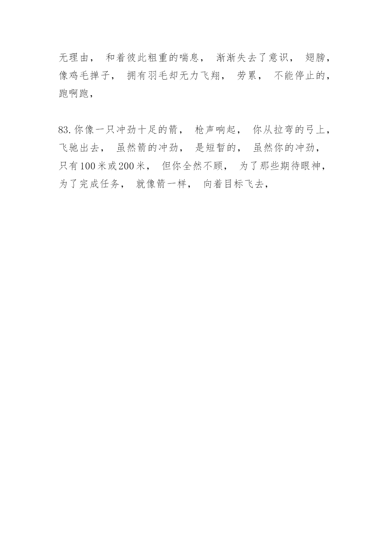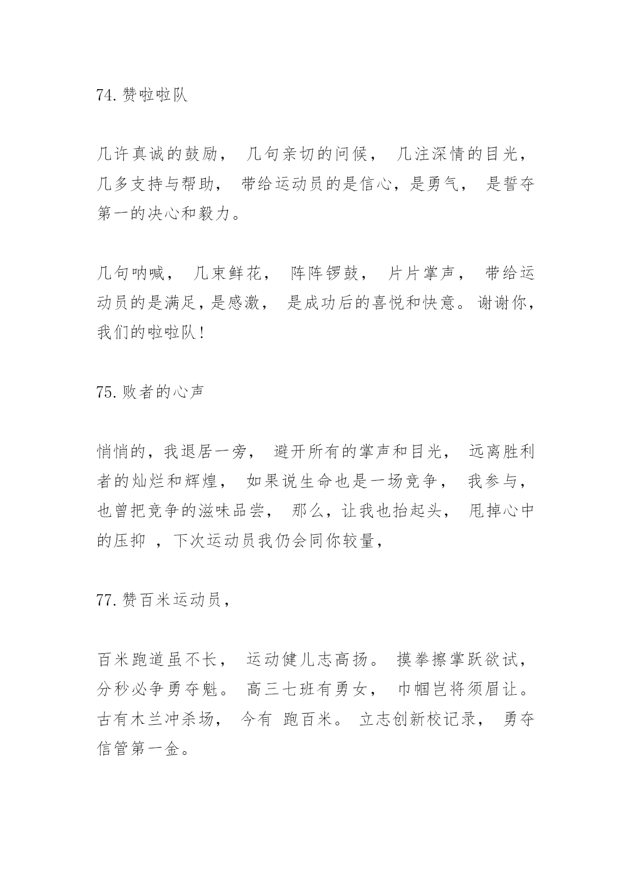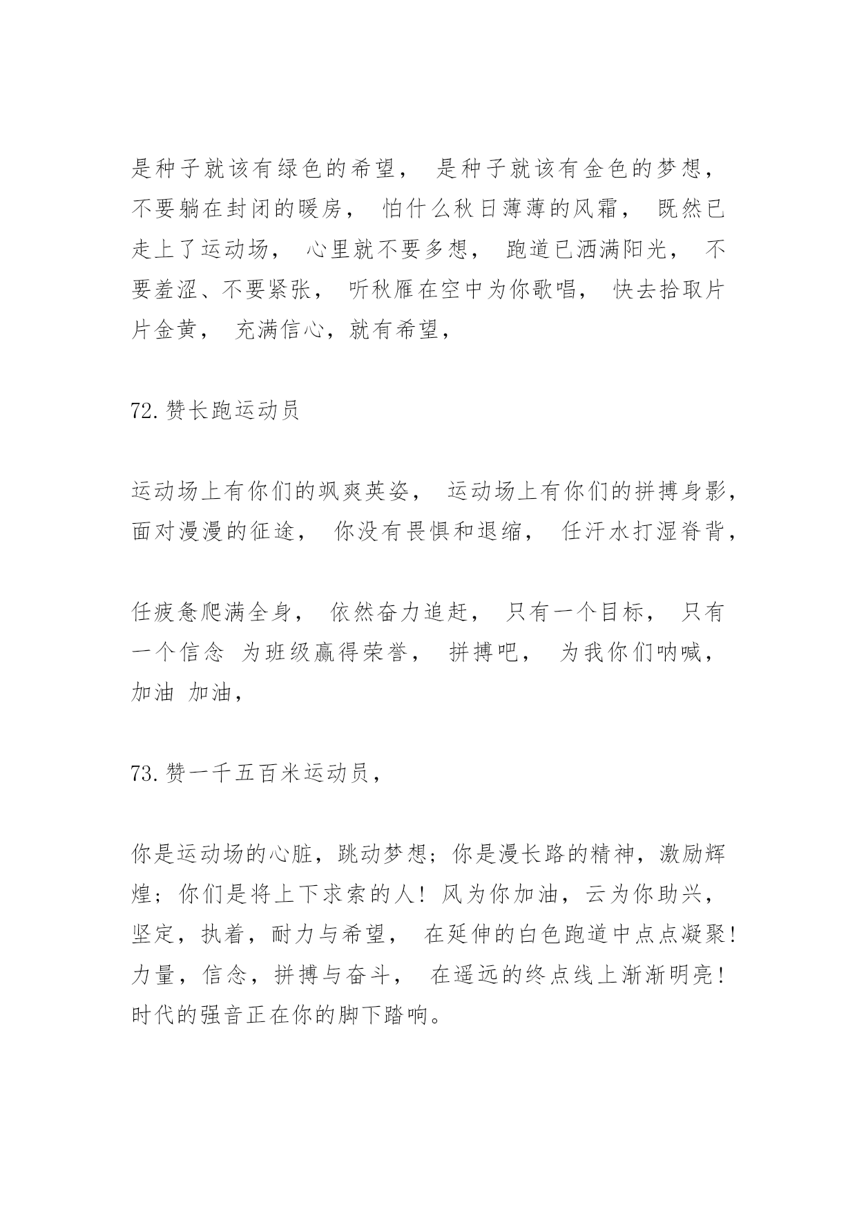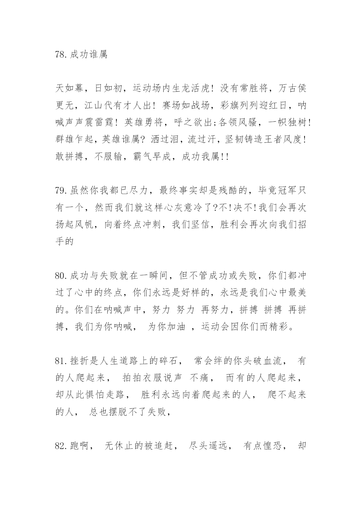 田径运动会的口号广播里听不到您的声音,领奖台前看不到您的身影,您说:“这是应该的”。但是,如果没有您的认真和公正、严谨与洒脱,哪有那么多成功的喜悦,哪有那么多凯旋。您,才是真正的奉献者,相信经您之手,会有更多的胜利者涌现出来,会有更多的冠军向我们走来。一切感激的话都显得苍白无力,唯有向您道一声“您辛苦了,尊敬的裁判员”。69.赞裁判员柳树抽出新芽,怎能忘了春风的吹拂?小草钻出泥土,怎能忘了春雨的滋润?花儿绽开美丽笑脸,怎能忘了太阳爱抚?孩子们的成长更不能忘记老师的培养。今天,我们成绩的取得,怎能忘记您,公正无私的裁判员老师70.赞三千米夸夫迫日惊华夏,平步青云塔黄沙。毓文男儿集力聚,气贯神州傲中华。71.自信就是希望是种子就该有绿色的希望,是种子就该有金色的梦想,不要躺在封闭的暖房,怕什么秋日薄薄的风霜,既然已走上了运动场,心里就不要多想,跑道已洒满阳光,不要羞涩、不要紧张,听秋雁在空中为你歌唱,快去拾取片片金黄,充满信心,就有希望,72.赞长跑运动员运动场上有你们的飒爽英姿,运动场上有你们的拼搏身影,面对漫漫的征途,你没有畏惧和退缩,任汗水打湿脊背,任疲惫爬满全身,依然奋力追赶,只有一个目标,只有一个信念为班级赢得荣誉,拼搏吧,为我你们呐喊,加油加油,73.赞一千五百米运动员,你是运动场的心脏,跳动梦想;你是漫长路的精神,激励辉煌;你们是将上下求索的人!风为你加油,云为你助兴,坚定,执着,耐力与希望,在延伸的白色跑道中点点凝聚!力量,信念,拼搏与奋斗,在遥远的终点线上渐渐明亮!时代的强音正在你的脚下踏响。74.赞啦啦队几许真诚的鼓励,几句亲切的问候,几注深情的目光,几多支持与帮助,带给运动员的是信心,是勇气,是誓夺第一的决心和毅力。几句呐喊,几束鲜花,阵阵锣鼓,片片掌声,带给运动员的是满足,是感激,是成功后的喜悦和快意。谢谢你,我们的啦啦队!75.败者的心声悄悄的,我退居一旁,避开所有的掌声和目光,远离胜利者的灿烂和辉煌,如果说生命也是一场竞争,我参与,也曾把竞争的滋味品尝,那么,让我也抬起头,甩掉心中的压抑,下次运动员我仍会同你较量,77.赞百米运动员,百米跑道虽不长,运动健儿志高扬。摸拳擦掌跃欲试,分秒必争勇夺魁。高三七班有勇女,巾帼岂将须眉让。古有木兰冲杀场,今有跑百米。立志创新校记录,勇夺信管第一金。78.成功谁属天如幕,日如初,运动场内生龙活虎!没有常胜将,万古侯更无,江山代有才人出!赛场如战场,彩旗列列迎红日,呐喊声声震雷霆!英雄勇将,呼之欲出;各领风骚,一帜独树!群雄乍起,英雄谁属?洒过泪,流过汗,坚韧铸造王者风度!敢拼搏,不服输,霸气早成,成功我属!!79.虽然你我都已尽力,最终事实却是残酷的,毕竟冠军只有一个,然而我们就这样心灰意冷了?不!决不!我们会再次扬起风帆,向着终点冲刺,我们坚信,胜利会再次向我们招手的80.成功与失败就在一瞬间,但不管成功或失败,你们都冲过了心中的终点,你们永远是好样的,永远是我们心中最美的。你们在呐喊声中,努力努力再努力,拼搏拼搏再拼搏,我们为你呐喊,为你加油,运动会因你们而精彩。81.挫折是人生道路上的碎石,常会绊的你头破血流,有的人爬起来,拍拍衣服说声不痛,而有的人爬起来,却从此惧怕走路,胜利永远向着爬起来的人,爬不起来的人,总也摆脱不了失败,82.跑啊,无休止的被追赶,尽头遥远,有点惶恐,却无理由,和着彼此粗重的喘息,渐渐失去了意识,翅膀,像鸡毛掸子,拥有羽毛却无力飞翔,劳累,不能停止的,跑啊跑,83.你像一只冲劲十足的箭,枪声响起,你从拉弯的弓上,飞驰出去,虽然箭的冲劲,是短暂的,虽然你的冲劲,只有100米或200米,但你全然不顾,为了那些期待眼神,为了完成任务,就像箭一样,向着目标飞去,