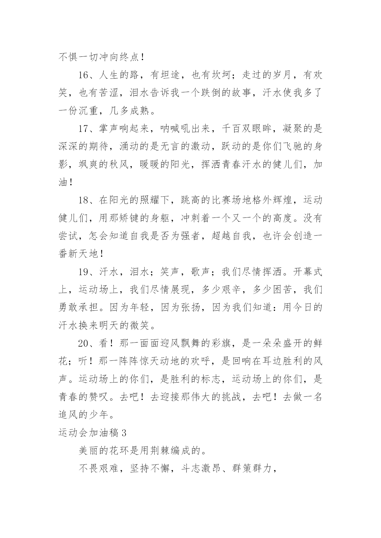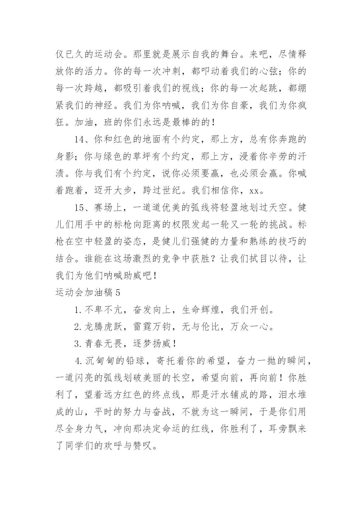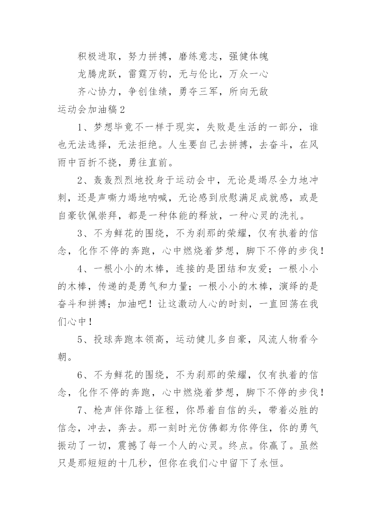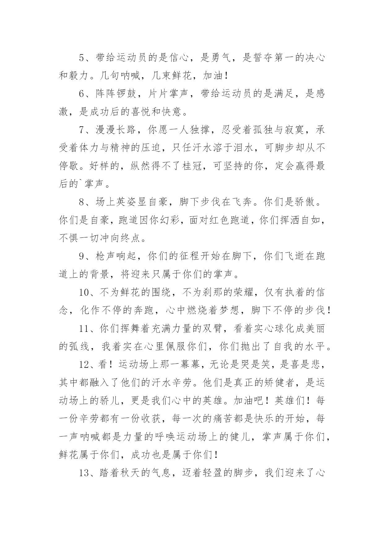 运动会加油稿运动会加油稿在充满活力,日益开放的今天,很多情况下我们需要用到加油稿,借助加油稿可以激起人的希望,催人奋进。写加油稿的注意事项有许多,你确定会写吗?下面是小编精心整理的运动会加油稿,希望能够帮助到大家。运动会加油稿1今日的你们英姿飒爽,今日的你们一马当先。不要放下,不要气馁。相信自己,你是最棒的!时值秋暮冬初,虽然已过了金秋十月,然而初冬依然暖阳高照,校运动会在这样风和日丽的`天气里如期举行了。努力吧!加油啊!时间短暂并不代表你活力短暂,距离不长却表示你成功不远,相信自己,冲啊!胜利就在眼前,失去不会再现!漫漫长路,你愿一人独撑,忍受着孤独与寂寞,承受着体力与精神的压迫,只任汗水溶于泪水,可脚步却从不停歇。时间在流逝,赛道在延伸,成功在你面前展现。心脏在跳动,热血在沸腾,辉煌在你脚下铸就,加油吧,健儿们!你们挥舞着充满力量的双臂,看着实心球化成美丽的弧线,我着实在心里佩服你们,你们抛出了自我的水平。团结进取,争创佳绩,努力拼搏,挑战自我积极进取,努力拼搏,磨练意志,强健体魄龙腾虎跃,雷霆万钧,无与伦比,万众一心齐心协力,争创佳绩,勇夺三军,所向无敌运动会加油稿21、梦想毕竟不一样于现实,失败是生活的一部分,谁也无法选择,无法拒绝。人生要自己去拼搏,去奋斗,在风雨中百折不挠,勇往直前。2、轰轰烈烈地投身于运动会中,无论是竭尽全力地冲刺,还是声嘶力竭地呐喊,无论感到欣慰满足成就感,或是自豪钦佩崇拜,都是一种体能的释放,一种心灵的洗礼。3、不为鲜花的围绕,不为刹那的荣耀,仅有执着的信念,化作不停的奔跑,心中燃烧着梦想,脚下不停的步伐!4、一根小小的木棒,连接的是团结和友爱;一根小小的木棒,传递的是勇气和力量;一根小小的木棒,演绎的是奋斗和拼搏;加油吧!让这激动人心的时刻,一直回荡在我们心中!5、投球奔跑本领高,运动健儿多自豪,风流人物看今朝。6、不为鲜花的围绕,不为刹那的荣耀,仅有执着的信念,化作不停的奔跑,心中燃烧着梦想,脚下不停的步伐!7、枪声伴你踏上征程,你昂着自信的头,带着必胜的信念,冲去,奔去。那一刻时光仿佛都为你停住,你的勇气振动了一切,震撼了每一个人的心灵。终点。你赢了。虽然只是那短短的十几秒,但你在我们心中留下了永恒。8、冬季运动场上英姿显自豪,脚下步伐在飞奔。你们是骄傲,你们是自豪,跑道因你幻彩,面对红色跑道,你们挥洒自如,不惧一切冲向终点!9、我们何其幸运,站在此地感受着热血的青春。失败,没有颓废;遇强,没有退缩。勇气与自信,汗水与笑声,使得赛场越发可爱!10、心中坚定的信念,脚下沉稳的步伐,你用行动告诉我们一个不变之理,没有走不完的路,没有过不了的山,成功正在终点冲着你高高的招手,用你那顽强的意志去努力,去迎接终点的鲜花与掌声,相信成功一定属于你,让今日的'成功谱写新的未来!11、就在激昂的喊声中,运动员们一次次的挑战,一次次超越了自我。他们以自己的行动,充分展现了自己的实力。展现了真我的风采。展现了自我的坚强拼搏的精神。12、朋友们,为运动健儿们喝彩,为运动喝彩吧!场上精彩纷呈,空气里的每一个分子浸透着自信。高二班的我要高喊一声,这里无限精彩!13、青春的脚步,青春的速度,青春的活力,将会在你们的身上尽情体现。14、大海如此的浩淼,鼓声多么美妙,运动员们,你们不再像平时那样渺小,我们默默的祈祷,以你们为骄傲,我们会永远为你们叫好!15、场上英姿显自豪,脚下步伐在飞奔。你们是骄傲,你们是自豪,跑道因你幻彩,面对红色跑道,你们挥洒自如,不惧一切冲向终点!16、人生的路,有坦途,也有坎坷;走过的岁月,有欢笑,也有苦涩,泪水告诉我一个跌倒的故事,汗水使我多了一份沉重,几多成熟。17、掌声响起来,呐喊吼出来,千百双眼眸,凝聚的是深深的期待,涌动的是无言的激动,跃动的是你们飞驰的身影,飒爽的秋风,暖暖的阳光,挥洒青春汗水的健儿们,加油!18、在阳光的照耀下,跳高的比赛场地格外辉煌,运动健儿们,用那矫键的身躯,冲刺着一个又一个的高度。没有尝试,怎会知道自我是否为强者,超越自我,也许会创造一番新天地!19、汗水,泪水;笑声,歌声;我们尽情挥洒。开幕式上,运动场上,我们尽情展现,多少艰辛,多少困苦,我们勇敢承担。因为年轻,因为张扬,因为我们知道:用今日的汗水换来明天的微笑。20、看!那一面面迎风飘舞的彩旗,是一朵朵盛开的鲜花;听!那一阵阵惊天动地的欢呼,是回响在耳边胜利的风声。运动场上的你们,是胜利的标志,运动场上的你们,是青春的赞叹。去吧!去迎接那伟大的挑战,去吧!去做一名追风的少年。运动会加油稿3美丽的花环是用荆棘编成的。不畏艰难,坚持不懈,斗志激昂、群策群力,"友谊第一,比赛第二"积极拼搏,赛出成绩,赛出风格,蓬勃向上的'精神面貌迎接崭新的未来吧!挑战运动极限,演绎健美人学!互相学习,取长补短,再接再厉,