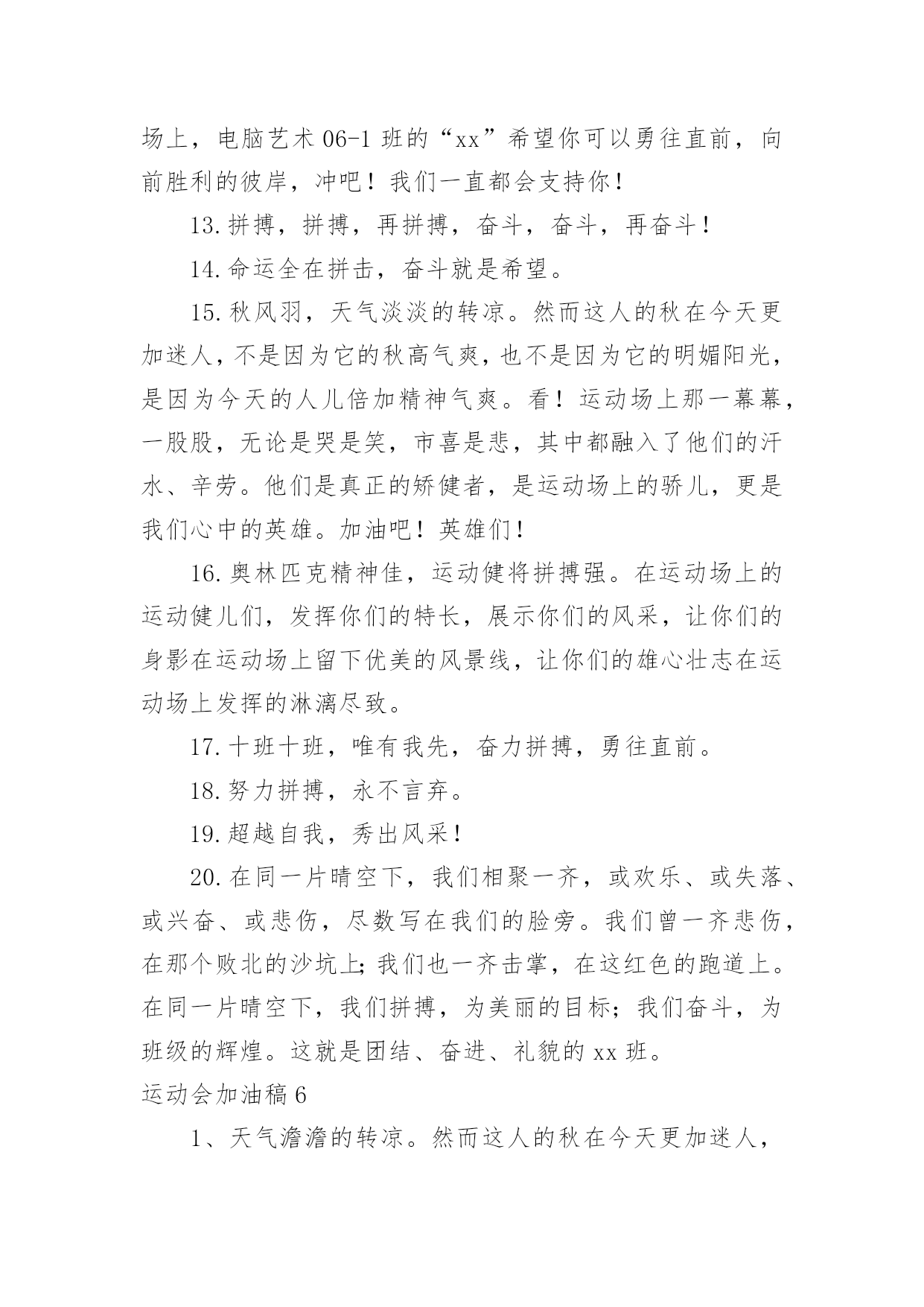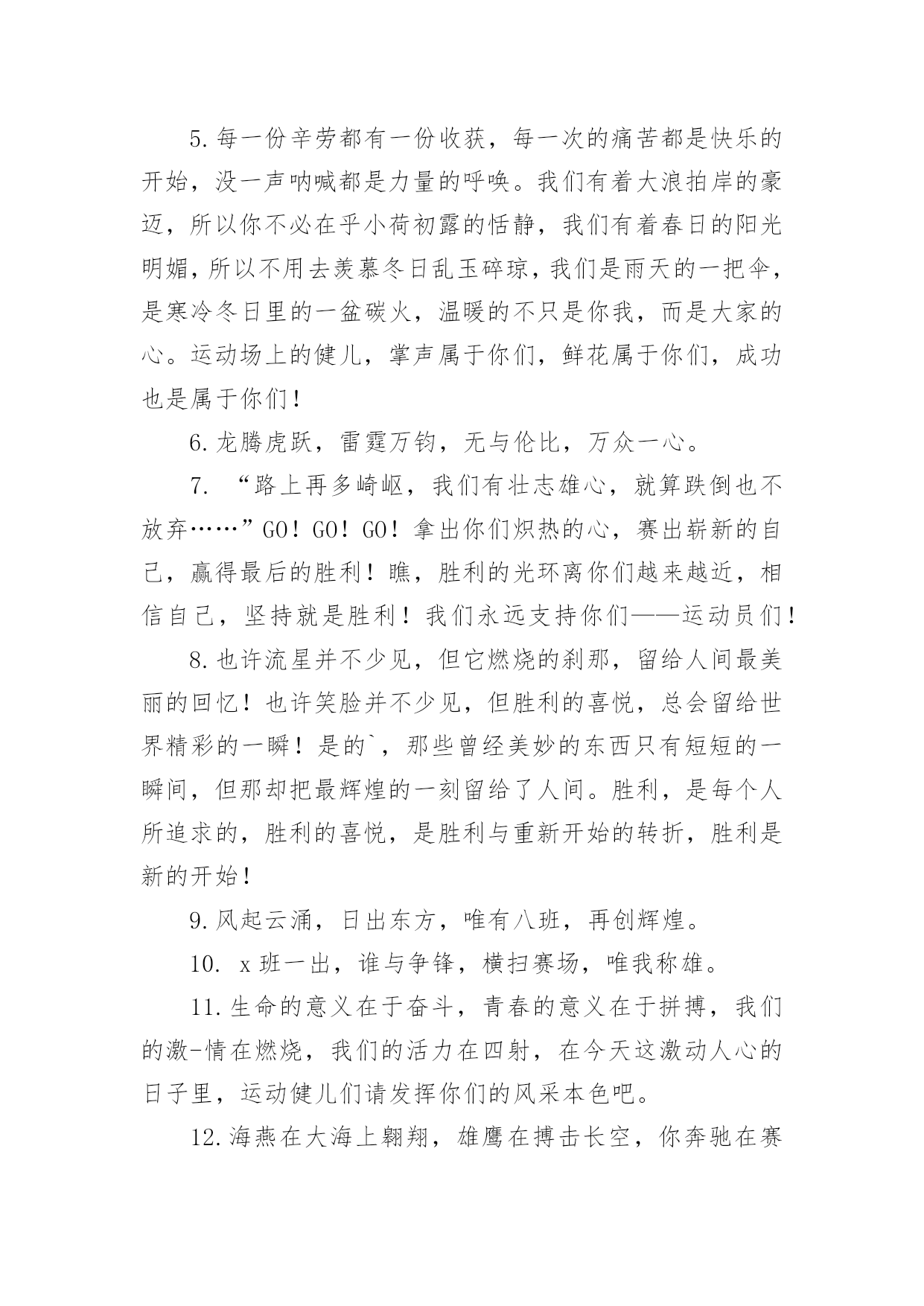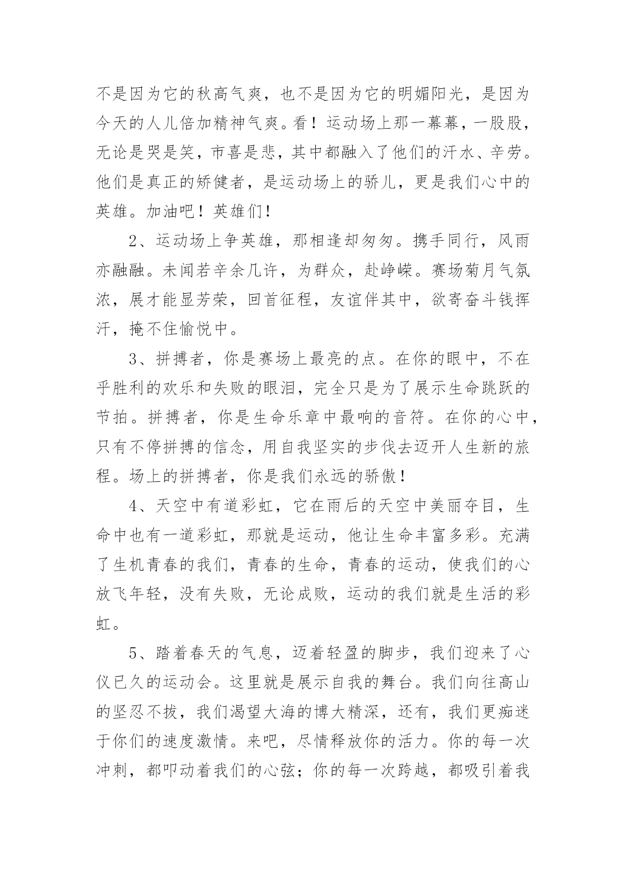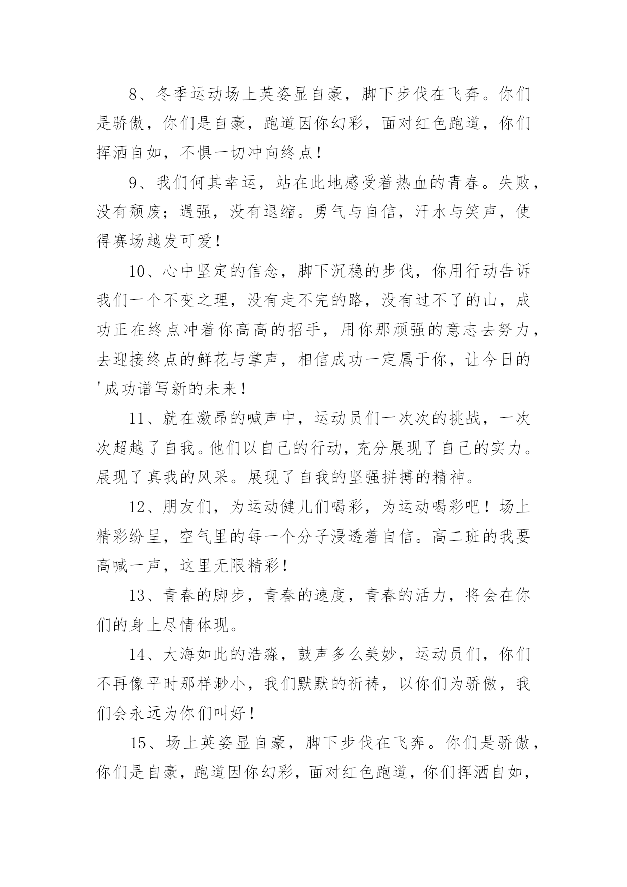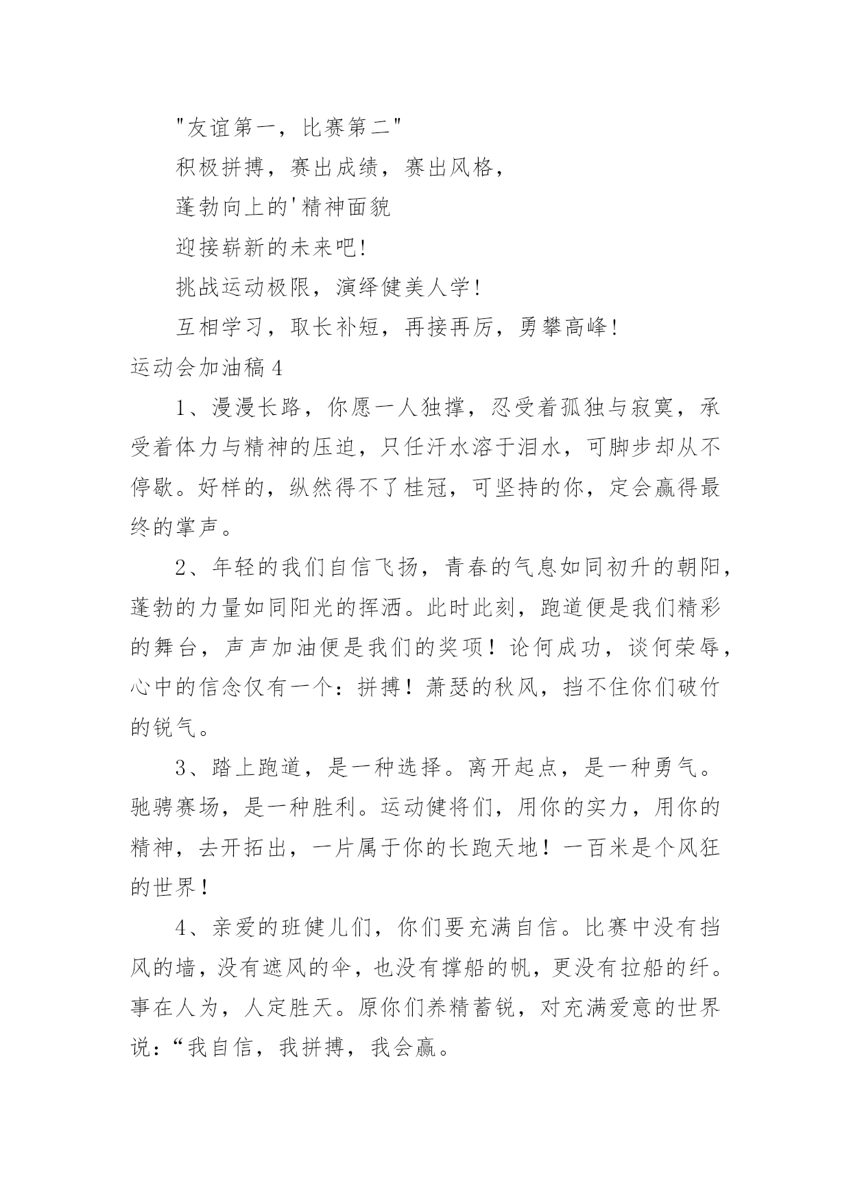 运动会加油稿运动会加油稿在充满活力,日益开放的今天,很多情况下我们需要用到加油稿,借助加油稿可以激起人的希望,催人奋进。写加油稿的注意事项有许多,你确定会写吗?下面是小编精心整理的运动会加油稿,希望能够帮助到大家。运动会加油稿1今日的你们英姿飒爽,今日的你们一马当先。不要放下,不要气馁。相信自己,你是最棒的!时值秋暮冬初,虽然已过了金秋十月,然而初冬依然暖阳高照,校运动会在这样风和日丽的`天气里如期举行了。努力吧!加油啊!时间短暂并不代表你活力短暂,距离不长却表示你成功不远,相信自己,冲啊!胜利就在眼前,失去不会再现!漫漫长路,你愿一人独撑,忍受着孤独与寂寞,承受着体力与精神的压迫,只任汗水溶于泪水,可脚步却从不停歇。时间在流逝,赛道在延伸,成功在你面前展现。心脏在跳动,热血在沸腾,辉煌在你脚下铸就,加油吧,健儿们!你们挥舞着充满力量的双臂,看着实心球化成美丽的弧线,我着实在心里佩服你们,你们抛出了自我的水平。团结进取,争创佳绩,努力拼搏,挑战自我积极进取,努力拼搏,磨练意志,强健体魄龙腾虎跃,雷霆万钧,无与伦比,万众一心齐心协力,争创佳绩,勇夺三军,所向无敌运动会加油稿21、梦想毕竟不一样于现实,失败是生活的一部分,谁也无法选择,无法拒绝。人生要自己去拼搏,去奋斗,在风雨中百折不挠,勇往直前。2、轰轰烈烈地投身于运动会中,无论是竭尽全力地冲刺,还是声嘶力竭地呐喊,无论感到欣慰满足成就感,或是自豪钦佩崇拜,都是一种体能的释放,一种心灵的洗礼。3、不为鲜花的围绕,不为刹那的荣耀,仅有执着的信念,化作不停的奔跑,心中燃烧着梦想,脚下不停的步伐!4、一根小小的木棒,连接的是团结和友爱;一根小小的木棒,传递的是勇气和力量;一根小小的木棒,演绎的是奋斗和拼搏;加油吧!让这激动人心的时刻,一直回荡在我们心中!5、投球奔跑本领高,运动健儿多自豪,风流人物看今朝。6、不为鲜花的围绕,不为刹那的荣耀,仅有执着的信念,化作不停的奔跑,心中燃烧着梦想,脚下不停的步伐!7、枪声伴你踏上征程,你昂着自信的头,带着必胜的信念,冲去,奔去。那一刻时光仿佛都为你停住,你的勇气振动了一切,震撼了每一个人的心灵。终点。你赢了。虽然只是那短短的十几秒,但你在我们心中留下了永恒。8、冬季运动场上英姿显自豪,脚下步伐在飞奔。你们是骄傲,你们是自豪,跑道因你幻彩,面对红色跑道,你们挥洒自如,不惧一切冲向终点!9、我们何其幸运,站在此地感受着热血的青春。失败,没有颓废;遇强,没有退缩。勇气与自信,汗水与笑声,使得赛场越发可爱!10、心中坚定的信念,脚下沉稳的步伐,你用行动告诉我们一个不变之理,没有走不完的路,没有过不了的山,成功正在终点冲着你高高的招手,用你那顽强的意志去努力,去迎接终点的鲜花与掌声,相信成功一定属于你,让今日的'成功谱写新的未来!11、就在激昂的喊声中,运动员们一次次的挑战,一次次超越了自我。他们以自己的行动,充分展现了自己的实力。展现了真我的风采。展现了自我的坚强拼搏的精神。12、朋友们,为运动健儿们喝彩,为运动喝彩吧!场上精彩纷呈,空气里的每一个分子浸透着自信。高二班的我要高喊一声,这里无限精彩!13、青春的脚步,青春的速度,青春的活力,将会在你们的身上尽情体现。14、大海如此的浩淼,鼓声多么美妙,运动员们,你们不再像平时那样渺小,我们默默的祈祷,以你们为骄傲,我们会永远为你们叫好!15、场上英姿显自豪,脚下步伐在飞奔。你们是骄傲,你们是自豪,跑道因你幻彩,面对红色跑道,你们挥洒自如,不惧一切冲向终点!16、人生的路,有坦途,也有坎坷;走过的岁月,有欢笑,也有苦涩,泪水告诉我一个跌倒的故事,汗水使我多了一份沉重,几多成熟。17、掌声响起来,呐喊吼出来,千百双眼眸,凝聚的是深深的期待,涌动的是无言的激动,跃动的是你们飞驰的身影,飒爽的秋风,暖暖的阳光,挥洒青春汗水的健儿们,加油!18、在阳光的照耀下,跳高的比赛场地格外辉煌,运动健儿们,用那矫键的身躯,冲刺着一个又一个的高度。没有尝试,怎会知道自我是否为强者,超越自我,也许会创造一番新天地!19、汗水,泪水;笑声,歌声;我们尽情挥洒。开幕式上,运动场上,我们尽情展现,多少艰辛,多少困苦,我们勇敢承担。因为年轻,因为张扬,因为我们知道:用今日的汗水换来明天的微笑。20、看!那一面面迎风飘舞的彩旗,是一朵朵盛开的鲜花;听!那一阵阵惊天动地的欢呼,是回响在耳边胜利的风声。运动场上的你们,是胜利的标志,运动场上的你们,是青春的赞叹。去吧!去迎接那伟大的挑战,去吧!去做一名追风的少年。运动会加油稿3美丽的花环是用荆棘编成的。不畏艰难,坚持不懈,斗志激昂、群策群力,"友谊第一,比赛第二"积极拼搏,赛出成绩,赛出风格,蓬勃向上的'精神面貌迎接崭新的未来吧!挑战运动极限,演绎健美人学!互相学习,取长补短,再接再厉,