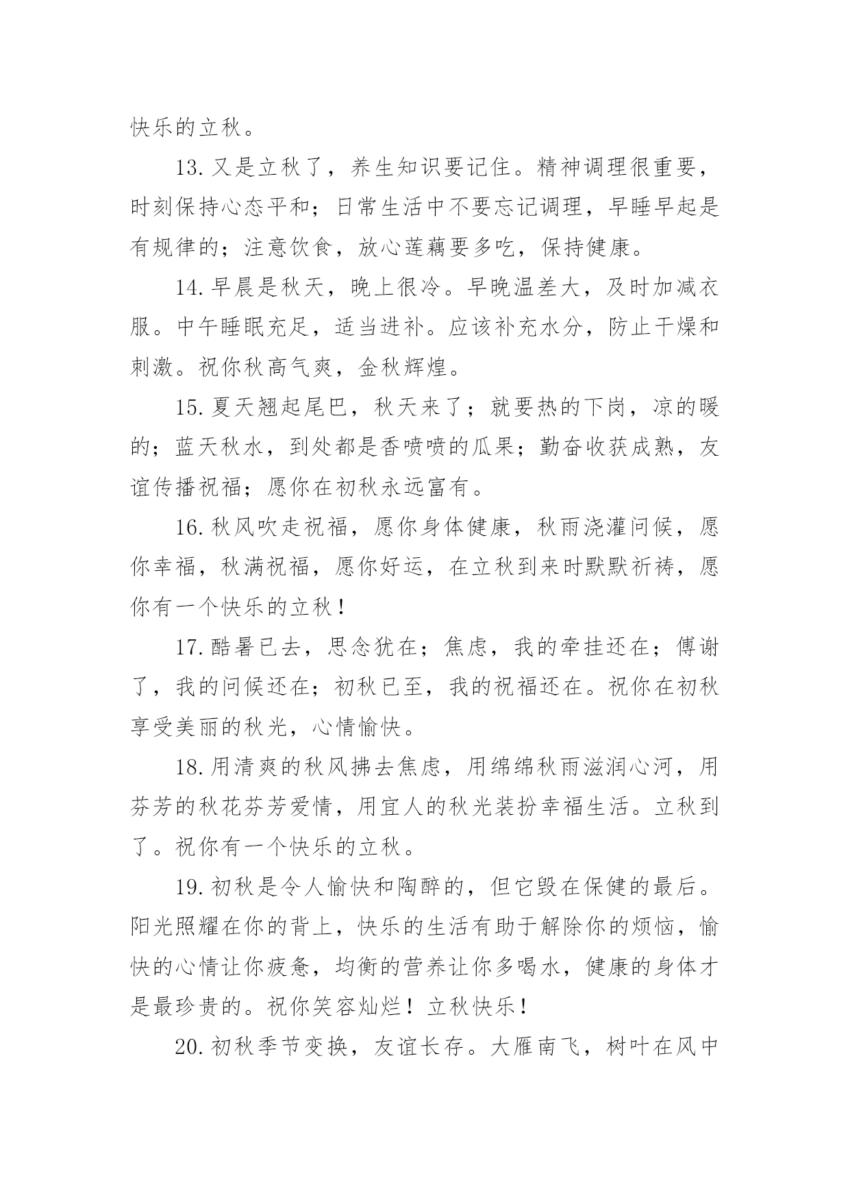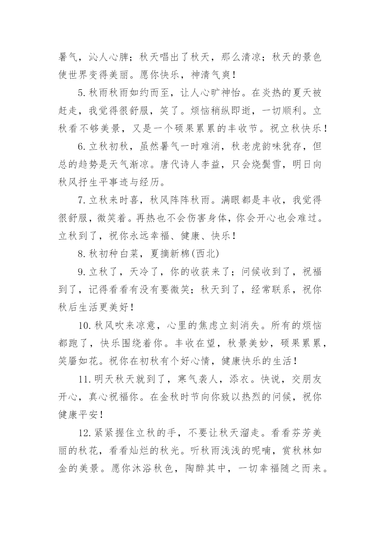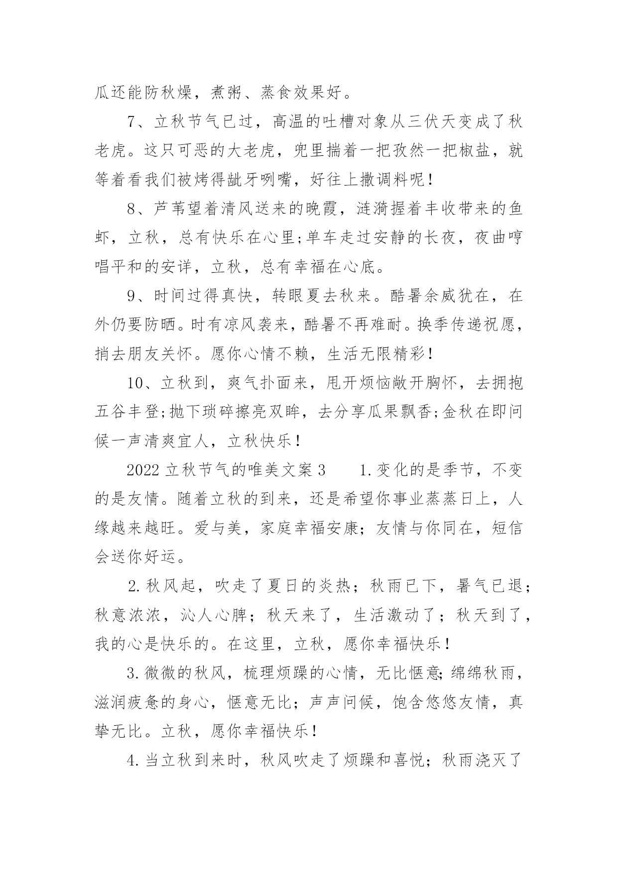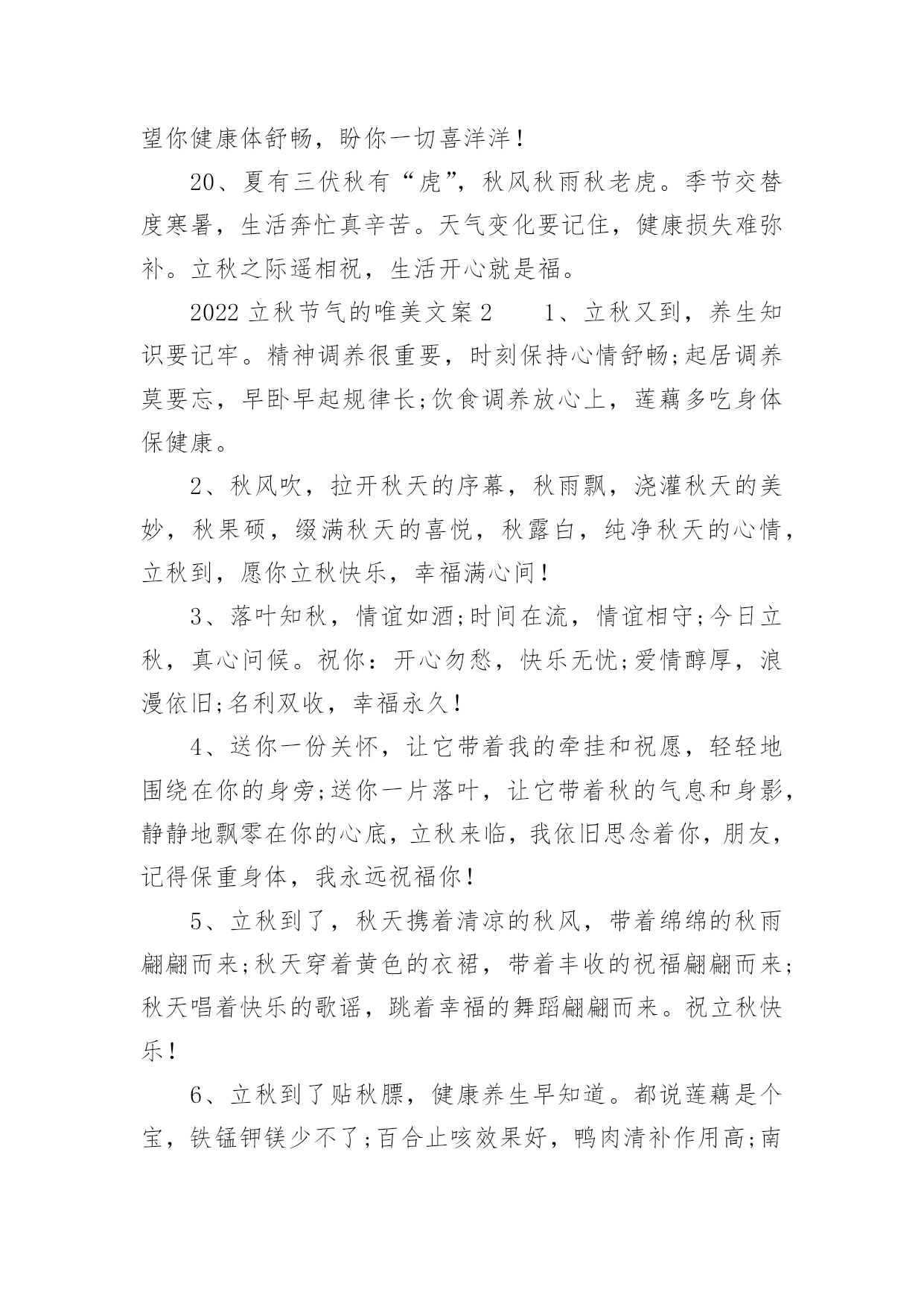2022立秋节气的唯美文案2022立秋节气的唯美文案(精选130句)在平平淡淡的学习、工作、生活中,大家最不陌生的就是文案了吧,文案用以分享自己对生活的思考,表达自己的喜怒哀乐。究竟什么样的文案才是特别的呢?以下是小编帮大家整理的2022立秋节气的唯美文案(精选130句),希望对大家有所帮助。2022立秋节气的唯美文案11、秋高气爽立秋到,早晚温差有变化,及时添衣防感冒,身康体健乐相伴,秋季气候最干燥,时令果蔬要多吃,生津润肺保健康,立秋,愿你健康相随,快乐无限!2、立秋到来精神爽,再无高温令人苦。一场秋雨一分凉,气温适宜人舒服。秋风阵阵树叶黄,谷物丰收愁眉舒。朋友短信送身边,开开心心人幸福。祝立秋快乐!3、炎热退了,忧愁也走了;凉爽来了,欢乐也笑了;桂花开了,爱情也芬芳了,天空高远了,梦想也飞翔了;立秋到了,祝福来报道了。愿你立秋时节心欢笑,一季无忧幸福绕。4、立秋到来天渐凉,早晚温差放心上。秋叶翩翩百果香,多食水果护健康。桂花绽放十里香,芬芳心田情意长。信息简单祝福浓,愿君幸福乐融融。5、立秋到来心欢笑,祝福岂能不报到。秋风吹拂芬芳绕,秋雨滋阴又润燥,秋阳灿烂幸福高,秋光旖旎醉心潮,秋日短信最美妙,愿友快乐乐逍遥。6、时光在季节变换中溜走,友情却始终香醇如酒,拉着思念的手,一刻也不能停留,不知不觉已走到立秋,只想告诉你,这份情意永远在我们左右,值得我们拥有。立秋快乐7、夏日离开要让位,立秋到来正对味。炎热渐渐已消退,清凉静静正尾随。桂花绽放别样美,芬芳把生活点缀。烦恼统统都溃退,幸福在身旁排队。愿你立秋快乐。8、立秋到,炎热消,养生重要;吃水果,食蔬菜,滋阴润燥;不生气,勿忧愁,心情欢笑;勤锻炼,心不老,健康依靠。愿你立秋幸福相随。9、推开季节的门扉,走进立秋的世界,感受秋高气爽,体会云淡风清,欣赏秋色旖旎,触摸金风雨露,沐浴皎月绵绵。愿你在立秋的世界里感受独特的美,找寻别样的幸福。10、圣洁推开了冬天的门,盈洁一片;温暖推开了春天的门,生机一片;灿烂推开了夏天的门,火红一片;清爽推开了秋天的门,惬意一片。愿你立秋时节,享受无限清爽惬意。11、立秋天渐凉,请您及时添衣裳,身体健康万事都会如意,生活才会幸福,爱情才会甜蜜,愿你立秋节气过得快乐,还有一句忘说了,遇到“秋老虎”千万不要忘了脱衣服,小心捂出热痱子。12、天空高高白云淡,立秋小风清清凉,落叶悠悠田地金,秋雨连绵忧愁灭,果儿香飘草渐黄,相思深深烙心上,远方朋友立秋到,记得保重体安康。13、天蓝蓝,草青青,凉爽来到秋意浓;落叶飘,秋雨绕,收获硕果在今朝;寄相思,表祝愿,友谊长久心相连;发短信,送祝福,愿你快乐永幸福;立秋节,保重体,祝你健康事如意;14、流水潺潺,流出清新爽快的心境,开心愉悦;微风习习,吹出清凉惬意的味道,逍遥无比;细雨绵绵,淋出清爽怡人的景致,其乐无穷;情谊真真,传出沁人心脾的问候,爽透你心:立秋愉快,心情舒爽!15、潮湿沉淀了喧嚣,细雨吞噬了酷暑,马路上夏末的味道,路边果实成熟的味道,触动了你的嗅觉。瞥一眼呜呜作响的空调,炎热的七月在指缝中流走。立秋到了,秋天也不远了。16、一年三百六十日,二十四节紧相连。清明种麦谷雨田,立秋打甸处暑镰。日出而作日落息,周而复始岁枯荣。顺天应季合农时,五谷丰登六畜旺。17、一份幸福,一抹快乐,一生平安,一世健康。用所用的美好,融化你所有的烦恼。在立秋到来的时刻,把这份特殊的祝福送给你,祝你一生幸福美丽。18、一层秋雨一层清凉,一份祝福一份吉祥,一缕和顺一缕欢唱,一点开心一点希望,一片温馨一片芬芳,一条短信一条安康。祝:立秋快乐!19、炎炎夏日将匿藏,徐徐秋风轻送爽;立秋时节好时光,短信祝福来送上:祝你工作不繁忙,愿你高兴心情朗,望你健康体舒畅,盼你一切喜洋洋!20、夏有三伏秋有“虎”,秋风秋雨秋老虎。季节交替度寒暑,生活奔忙真辛苦。天气变化要记住,健康损失难弥补。立秋之际遥相祝,生活开心就是福。2022立秋节气的唯美文案21、立秋又到,养生知识要记牢。精神调养很重要,时刻保持心情舒畅;起居调养莫要忘,早卧早起规律长;饮食调养放心上,莲藕多吃身体保健康。2、秋风吹,拉开秋天的序幕,秋雨飘,浇灌秋天的美妙,秋果硕,缀满秋天的喜悦,秋露白,纯净秋天的心情,立秋到,愿你立秋快乐,幸福满心间!3、落叶知秋,情谊如酒;时间在流,情谊相守;今日立秋,真心问候。祝你:开心勿愁,快乐无忧;爱情醇厚,浪漫依旧;名利双收,幸福永久!4、送你一份关怀,让它带着我的牵挂和祝愿,轻轻地围绕在你的身旁;送你一片落叶,让它带着秋的气息和身影,静静地飘零在你的心底,立秋来临,我依旧思念着你,朋友,记得保重身体,我永远祝福你!5、立秋到了,秋天携着清凉的秋风,带着绵绵的秋雨翩翩而来;秋天穿着黄色的衣裙,带着丰收的祝福翩翩而来;秋天唱着快乐的歌谣,跳