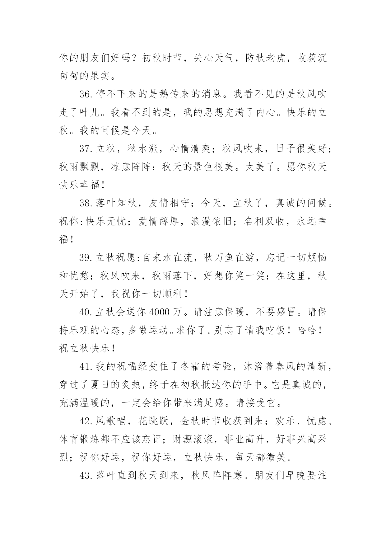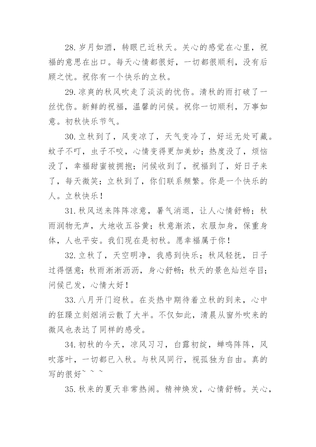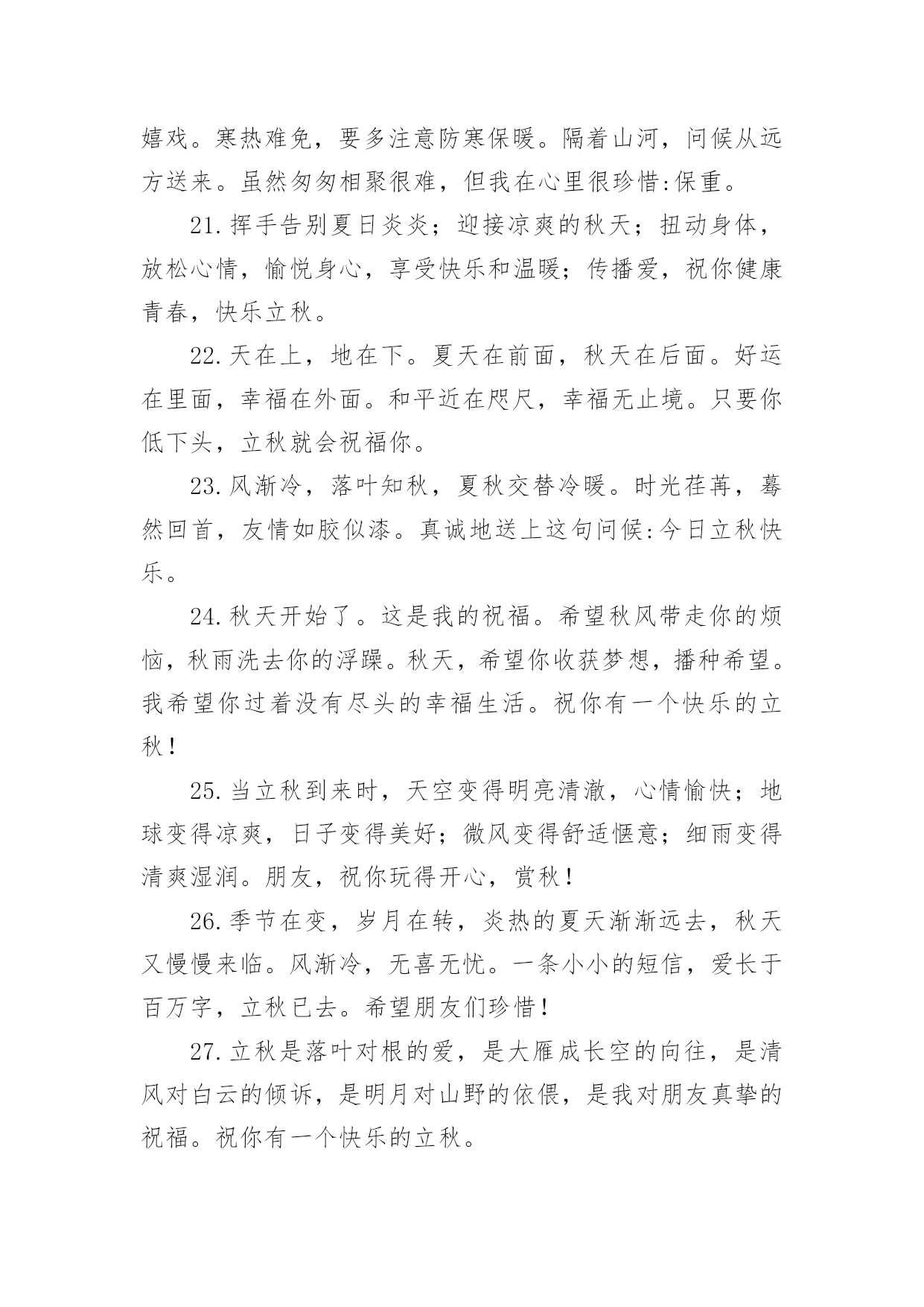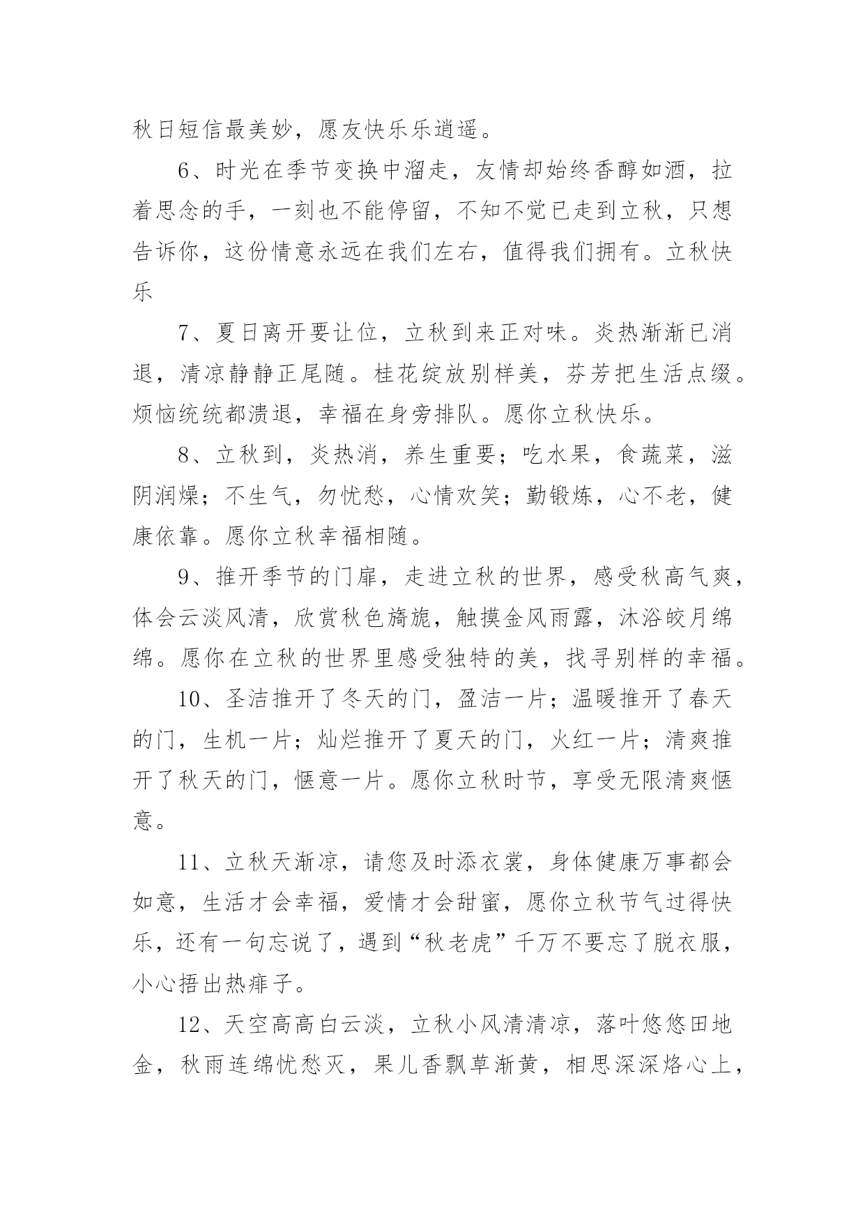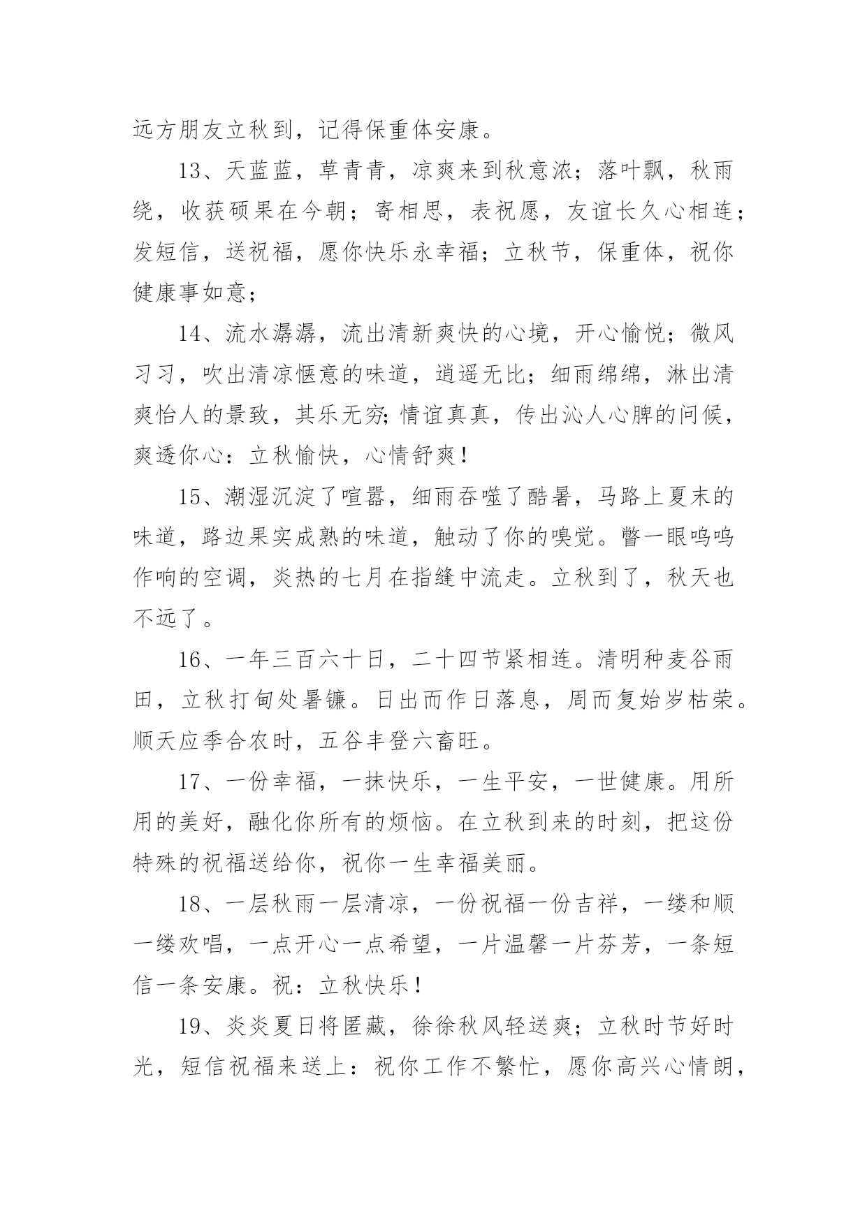 2022立秋节气的唯美文案2022立秋节气的唯美文案(精选130句)在平平淡淡的学习、工作、生活中,大家最不陌生的就是文案了吧,文案用以分享自己对生活的思考,表达自己的喜怒哀乐。究竟什么样的文案才是特别的呢?以下是小编帮大家整理的2022立秋节气的唯美文案(精选130句),希望对大家有所帮助。2022立秋节气的唯美文案11、秋高气爽立秋到,早晚温差有变化,及时添衣防感冒,身康体健乐相伴,秋季气候最干燥,时令果蔬要多吃,生津润肺保健康,立秋,愿你健康相随,快乐无限!2、立秋到来精神爽,再无高温令人苦。一场秋雨一分凉,气温适宜人舒服。秋风阵阵树叶黄,谷物丰收愁眉舒。朋友短信送身边,开开心心人幸福。祝立秋快乐!3、炎热退了,忧愁也走了;凉爽来了,欢乐也笑了;桂花开了,爱情也芬芳了,天空高远了,梦想也飞翔了;立秋到了,祝福来报道了。愿你立秋时节心欢笑,一季无忧幸福绕。4、立秋到来天渐凉,早晚温差放心上。秋叶翩翩百果香,多食水果护健康。桂花绽放十里香,芬芳心田情意长。信息简单祝福浓,愿君幸福乐融融。5、立秋到来心欢笑,祝福岂能不报到。秋风吹拂芬芳绕,秋雨滋阴又润燥,秋阳灿烂幸福高,秋光旖旎醉心潮,秋日短信最美妙,愿友快乐乐逍遥。6、时光在季节变换中溜走,友情却始终香醇如酒,拉着思念的手,一刻也不能停留,不知不觉已走到立秋,只想告诉你,这份情意永远在我们左右,值得我们拥有。立秋快乐7、夏日离开要让位,立秋到来正对味。炎热渐渐已消退,清凉静静正尾随。桂花绽放别样美,芬芳把生活点缀。烦恼统统都溃退,幸福在身旁排队。愿你立秋快乐。8、立秋到,炎热消,养生重要;吃水果,食蔬菜,滋阴润燥;不生气,勿忧愁,心情欢笑;勤锻炼,心不老,健康依靠。愿你立秋幸福相随。9、推开季节的门扉,走进立秋的世界,感受秋高气爽,体会云淡风清,欣赏秋色旖旎,触摸金风雨露,沐浴皎月绵绵。愿你在立秋的世界里感受独特的美,找寻别样的幸福。10、圣洁推开了冬天的门,盈洁一片;温暖推开了春天的门,生机一片;灿烂推开了夏天的门,火红一片;清爽推开了秋天的门,惬意一片。愿你立秋时节,享受无限清爽惬意。11、立秋天渐凉,请您及时添衣裳,身体健康万事都会如意,生活才会幸福,爱情才会甜蜜,愿你立秋节气过得快乐,还有一句忘说了,遇到“秋老虎”千万不要忘了脱衣服,小心捂出热痱子。12、天空高高白云淡,立秋小风清清凉,落叶悠悠田地金,秋雨连绵忧愁灭,果儿香飘草渐黄,相思深深烙心上,远方朋友立秋到,记得保重体安康。13、天蓝蓝,草青青,凉爽来到秋意浓;落叶飘,秋雨绕,收获硕果在今朝;寄相思,表祝愿,友谊长久心相连;发短信,送祝福,愿你快乐永幸福;立秋节,保重体,祝你健康事如意;14、流水潺潺,流出清新爽快的心境,开心愉悦;微风习习,吹出清凉惬意的味道,逍遥无比;细雨绵绵,淋出清爽怡人的景致,其乐无穷;情谊真真,传出沁人心脾的问候,爽透你心:立秋愉快,心情舒爽!15、潮湿沉淀了喧嚣,细雨吞噬了酷暑,马路上夏末的味道,路边果实成熟的味道,触动了你的嗅觉。瞥一眼呜呜作响的空调,炎热的七月在指缝中流走。立秋到了,秋天也不远了。16、一年三百六十日,二十四节紧相连。清明种麦谷雨田,立秋打甸处暑镰。日出而作日落息,周而复始岁枯荣。顺天应季合农时,五谷丰登六畜旺。17、一份幸福,一抹快乐,一生平安,一世健康。用所用的美好,融化你所有的烦恼。在立秋到来的时刻,把这份特殊的祝福送给你,祝你一生幸福美丽。18、一层秋雨一层清凉,一份祝福一份吉祥,一缕和顺一缕欢唱,一点开心一点希望,一片温馨一片芬芳,一条短信一条安康。祝:立秋快乐!19、炎炎夏日将匿藏,徐徐秋风轻送爽;立秋时节好时光,短信祝福来送上:祝你工作不繁忙,愿你高兴心情朗,望你健康体舒畅,盼你一切喜洋洋!20、夏有三伏秋有“虎”,秋风秋雨秋老虎。季节交替度寒暑,生活奔忙真辛苦。天气变化要记住,健康损失难弥补。立秋之际遥相祝,生活开心就是福。2022立秋节气的唯美文案21、立秋又到,养生知识要记牢。精神调养很重要,时刻保持心情舒畅;起居调养莫要忘,早卧早起规律长;饮食调养放心上,莲藕多吃身体保健康。2、秋风吹,拉开秋天的序幕,秋雨飘,浇灌秋天的美妙,秋果硕,缀满秋天的喜悦,秋露白,纯净秋天的心情,立秋到,愿你立秋快乐,幸福满心间!3、落叶知秋,情谊如酒;时间在流,情谊相守;今日立秋,真心问候。祝你:开心勿愁,快乐无忧;爱情醇厚,浪漫依旧;名利双收,幸福永久!4、送你一份关怀,让它带着我的牵挂和祝愿,轻轻地围绕在你的身旁;送你一片落叶,让它带着秋的气息和身影,静静地飘零在你的心底,立秋来临,我依旧思念着你,朋友,记得保重身体,我永远祝福你!5、立秋到了,秋天携着清凉的秋风,带着绵绵的秋雨翩翩而来;秋天穿着黄色的衣裙,带着丰收的祝福翩翩而来;秋天唱着快乐的歌谣,跳