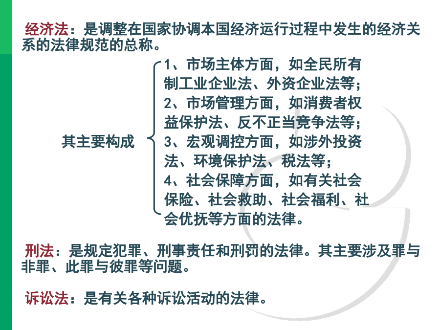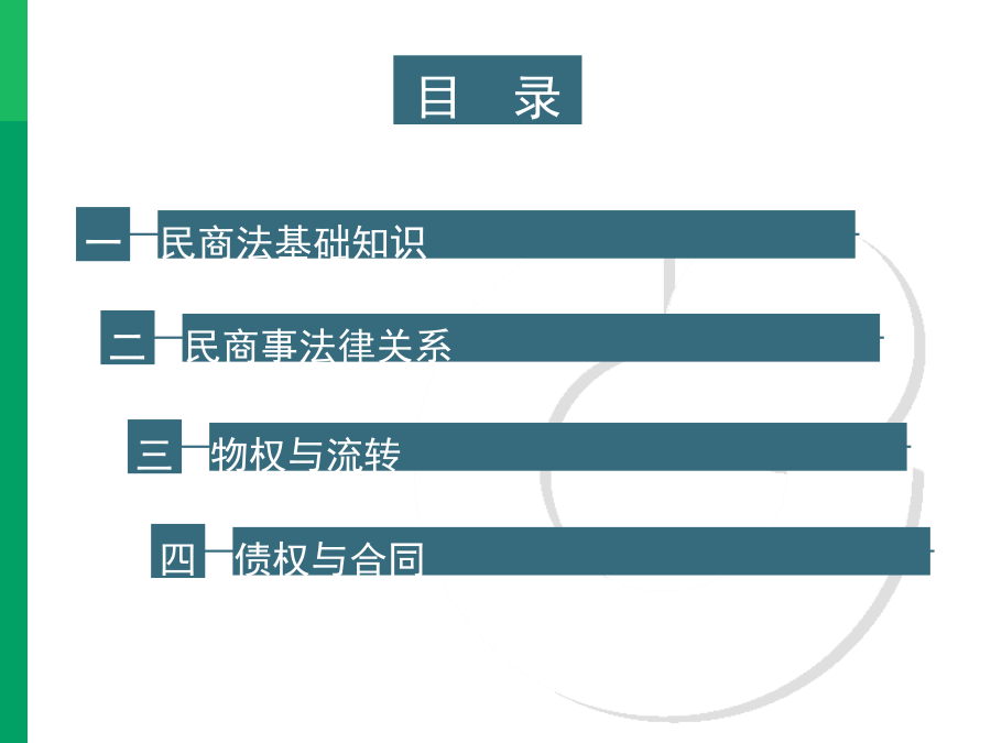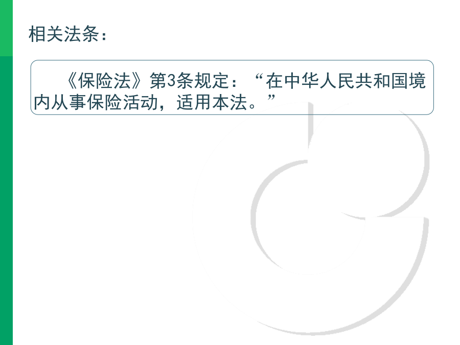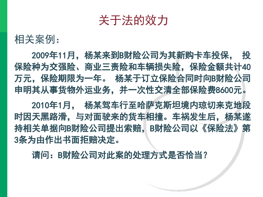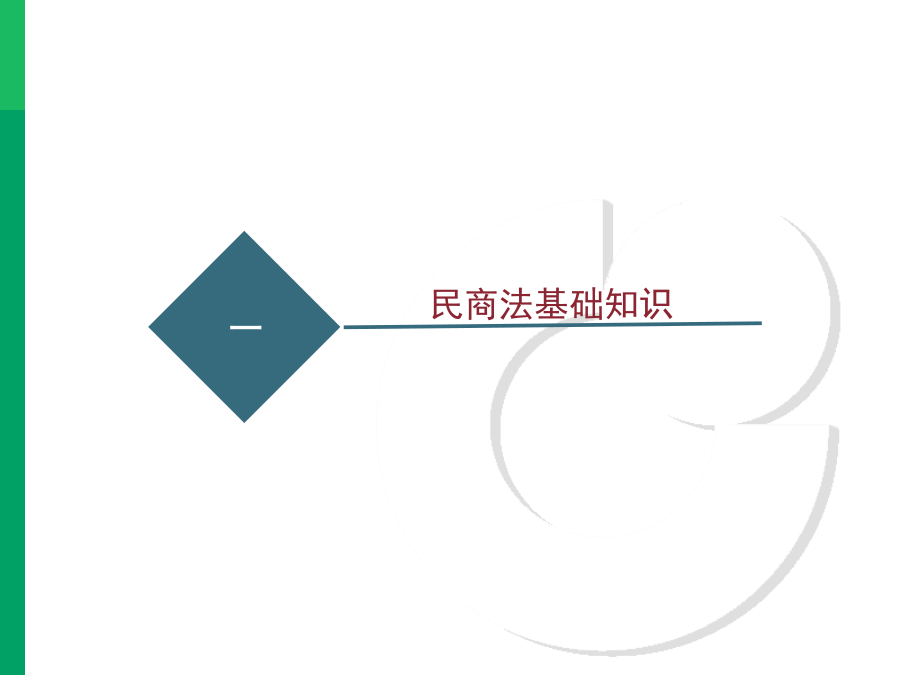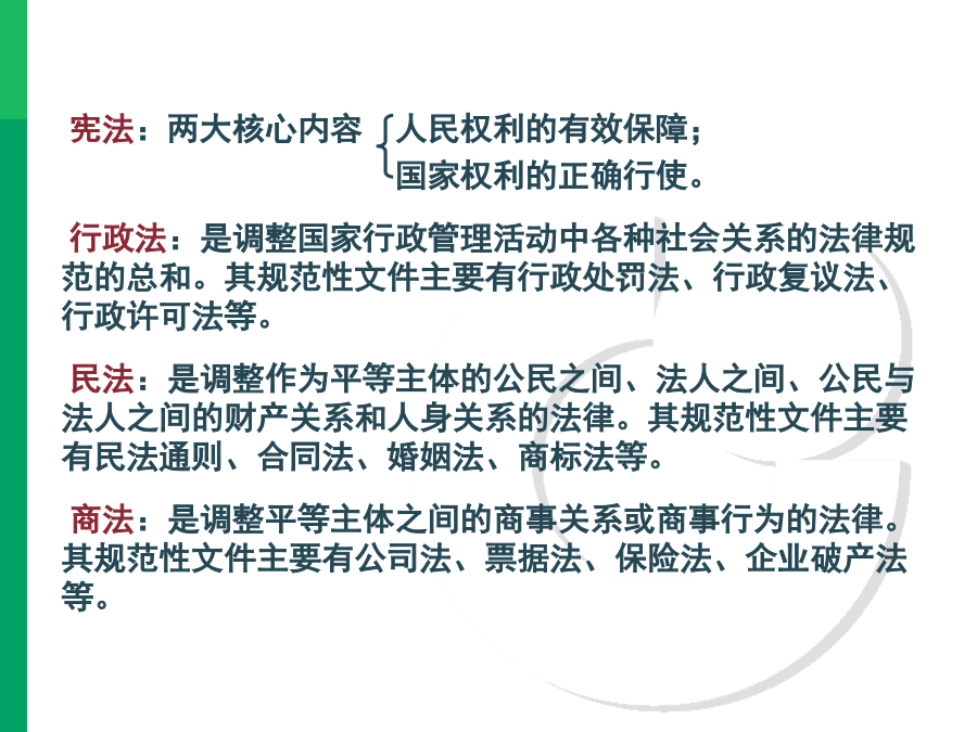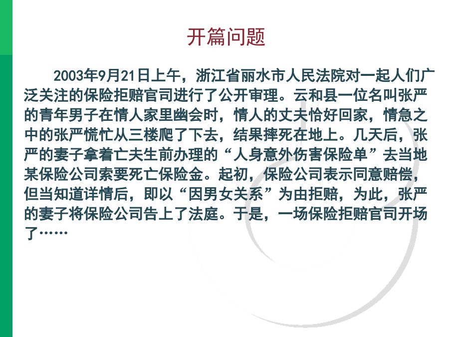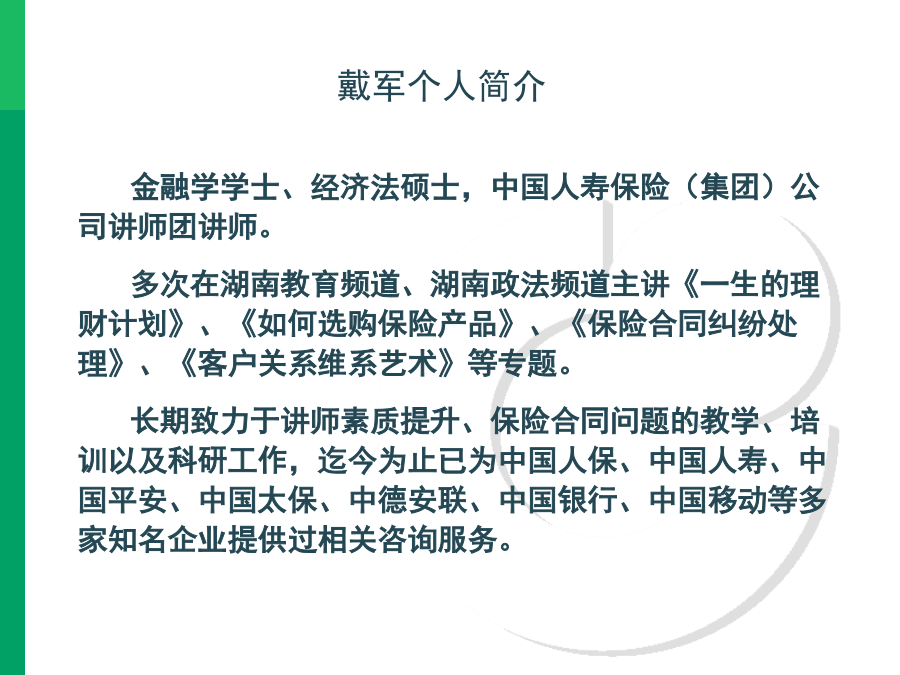 戴军Mobile:13974902301E-mail:daijun@bxxy.com戴军个人简介金融学学士、经济法硕士,中国人寿保险(集团)公司讲师团讲师。多次在湖南教育频道、湖南政法频道主讲《一生的理财计划》、《如何选购保险产品》、《保险合同纠纷处理》、《客户关系维系艺术》等专题。长期致力于讲师素质提升、保险合同问题的教学、培训以及科研工作,迄今为止已为中国人保、中国人寿、中国平安、中国太保、中德安联、中国银行、中国移动等多家知名企业提供过相关咨询服务。民商法基础知识一开篇问题法的分类:大陆法系分为公法和私法英美法系分为普通法和衡平法宪法:两大核心内容人民权利的有效保障;国家权利的正确行使。行政法:是调整国家行政管理活动中各种社会关系的法律规范的总和。其规范性文件主要有行政处罚法、行政复议法、行政许可法等。民法:是调整作为平等主体的公民之间、法人之间、公民与法人之间的财产关系和人身关系的法律。其规范性文件主要有民法通则、合同法、婚姻法、商标法等。商法:是调整平等主体之间的商事关系或商事行为的法律。其规范性文件主要有公司法、票据法、保险法、企业破产法等。经济法:是调整在国家协调本国经济运行过程中发生的经济关系的法律规范的总称。1、市场主体方面,如全民所有制工业企业法、外资企业法等;2、市场管理方面,如消费者权益保护法、反不正当竞争法等;其主要构成3、宏观调控方面,如涉外投资法、环境保护法、税法等;4、社会保障方面,如有关社会保险、社会救助、社会福利、社会优抚等方面的法律。刑法:是规定犯罪、刑事责任和刑罚的法律。其主要涉及罪与非罪、此罪与彼罪等问题。诉讼法:是有关各种诉讼活动的法律。关于法的效力相关法条:效力范围“在中国境内从事保险活动”,只要投保、承保、索赔、理赔中的任一行为在中国发生,均视为在中国境内从事保险活动。法的效力层次二民事法律关系,是指社会关系为民事法律规范调整时所形成的权利、义务关系。它具有以下四个特点:第一,民事法律关系是一种人与人之间的关系;第二,民事法律关系是符合法律规定的社会关系;第三,民事法律关系是以双方当事人的权利义务为内容,并用强制力保证其实现;第四,民事法律关系中当事人的法律地位平等。(二)民事法律关系要素2、自然人的民事权利能力与民事行为能力(1)自然人的民事权利能力Ⅰ、始于出生(Ⅰ)生理死亡,又称自然死Ⅱ、终于死亡亡,是指自然人生命的终结;(Ⅱ)宣告死亡,是指通过法定程序确定失踪人死亡。《民法通则》第23条第1款规定:“公民有下列情形之一的,利害关系人可以向人民法院申请宣告死亡:(一)下落不明满四年的;(二)因意外事故下落不明,从事故发生之日起满二年的。”(2)自然人的民事行为能力Ⅰ、完全民事行为能力人,即能够独立行使民事权利,享有民事义务的自然人。(Ⅰ)十八周岁以上的自然人;(Ⅱ)十六周岁以上不满十八周岁的自然人,以自己的劳动收入为主要生活来源的。Ⅱ、限制民事行为能力人,是指在一定范围内具有民事行为能力,超出一定范围便不具有相应的民事行为能力的自然人。如10周岁以上的未成年人和不能完全辨认自己行为的精神病人。Ⅲ、无民事行为能力人,是指不具有以自己的行为取得民事权利和承担民事义务的能力的自然人。如不满10周岁的未成年人和不能辨认自己行为的精神病人。自然人要有民事行为能力,必须具有意识能力及达到一定年龄;自然人的民事行为能力也是随着自然人的死亡而消灭,即终于死亡。相关案例:张勇系长兴小学甲班班长,某日课间休息期间,去办公室取作业本。在楼梯拐角与外来学校办事的一名妇女发生相撞,造成该名妇女股骨骨折,试问由此产生的八千元医疗费用该由谁来承担?3、法人的概念和应具备的条件法人,是指具有民事权利能力和民事行为能力,依法独立享有民事权利和承担民事义务的组织。法人应具备的条件为:(1)依法设立Ⅰ、许可设立原则,又称核准设立原则;Ⅱ、准则设立原则,又称登记设立原则。(2)有必要的财产或经费;(3)有自己的名称、组织机构和场所;(4)能够独立承担民事责任。民事法律关系的客体1、物的分类(1)以物能否移动为标准,可分为动产和不动产。(2)以物的流通性,可分为流通物和限制流通物。(3)以物存在独立特征,可分为特定物与种类物。(4)以物之间相互依存关系,可分为主物和从物。2、行为的分类(1)单方行为和双方行为。(2)有偿行为和无偿行为。(3)诺成行为和实践性行为。(4)要式行为与不要式行为。3、智力成果(1)著作权商标权(2)工业产权专利权4、权利如土地所有权、承包经营权等。民事法律关系的内容相关案例:2010年3月,某房产企业向中港公司办理了一份员工福利团体健康保险,保费