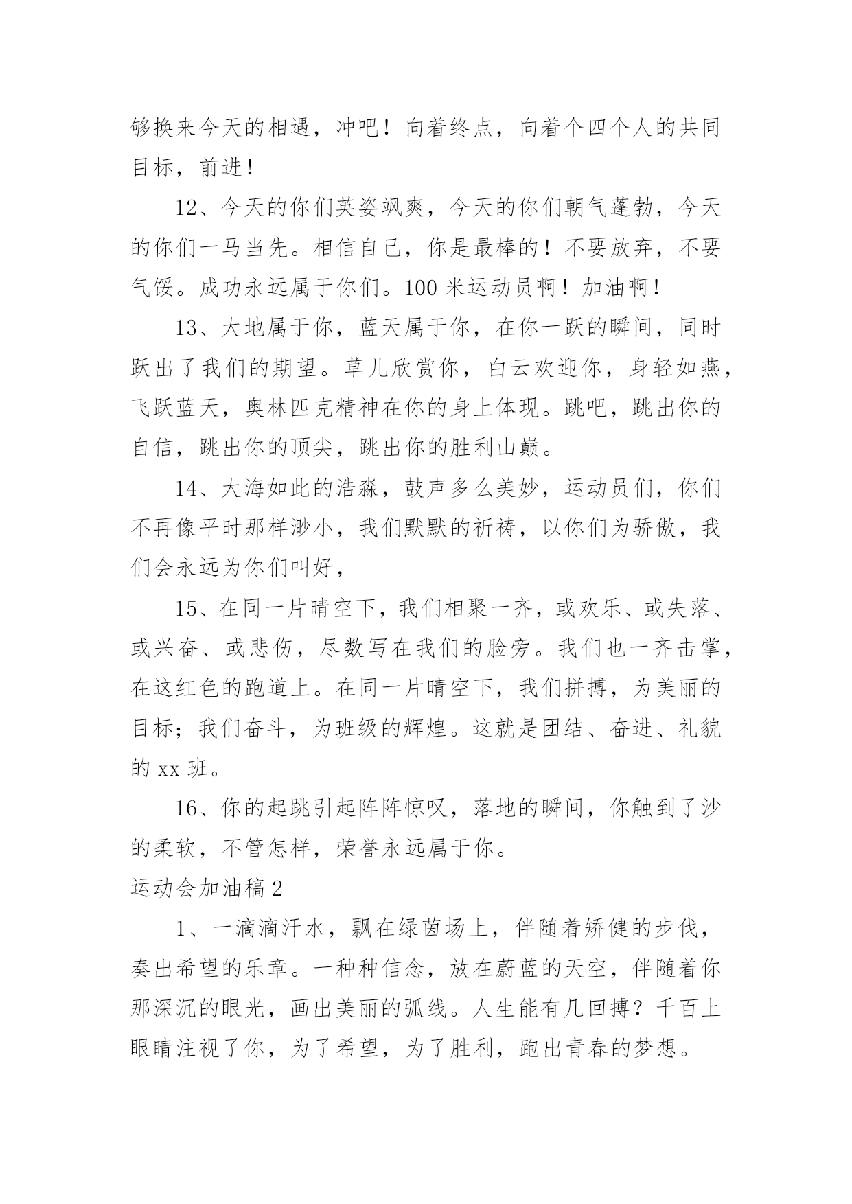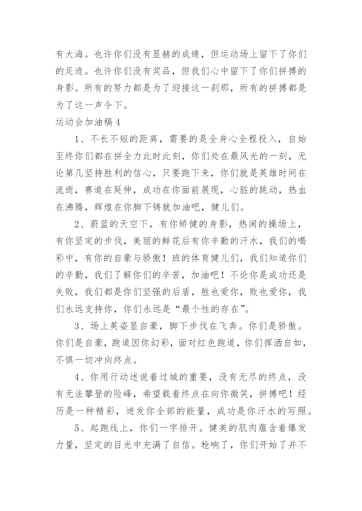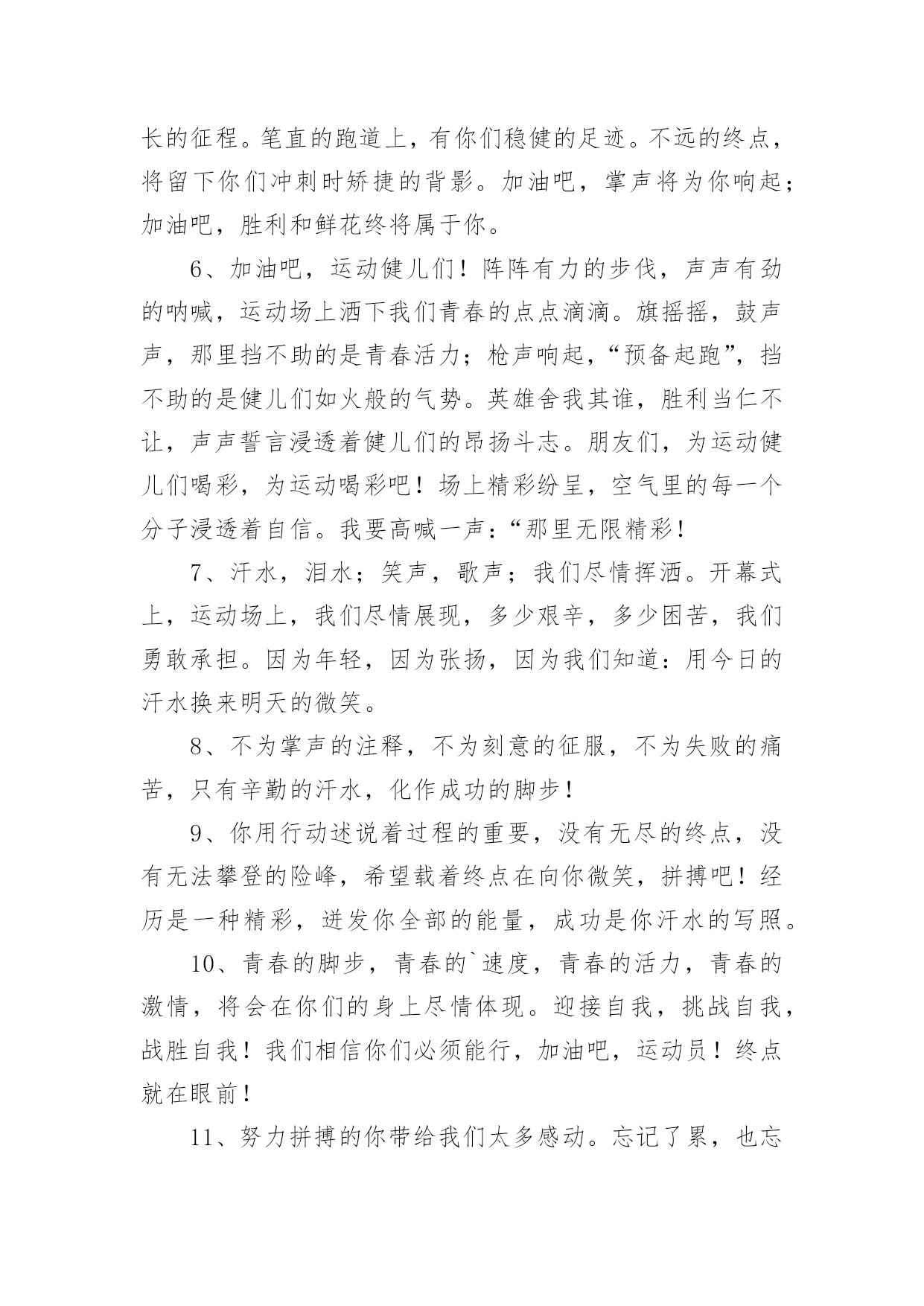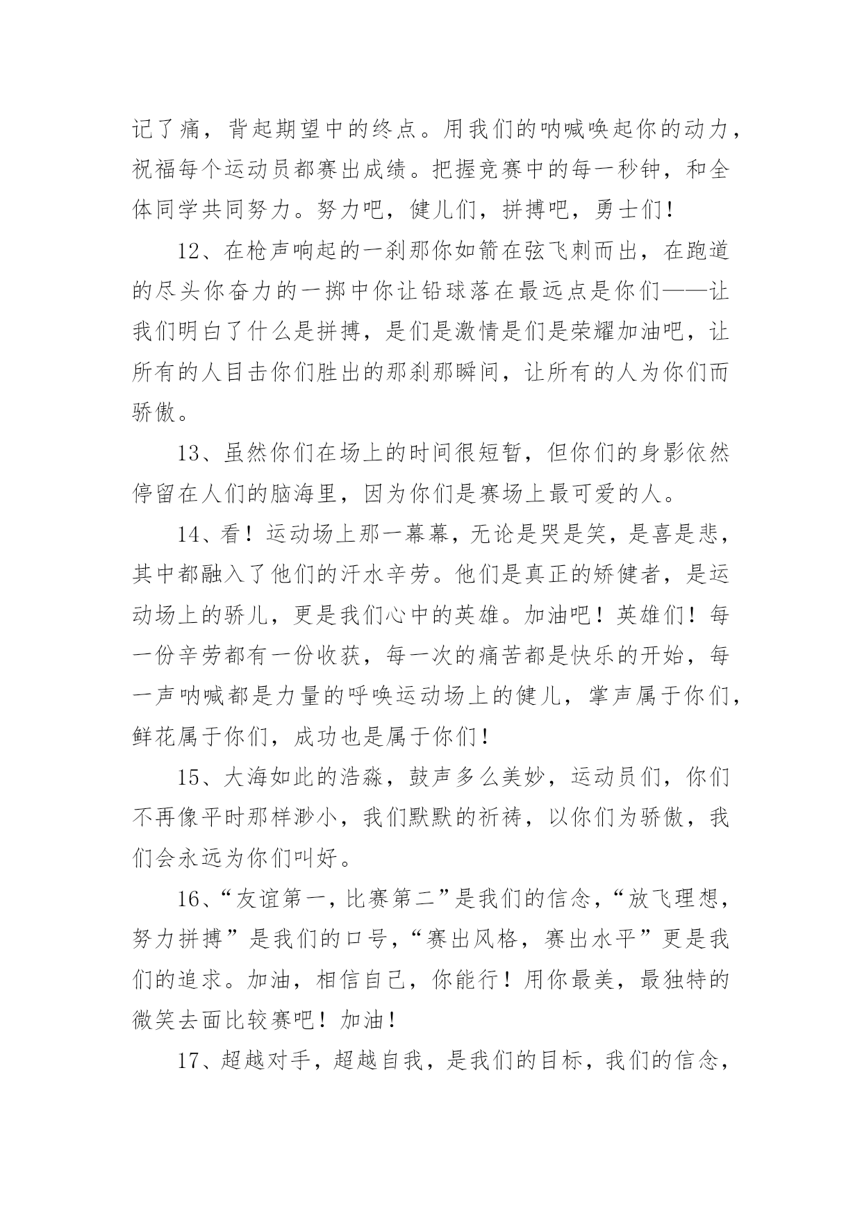 运动会加油稿运动会加油稿【通用】在不断进步的时代,很多情况下我们需要用到加油稿,加油稿可以起到活跃气氛的作用。写起加油稿来就毫无头绪?下面是小编为大家收集的运动会加油稿,希望对大家有所帮助。运动会加油稿11、在赛场,你们是飞翔在天空的雄鹰,是一只正在追逐猎物的猎豹,在比赛时,你们的心中只为着一个目标冲向终点;在灯下你们是彻夜苦读的学子,心里只有一个心愿奋发图强,力求上进。无论失败与否,我永远和你们在一个阵地,不论成绩的好坏,你们都是我朝夕相处的同学。2、远方正迈着整齐的步伐,英姿飒爽向我们走来运动健儿们。他们是一支充满朝气的队伍,他们的笑容、他们的自信,体现着班集体精神,作风优良、纪律严整、团结无私、锲而不舍是他们的最爱。相信在此次运动会上,他们一定会将其最美丽、最刚强的一面展示出来。3、虽然你们在场上的时间很短暂,但你们的身影依然停留在人们的脑海里,因为你们是赛场上最可爱的人!4、心中坚定的信念,脚下沉稳的步伐,你用行动告诉我们一个不变之理,没有走不完的路,没有过不了的山,成功正在终点冲着你高高的招手,用你那顽强的'意志去努力,去迎接终点的鲜花与掌声,相信成功一定是属于你。5、坚定,执着,耐力与希望,在延伸的白色跑道中点点凝聚!力量,信念,拼搏与奋斗,在遥远的终点线上渐渐明亮!时代的强音正在你的脚下踏响。6、青春的脚步,青春的速度,青春的活力,青春的激情,将会在你们的身上尽情体现。7、不为掌声的注释,不为刻意的征服,不为失败的痛苦,只有辛勤的汗水化作成功的脚步。8、虽然你们在场上的时间很短暂,但你们的身影依然停留在人们的脑海里,你们是赛场上最可爱的人!9、掌声响起来,呐喊吼出来,千百双眼眸,凝聚的是深深的期待,涌动的是无言的激动,跃动的是你们飞驰的身影,飒爽的秋风,暖暖的阳光,挥洒青春汗水的健儿们,加油!10、在阳光的照耀下,跳高的比赛场地格外辉煌,运动健儿们,用那矫键的身躯,冲刺着一个又一个的高度。没有尝试,怎会知道自我是否为强者,超越自我,也许会创造一番新天地!11、迎着观众的喝彩,我们运动起来,奔跑在的跑道上,让我们共同努力,奔跑奔跑,冲向胜利的终点,一条跑道,要四个人去打造一个信念,要四个人去拼搏每次交接都是信任的传递每次交接都是永恒的支持前世的五百次回眸,才能够换来今天的相遇,冲吧!向着终点,向着个四个人的共同目标,前进!12、今天的你们英姿飒爽,今天的你们朝气蓬勃,今天的你们一马当先。相信自己,你是最棒的!不要放弃,不要气馁。成功永远属于你们。100米运动员啊!加油啊!13、大地属于你,蓝天属于你,在你一跃的瞬间,同时跃出了我们的期望。草儿欣赏你,白云欢迎你,身轻如燕,飞跃蓝天,奥林匹克精神在你的身上体现。跳吧,跳出你的自信,跳出你的顶尖,跳出你的胜利山巅。14、大海如此的浩淼,鼓声多么美妙,运动员们,你们不再像平时那样渺小,我们默默的祈祷,以你们为骄傲,我们会永远为你们叫好,15、在同一片晴空下,我们相聚一齐,或欢乐、或失落、或兴奋、或悲伤,尽数写在我们的脸旁。我们也一齐击掌,在这红色的跑道上。在同一片晴空下,我们拼搏,为美丽的目标;我们奋斗,为班级的辉煌。这就是团结、奋进、礼貌的xx班。16、你的起跳引起阵阵惊叹,落地的瞬间,你触到了沙的柔软,不管怎样,荣誉永远属于你。运动会加油稿21、一滴滴汗水,飘在绿茵场上,伴随着矫健的步伐,奏出希望的乐章。一种种信念,放在蔚蓝的天空,伴随着你那深沉的眼光,画出美丽的弧线。人生能有几回搏?千百上眼睛注视了你,为了希望,为了胜利,跑出青春的梦想。2、秋天,我和别人一样收获,望着我那干瘪的谷粒。心里有一种苦涩的欢乐。但我绝不因此而气馁,因为有你关怀着我。我把它们捧在手里,紧紧地,紧紧地放在您的面前。你的眼睛中流露着欢乐,仿佛你收获一样,欢笑着。3、环形跑道上的坚持,毅力与精神活跃在会场上,湿透的衣衫,满头的大汗,无限追求,奋力追赶,我们为你欢呼跳跃,我们为你骄傲!4、萧瑟的秋风,挡不住你们破竹的锐气,广阔的绿茵场,是为你们搭建的舞台。张扬吧,年轻的.心,我们将为你永远喝彩!5、拥有辉,只要你努力过,辉煌便不是空中楼阁。只要你奋斗,辉煌便不是若隐若现的星河,只要你拼搏过,辉煌便不会与你擦肩而过。只要你进取,辉煌自然会与你明朝相约。6、终于,迎来了这一刻;这是激动人心的一刻;这是今人兴奋的一刻;这是千钧一发的一刻;这是关键的一刻,这是储蓄了好久的力量,终于要爆发的一刻。为了它,洒下了多少汗水,为了它,付出了多少心血。因此,把握住这一刻吧!7、你是一叶小舟,运动是你的港湾。你是一叶小舟,四肢是你的桅杆。你是一叶小舟,身体是你的风帆。你是一叶小舟,正驶向体育的海洋,让我们同心协力,向体育勇敢出发吧!8、你们挥舞着充满力量的双臂,看着实心球化成美丽的弧线,我着实在心里佩服你们,你们