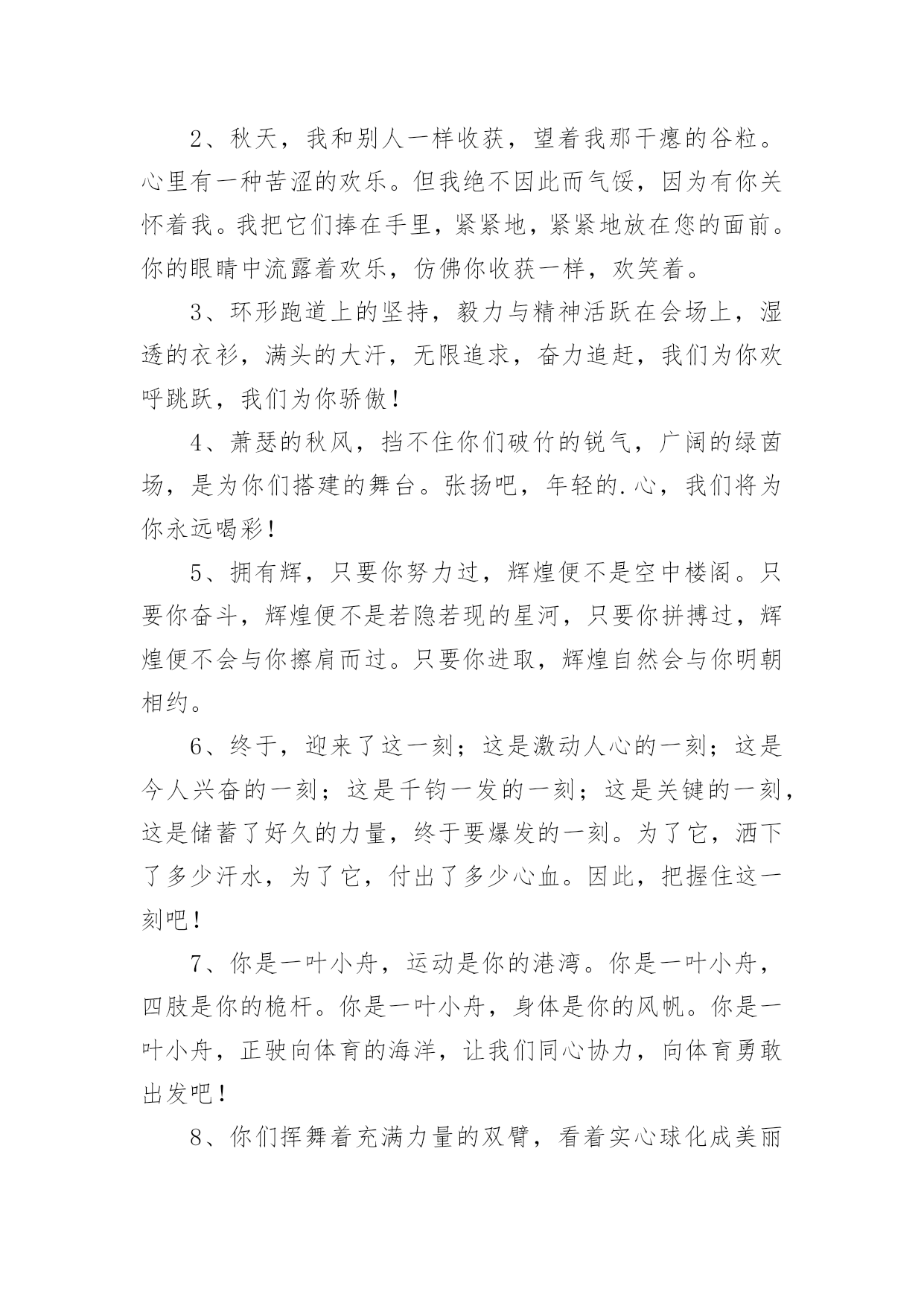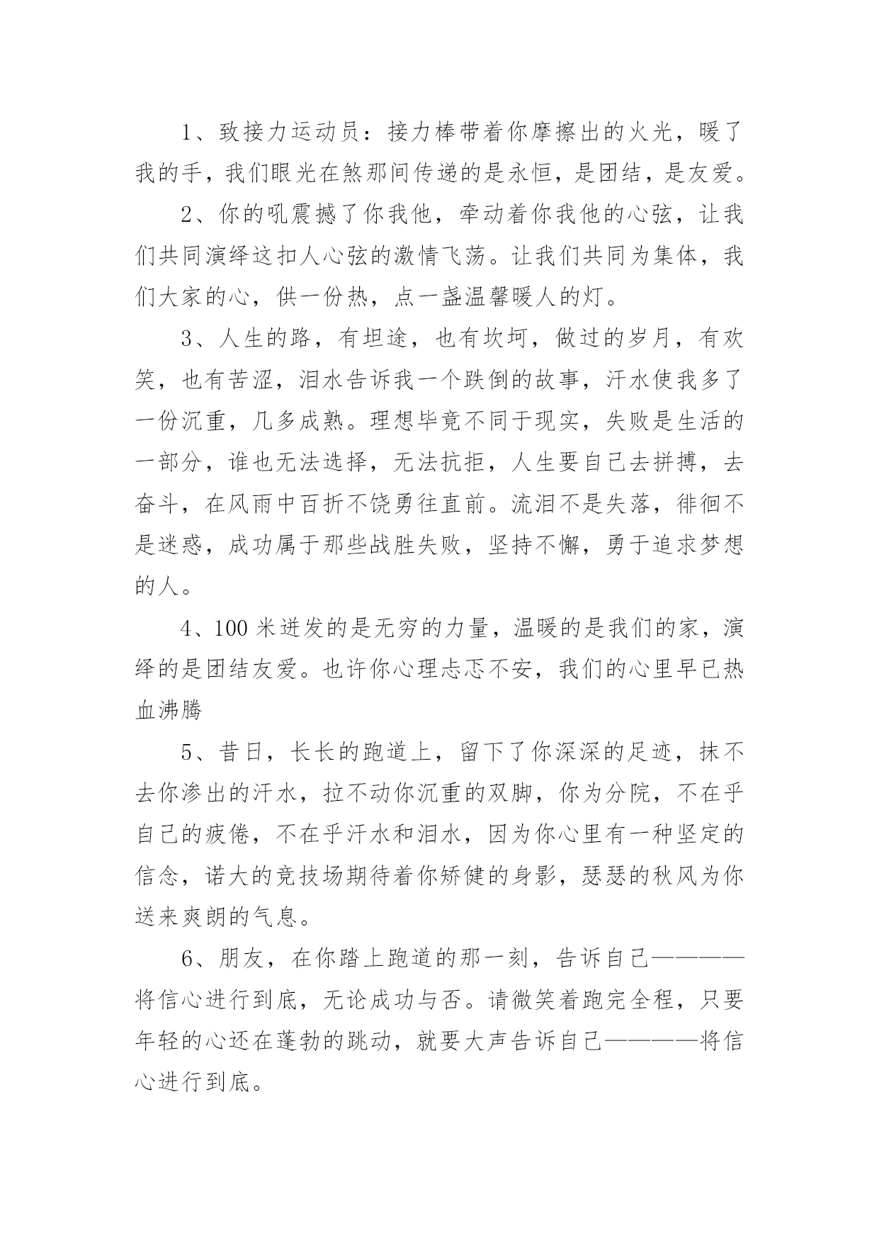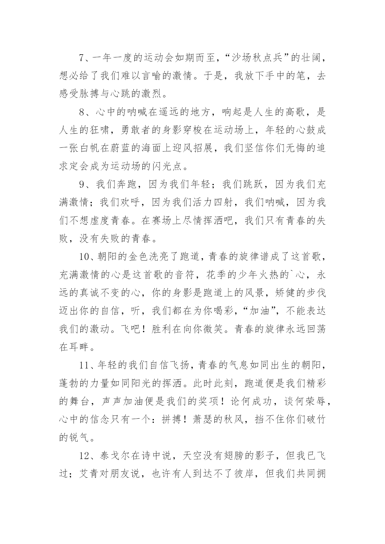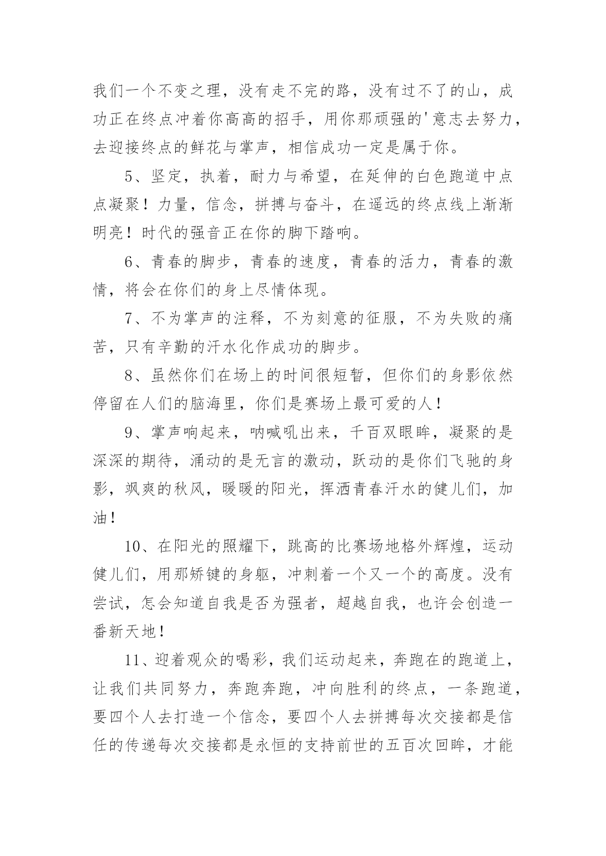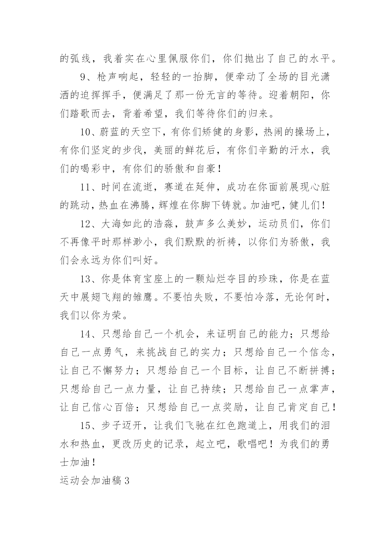 运动会加油稿运动会加油稿【通用】在不断进步的时代,很多情况下我们需要用到加油稿,加油稿可以起到活跃气氛的作用。写起加油稿来就毫无头绪?下面是小编为大家收集的运动会加油稿,希望对大家有所帮助。运动会加油稿11、在赛场,你们是飞翔在天空的雄鹰,是一只正在追逐猎物的猎豹,在比赛时,你们的心中只为着一个目标冲向终点;在灯下你们是彻夜苦读的学子,心里只有一个心愿奋发图强,力求上进。无论失败与否,我永远和你们在一个阵地,不论成绩的好坏,你们都是我朝夕相处的同学。2、远方正迈着整齐的步伐,英姿飒爽向我们走来运动健儿们。他们是一支充满朝气的队伍,他们的笑容、他们的自信,体现着班集体精神,作风优良、纪律严整、团结无私、锲而不舍是他们的最爱。相信在此次运动会上,他们一定会将其最美丽、最刚强的一面展示出来。3、虽然你们在场上的时间很短暂,但你们的身影依然停留在人们的脑海里,因为你们是赛场上最可爱的人!4、心中坚定的信念,脚下沉稳的步伐,你用行动告诉我们一个不变之理,没有走不完的路,没有过不了的山,成功正在终点冲着你高高的招手,用你那顽强的'意志去努力,去迎接终点的鲜花与掌声,相信成功一定是属于你。5、坚定,执着,耐力与希望,在延伸的白色跑道中点点凝聚!力量,信念,拼搏与奋斗,在遥远的终点线上渐渐明亮!时代的强音正在你的脚下踏响。6、青春的脚步,青春的速度,青春的活力,青春的激情,将会在你们的身上尽情体现。7、不为掌声的注释,不为刻意的征服,不为失败的痛苦,只有辛勤的汗水化作成功的脚步。8、虽然你们在场上的时间很短暂,但你们的身影依然停留在人们的脑海里,你们是赛场上最可爱的人!9、掌声响起来,呐喊吼出来,千百双眼眸,凝聚的是深深的期待,涌动的是无言的激动,跃动的是你们飞驰的身影,飒爽的秋风,暖暖的阳光,挥洒青春汗水的健儿们,加油!10、在阳光的照耀下,跳高的比赛场地格外辉煌,运动健儿们,用那矫键的身躯,冲刺着一个又一个的高度。没有尝试,怎会知道自我是否为强者,超越自我,也许会创造一番新天地!11、迎着观众的喝彩,我们运动起来,奔跑在的跑道上,让我们共同努力,奔跑奔跑,冲向胜利的终点,一条跑道,要四个人去打造一个信念,要四个人去拼搏每次交接都是信任的传递每次交接都是永恒的支持前世的五百次回眸,才能够换来今天的相遇,冲吧!向着终点,向着个四个人的共同目标,前进!12、今天的你们英姿飒爽,今天的你们朝气蓬勃,今天的你们一马当先。相信自己,你是最棒的!不要放弃,不要气馁。成功永远属于你们。100米运动员啊!加油啊!13、大地属于你,蓝天属于你,在你一跃的瞬间,同时跃出了我们的期望。草儿欣赏你,白云欢迎你,身轻如燕,飞跃蓝天,奥林匹克精神在你的身上体现。跳吧,跳出你的自信,跳出你的顶尖,跳出你的胜利山巅。14、大海如此的浩淼,鼓声多么美妙,运动员们,你们不再像平时那样渺小,我们默默的祈祷,以你们为骄傲,我们会永远为你们叫好,15、在同一片晴空下,我们相聚一齐,或欢乐、或失落、或兴奋、或悲伤,尽数写在我们的脸旁。我们也一齐击掌,在这红色的跑道上。在同一片晴空下,我们拼搏,为美丽的目标;我们奋斗,为班级的辉煌。这就是团结、奋进、礼貌的xx班。16、你的起跳引起阵阵惊叹,落地的瞬间,你触到了沙的柔软,不管怎样,荣誉永远属于你。运动会加油稿21、一滴滴汗水,飘在绿茵场上,伴随着矫健的步伐,奏出希望的乐章。一种种信念,放在蔚蓝的天空,伴随着你那深沉的眼光,画出美丽的弧线。人生能有几回搏?千百上眼睛注视了你,为了希望,为了胜利,跑出青春的梦想。2、秋天,我和别人一样收获,望着我那干瘪的谷粒。心里有一种苦涩的欢乐。但我绝不因此而气馁,因为有你关怀着我。我把它们捧在手里,紧紧地,紧紧地放在您的面前。你的眼睛中流露着欢乐,仿佛你收获一样,欢笑着。3、环形跑道上的坚持,毅力与精神活跃在会场上,湿透的衣衫,满头的大汗,无限追求,奋力追赶,我们为你欢呼跳跃,我们为你骄傲!4、萧瑟的秋风,挡不住你们破竹的锐气,广阔的绿茵场,是为你们搭建的舞台。张扬吧,年轻的.心,我们将为你永远喝彩!5、拥有辉,只要你努力过,辉煌便不是空中楼阁。只要你奋斗,辉煌便不是若隐若现的星河,只要你拼搏过,辉煌便不会与你擦肩而过。只要你进取,辉煌自然会与你明朝相约。6、终于,迎来了这一刻;这是激动人心的一刻;这是今人兴奋的一刻;这是千钧一发的一刻;这是关键的一刻,这是储蓄了好久的力量,终于要爆发的一刻。为了它,洒下了多少汗水,为了它,付出了多少心血。因此,把握住这一刻吧!7、你是一叶小舟,运动是你的港湾。你是一叶小舟,四肢是你的桅杆。你是一叶小舟,身体是你的风帆。你是一叶小舟,正驶向体育的海洋,让我们同心协力,向体育勇敢出发吧!8、你们挥舞着充满力量的双臂,看着实心球化成美丽的弧线,我着实在心里佩服你们,你们