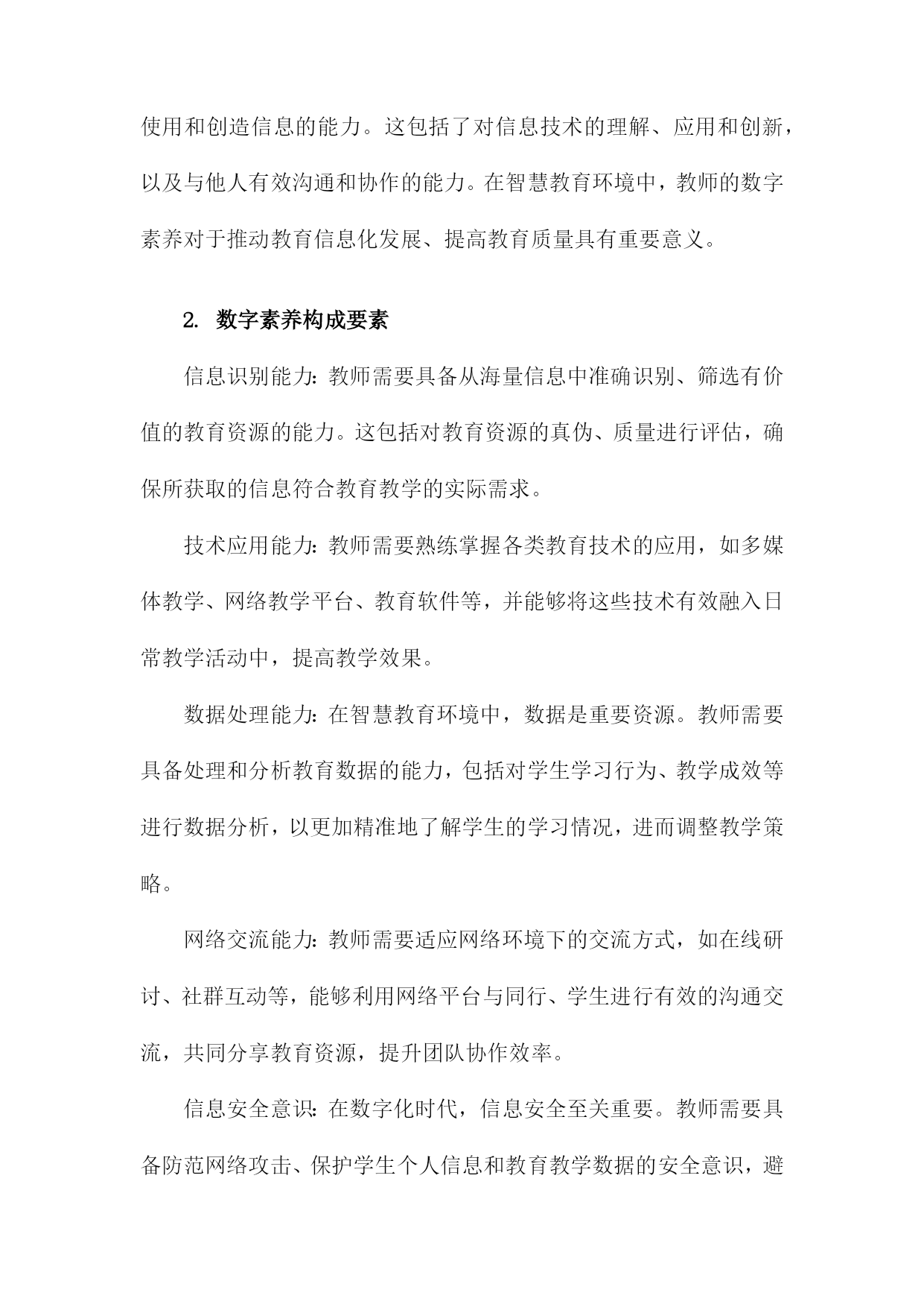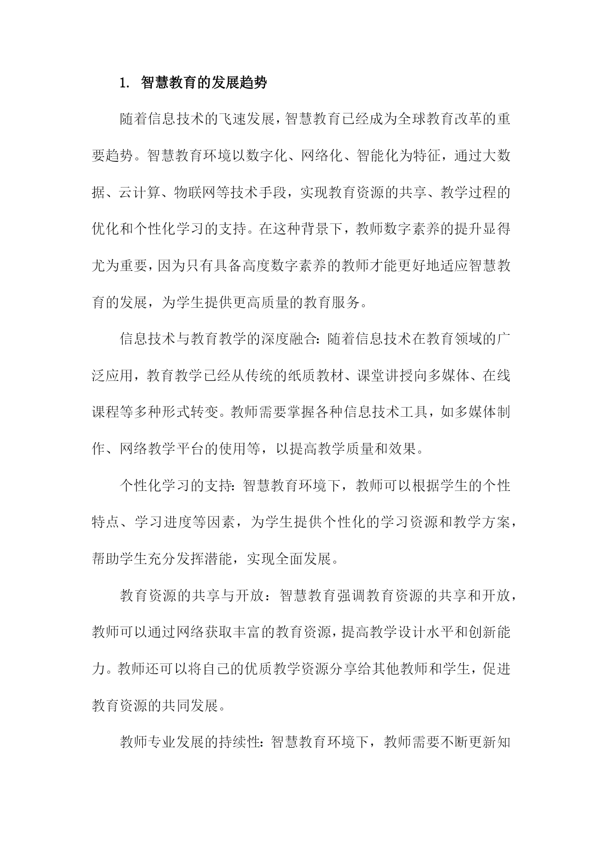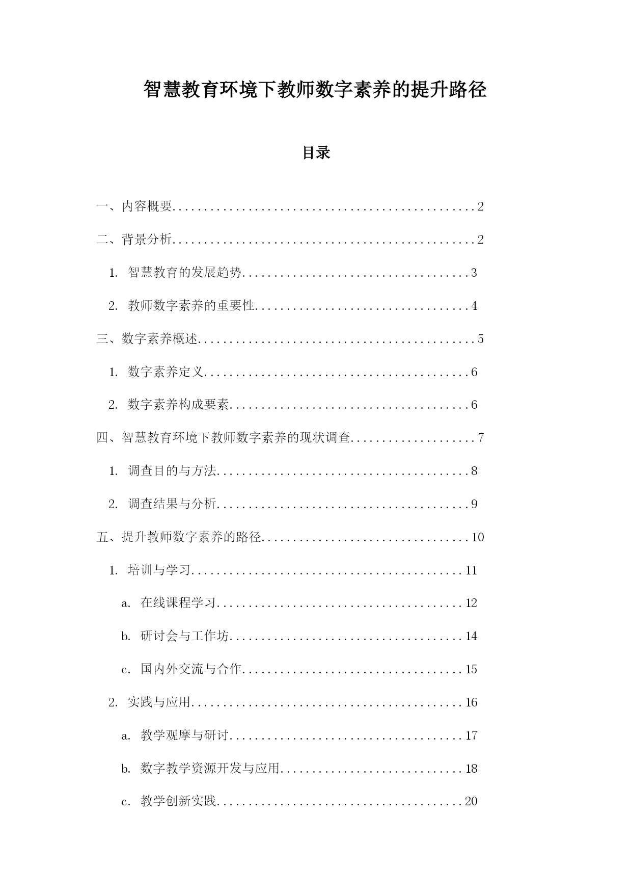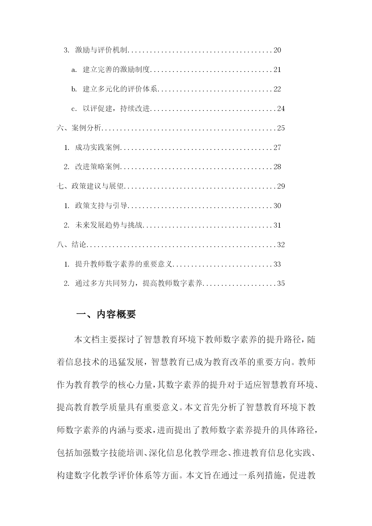 智慧教育环境下教师数字素养的提升路径目录一、内容概要................................................2二、背景分析................................................21.智慧教育的发展趋势....................................32.教师数字素养的重要性..................................4三、数字素养概述............................................51.数字素养定义..........................................62.数字素养构成要素......................................6四、智慧教育环境下教师数字素养的现状调查....................71.调查目的与方法........................................82.调查结果与分析........................................9五、提升教师数字素养的路径.................................101.培训与学习...........................................11a.在线课程学习.......................................12b.研讨会与工作坊.....................................14c.国内外交流与合作...................................152.实践与应用...........................................16a.教学观摩与研讨.....................................17b.数字教学资源开发与应用.............................18c.教学创新实践.......................................203.激励与评价机制.......................................20a.建立完善的激励制度.................................21b.建立多元化的评价体系...............................22c.以评促建,持续改进..................................24六、案例分析...............................................251.成功实践案例.........................................272.改进策略案例.........................................28七、政策建议与展望.........................................291.政策支持与引导.......................................302.未来发展趋势与挑战...................................31八、结论...................................................321.提升教师数字素养的重要意义...........................332.通过多方共同努力,提高教师数字素养....................35一、内容概要本文档主要探讨了智慧教育环境下教师数字素养的提升路径,随着信息技术的迅猛发展,智慧教育已成为教育改革的重要方向。教师作为教育教学的核心力量,其数字素养的提升对于适应智慧教育环境、提高教育教学质量具有重要意义。本文首先分析了智慧教育环境下教师数字素养的内涵与要求,进而提出了教师数字素养提升的具体路径,包括加强数字技能培训、深化信息化教学理念、推进教育信息化实践、构建数字化教学评价体系等方面。本文旨在通过一系列措施,促进教师在智慧教育环境下数字素养的提升,以适应新时代教育发展的需求。二、背景分析随着科技的飞速发展,教育领域正经历着一场前所未有的变革。智慧教育的兴起为教育带来了新的机遇与挑战,教师作为这一过程中的关键角色,其数字素养的提升显得尤为重要。传统的教学模式已逐渐不能满足当代学生的需求,智慧教育以其个性化、智能化、