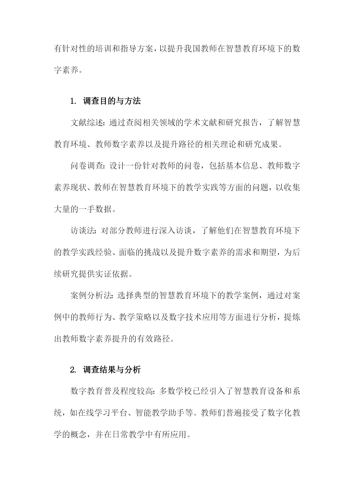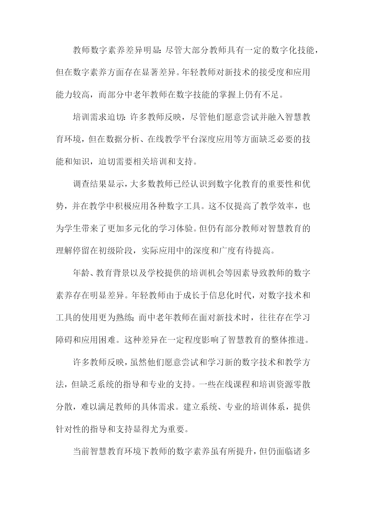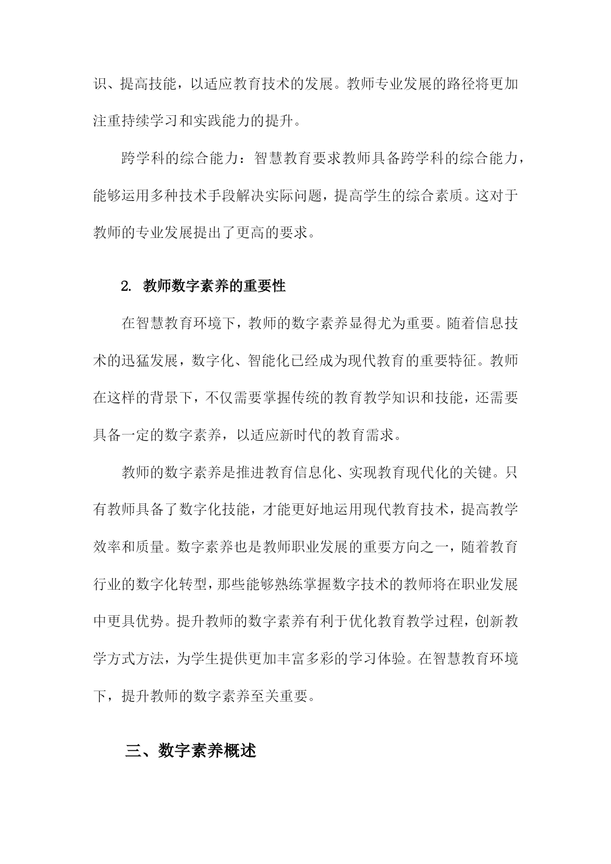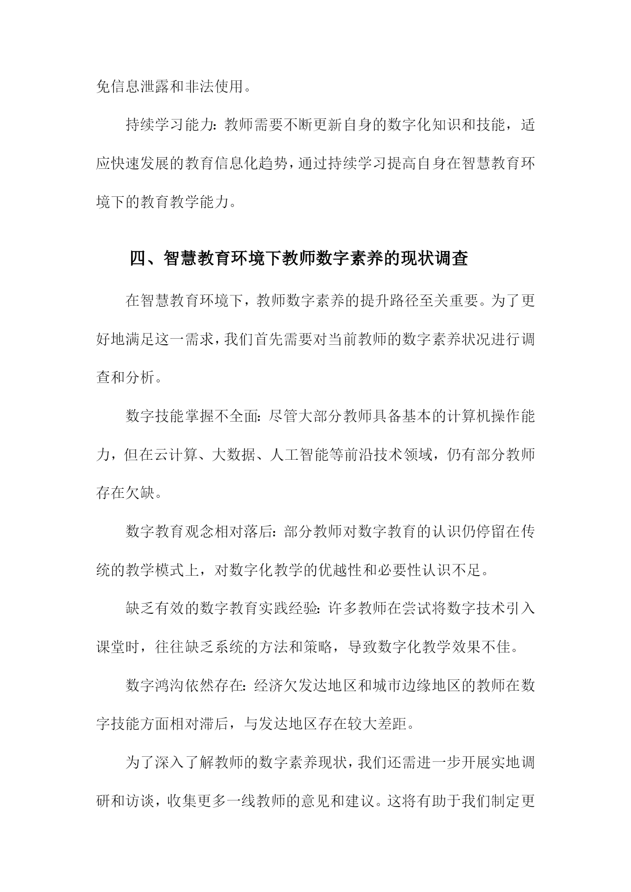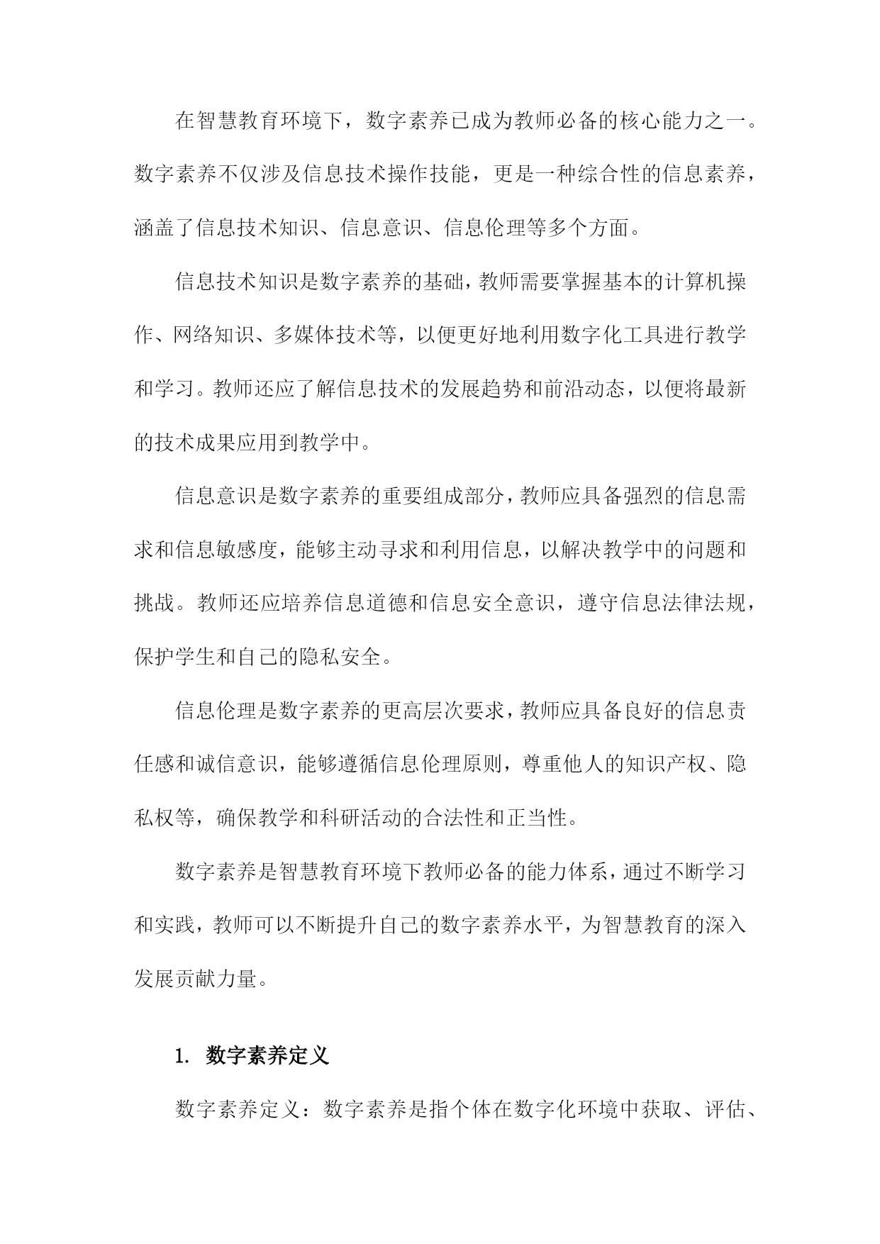 智慧教育环境下教师数字素养的提升路径目录一、内容概要................................................2二、背景分析................................................21.智慧教育的发展趋势....................................32.教师数字素养的重要性..................................4三、数字素养概述............................................51.数字素养定义..........................................62.数字素养构成要素......................................6四、智慧教育环境下教师数字素养的现状调查....................71.调查目的与方法........................................82.调查结果与分析........................................9五、提升教师数字素养的路径.................................101.培训与学习...........................................11a.在线课程学习.......................................12b.研讨会与工作坊.....................................14c.国内外交流与合作...................................152.实践与应用...........................................16a.教学观摩与研讨.....................................17b.数字教学资源开发与应用.............................18c.教学创新实践.......................................203.激励与评价机制.......................................20a.建立完善的激励制度.................................21b.建立多元化的评价体系...............................22c.以评促建,持续改进..................................24六、案例分析...............................................251.成功实践案例.........................................272.改进策略案例.........................................28七、政策建议与展望.........................................291.政策支持与引导.......................................302.未来发展趋势与挑战...................................31八、结论...................................................321.提升教师数字素养的重要意义...........................332.通过多方共同努力,提高教师数字素养....................35一、内容概要本文档主要探讨了智慧教育环境下教师数字素养的提升路径,随着信息技术的迅猛发展,智慧教育已成为教育改革的重要方向。教师作为教育教学的核心力量,其数字素养的提升对于适应智慧教育环境、提高教育教学质量具有重要意义。本文首先分析了智慧教育环境下教师数字素养的内涵与要求,进而提出了教师数字素养提升的具体路径,包括加强数字技能培训、深化信息化教学理念、推进教育信息化实践、构建数字化教学评价体系等方面。本文旨在通过一系列措施,促进教师在智慧教育环境下数字素养的提升,以适应新时代教育发展的需求。二、背景分析随着科技的飞速发展,教育领域正经历着一场前所未有的变革。智慧教育的兴起为教育带来了新的机遇与挑战,教师作为这一过程中的关键角色,其数字素养的提升显得尤为重要。传统的教学模式已逐渐不能满足当代学生的需求,智慧教育以其个性化、智能化、