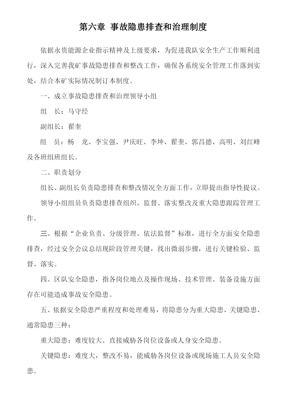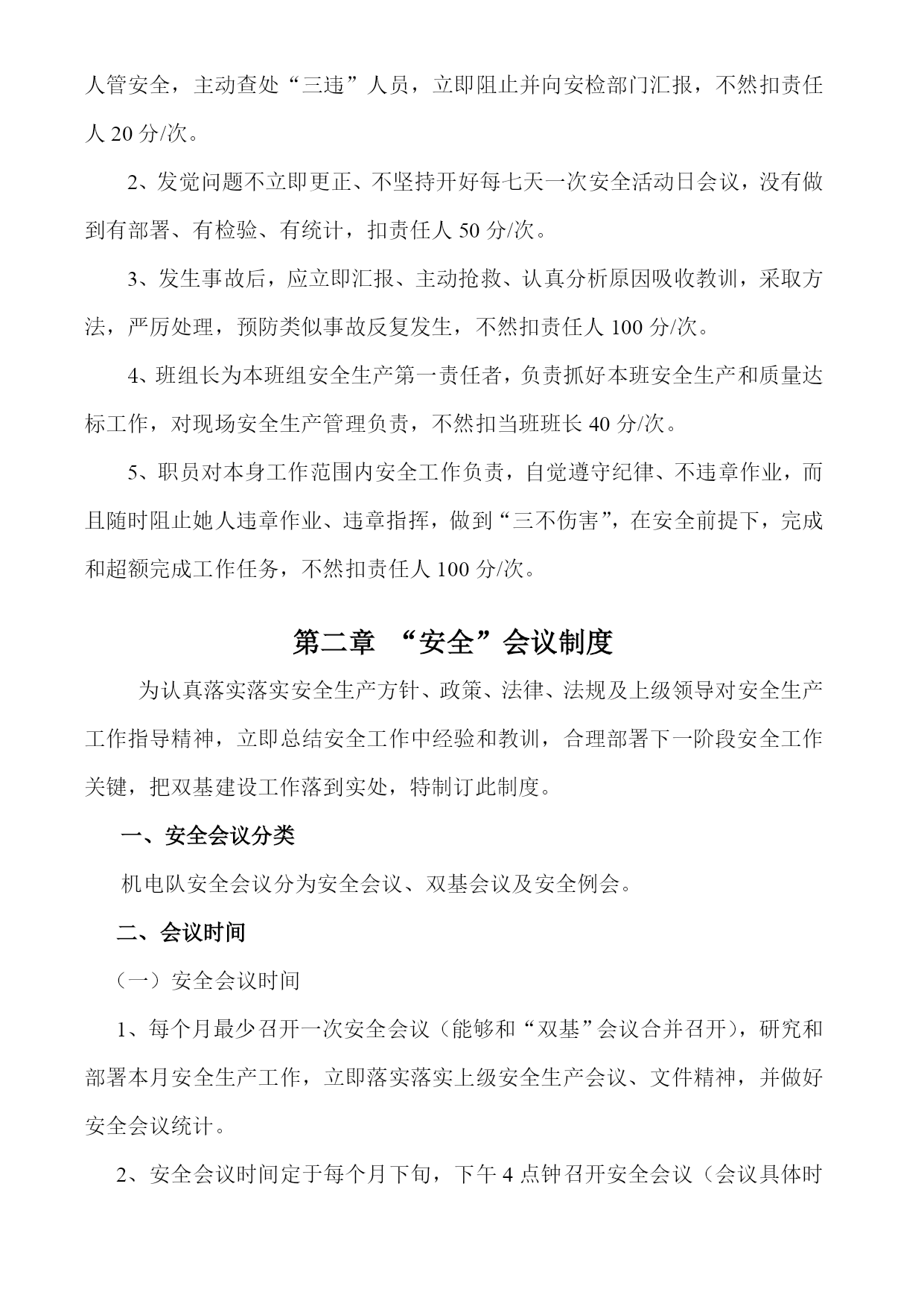 第一章安全生产责任制为了加强安全生产管理,深入落实“安全第一,预防为主,综合治理”安全生产工作方针,牢靠树立“从零开始,向零奋斗”安全理念,明确和落实各级人员安全生产责任,依据《安全生产法》、《安全生产许可证条例》等相关安全生产法律、法规、规范、标准相关要求,制订本制度。一、主管队长为机电队安全生产第一责任者,对全队安全生产负全责。二、副队长对所分管班组安全生产工作负关键责任。三、技术队长及技术主管对全队安全技术业务负全责。四、主动开展“安全活动日”活动,依靠职员抓安全,实现人人管生产、人人管安全,主动查处“三违”人员,立即阻止并向安检部门汇报。五、在计划、部署、检验、总结、评选生产工作同时,也要计划、部署、检验、总结、评选安全工作。六、加强现场管理,严格工程质量标准、发觉问题立即更正、坚持开好每七天一次安全活动日会议,做到有部署、有检验、有统计。七、发生事故后,应立即汇报、主动抢救、认真分析原因吸收教训,采取方法,严厉处理,预防类似事故反复发生。八、班组长为本班组安全生产第一责任者,负责抓好本班安全生产和质量达标工作,对现场安全生产管理负责。十、职员对本身工作范围内安全工作负责,自觉遵守纪律、不违章作业,而且随时阻止她人违章作业、违章指挥,做到“三不伤害”,在安全前提下,完成和超额完成工作任务。十一、奖惩措施1、主动开展“安全活动日”活动,依靠职员抓安全,实现人人管生产、人人管安全,主动查处“三违”人员,立即阻止并向安检部门汇报,不然扣责任人20分/次。2、发觉问题不立即更正、不坚持开好每七天一次安全活动日会议,没有做到有部署、有检验、有统计,扣责任人50分/次。3、发生事故后,应立即汇报、主动抢救、认真分析原因吸收教训,采取方法,严厉处理,预防类似事故反复发生,不然扣责任人100分/次。4、班组长为本班组安全生产第一责任者,负责抓好本班安全生产和质量达标工作,对现场安全生产管理负责,不然扣当班班长40分/次。5、职员对本身工作范围内安全工作负责,自觉遵守纪律、不违章作业,而且随时阻止她人违章作业、违章指挥,做到“三不伤害”,在安全前提下,完成和超额完成工作任务,不然扣责任人100分/次。第二章“安全”会议制度为认真落实落实安全生产方针、政策、法律、法规及上级领导对安全生产工作指导精神,立即总结安全工作中经验和教训,合理部署下一阶段安全工作关键,把双基建设工作落到实处,特制订此制度。一、安全会议分类机电队安全会议分为安全会议、双基会议及安全例会。二、会议时间(一)安全会议时间1、每个月最少召开一次安全会议(能够和“双基”会议合并召开),研究和部署本月安全生产工作,立即落实落实上级安全生产会议、文件精神,并做好安全会议统计。2、安全会议时间定于每个月下旬,下午4点钟召开安全会议(会议具体时间由当日值班队长负责通知)。(二)“双基”会议时间1、每个月最少召开一次“双基”会议(能够和“安全”会议合并召开),研究和部署本月“双基”工作,立即落实落实上级安全生产会议、文件精神,并做好“双基”会议统计。2、“双基”会议时间定于每个月下旬,下午4点钟召开“双基”会议(会议具体时间由当日值班队长负责通知)。(三)安全例会会议时间1、每七天最少召开一次安全例会,研究和部署本月安全工作,及通报本周“三违”人员和事故人员,各班组隐患条数和整改情况,做好安全例会统计。2、安全例会时间定于每七天二,下午4点钟召开安全例会(会议具体时间由当日值班队长负责通知)。三、会议内容(一)、安全会议关键内容1、学习落实安全生产方针及相关安全生产法律、法规,上级及企业相关安全生产政策、要求、指示。2、对上月安全情况及进行通报,进行分析,提出合理提议和要求。3、对下月安全工作,进行安排和部署工作,并有安全队长总结本月安全工作,部署下月安全工作。4、听取各副队长、技术员、各班组长等人员安全工作汇报和提议。5、研究分析当月存在安全隐患,提出处理措施,并落实到相关责任人人员。6、通报本月事故责任人及处理结果,严重“三违”人员及处理结果。(二)、双基会议关键内容1、学习落实安全生产方针及相关安全生产法律、法规,上级及企业相关安全生产政策、要求、指示。2、对上月“双基”建设工作,领导检验出来问题,进行分析,提出合理提议和要求。3、对下月“双基”建设,进行安排和部署工作,并有安全队长总结本月双基工作,部署下月双基工作。4、听取各副队长、技术员、各班组长等人员安全工作汇报和提议。5、研究分析当月存在安全隐患,提出处理措施,并落实到相关责任人人员。6、通报本月事故责任人及处理结果,严重“三违”人员及处理结果。(三)、安全例会关键内容1、通报每七天矿检验各地点隐患,研究分析本周存在安全隐患