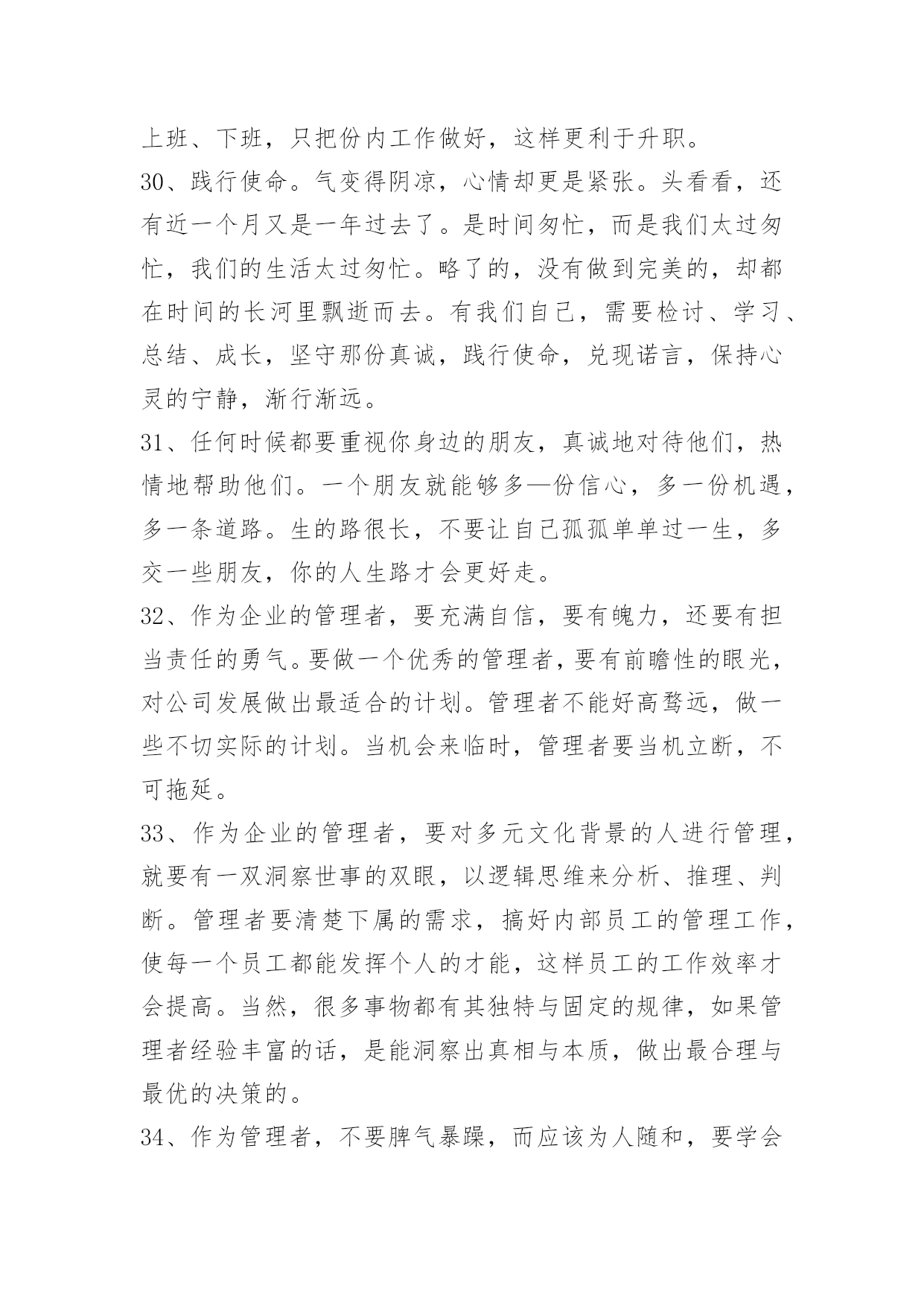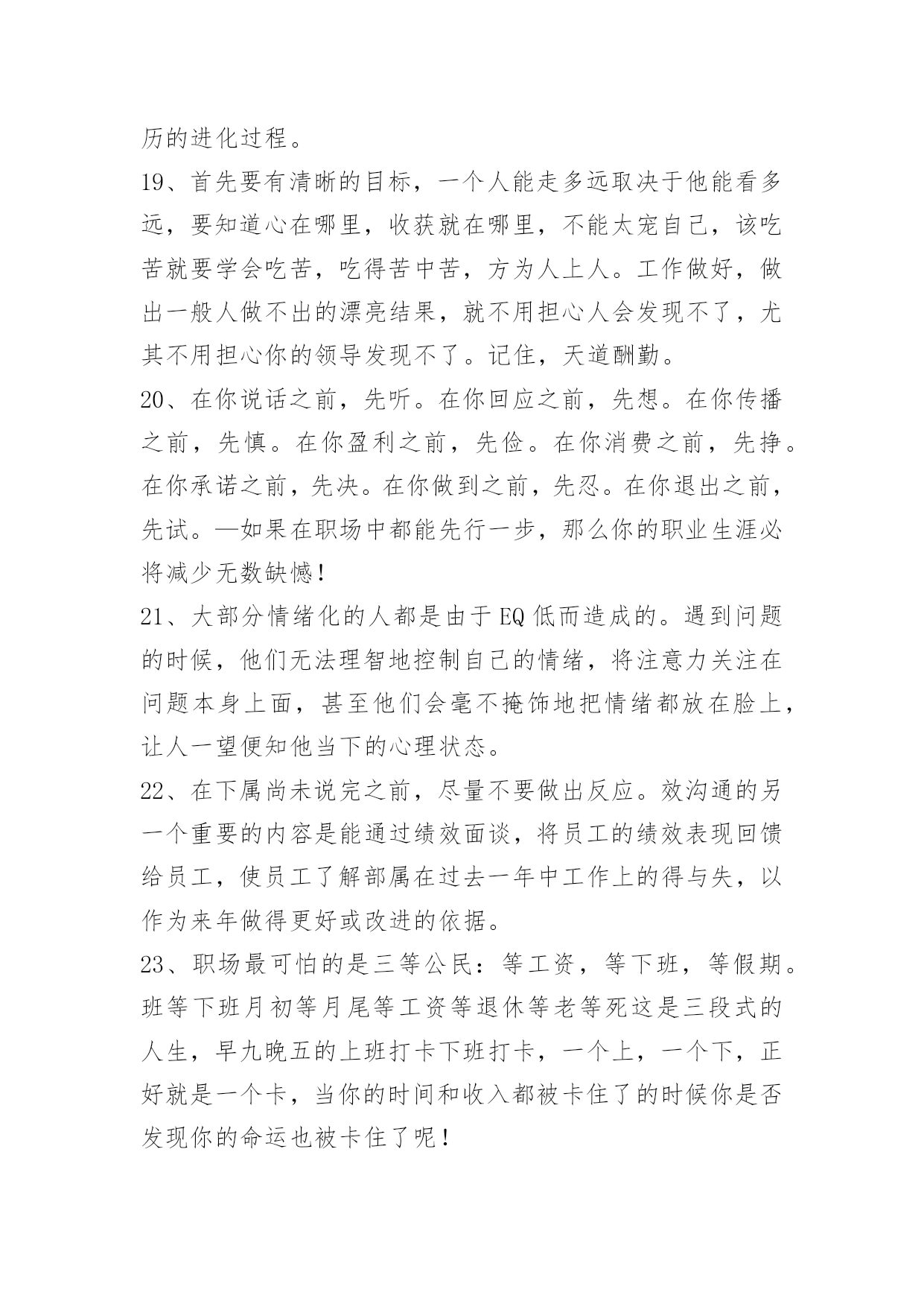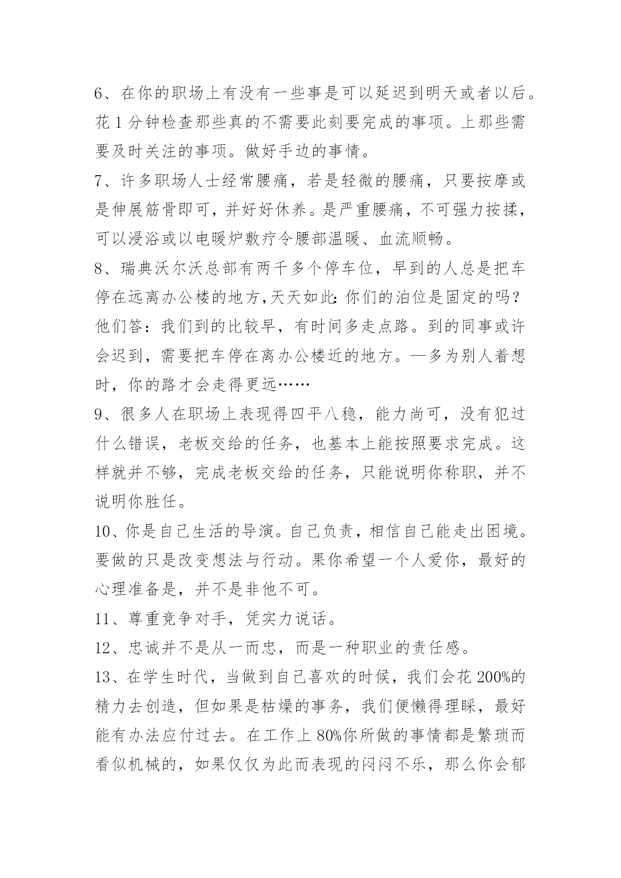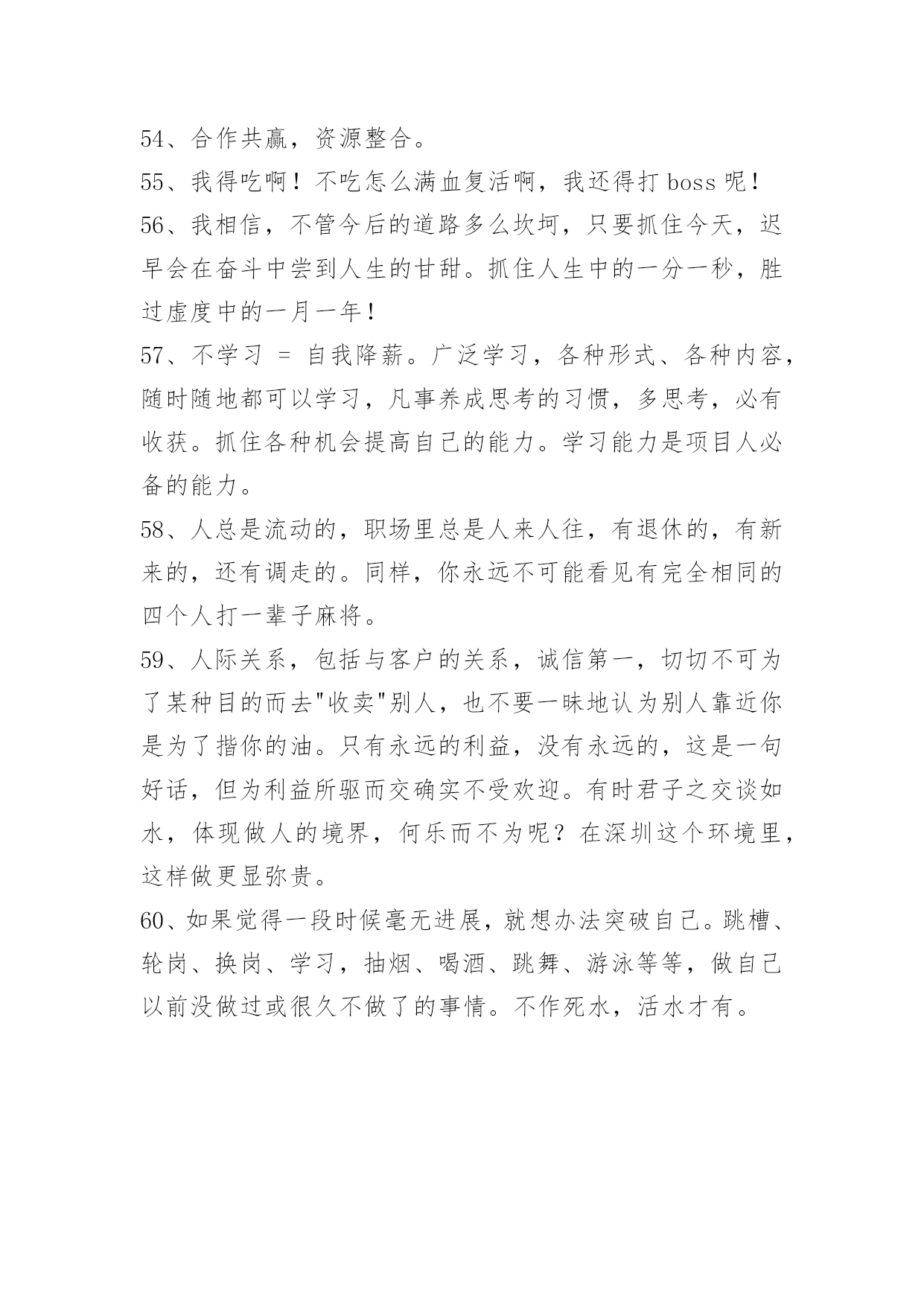 职场个性朋友圈语录文案职场个性朋友圈语录文案汇总60句你要搞清楚自己人生的剧本,不是你父母的续集,不是你子女的前传,更不是你朋友的外篇。认真对待工作,真诚对待旁人,你才是自己生活的最佳主角。以下这篇是小编为大家准备的职场个性朋友圈语录文案,欢迎阅读,希望能够对大家有所帮助。1、你成功,你要认为是你的运气很好。你失败,你要认为是你的力量不足够。那样的话,你就要不断提高自己的水平。2、如果你想赢得我都尊重,成长是唯一的途径。3、做任何事,给自己多留后路好。个世界上的人太多,爱太少,苦难忍,钱难赚。离搬弄是非、挑拨离间之人。段高的,用小人以驱驰;能力高的,还小人以颜色。德高的,待小人以宽容;血压高的,怕只有被小人气死的份儿了。得罪十个君子,也不要得罪一个小人。4、有的人说,我为老板付出了那么多,却得到那么一点点回报,心里感觉很不公平,于是工作便不那么就就业业,只是随便应付而已。果你确实是高手,有与老板叫板的资本,为引起老板注意,也未尝不可。如果你只是个职场菜鸟,也学人家消极抵抗,你就死定了。5、职场上已经打拼几年的白领,明明已经远离课堂,不用再为考试发愁,却常常梦见回到学校,重新坐到考场上考试,而且在梦里屡次答出白卷。是白领梦疾患者最常遇见的梦境。6、在你的职场上有没有一些事是可以延迟到明天或者以后。花1分钟检查那些真的不需要此刻要完成的事项。上那些需要及时关注的事项。做好手边的事情。7、许多职场人士经常腰痛,若是轻微的腰痛,只要按摩或是伸展筋骨即可,并好好休养。是严重腰痛,不可强力按揉,可以浸浴或以电暖炉敷疗令腰部温暖、血流顺畅。8、瑞典沃尔沃总部有两千多个停车位,早到的人总是把车停在远离办公楼的地方,天天如此:你们的泊位是固定的吗?他们答:我们到的比较早,有时间多走点路。到的同事或许会迟到,需要把车停在离办公楼近的地方。—多为别人着想时,你的路才会走得更远……9、很多人在职场上表现得四平八稳,能力尚可,没有犯过什么错误,老板交给的任务,也基本上能按照要求完成。这样就并不够,完成老板交给的任务,只能说明你称职,并不说明你胜任。10、你是自己生活的导演。自己负责,相信自己能走出困境。要做的只是改变想法与行动。果你希望一个人爱你,最好的心理准备是,并不是非他不可。11、尊重竞争对手,凭实力说话。12、忠诚并不是从一而忠,而是一种职业的责任感。13、在学生时代,当做到自己喜欢的时候,我们会花200%的精力去创造,但如果是枯燥的事务,我们便懒得理睬,最好能有办法应付过去。在工作上80%你所做的事情都是繁琐而看似机械的,如果仅仅为此而表现的闷闷不乐,那么你会郁闷更久。知道你的上司已经为这个项目够烦恼了,你还想让他看到你的表情吗?14、虽然职场是个公认的弱肉强食的动物丛林,刀光剑影,明争暗斗,人们常说,初生牛犊不怕虎,也往往告诫初入职场的新人们要充满斗志15、成为企业的助推者。握社会经济发展趋势,整合资源,快速学习,与时俱进,促进繁荣与成长。这个日新月异,快速变化的时代,如何紧跟时代步伐?做别人不愿做的,为他人提供周到卓越的服务,创新发展,这就是我们的价值,需要坚持不懈的努力,实现我们的梦想,成为企业发展的助推者,不是工作,是事业,更是责任与义务。16、参加客户企业的年会。是他们公司创办以来的第一次年会,却办得非常有特色,给人不一样的感觉。工家属积极参加,现场热烈的互动,内部员工的热情表演与服务,体现的不仅仅是才华,而是他们的态度,对公司的认同,对企业的忠诚。业是大家,发展还得靠大家,每一个人的认同才是最大凝聚,是力量。17、社会才是真正的大学,很多在校园里没有想过也没有学过的东西,都可能会与职场新人不期而遇,只有到了具体的销售工作岗位上,你才会发现很多事情并非如你事先所想象的那样。18、老是跳槽的人通常有一个理直气壮的理由——这个工作不适合我。而我们往往忽略了,在不适合的背后有一大部分是不适应的问题,而从不适应到适应是我们在职场中必须经历的进化过程。19、首先要有清晰的目标,一个人能走多远取决于他能看多远,要知道心在哪里,收获就在哪里,不能太宠自己,该吃苦就要学会吃苦,吃得苦中苦,方为人上人。工作做好,做出一般人做不出的漂亮结果,就不用担心人会发现不了,尤其不用担心你的领导发现不了。记住,天道酬勤。20、在你说话之前,先听。在你回应之前,先想。在你传播之前,先慎。在你盈利之前,先俭。在你消费之前,先挣。在你承诺之前,先决。在你做到之前,先忍。在你退出之前,先试。—如果在职场中都能先行一步,那么你的职业生涯必将减少无数缺憾!21、大部分情绪化的人都是由于EQ低而造成的。遇到问题的时候,他们无法理智地控制自己的情绪,将注意力关注在问题本身上面,甚至他们会毫不掩饰地把情绪都放在脸上,让人一望便知他当下的心理状态。22、在下属尚未说完之前,尽量